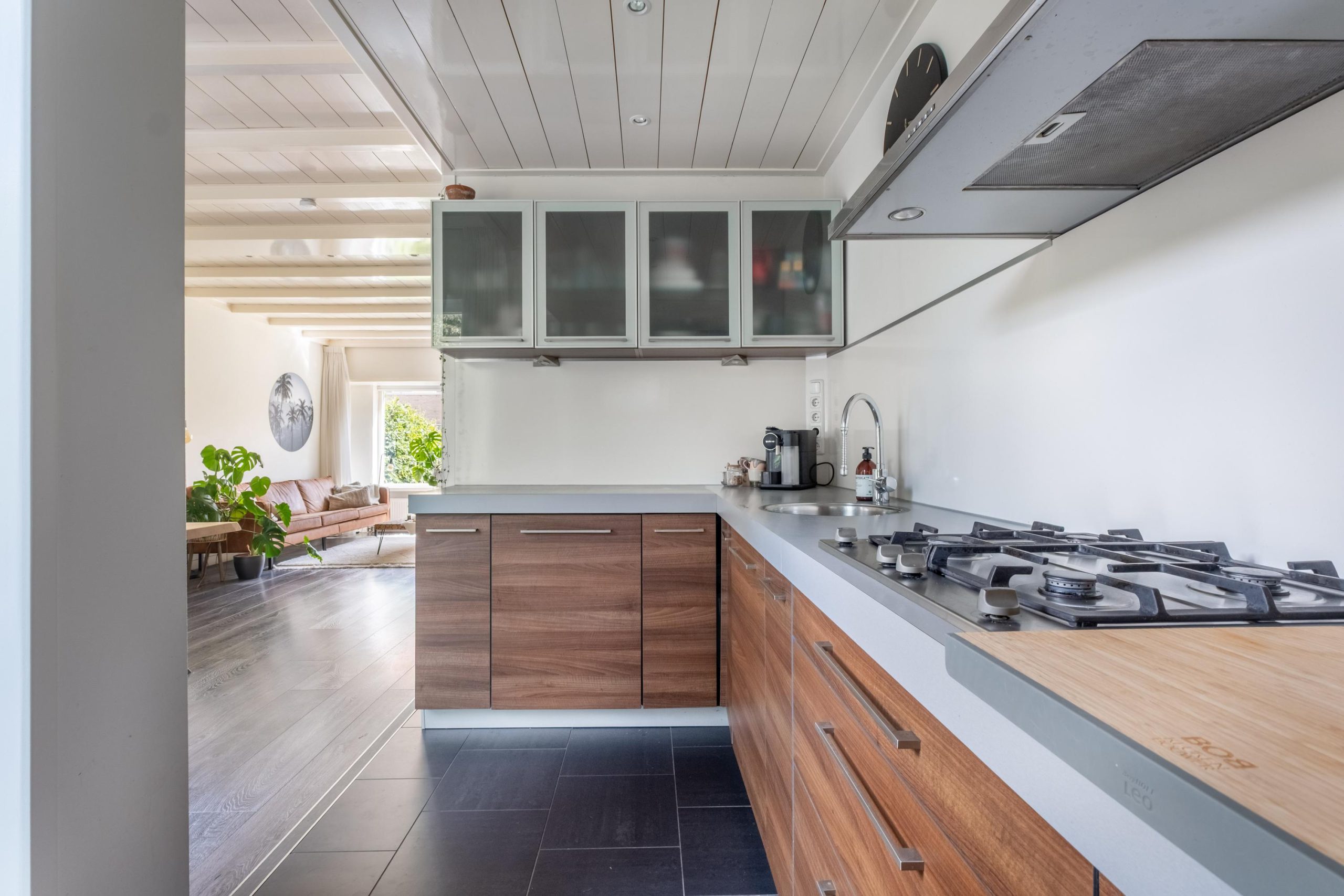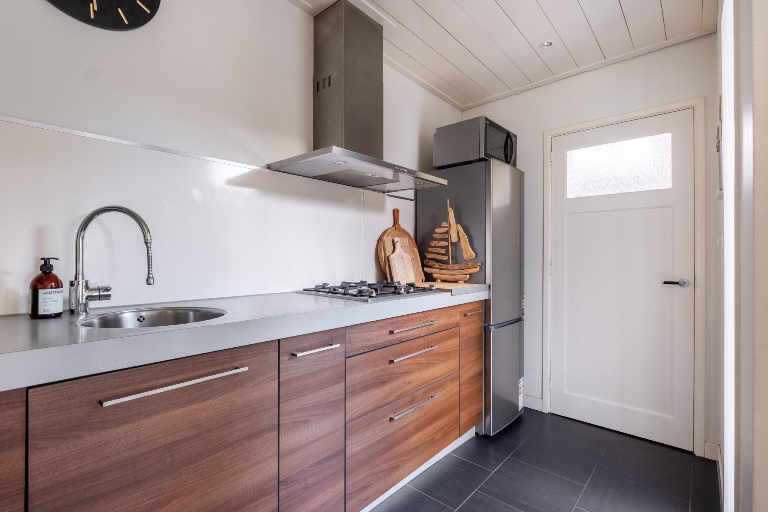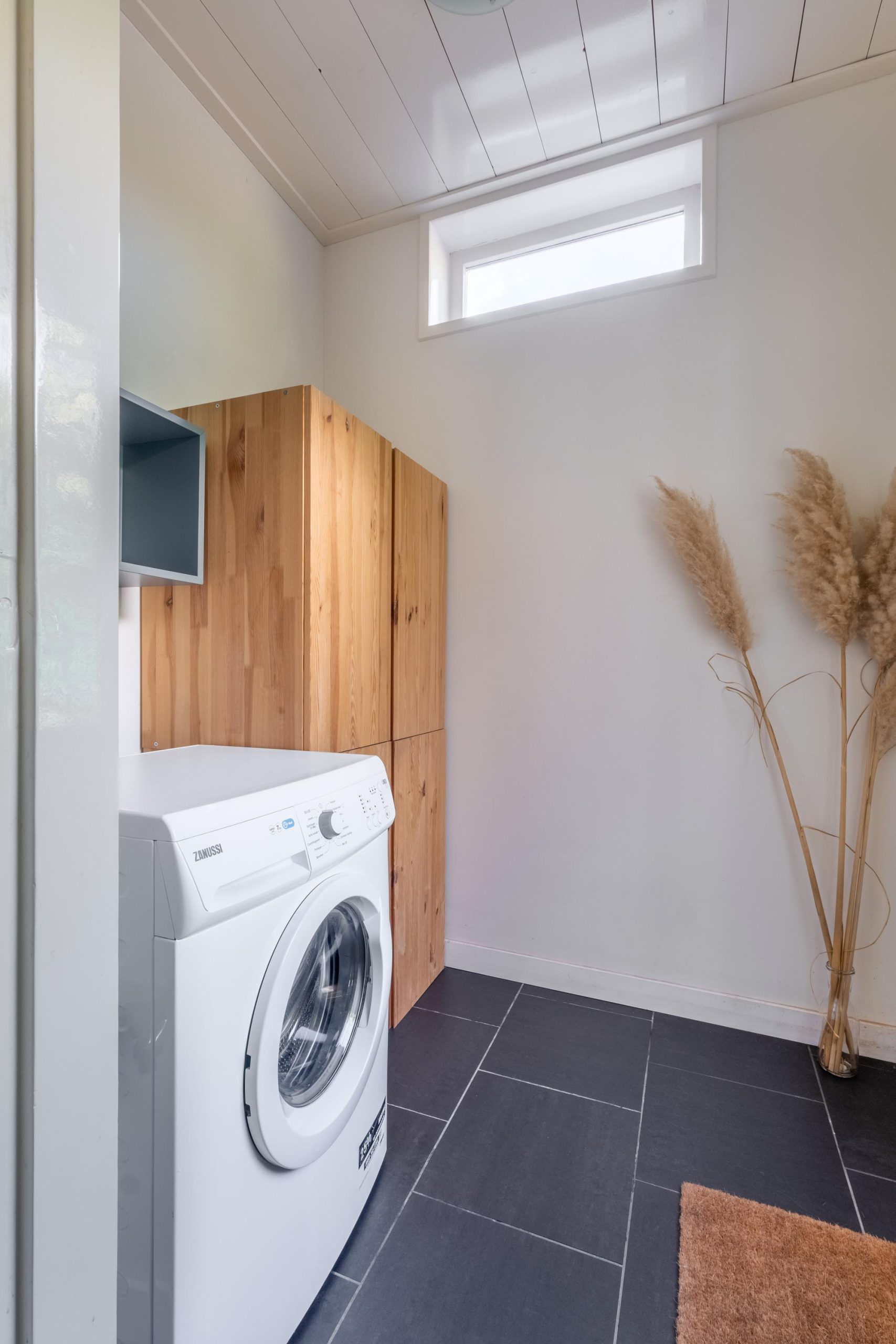 De keuken is praktisch en behaaglijk. Met de elektrische vloerverwarming is het hier altijd aangenaam, zelfs op koude dagen. De openstaande deuren verbinden de keuken op een mooie manier met de achtertuin- perfect om 's zomers met een kop koffie of glas wijn buiten te genieten.
