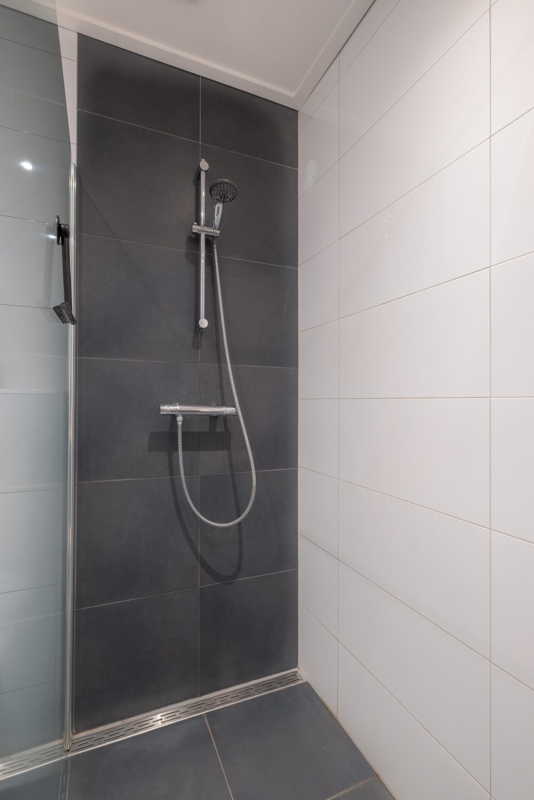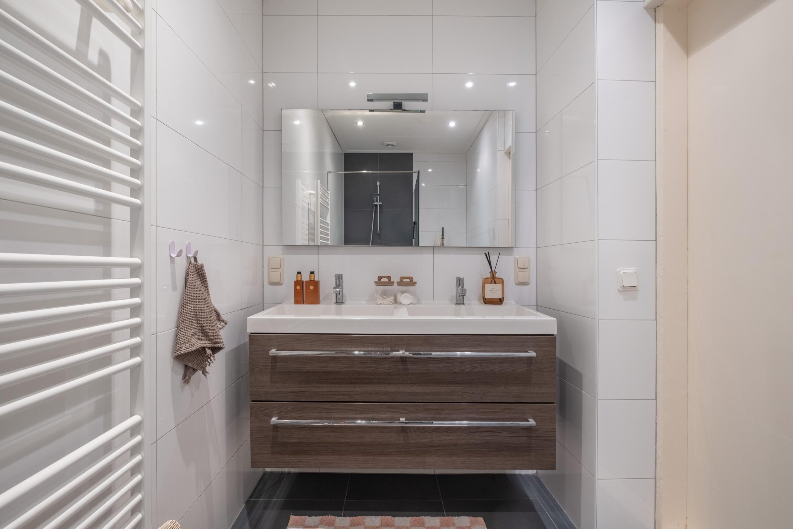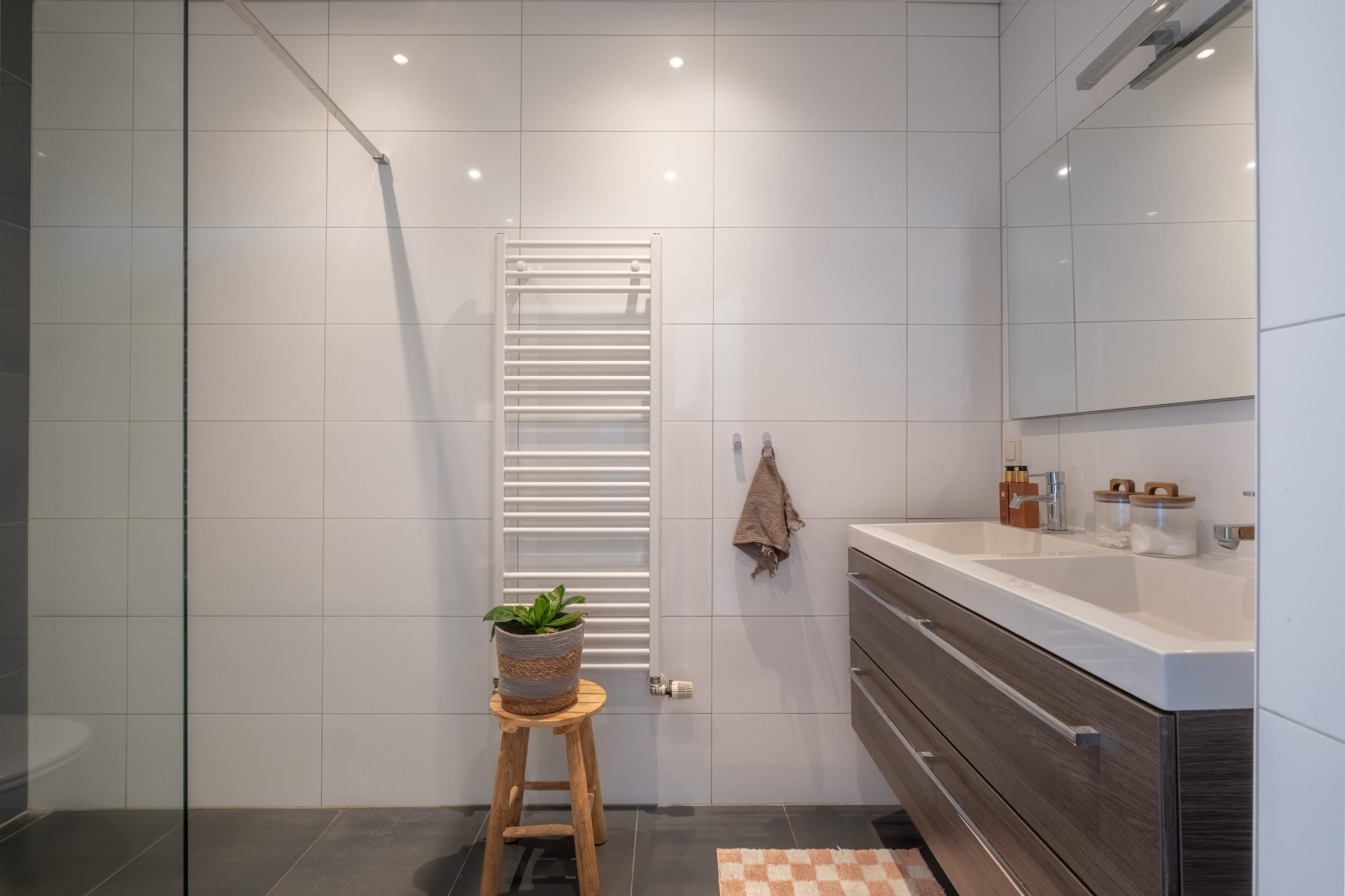 De badkamer bevindt zich op de begane grond en is in 2014 vernieuwd. Hier vind je een inloopdouche, wandtoilet en dubbele wastafel met meubel. De combinatie van witte wandtegels en donkere accenten geeft de ruimte een moderne uitstraling.