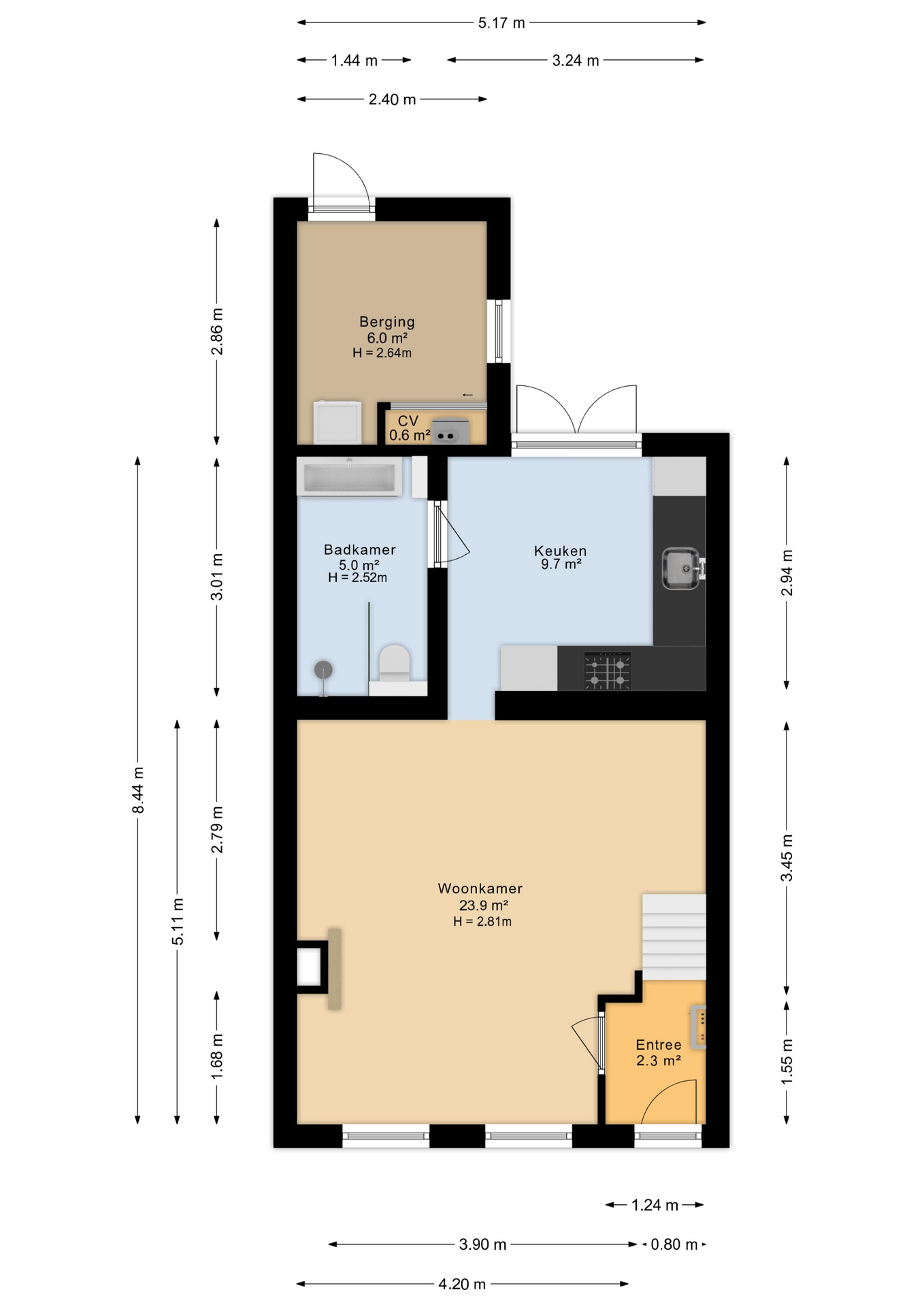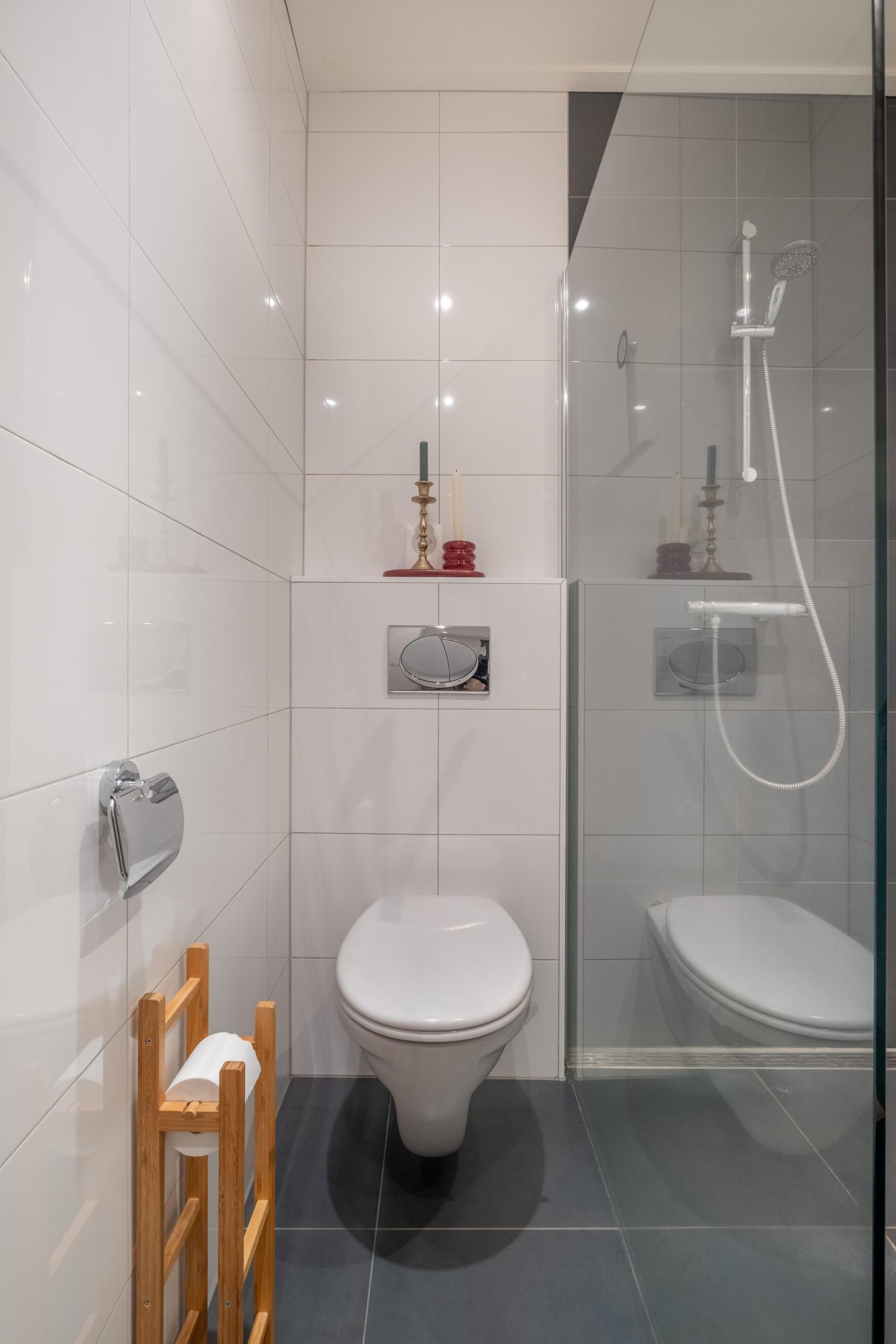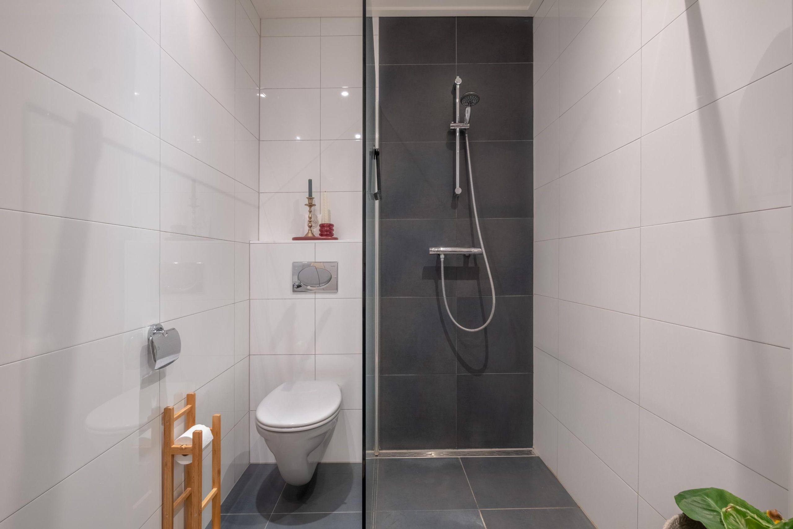 De badkamer bevindt zich op de begane grond en is in 2014 vernieuwd. Hier vind je een inloopdouche, wandtoilet en dubbele wastafel met meubel. De combinatie van witte wandtegels en donkere accenten geeft de ruimte een moderne uitstraling.