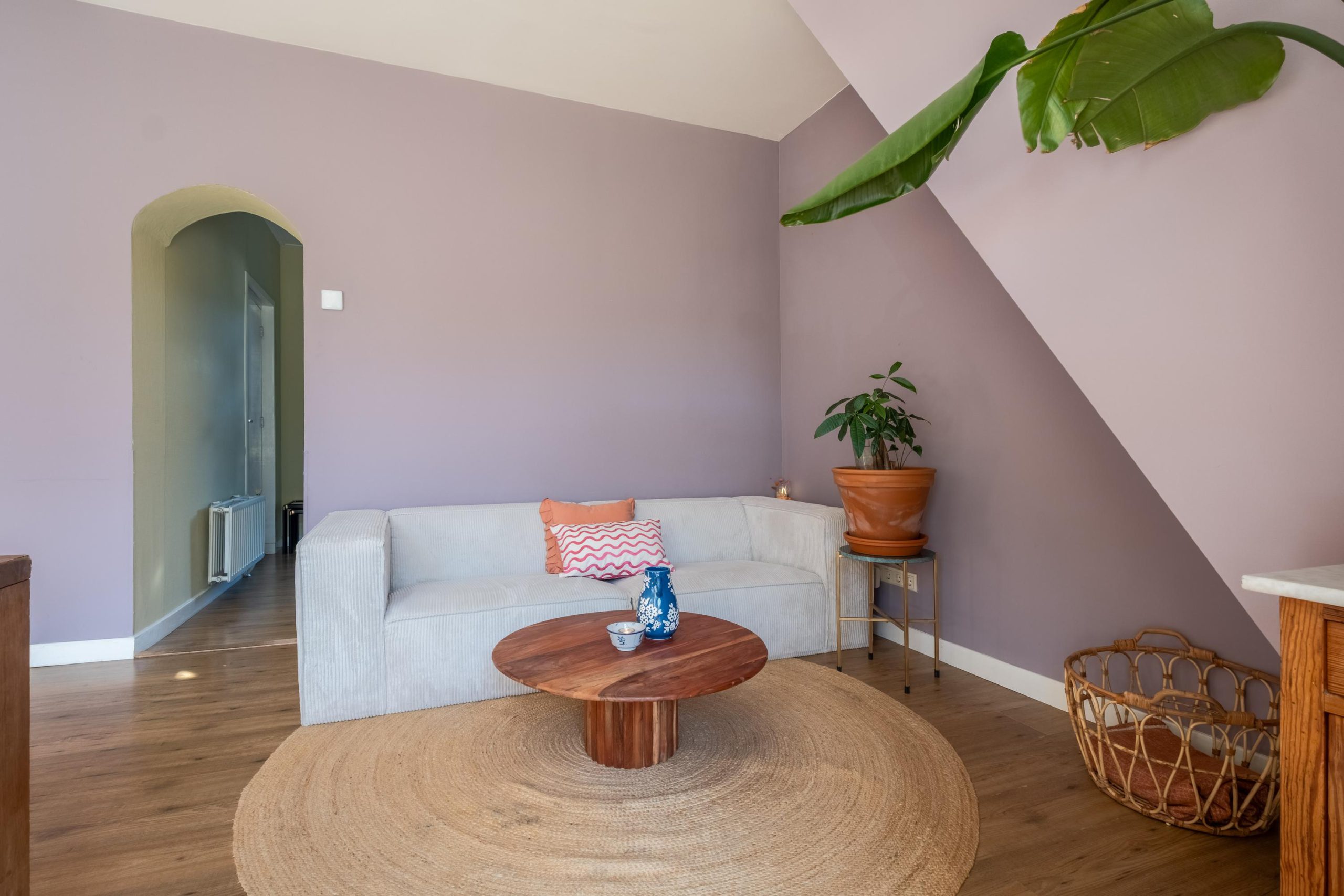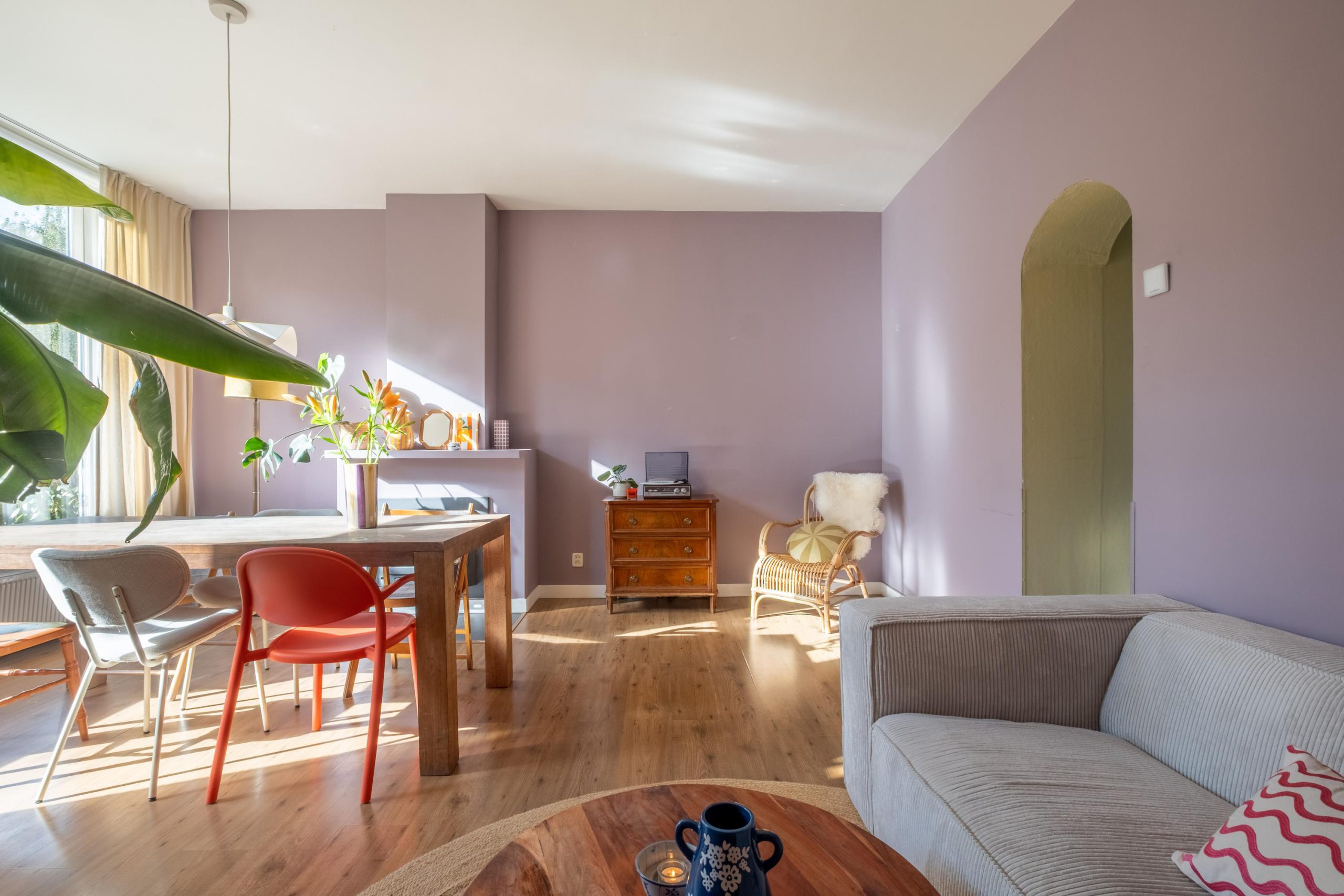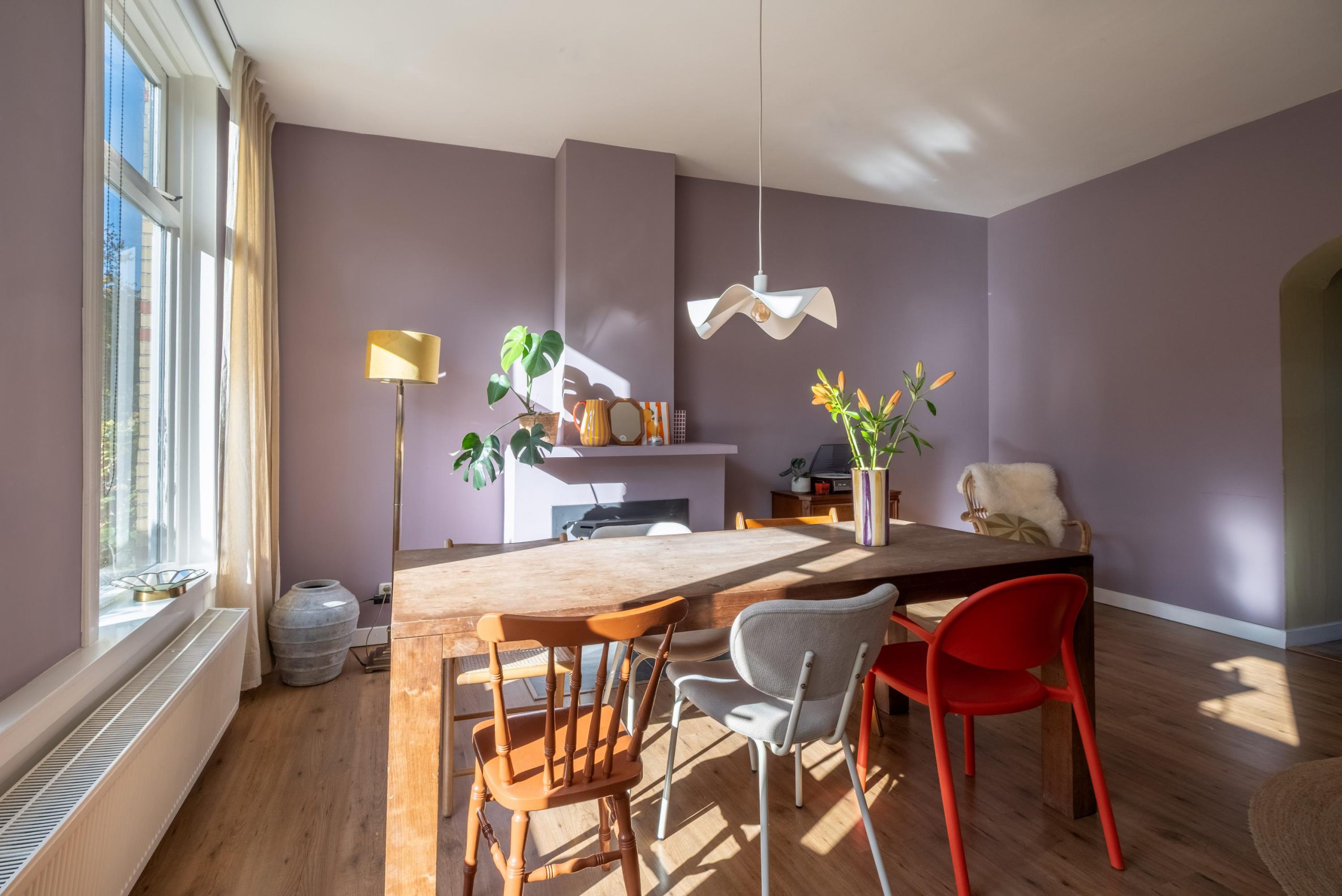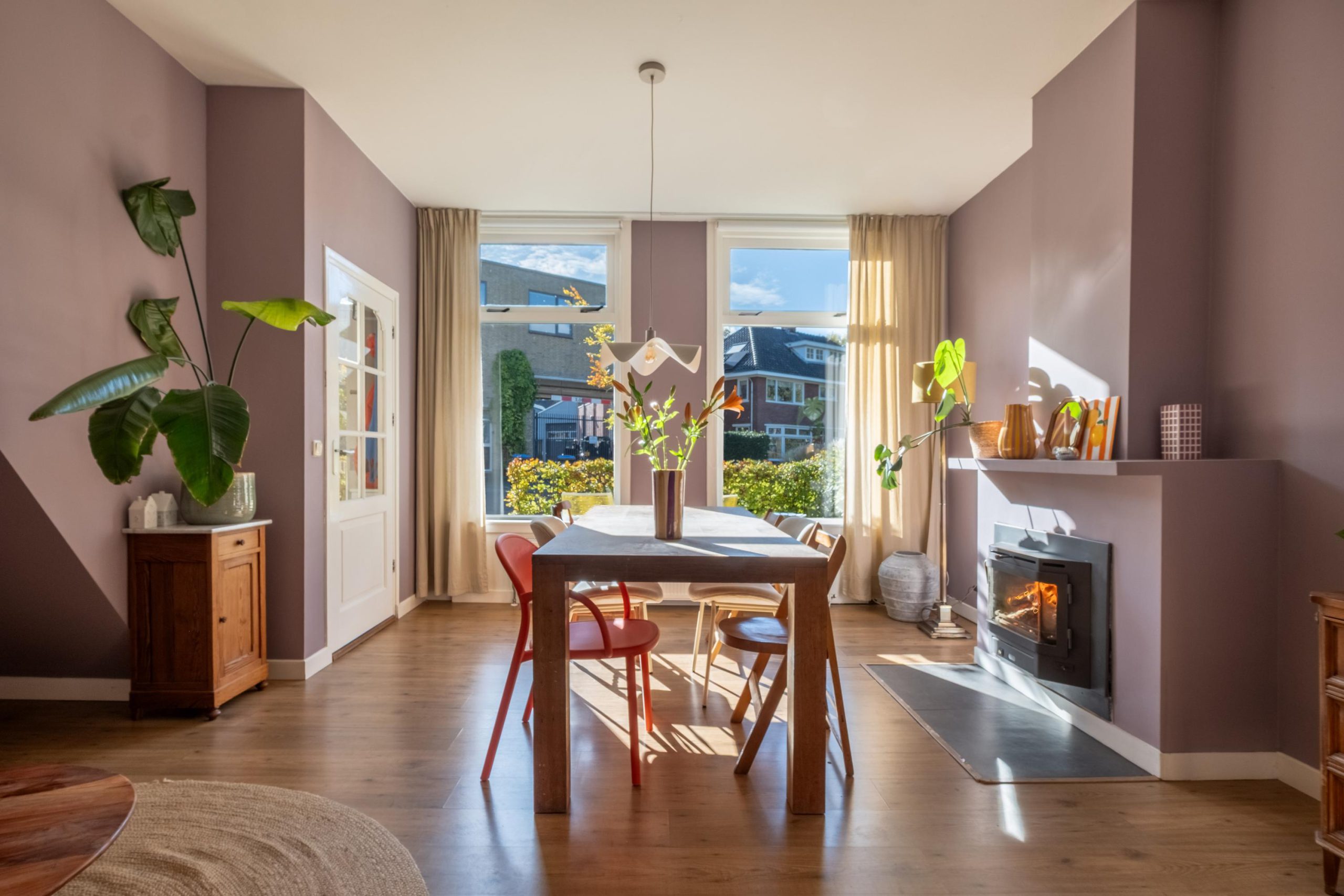 De woonkamer is direct een fijne verrassing: ruim, licht en sfeervol. Grote raampartijen zorgen voor volop daglicht en een mooi uitzicht op de straat. De wanden zijn strak gestuct en de betonvloer met laminaatafwerking vormt een praktische basis. De houtkachel maakt het in de winter extra gezellig – ideaal voor knusse avonden thuis.