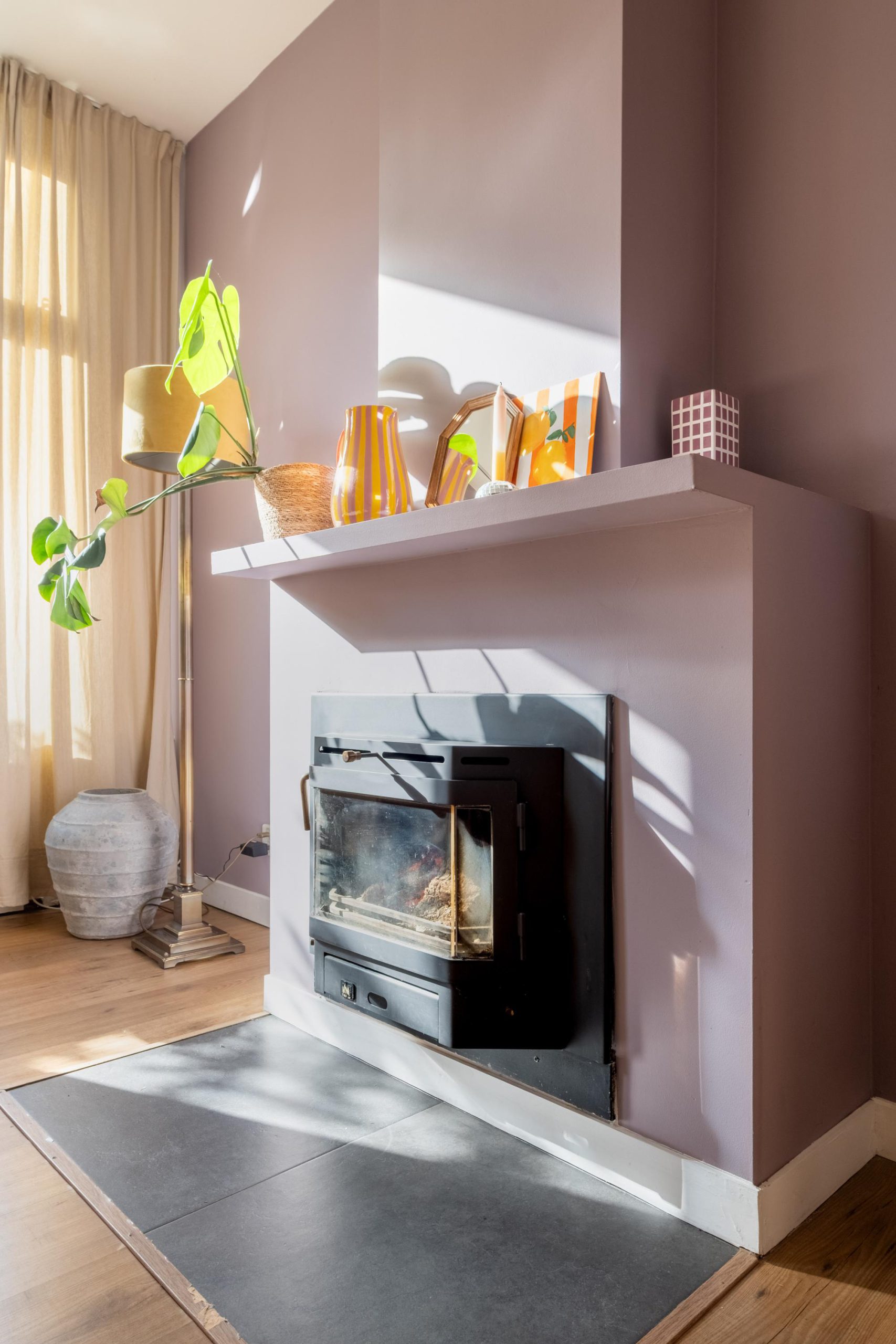 -Sfeervolle woonkamer met houtkachel en strak gestucte wanden