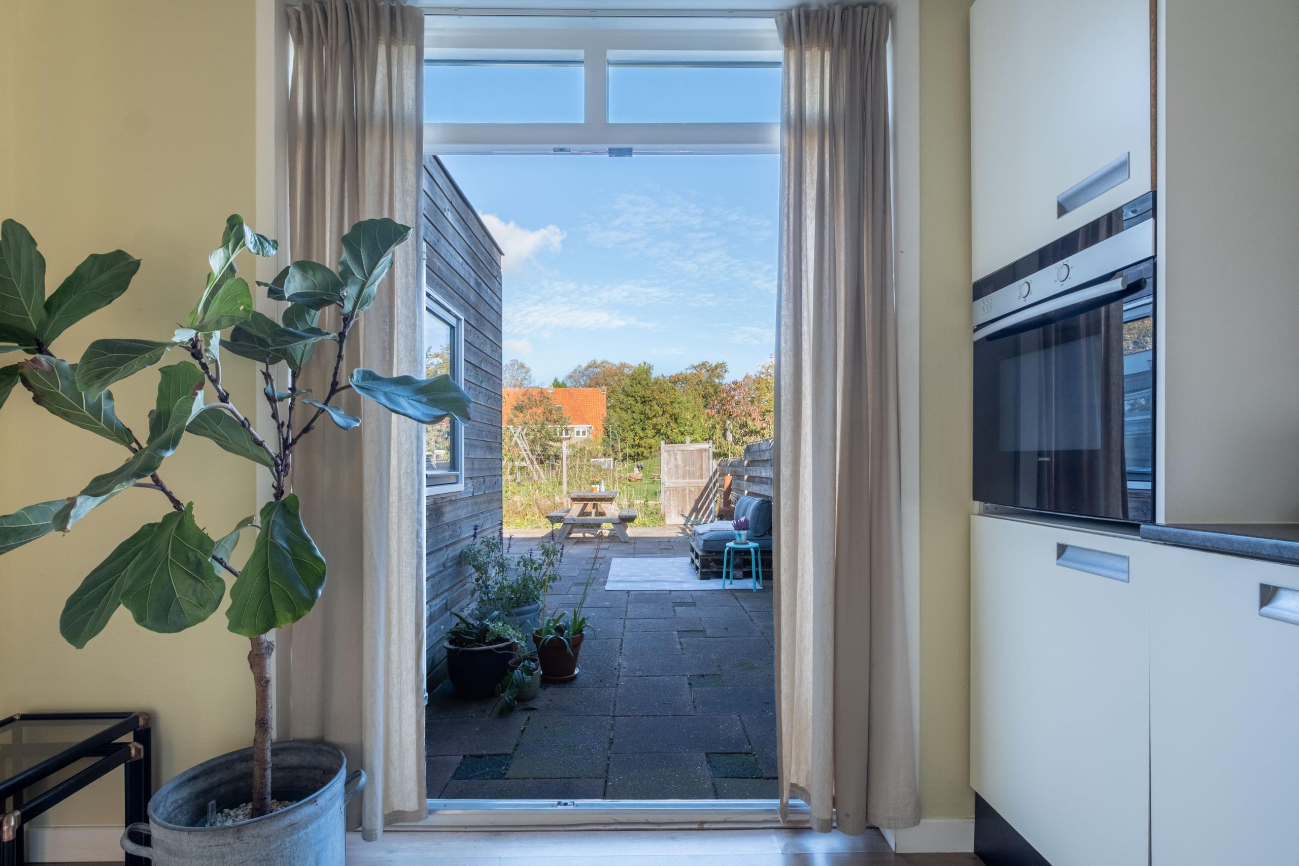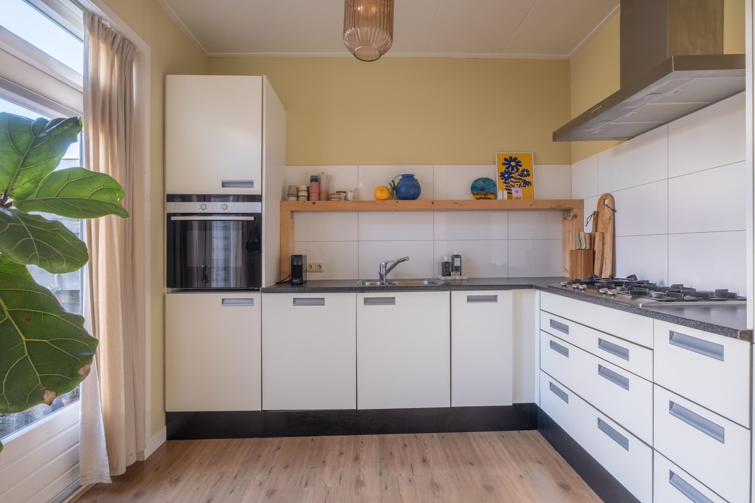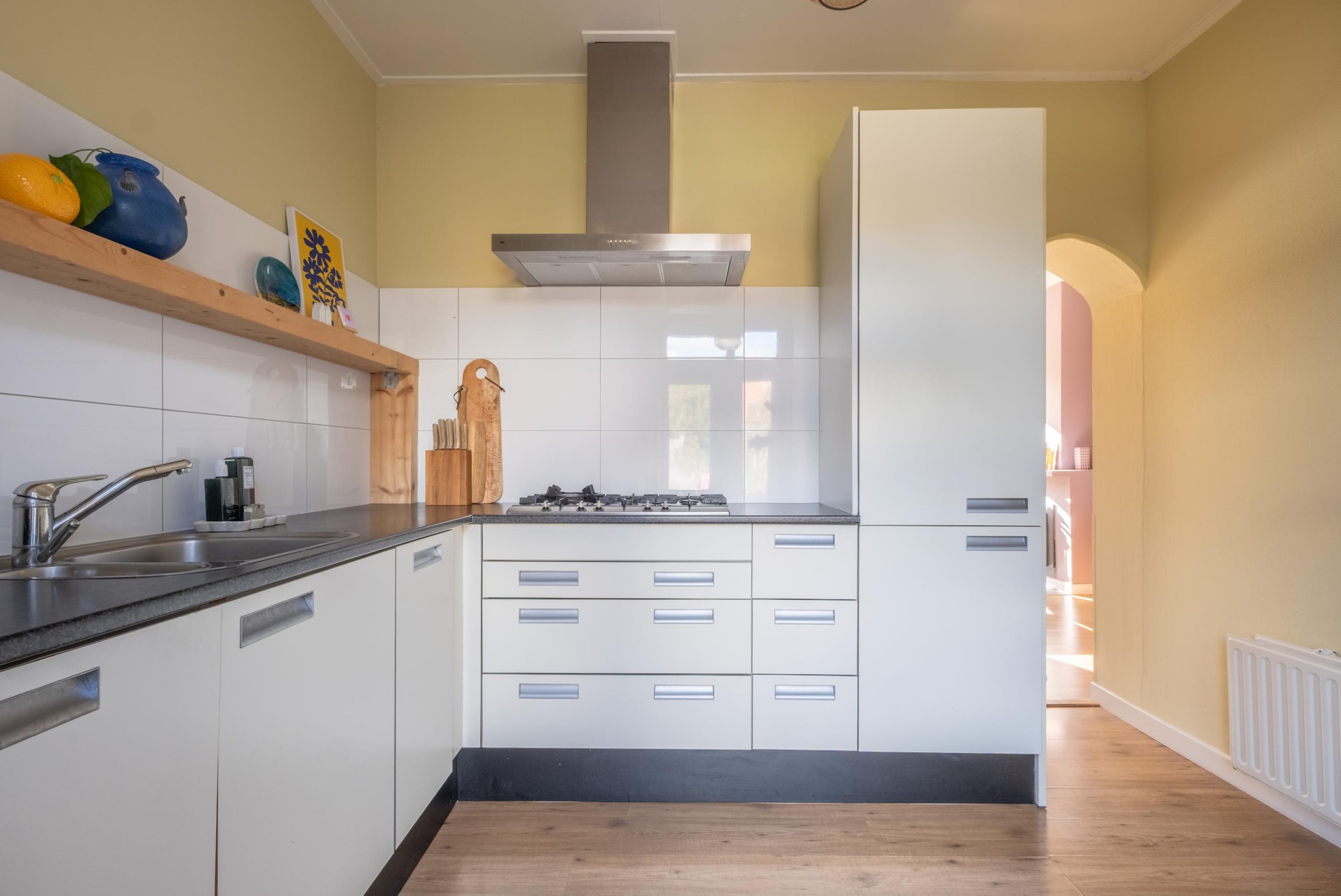 Via de ronde doorgang bereik je de keuken, die aan de achterzijde van de woning ligt. De hoekopstelling biedt veel kastruimte en is uitgerust met een gaskookplaat, afzuigkap en oven. De lichte kleurstelling en het uitzicht op de tuin maken dit een heerlijke plek om te koken en tafelen.