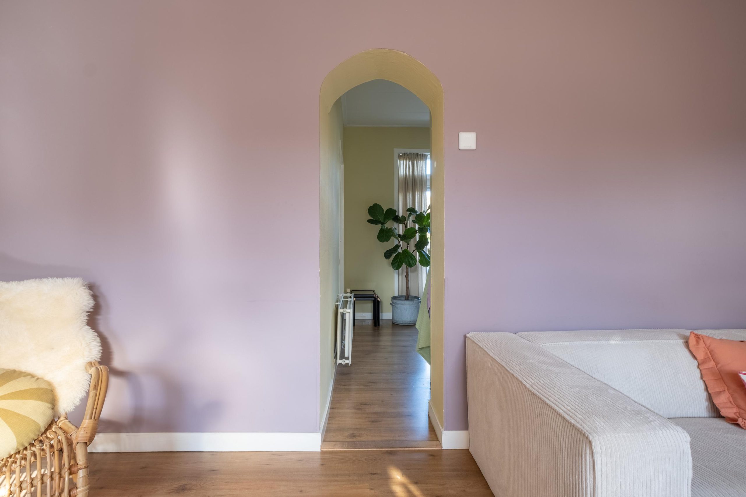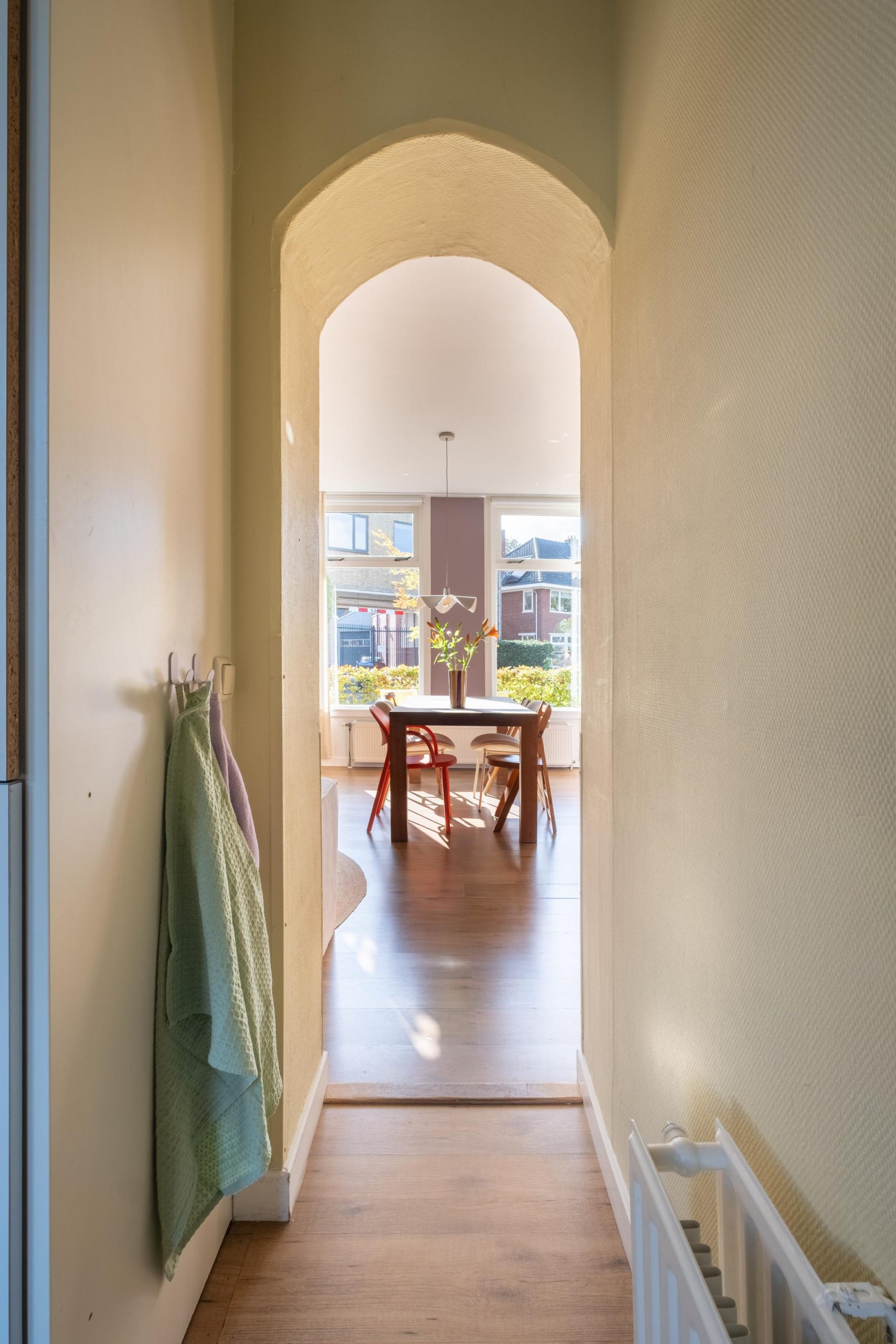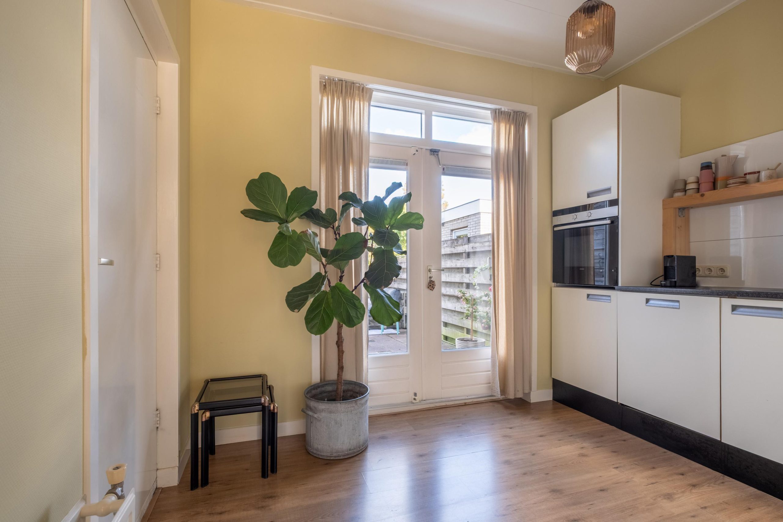 Via de ronde doorgang bereik je de keuken, die aan de achterzijde van de woning ligt. De hoekopstelling biedt veel kastruimte en is uitgerust met een gaskookplaat, afzuigkap en oven. De lichte kleurstelling en het uitzicht op de tuin maken dit een heerlijke plek om te koken en tafelen.
