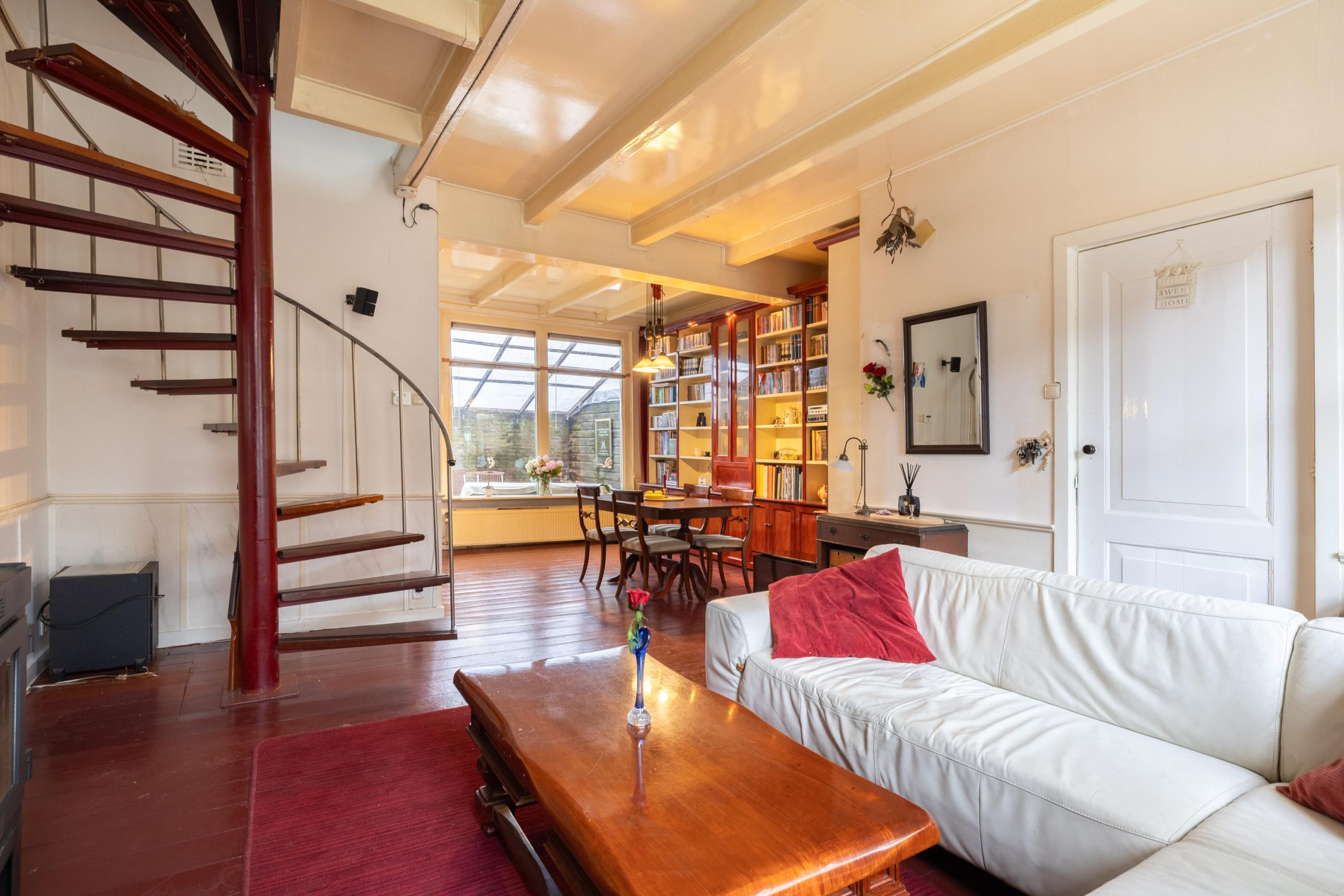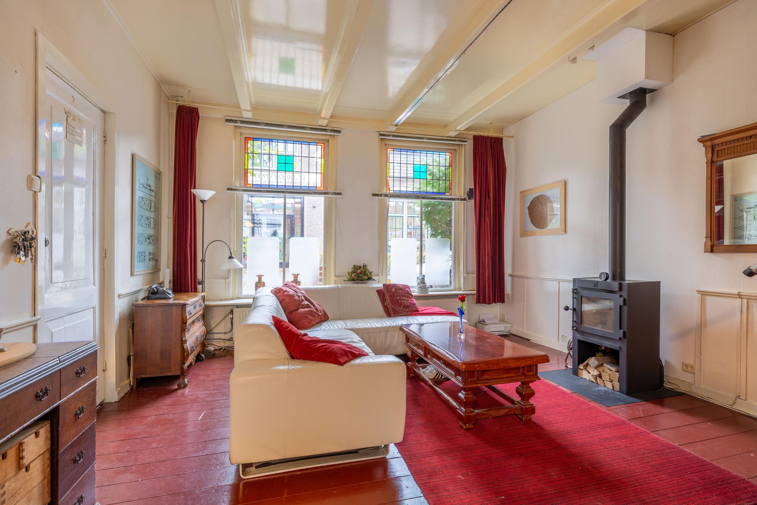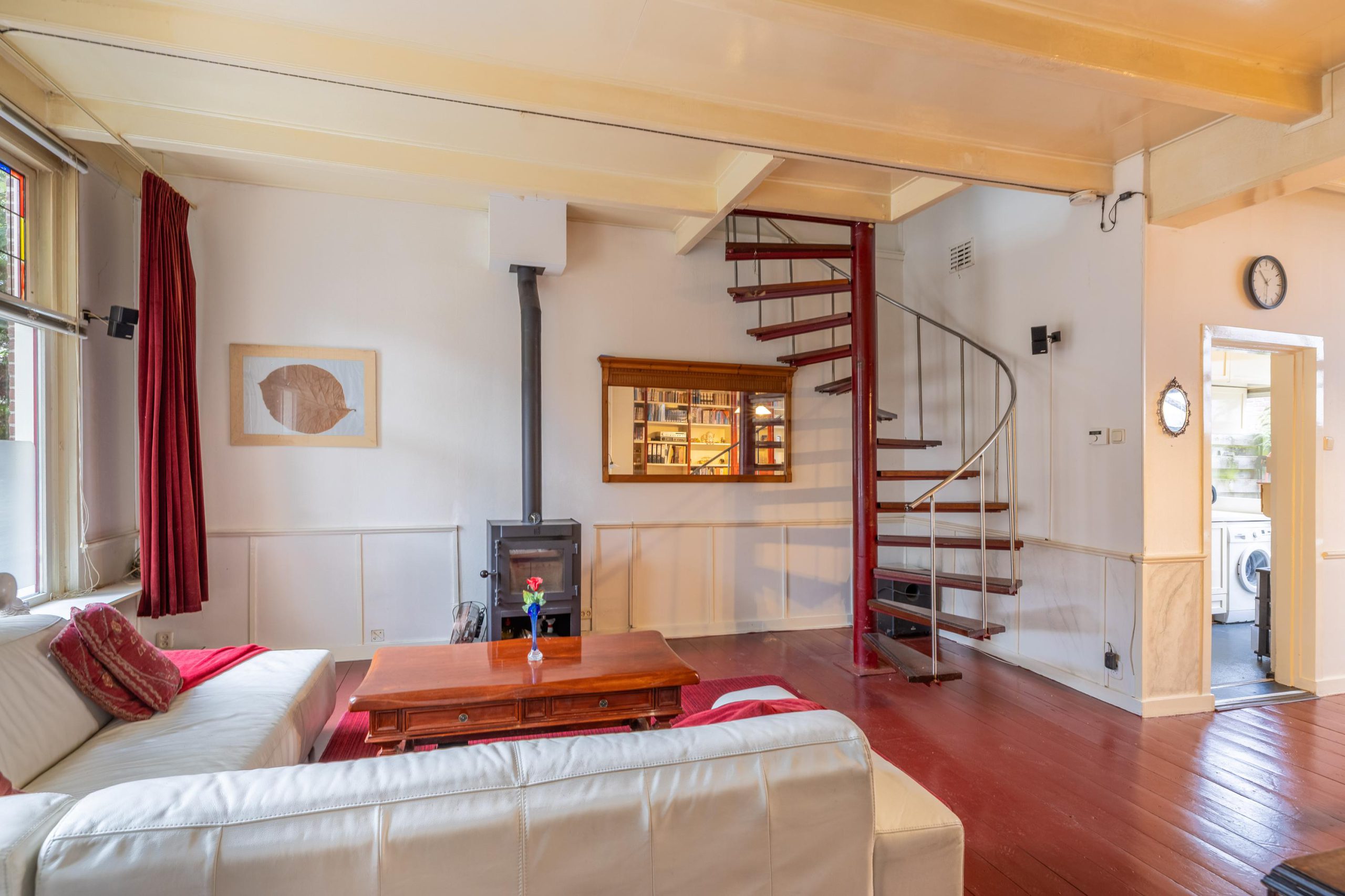 De woonkamers is warme ingericht. De houtkachel, houtenvloer en balkenplafond zorgen samen voor een warme, knusse sfeer. De trap naar boven geeft het geheel een speels accent. Aan de voorzijde is het gezellig zitten met uitzicht op de rustige straat, terwijl er aan de achterzijde plek is voor een eettafel bij het raam.