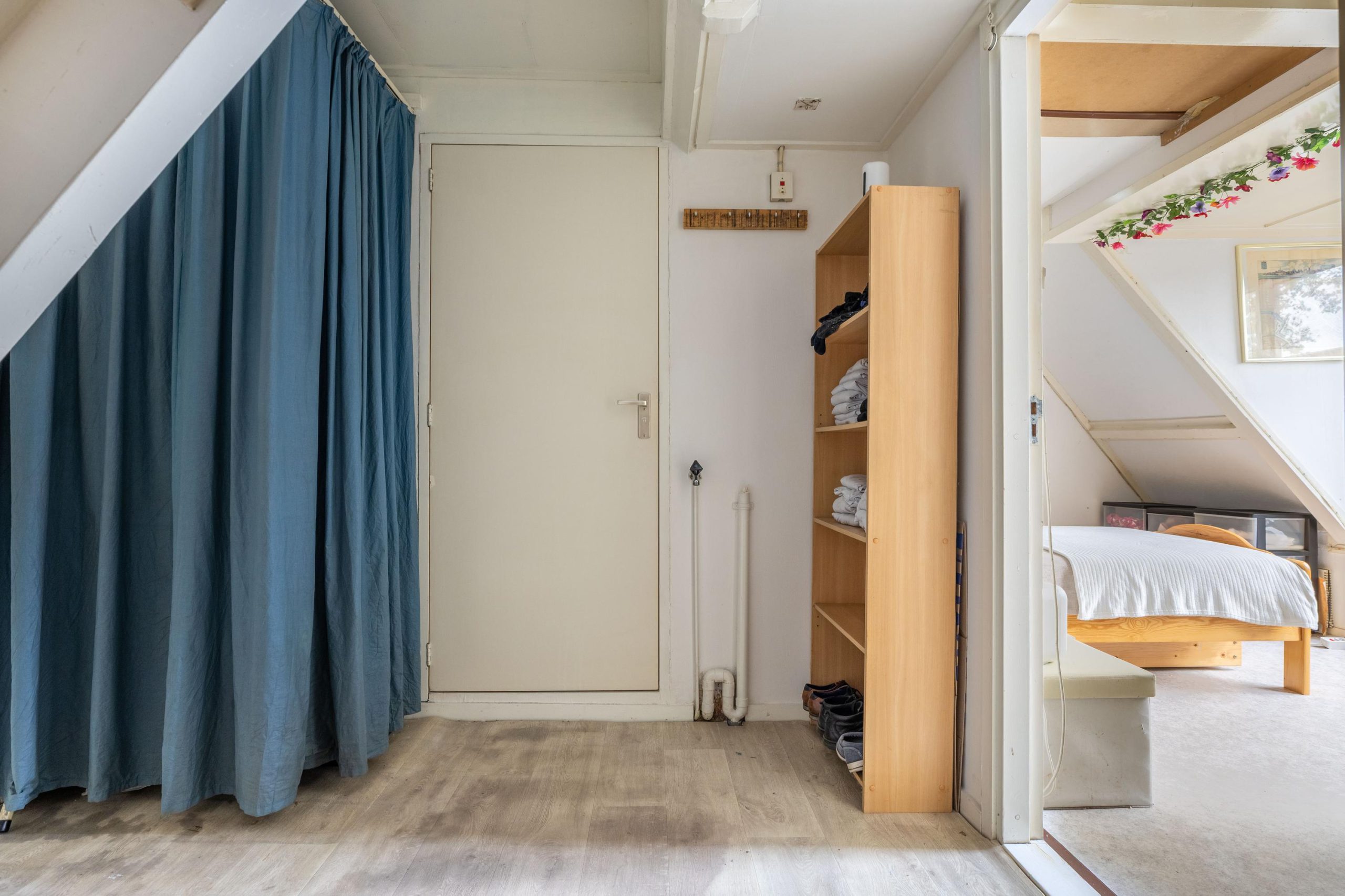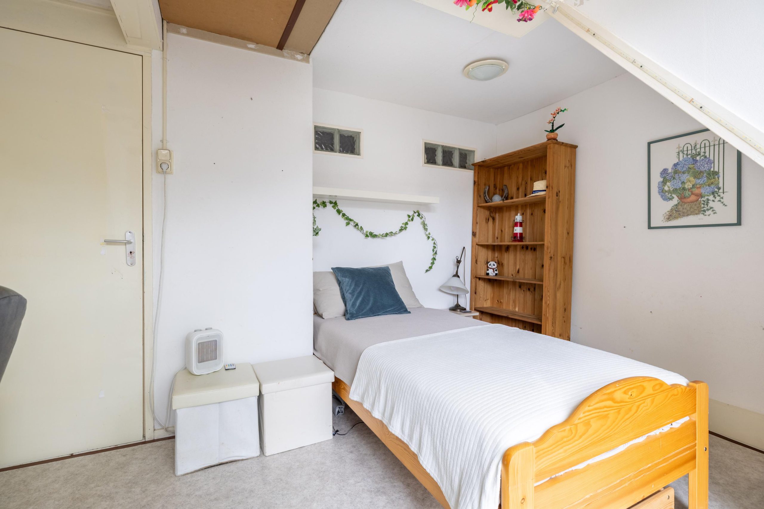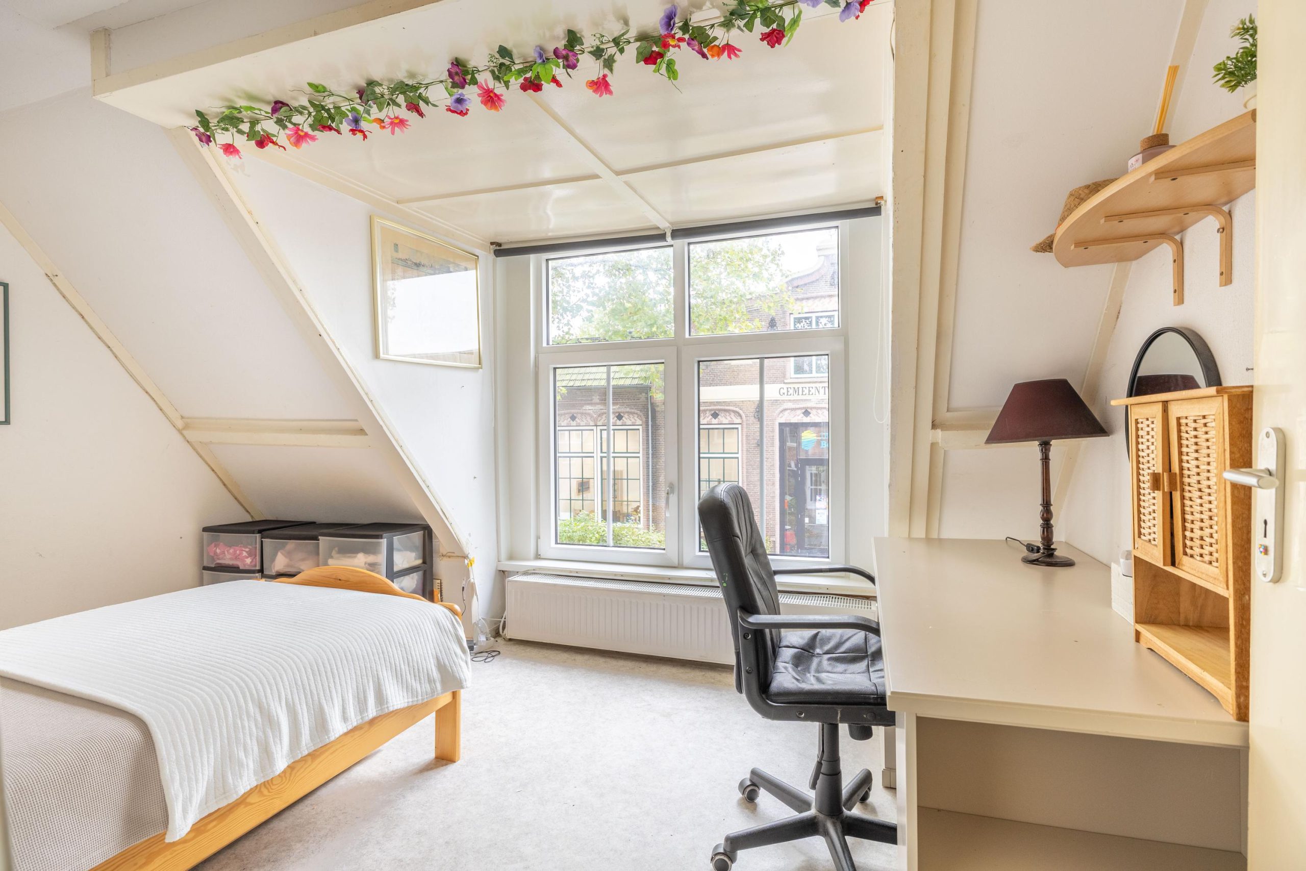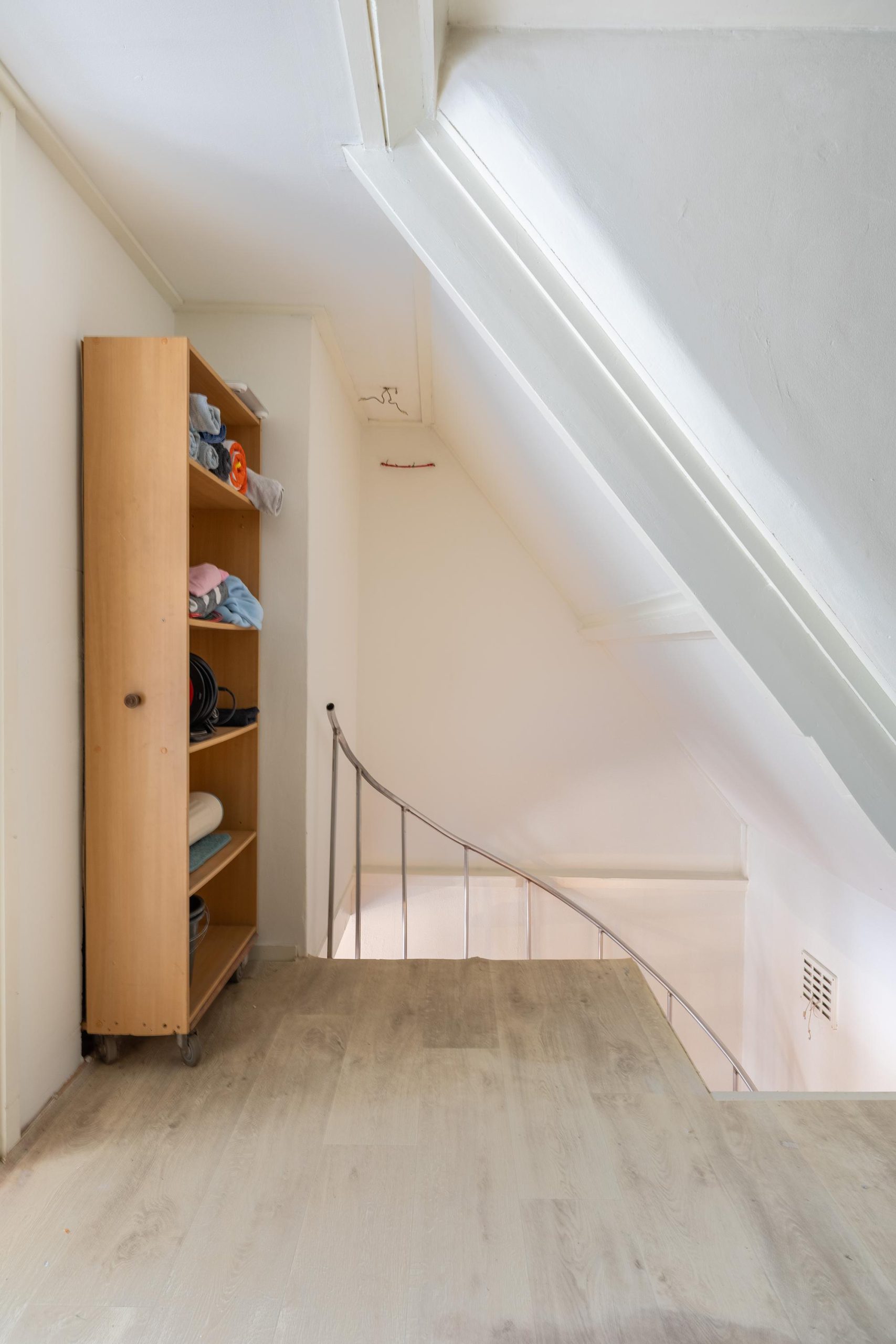 De wenteltrap brengt je naar boven, waar twee slaapkamers zijn te vinden. De grootste kamer kijkt uit over de straat. De tweede is ideaal als logeer kamer of werkkamer. De badkamer ligt ertussenin en is praktisch ingericht.
