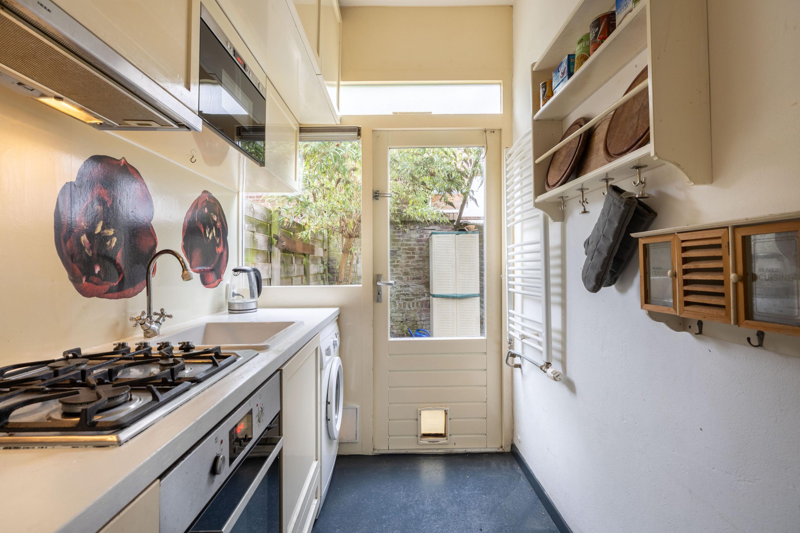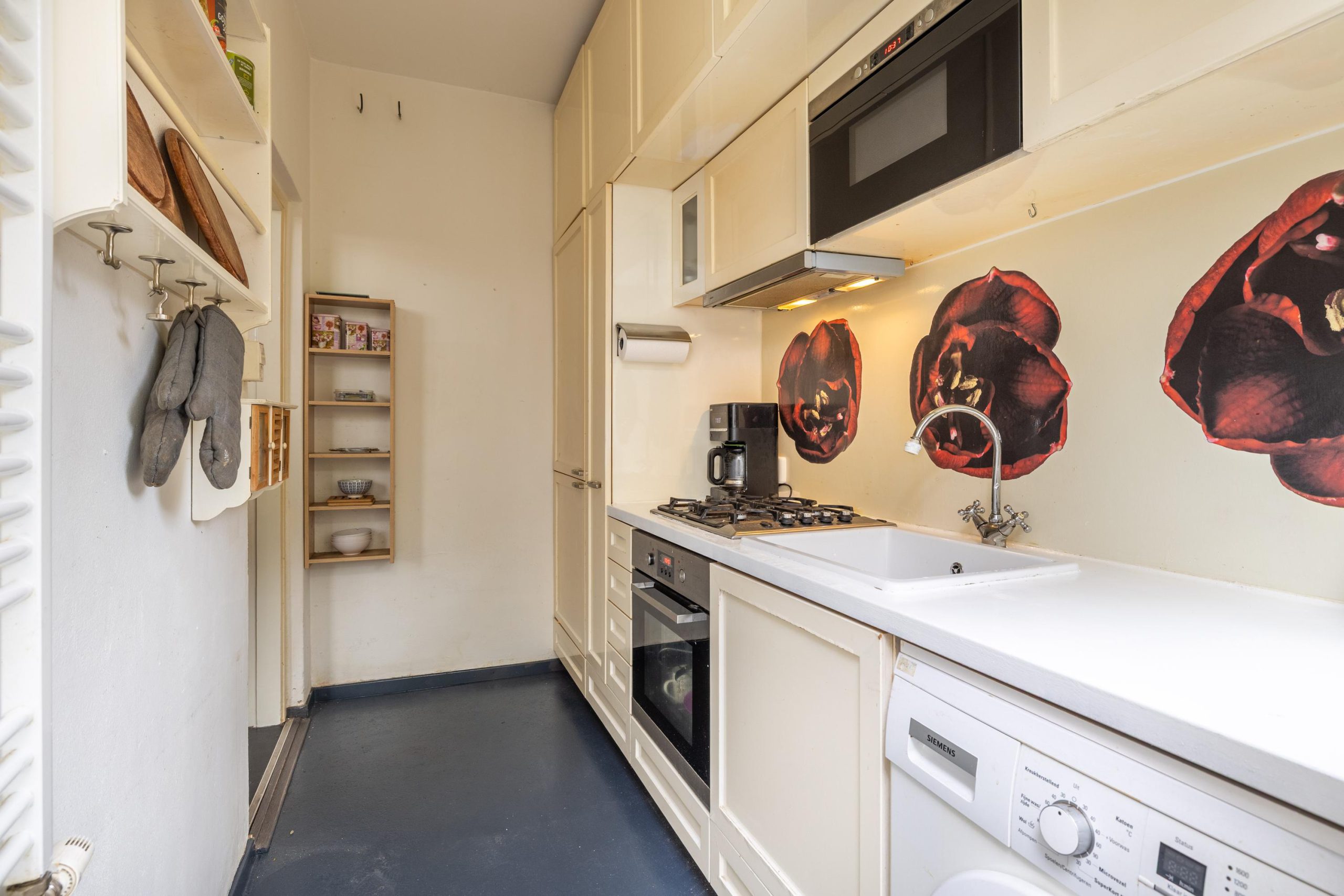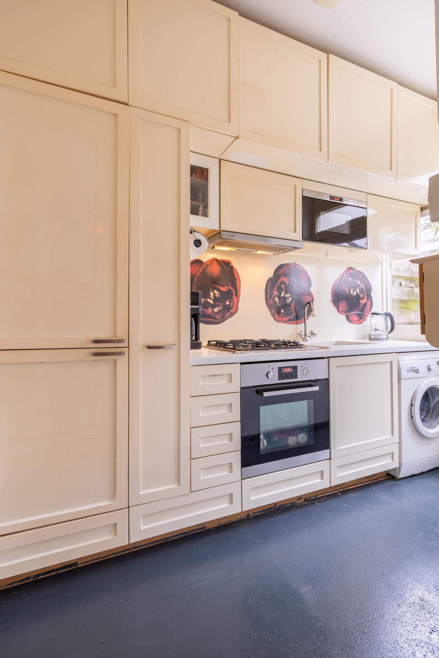 Via de woonkamer en eetkamer loop je door naar de keuken. Smal van vorm maar slim ingericht. In de keuken bevinden zich lichte kasten, een oven, gaskookplaat en zelfs ruimte voor de wasmachine. Hier kun je prima koken, bakken en genieten van een wijntje.