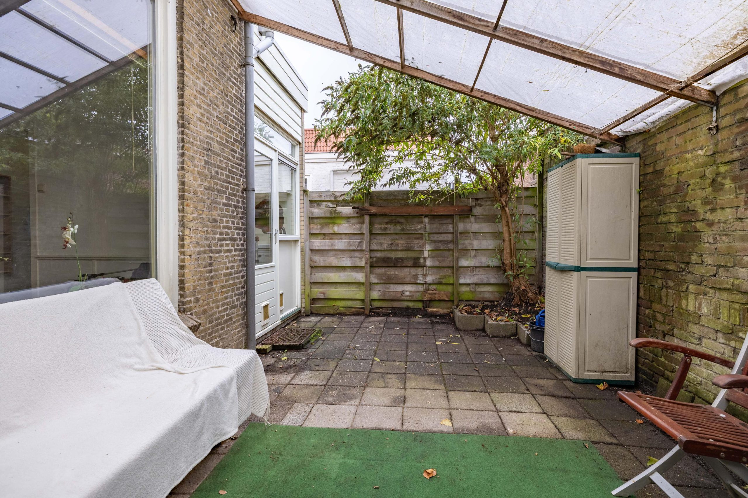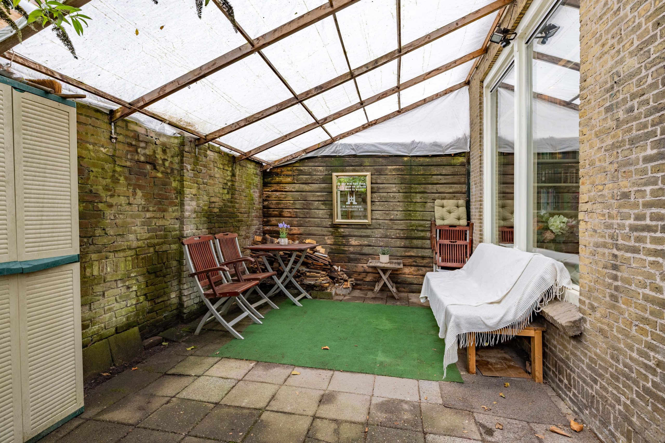 De achtertuin is eenvoudig, maar wel heel beschut. Dankzij de overkapping kun je hier het hele jaar door lekker zitten. Een fijn plekje voor een kop koffie in de ochtendzon of een glas wijn aan het eind van de dag.