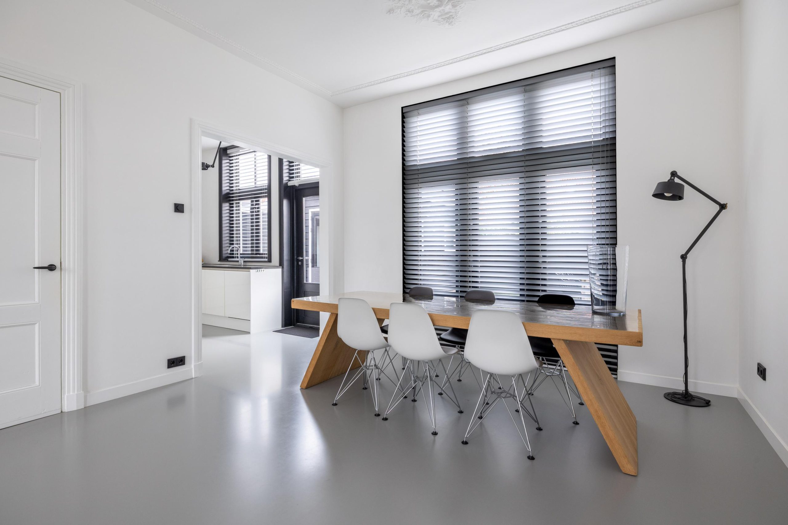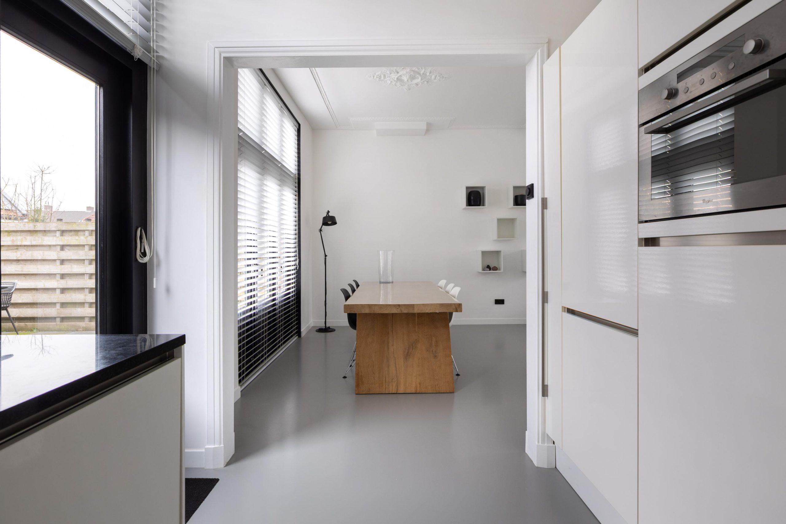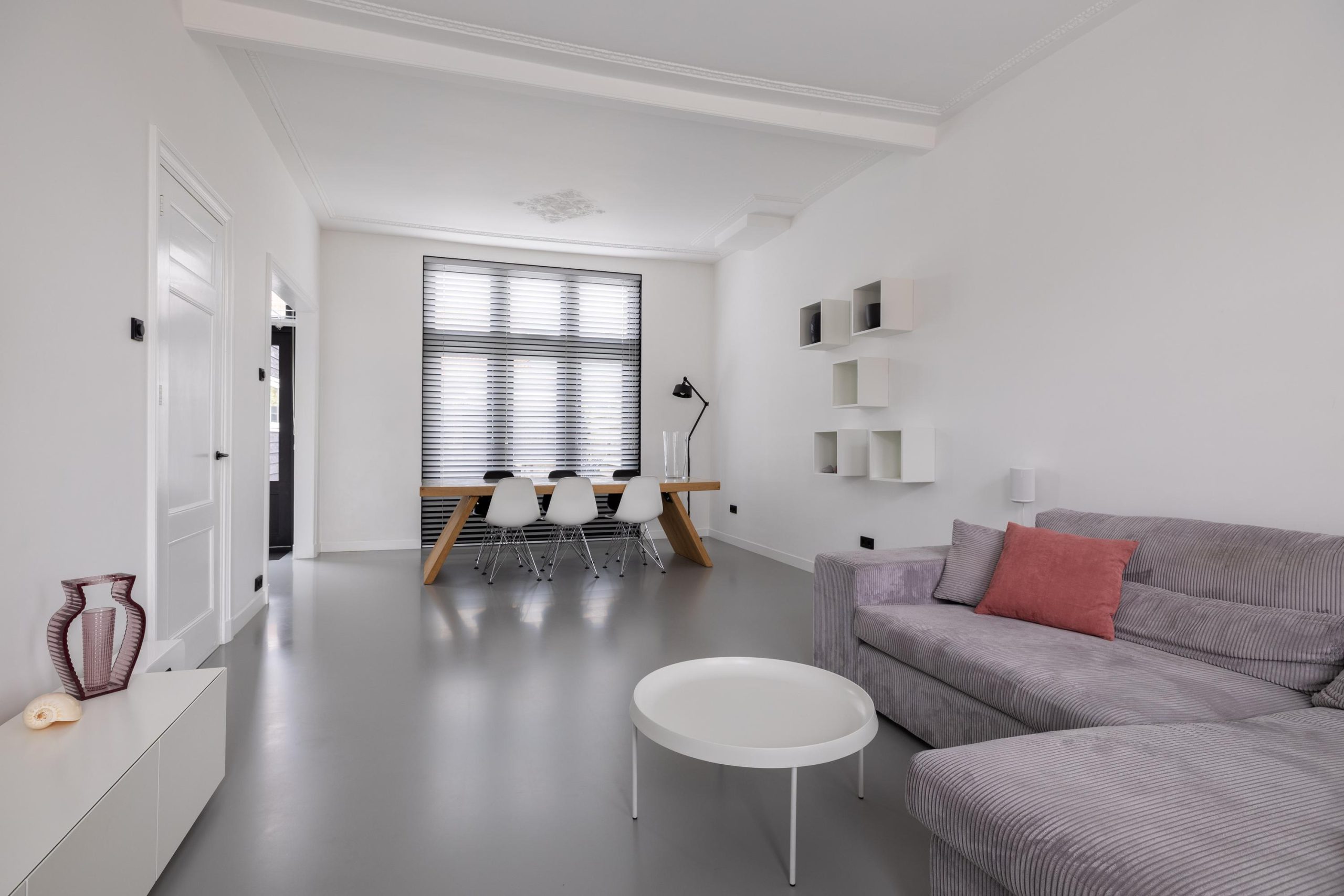 De woonkamer is licht, strak en stijlvol. De gietvloer vormt een rustig geheel met de volledig gestucte wanden, terwijl de originele sierlijsten in het plafond nét dat beetje karakter toevoegen. Strak, maar met sfeer. Een ruimte die moeiteloos meebeweegt met elk moment van de dag.