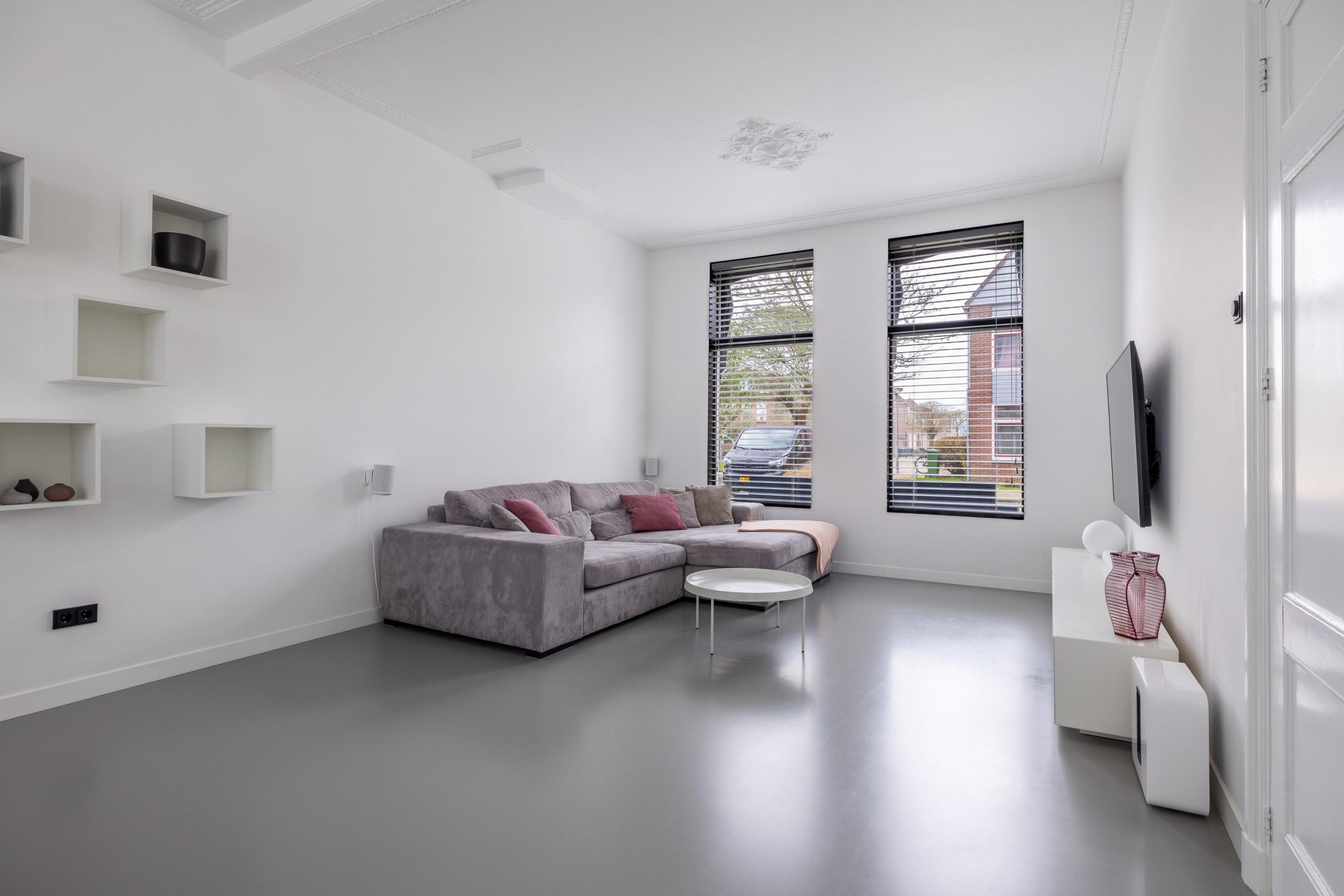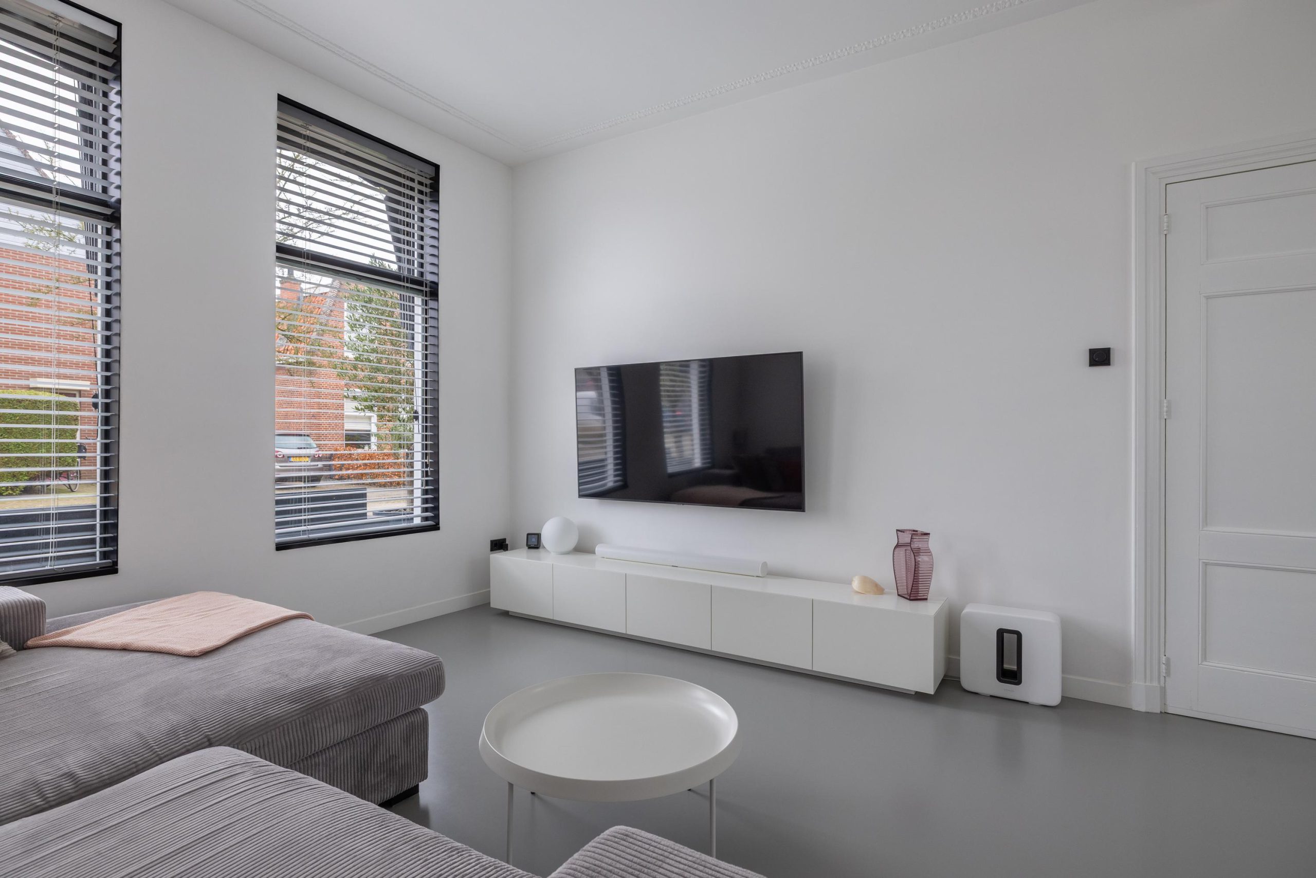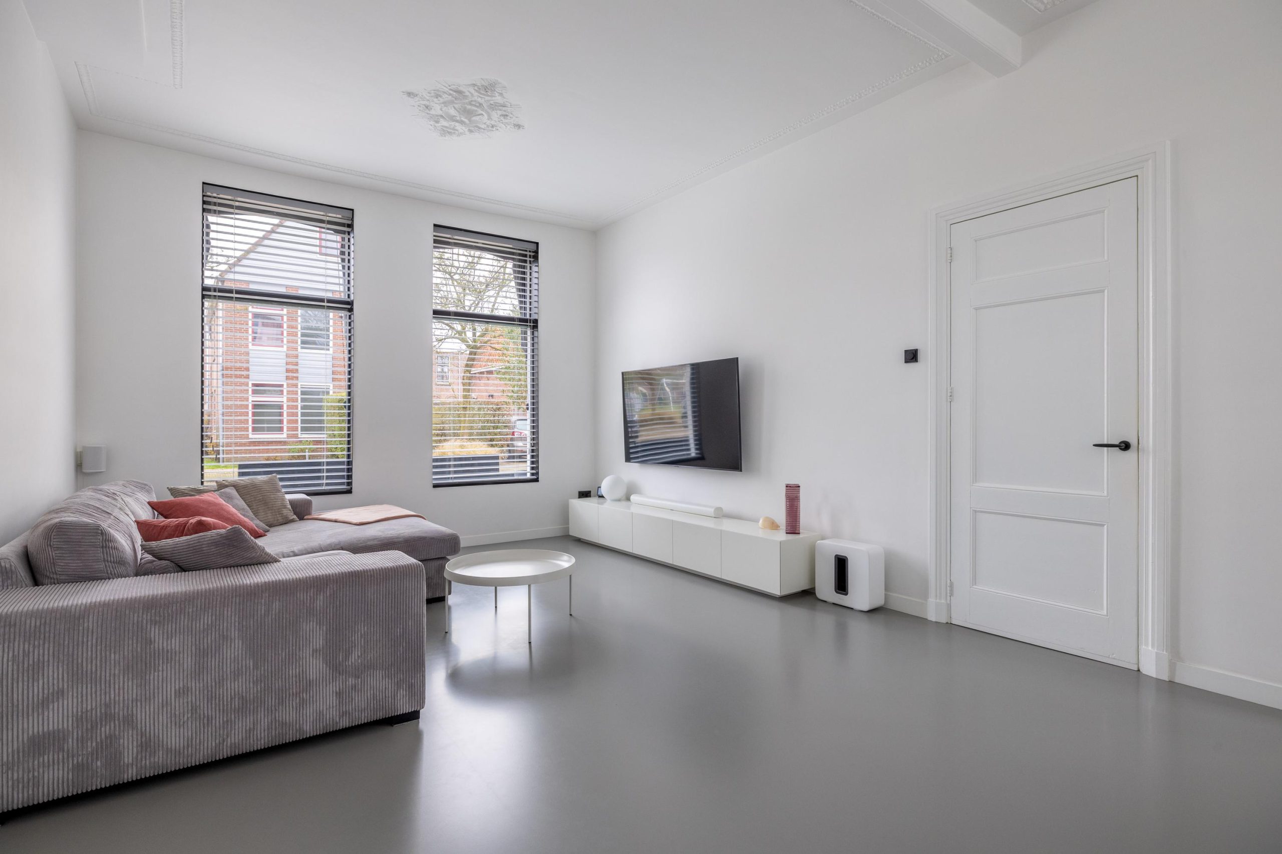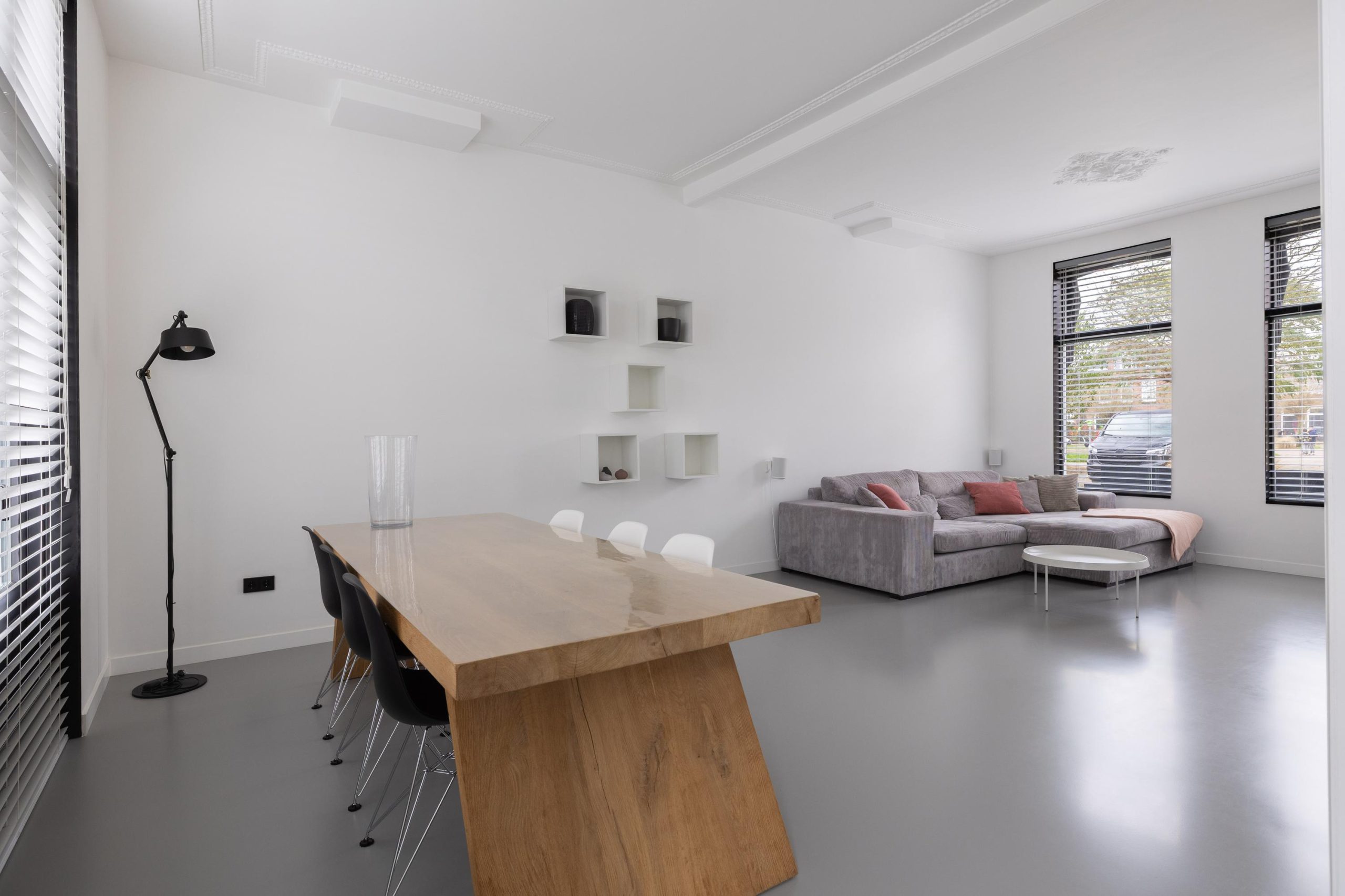 De woonkamer is licht, strak en stijlvol. De gietvloer vormt een rustig geheel met de volledig gestucte wanden, terwijl de originele sierlijsten in het plafond nét dat beetje karakter toevoegen. Strak, maar met sfeer. Een ruimte die moeiteloos meebeweegt met elk moment van de dag.