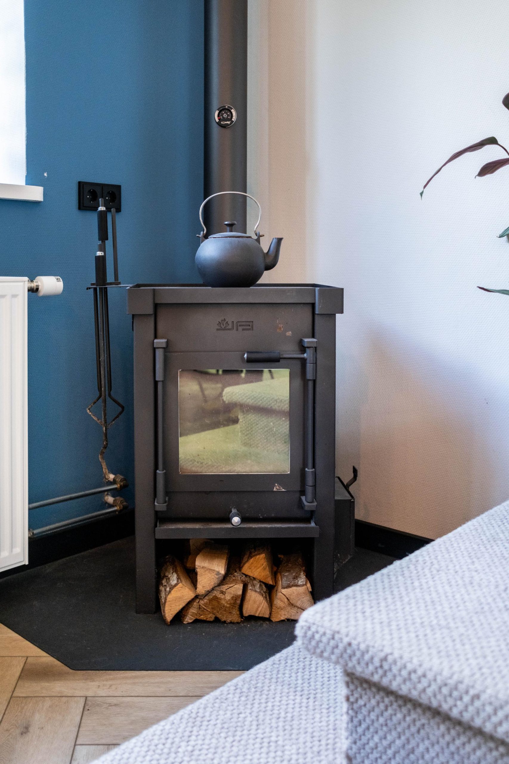 Op de eerste verdieping treffen we de woonkamer, waar een houtkachel zorgt voor sfeer en warmte. Ook hier weer die bijzondere hoogte, het licht, en een prachtig zicht op het groen buiten. En dat allemaal met een fantastische moderne afwerking! Je zou niet zeggen dat je zo dichtbij het centrum woont als je hier naar buiten kijkt.
