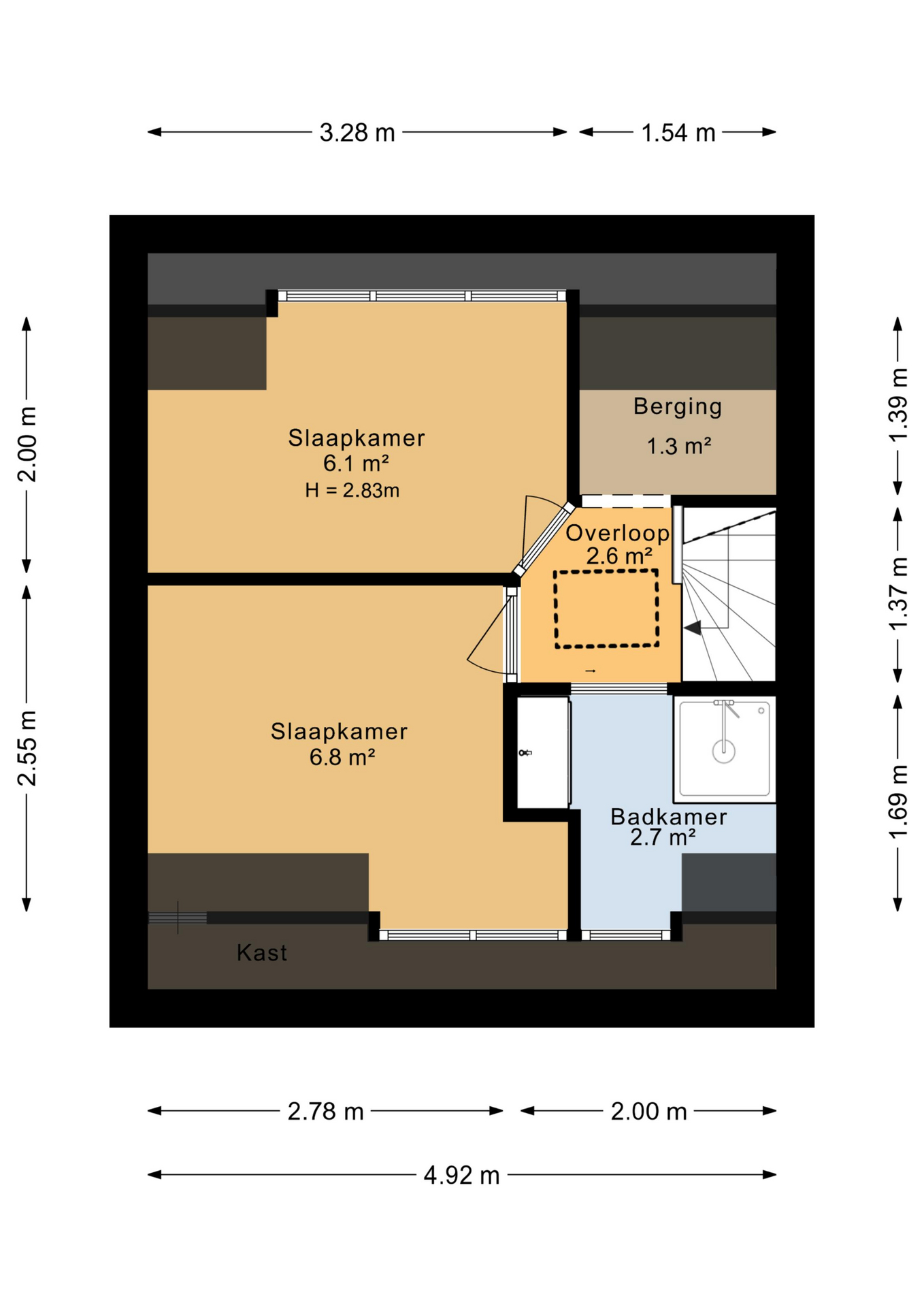 Eerste verdieping – twee slaapkamers + extra berging, slim ingedeeld