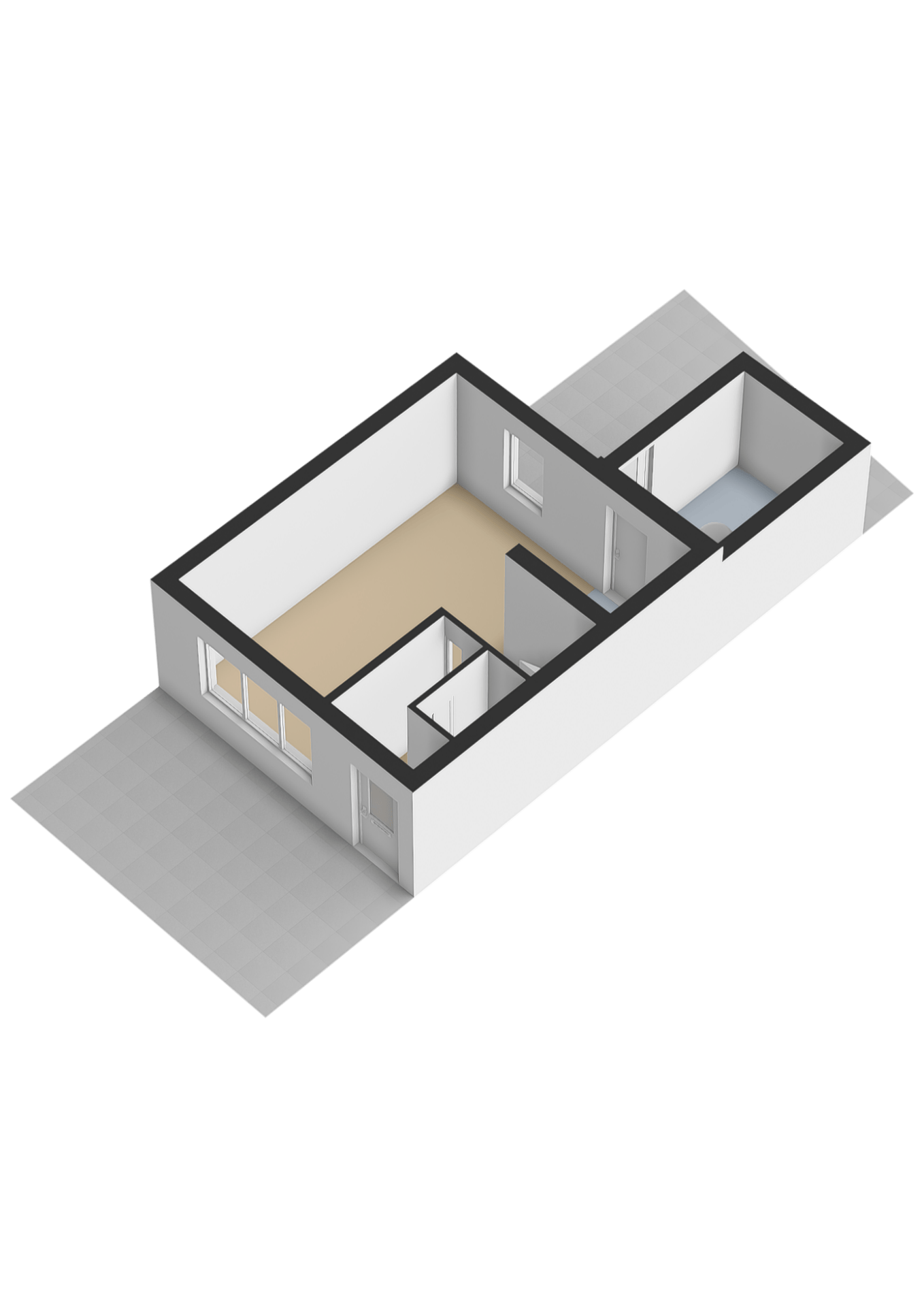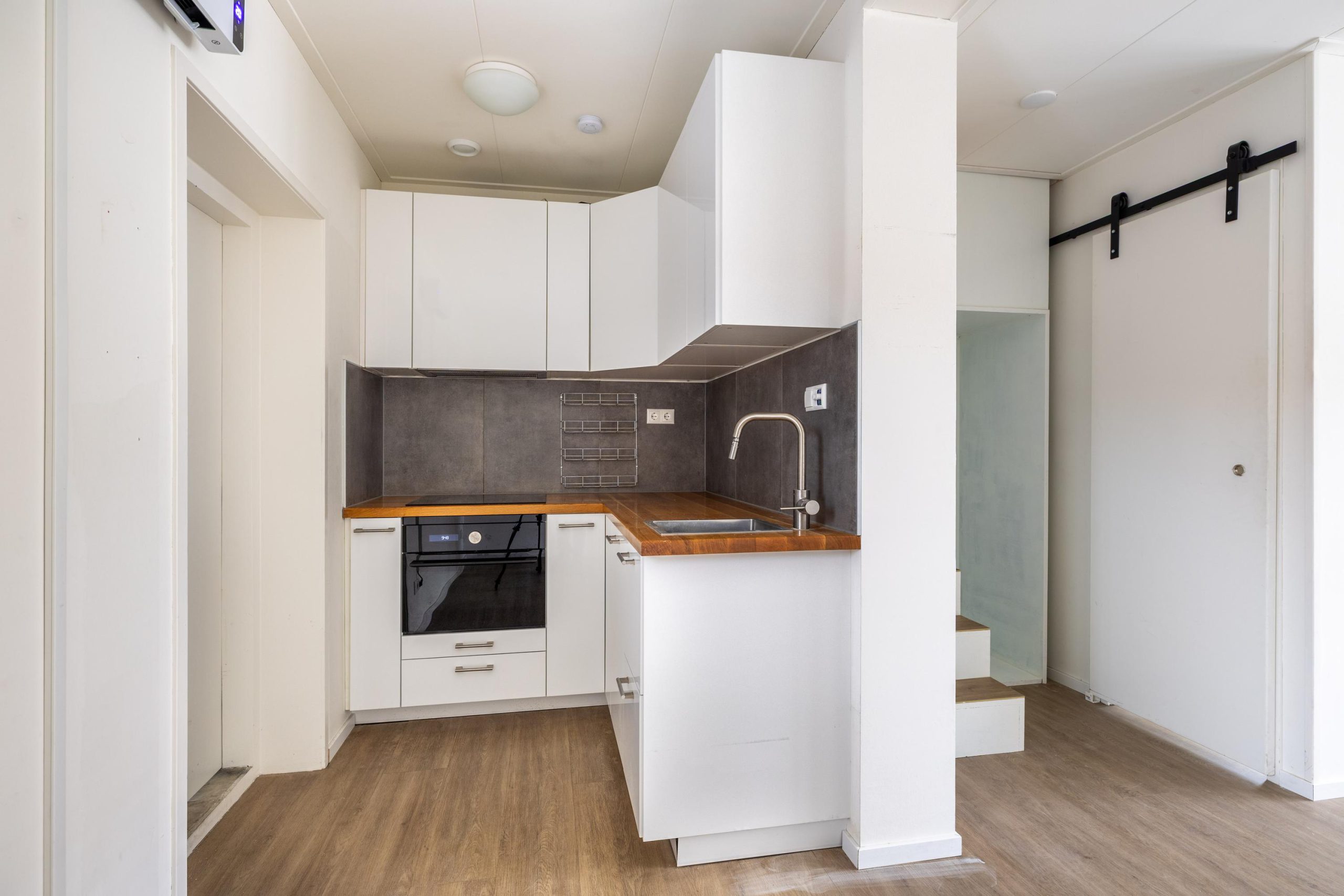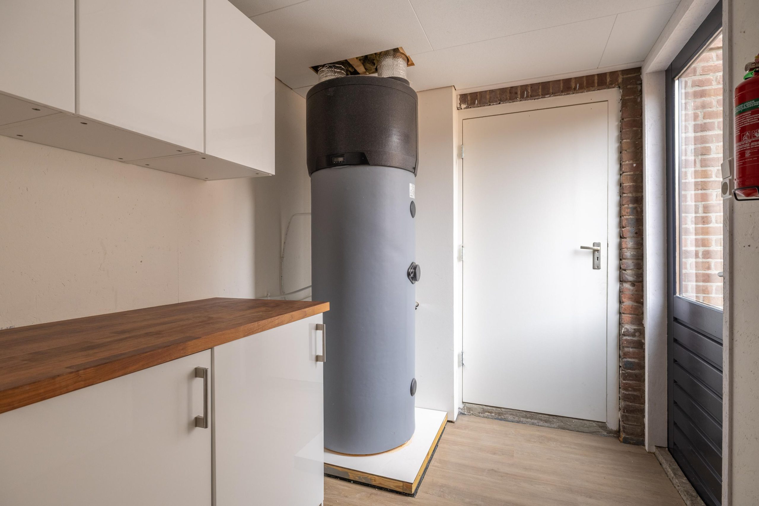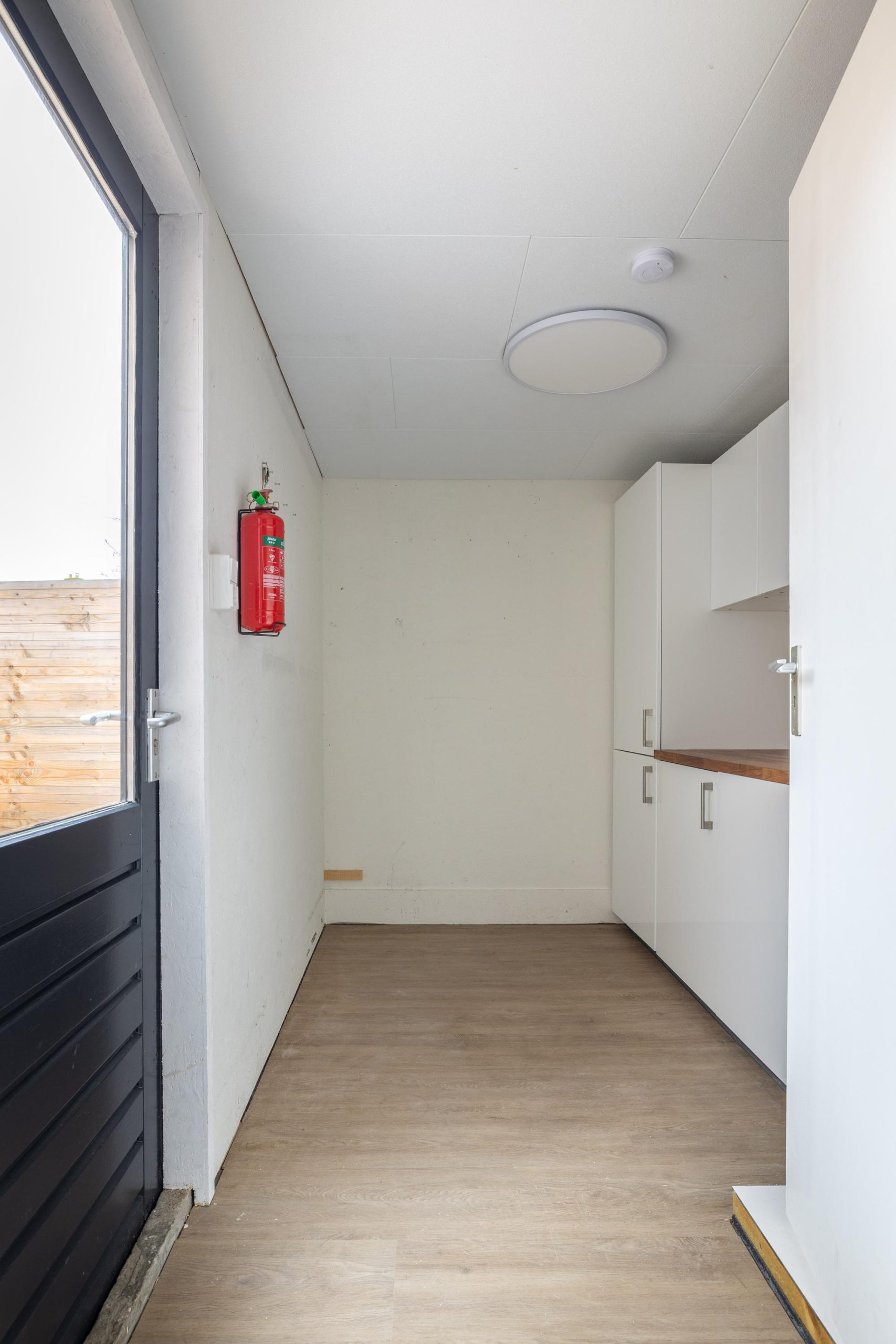 Achter de keuken vind je een compacte maar fijne bijkeuken. Hier staat de wasmachine op een ideale plek: uit het zicht, maar toch dichtbij. Daarnaast heb je er net dat beetje extra bergruimte voor voorraad, schoonmaakspullen of dagelijkse rommel die je graag achter een deur houdt. Praktisch, opgeruimd en ontzettend handig.