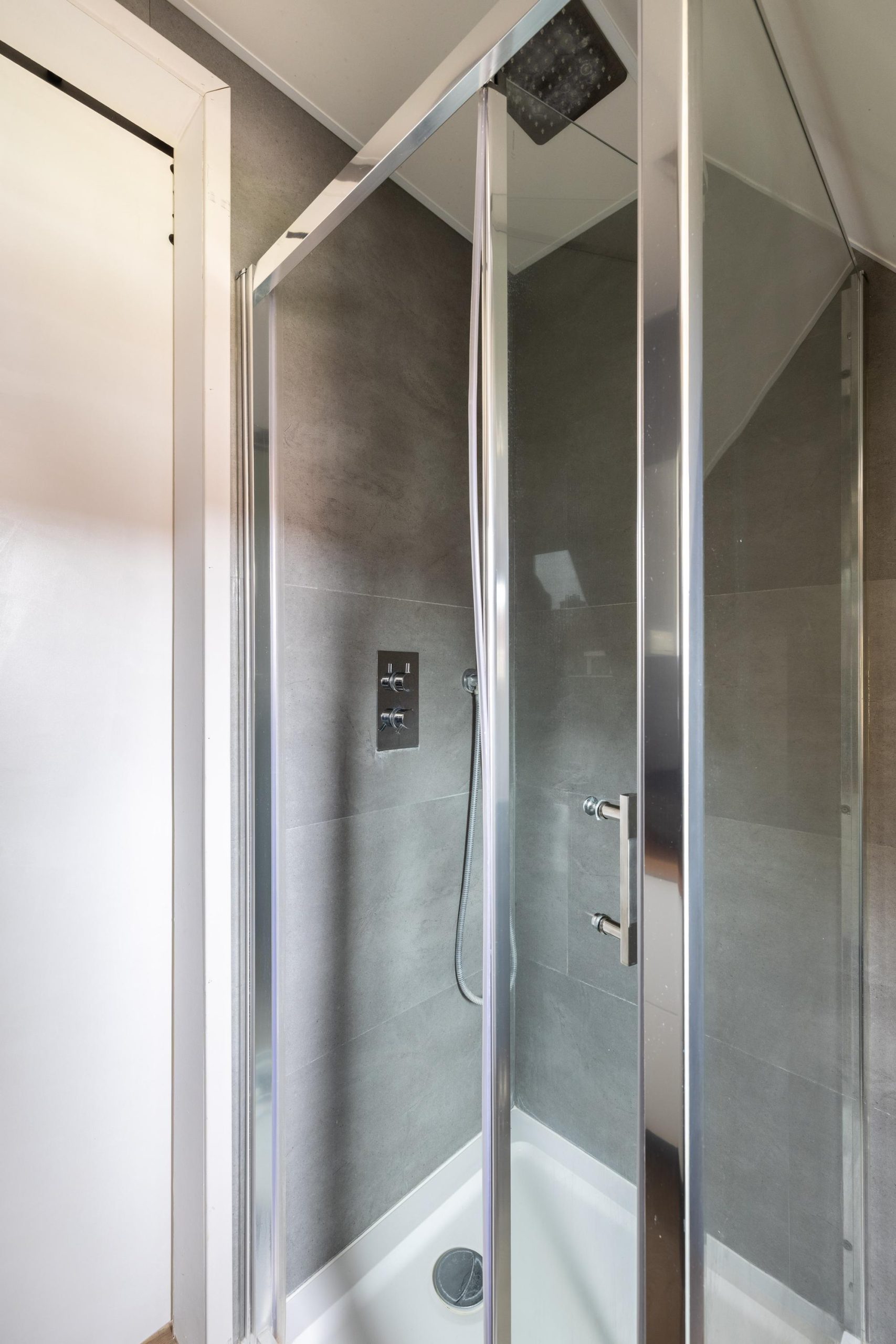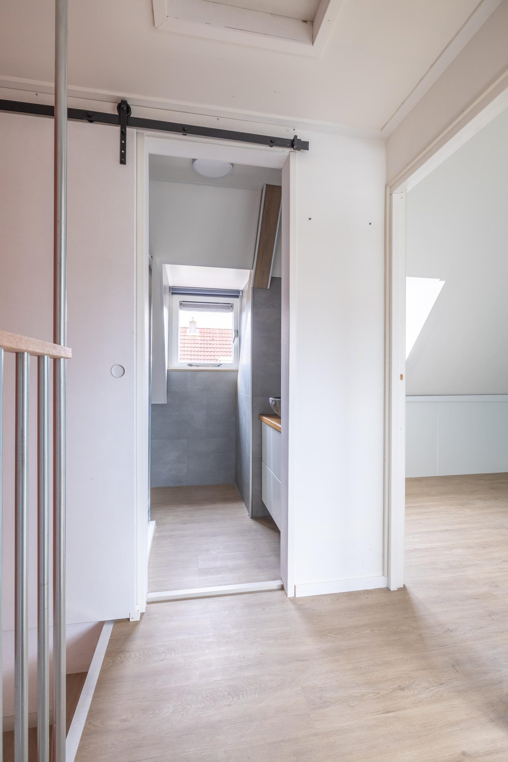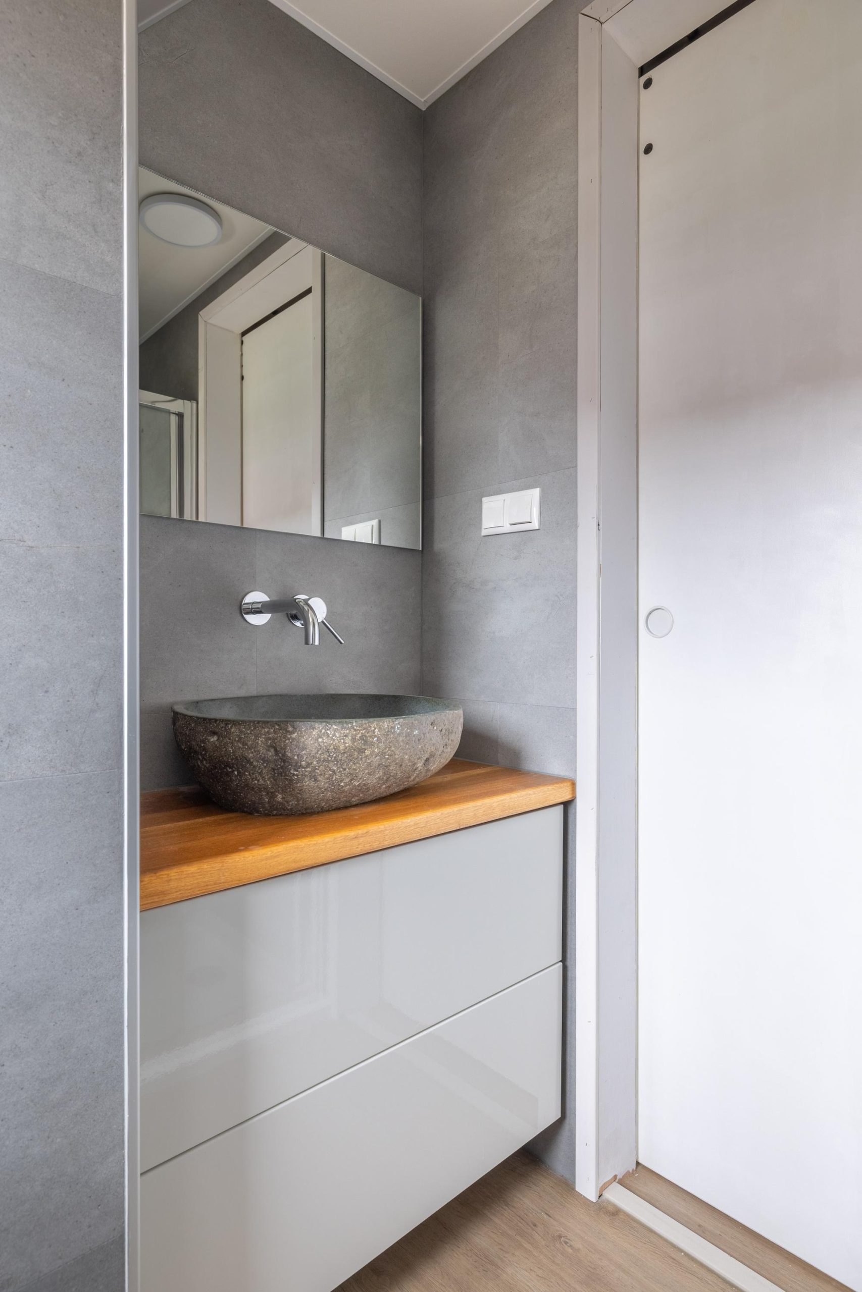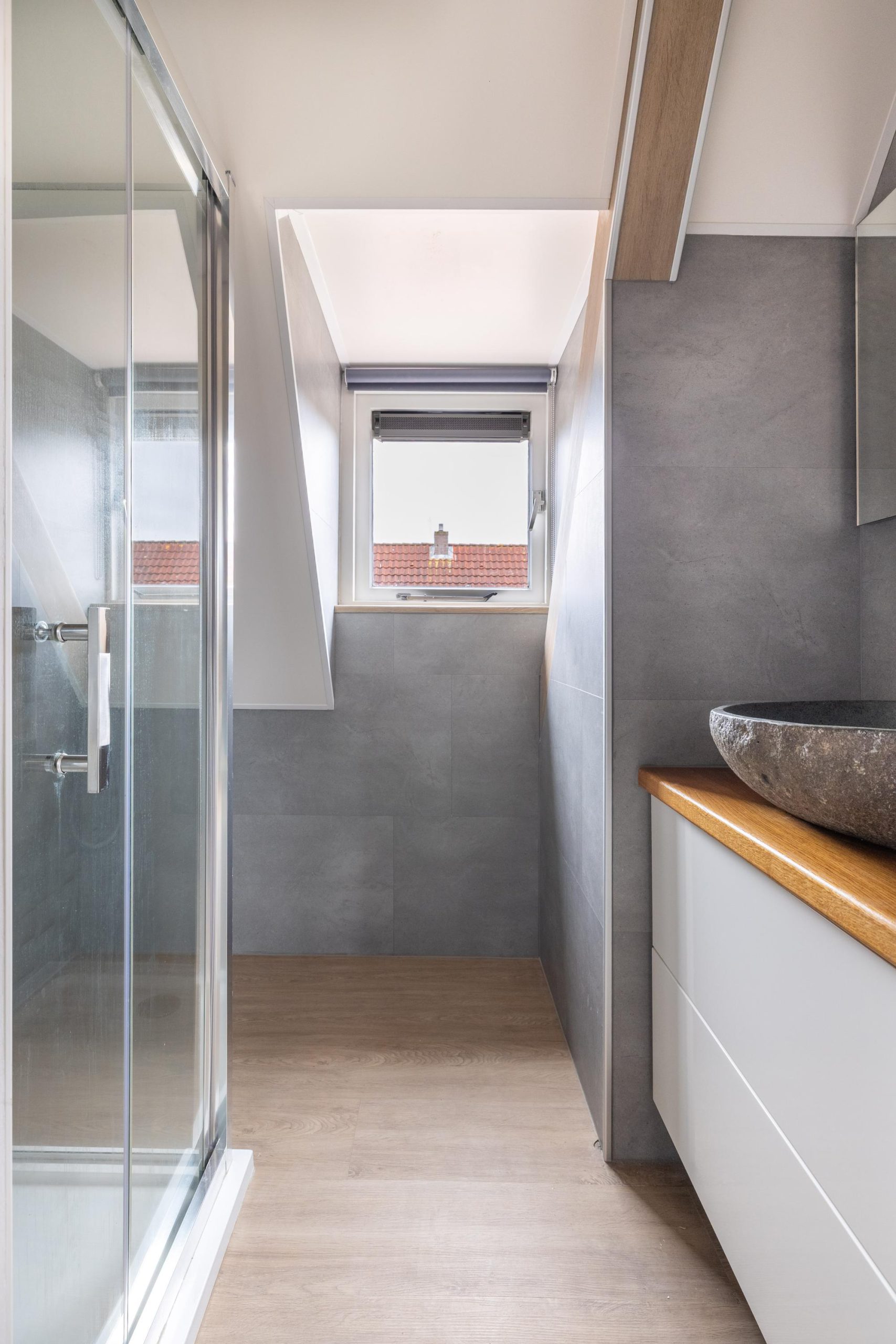 De badkamer is gemoderniseerd en voelt verrassend luxe voor deze woonmaat. De heerlijke douche is precies zo’n plek waar je ’s ochtends wakker wordt en denkt: dit begint goed. Het wastafelmeubel geeft je fijne opbergruimte én een rustige uitstraling. Alles klopt. Alles voelt nieuw. In 2020 is de badkamer compleet vernieuwd en naar boven verplaatst!
