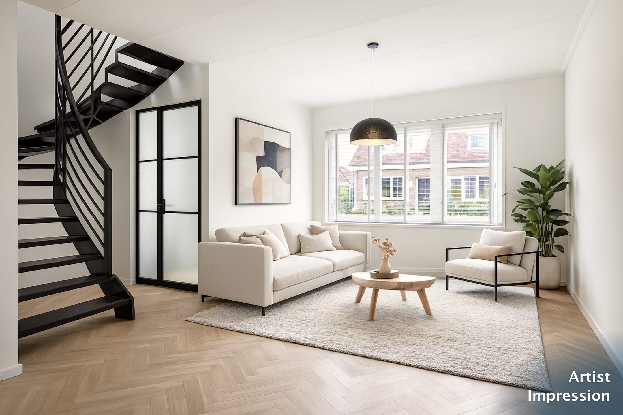 De woonkamer ademt rust en modern comfort. De nieuwe afwerking geeft de ruimte een frisse basis waar elke woonstijl op zijn plek valt. Grote meubels, minimalistisch, kleurrijk — het kan hier allemaal.