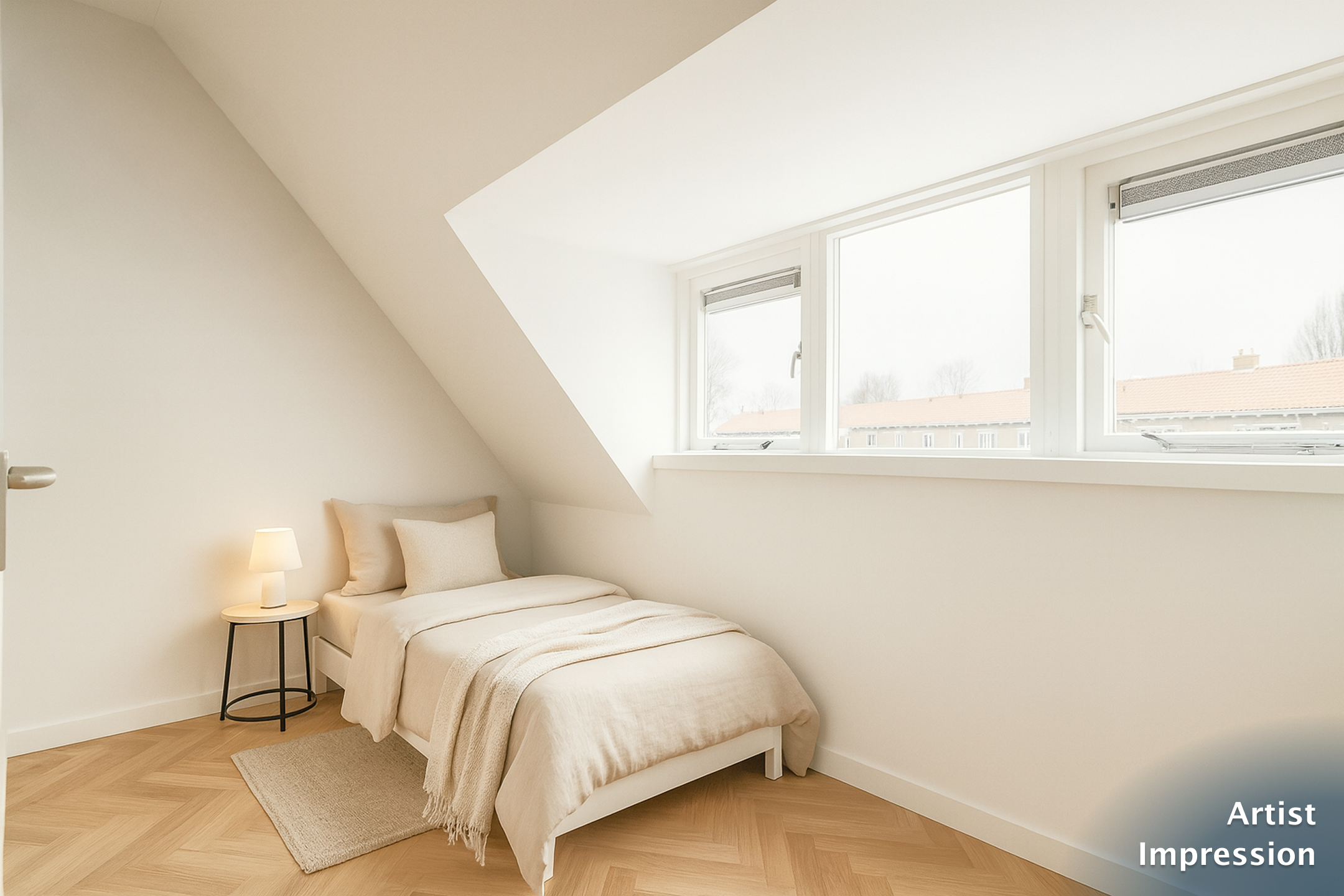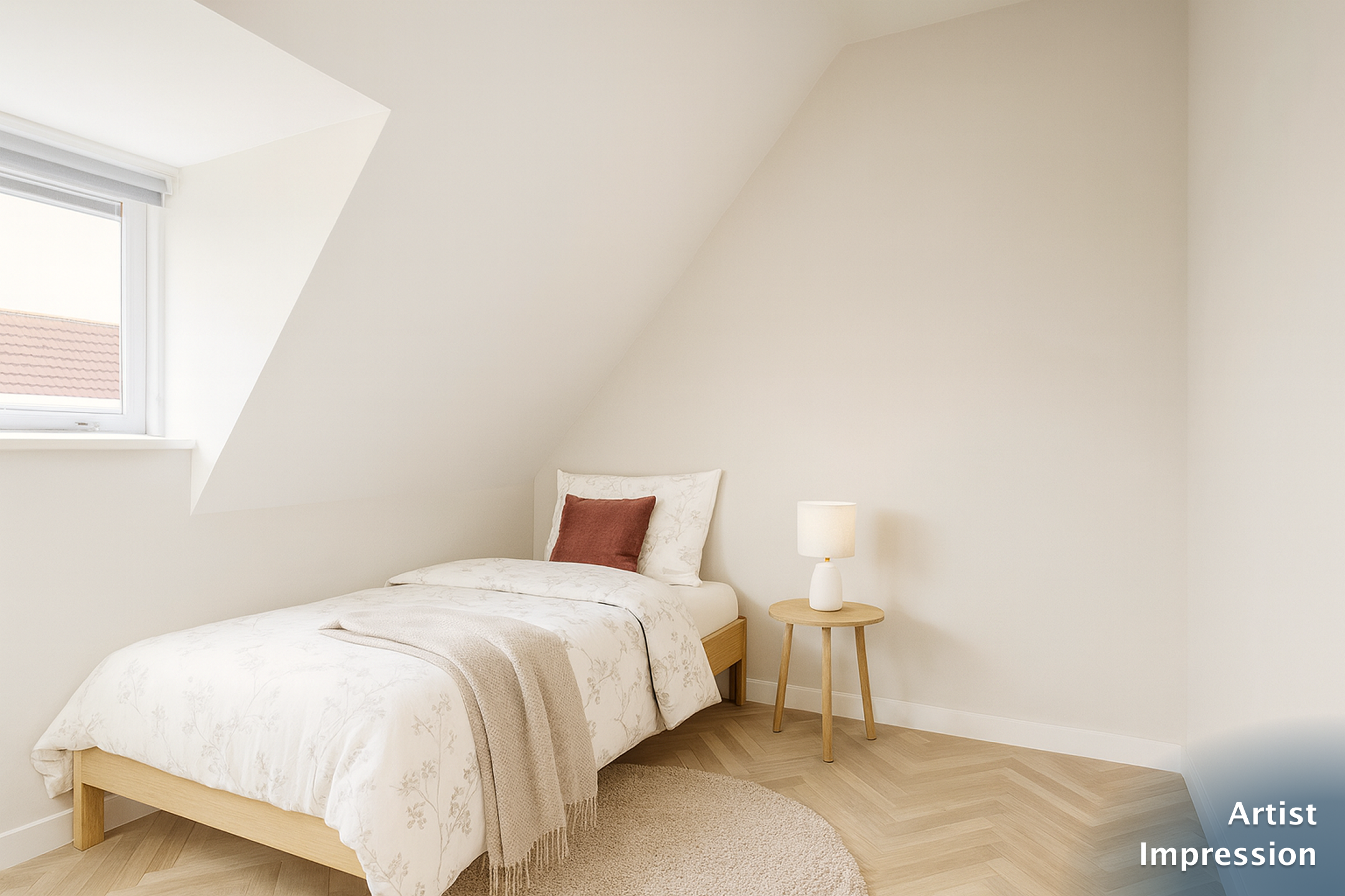 Boven vind je twee slaapkamers, allebei licht en prettig van formaat. De nieuwe afwerking zet ook hier de toon: fris, rustig en helemaal klaar voor dagelijks gebruik.