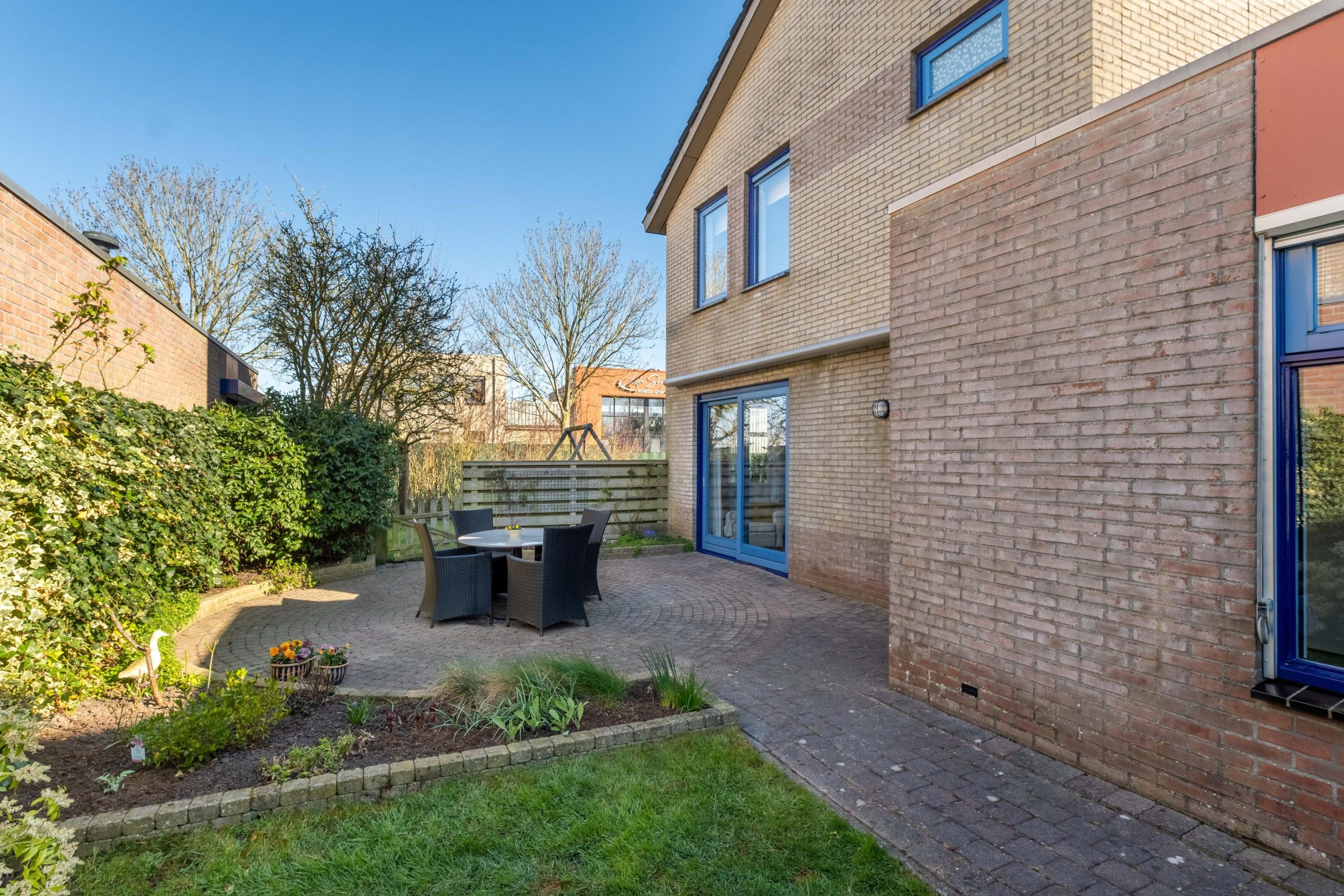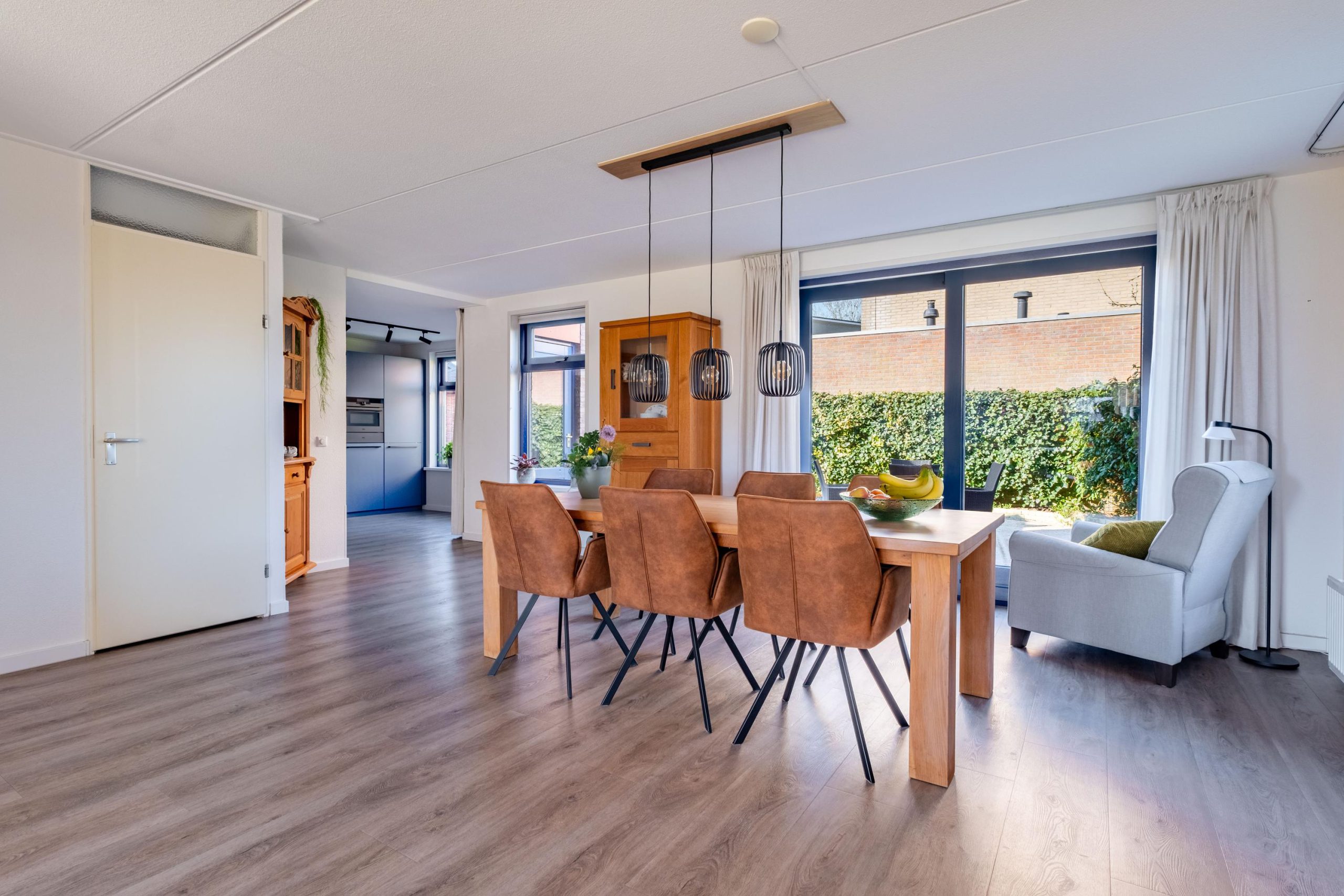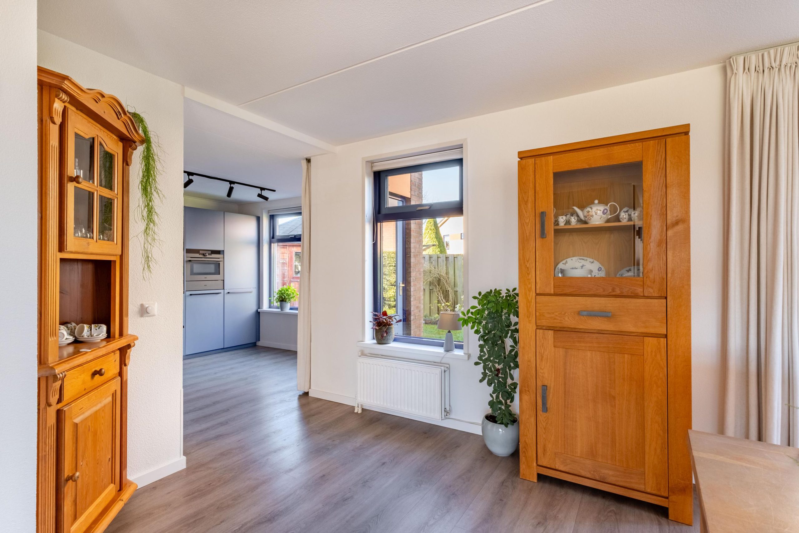 Aan de achterzijde van de woning vind je de moderne open keuken (2024), strak en volledig uitgerust. Ideaal voor gezellige diners of koken met het gezin. Vanuit hier is de handige bijkeuken met de achterliggende garage en de tuin te bereiken. De netjes aangelegde tuin bevindt zich aan de zijkant en aan de achterzijde van de woning en biedt volop ruimte om buiten te genieten.