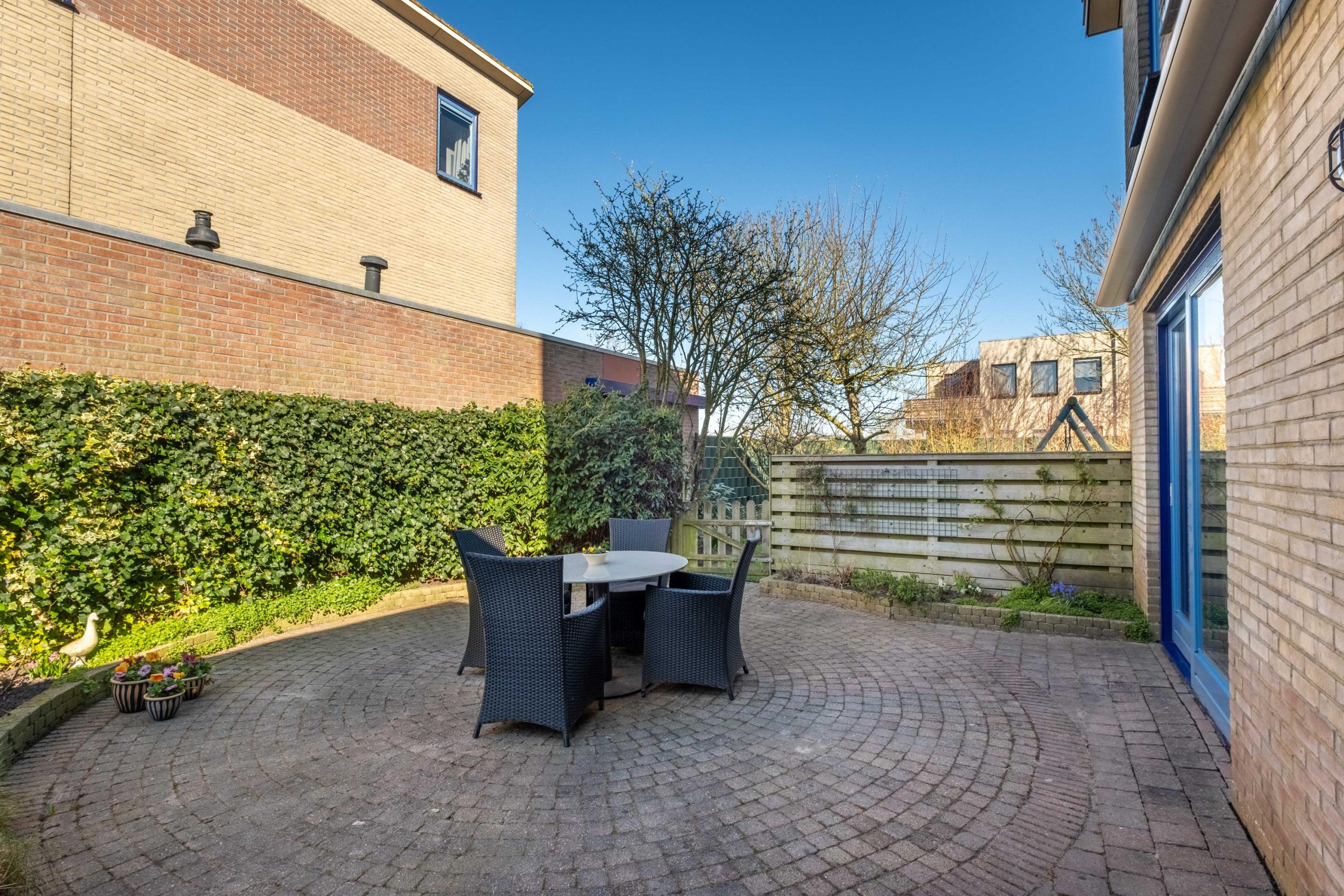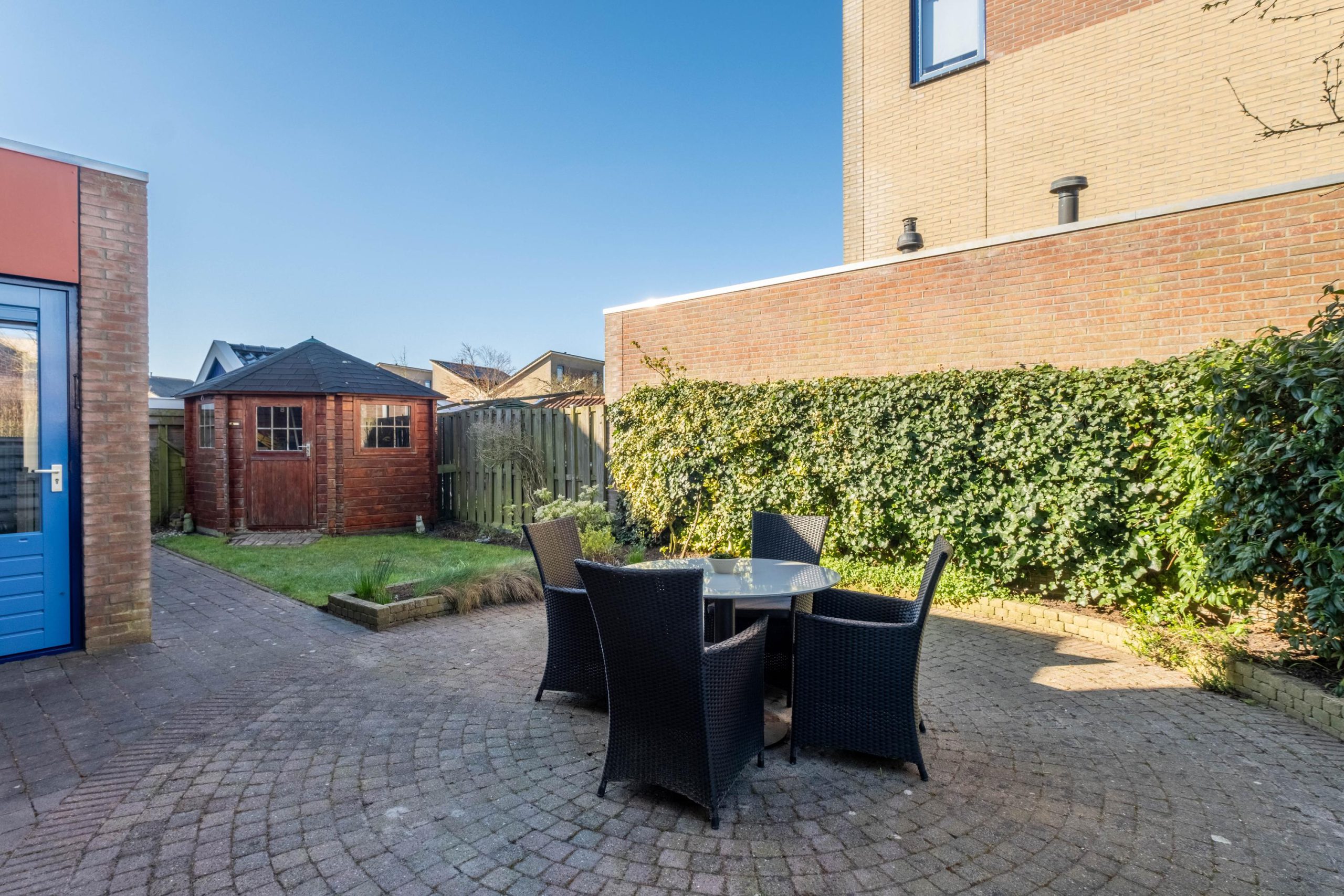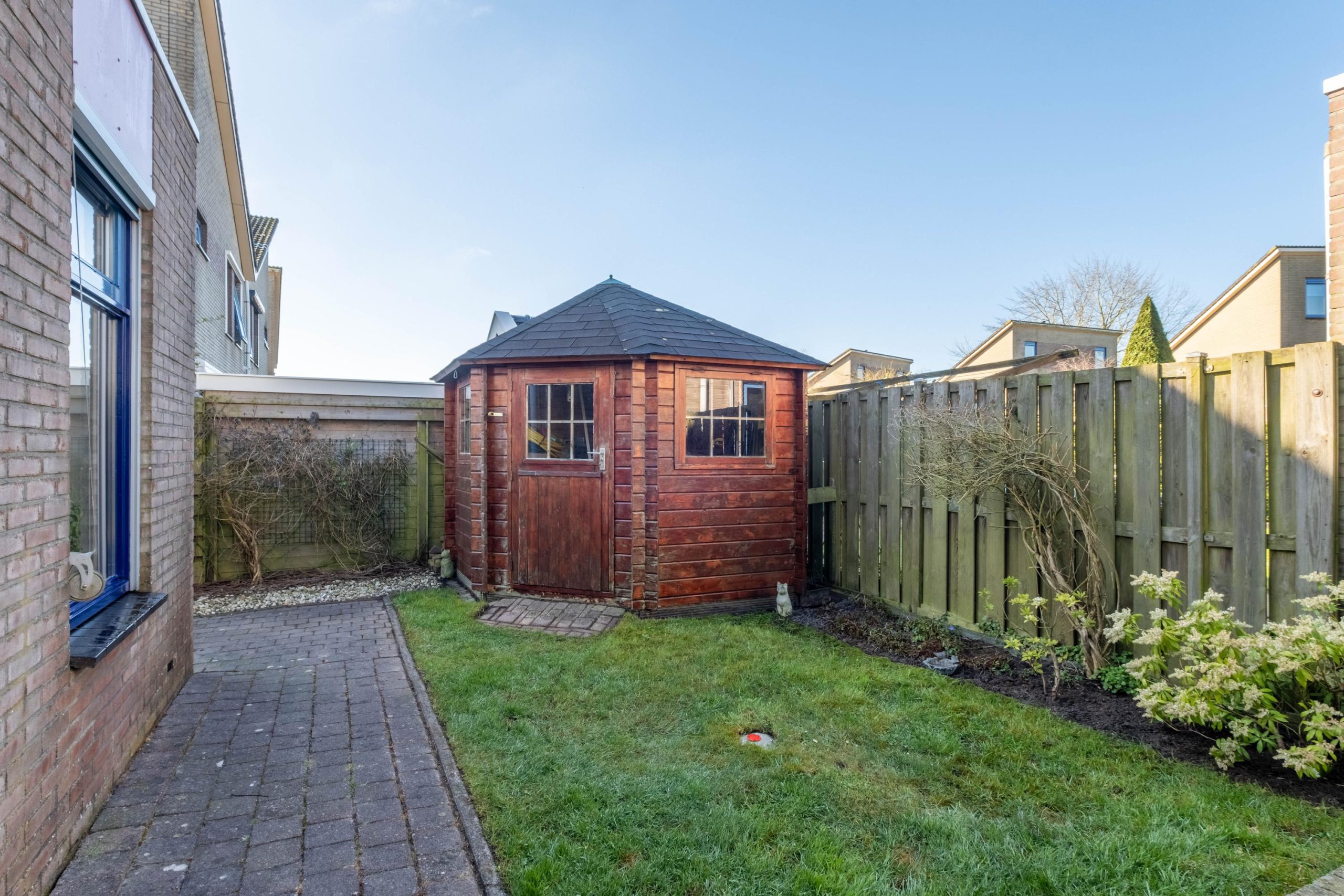 Aan de achterzijde van de woning vind je de moderne open keuken (2024), strak en volledig uitgerust. Ideaal voor gezellige diners of koken met het gezin. Vanuit hier is de handige bijkeuken met de achterliggende garage en de tuin te bereiken. De netjes aangelegde tuin bevindt zich aan de zijkant en aan de achterzijde van de woning en biedt volop ruimte om buiten te genieten.