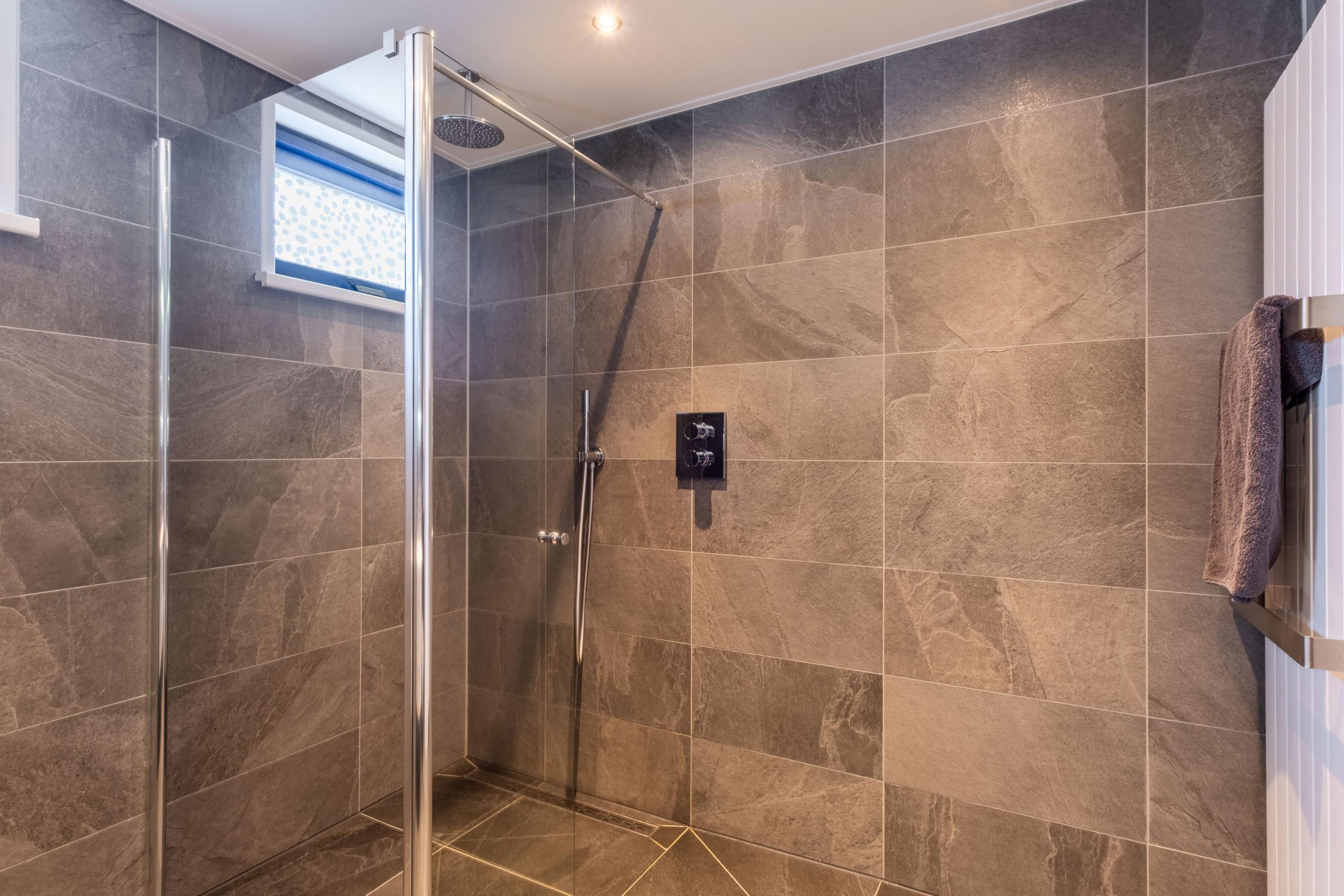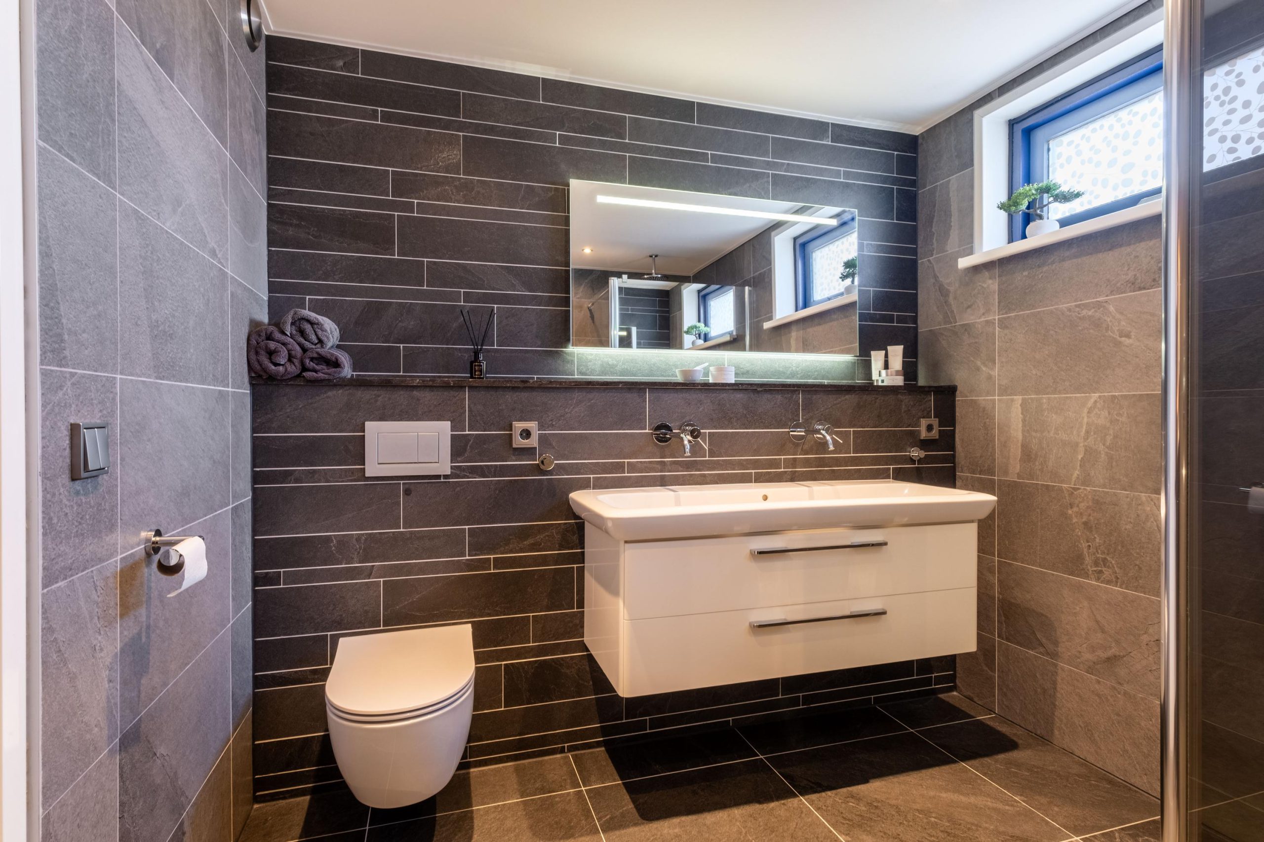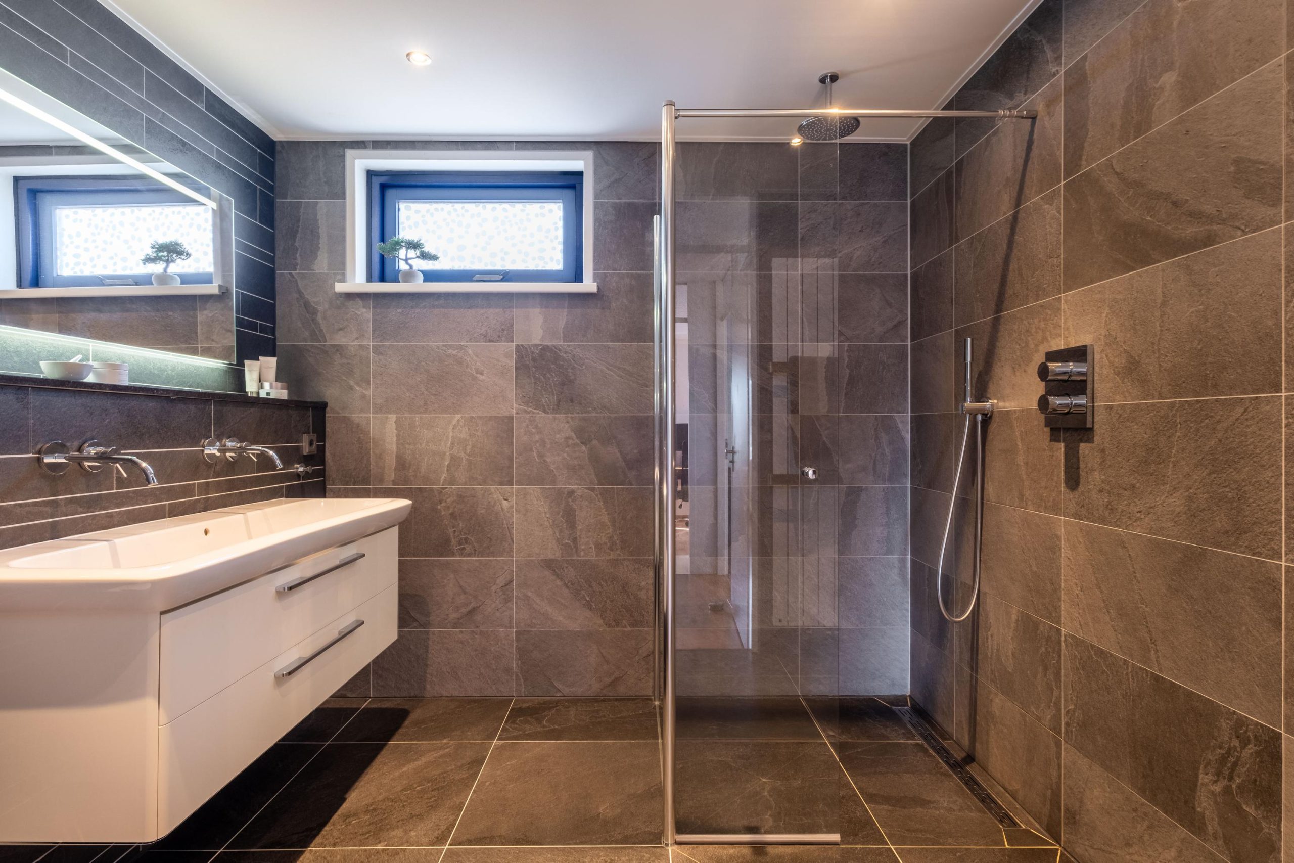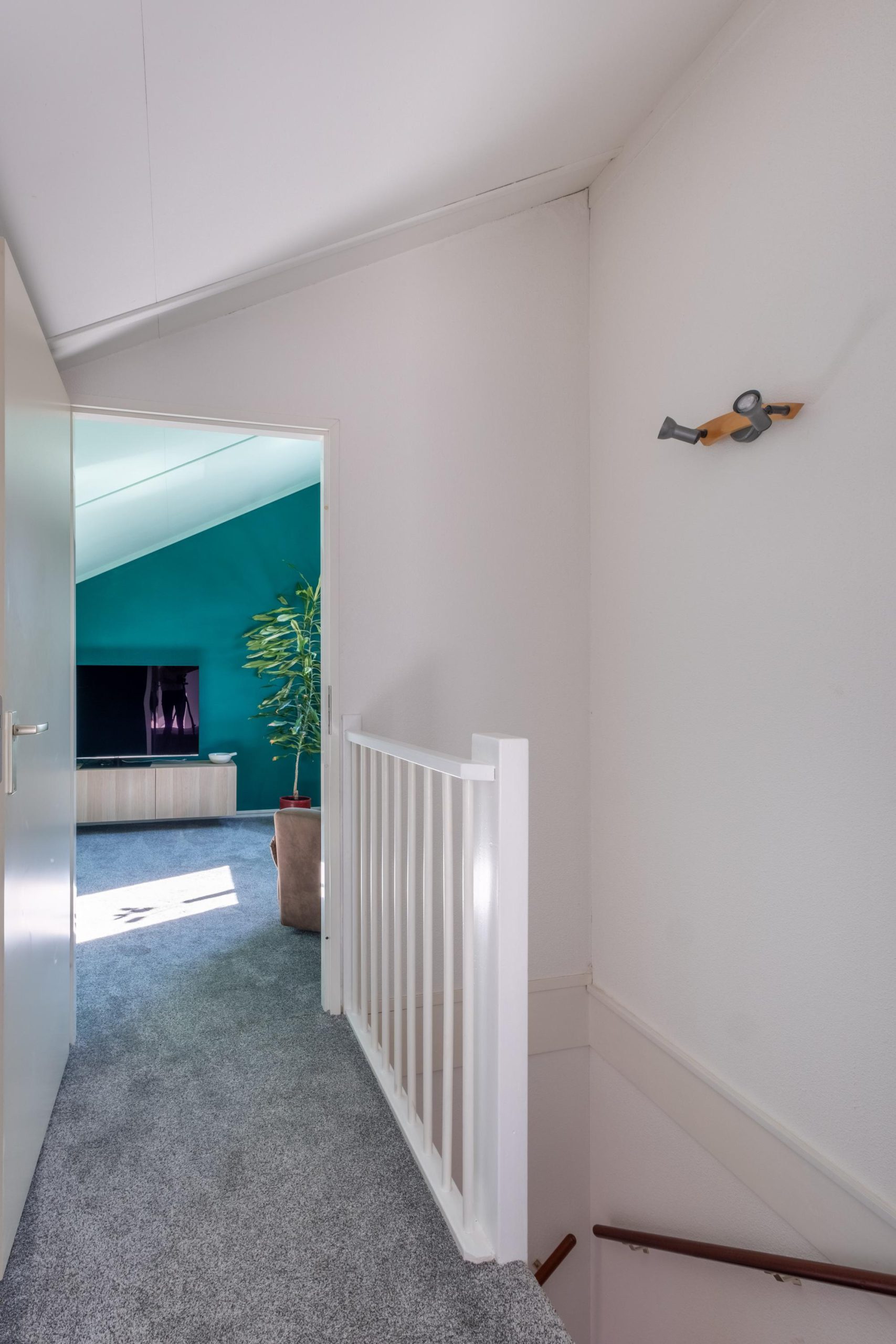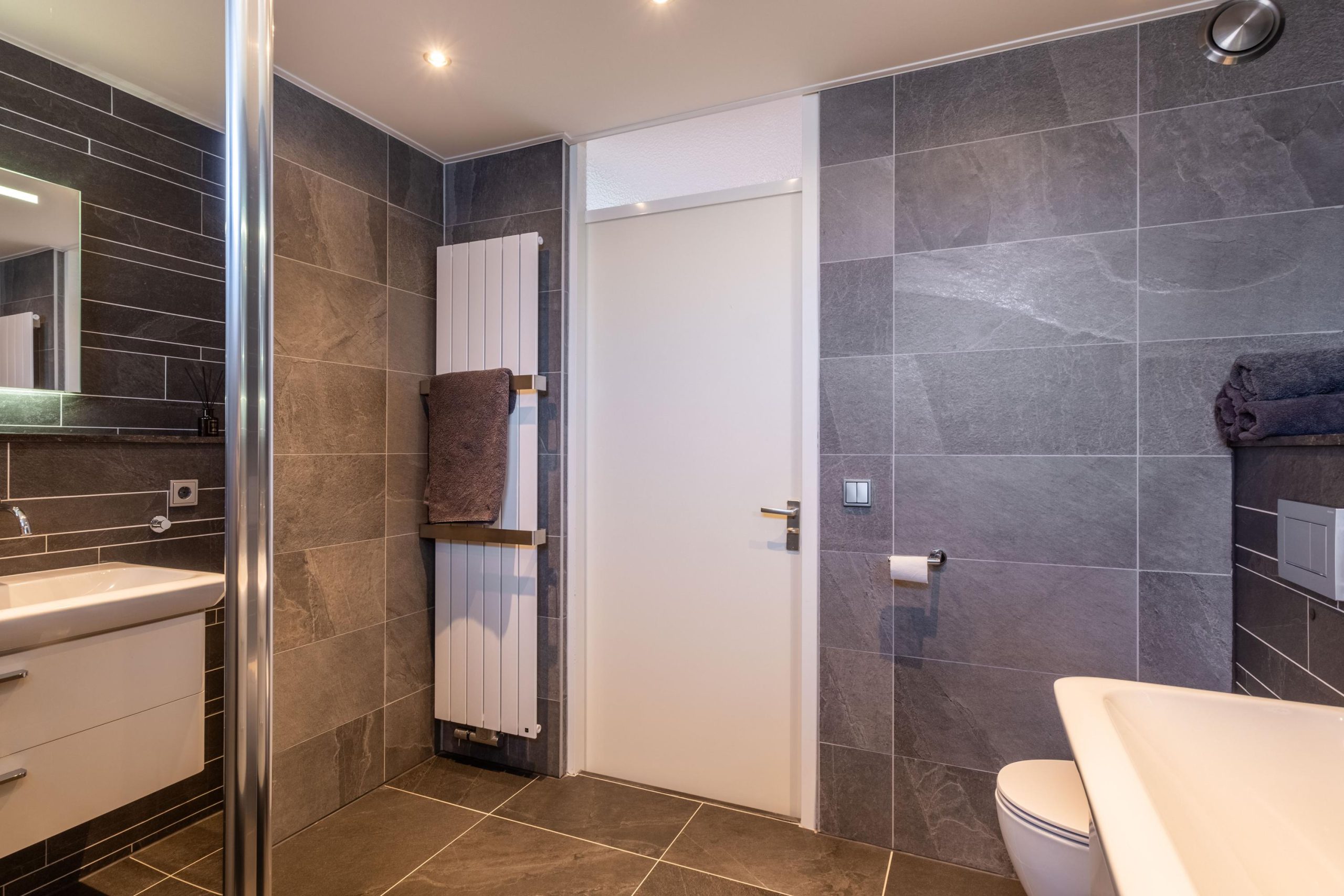 We vervolgen onze weg binnen en gaan via de trapopgang in de hal naar de eerste verdieping. Hier vind je drie volwaardige, recht opgetrokken slaapkamers, allemaal ruim en licht. De badkamer is stijlvol afgewerkt en voorzien van een inloopdouche, dubbele wastafel en toilet.