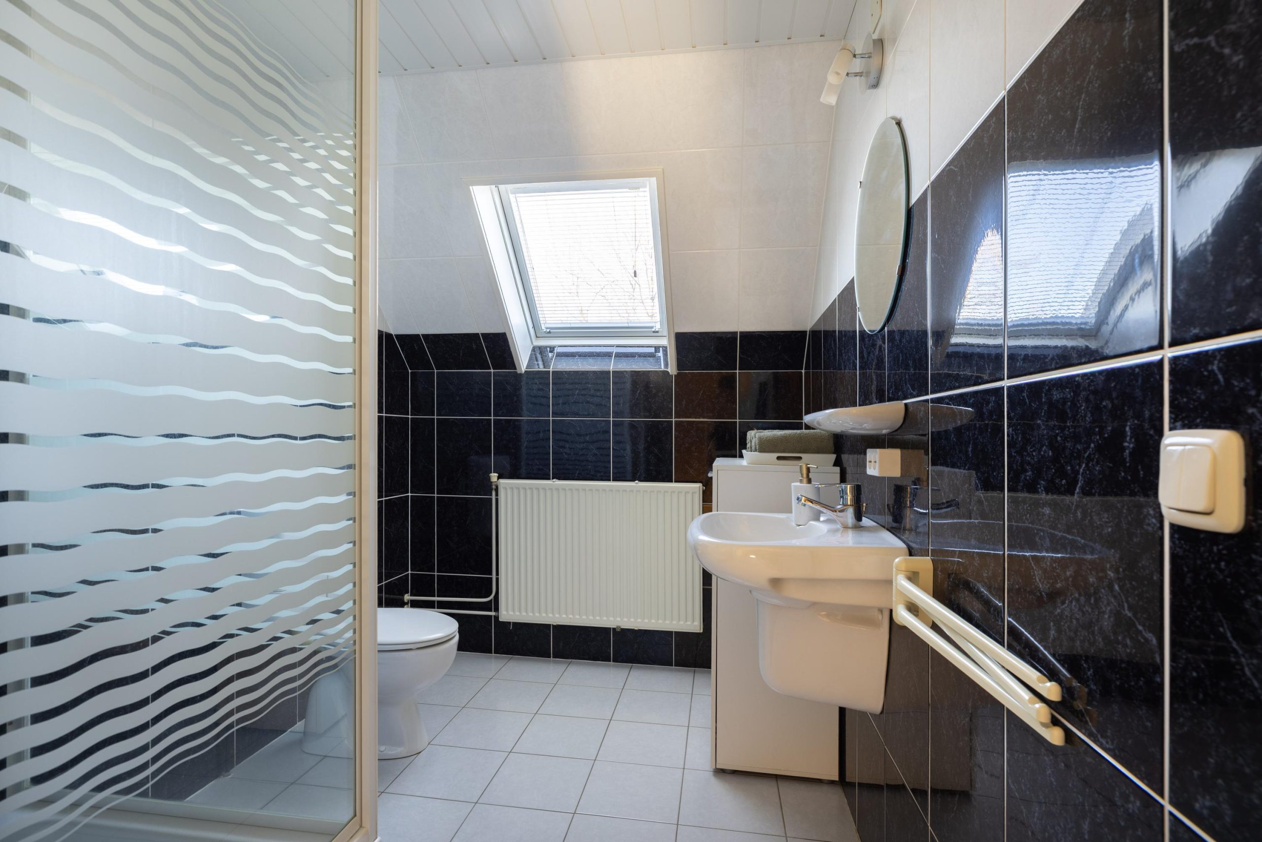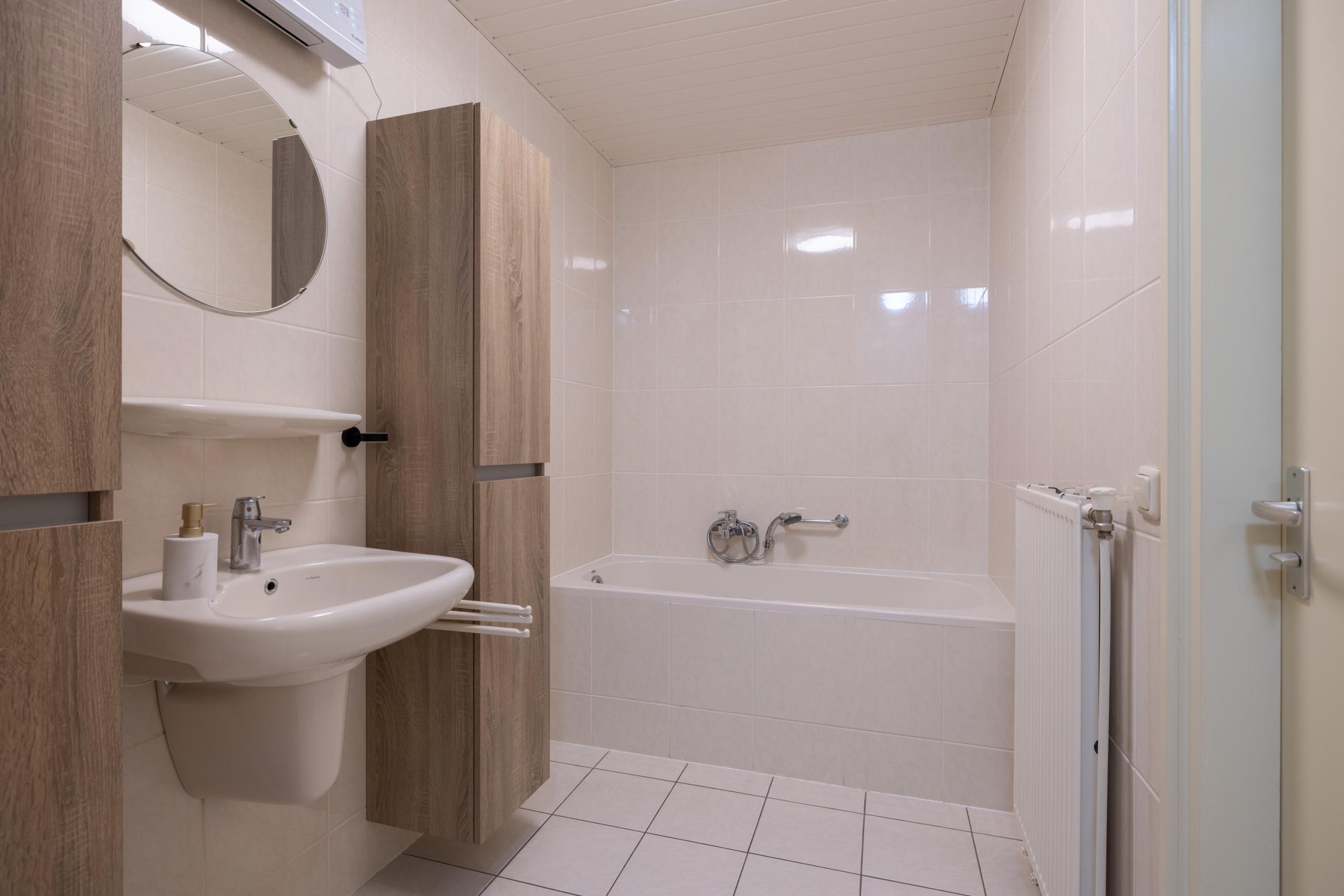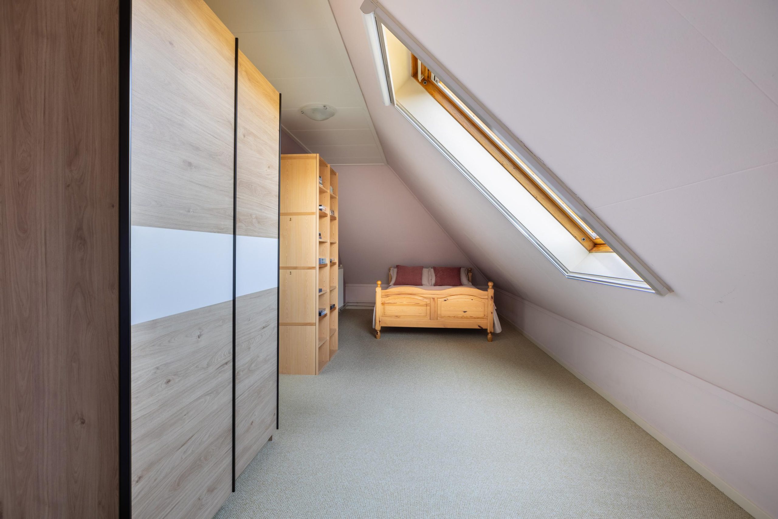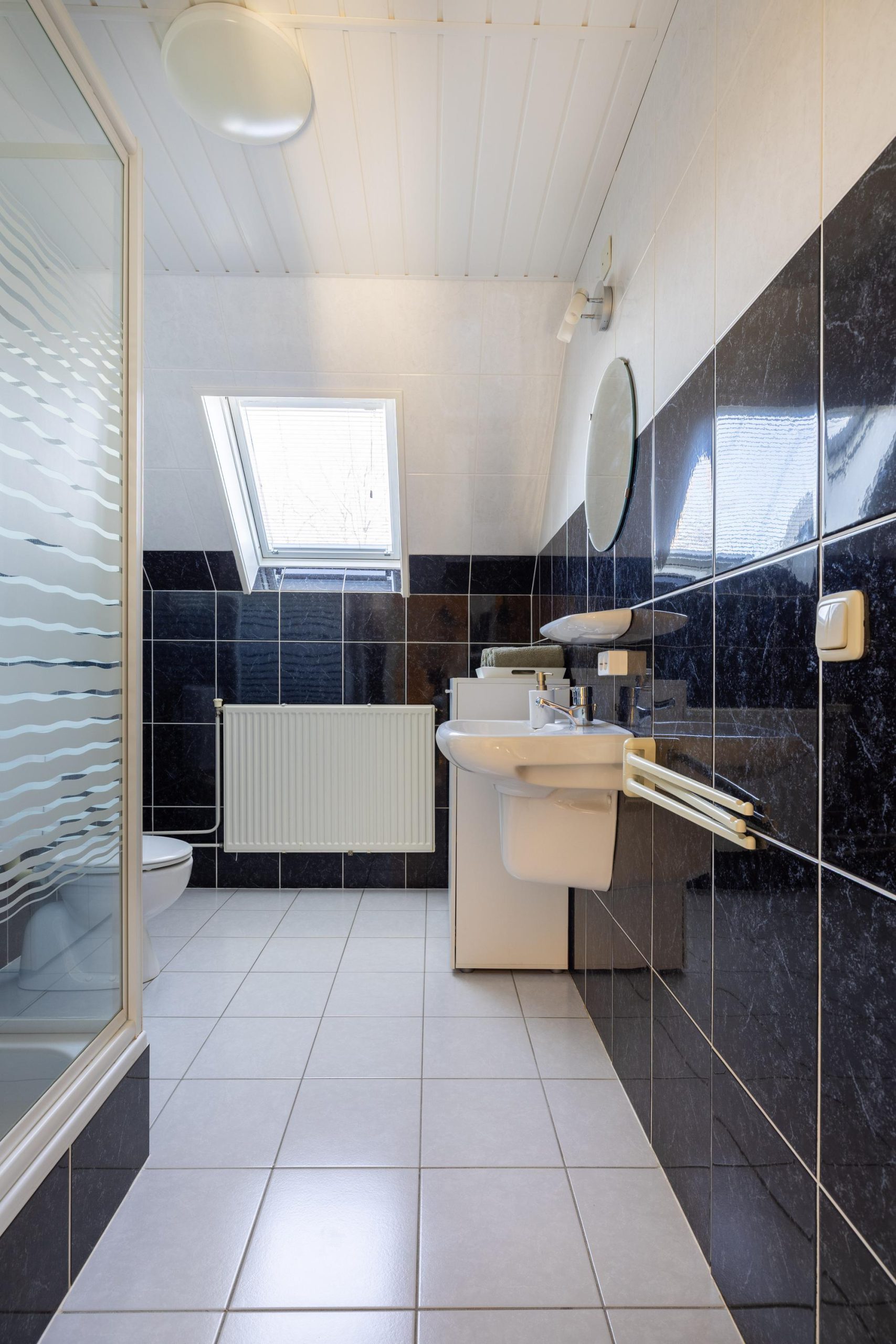 Op de eerste verdieping kom je op een ruime overloop met een handige berging. Hier bevinden zich twee ruime slaapkamers, waarvan één met een nette inbouwkast. Op één slaapkamer is bovendien een airco geplaatst en de ramen zijn voorzien van horren, zodat je ’s zomers heerlijk kunt ventileren. De tweede badkamer op deze verdieping beschikt over een douche, toilet en wastafel. Via een vlizotrap bereik je ook nog een praktische vliering voor extra bergruimte.