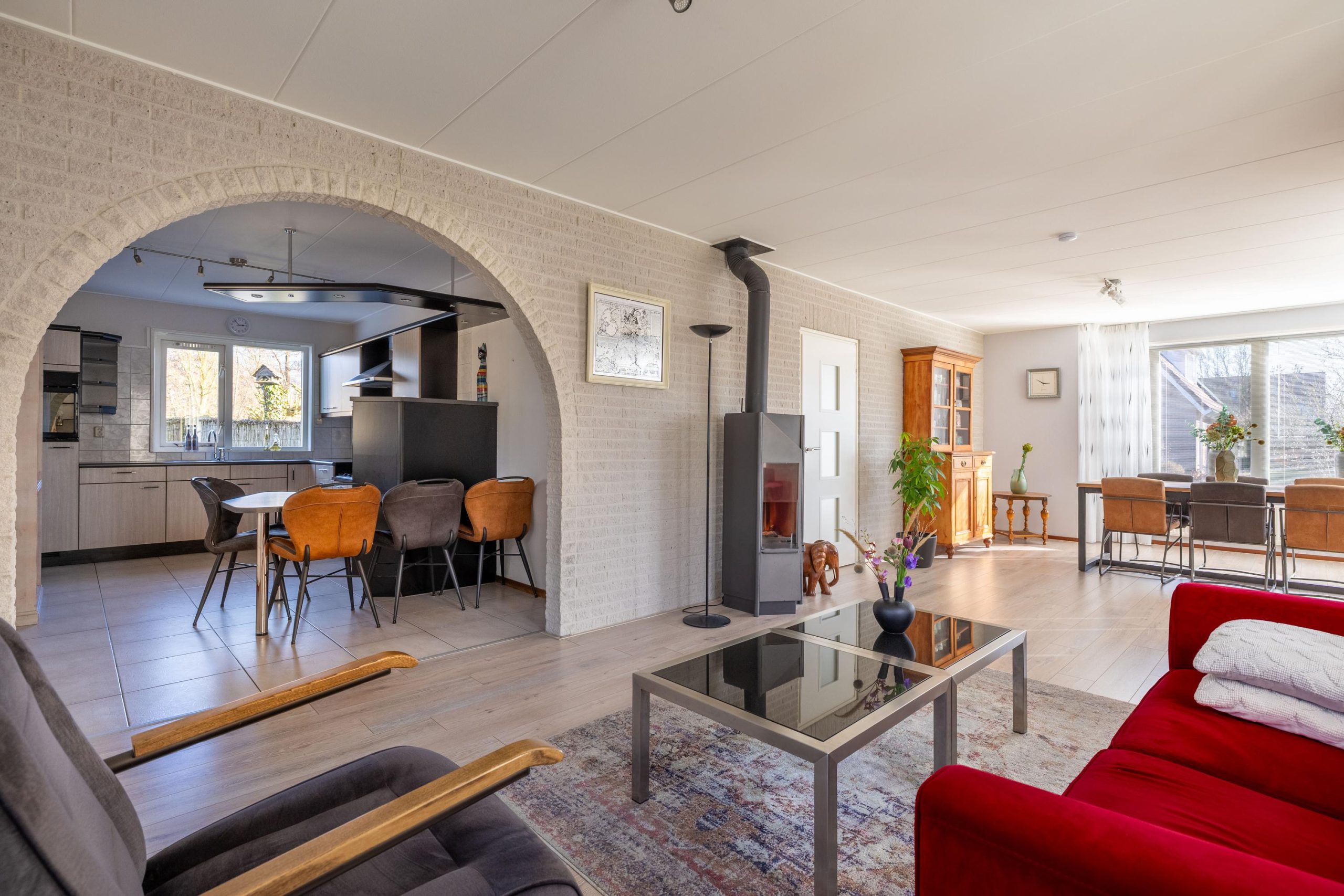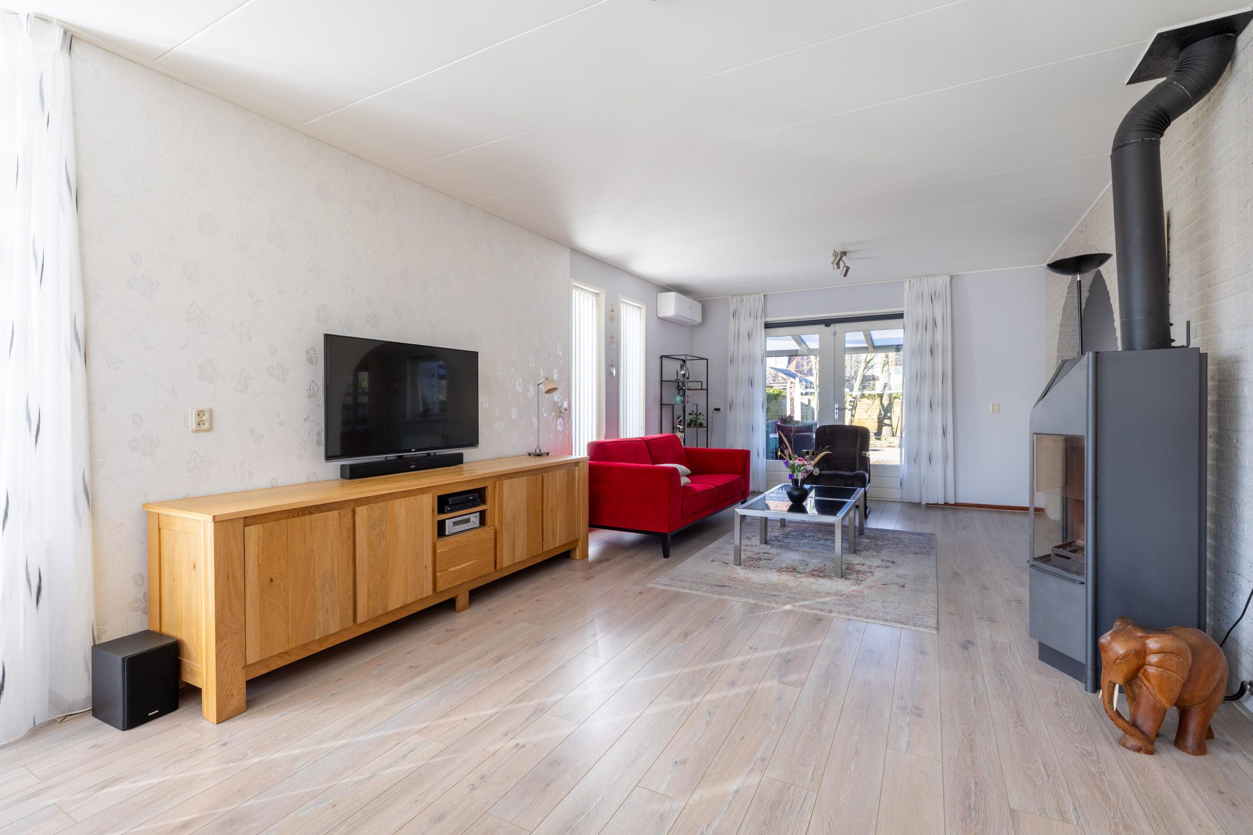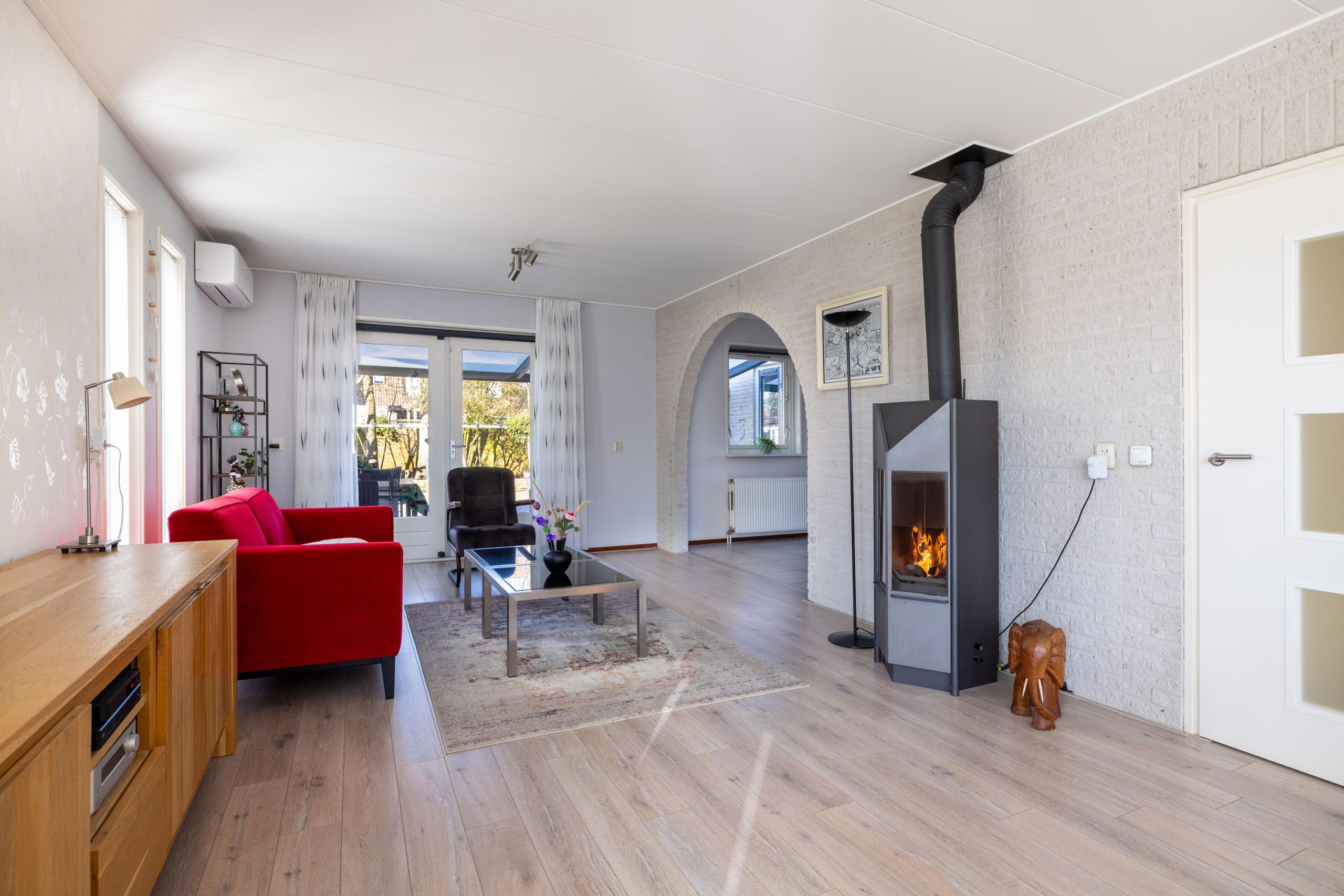 De leefruimte is open ingedeeld en baadt in het natuurlijke licht. De openslaande deuren aan de achterzijde verbinden binnen moeiteloos met buiten. De airco in de woonkamer zorgt voor verkoeling op warme dagen en de moderne gaskachel blijft achter en brengt extra sfeer en warmte in de wintermaanden.