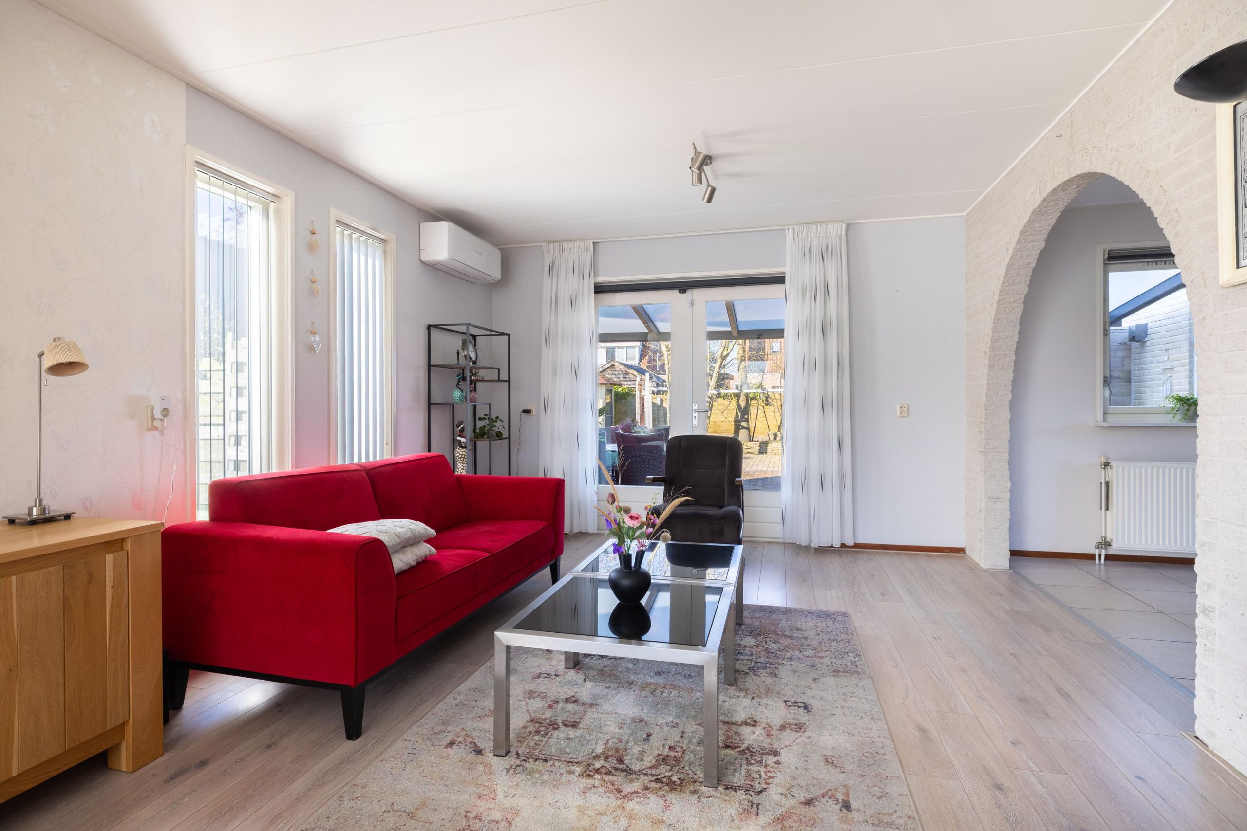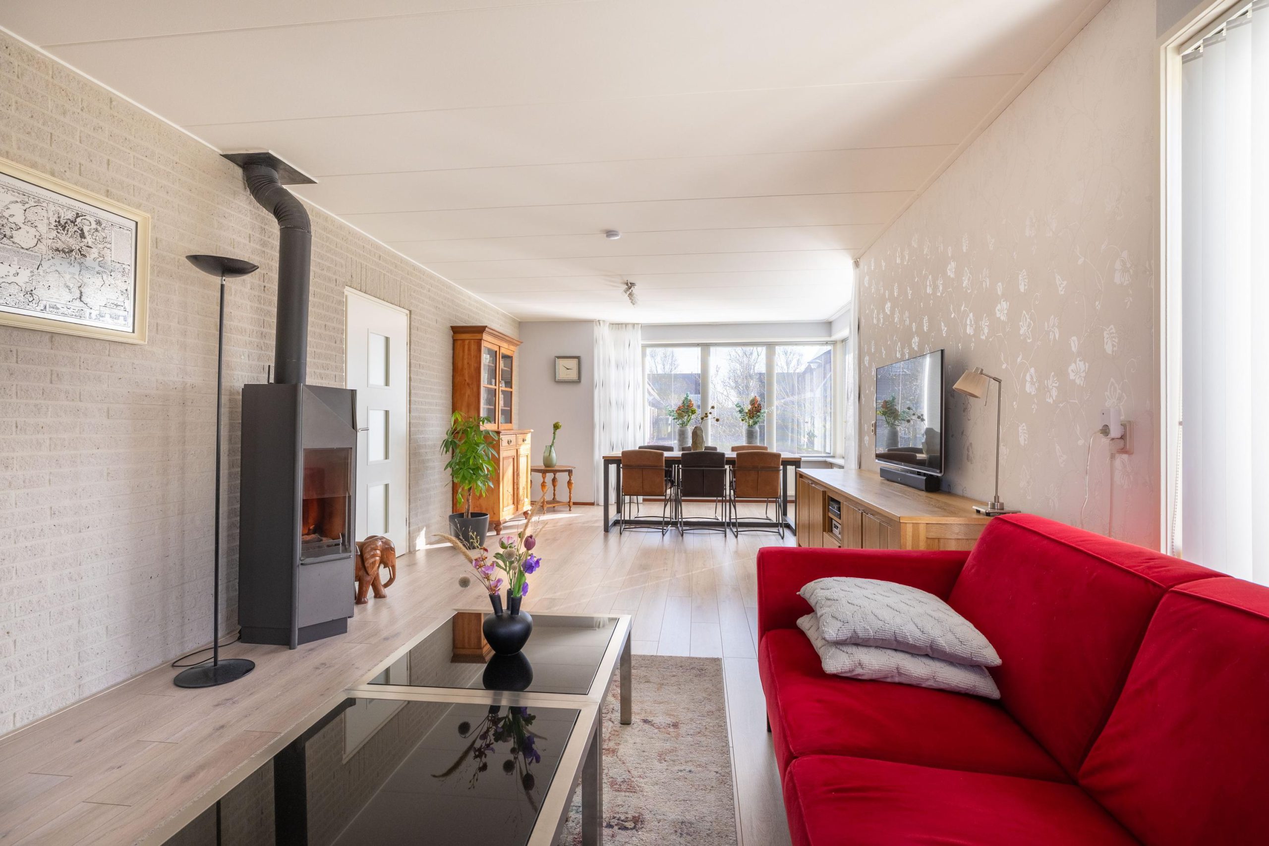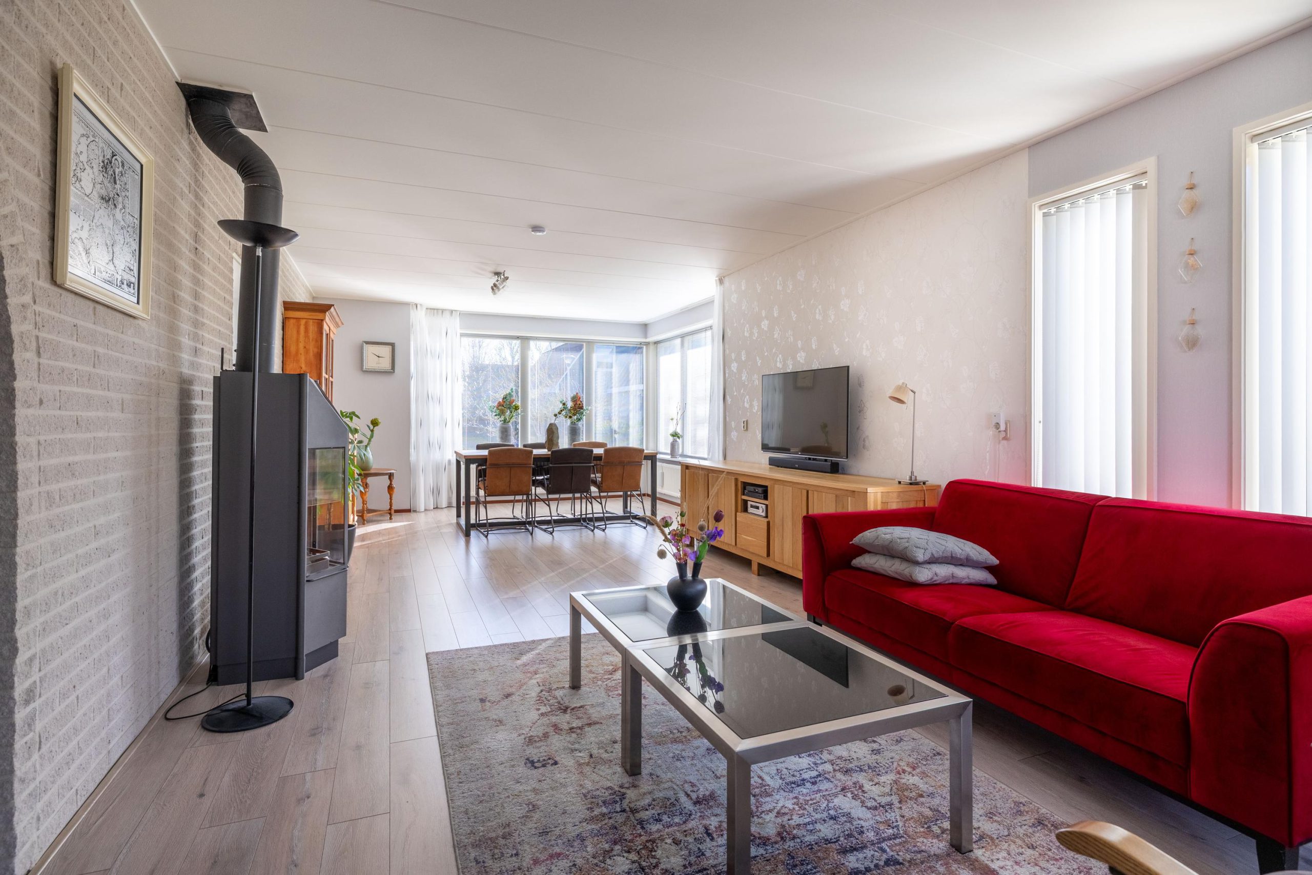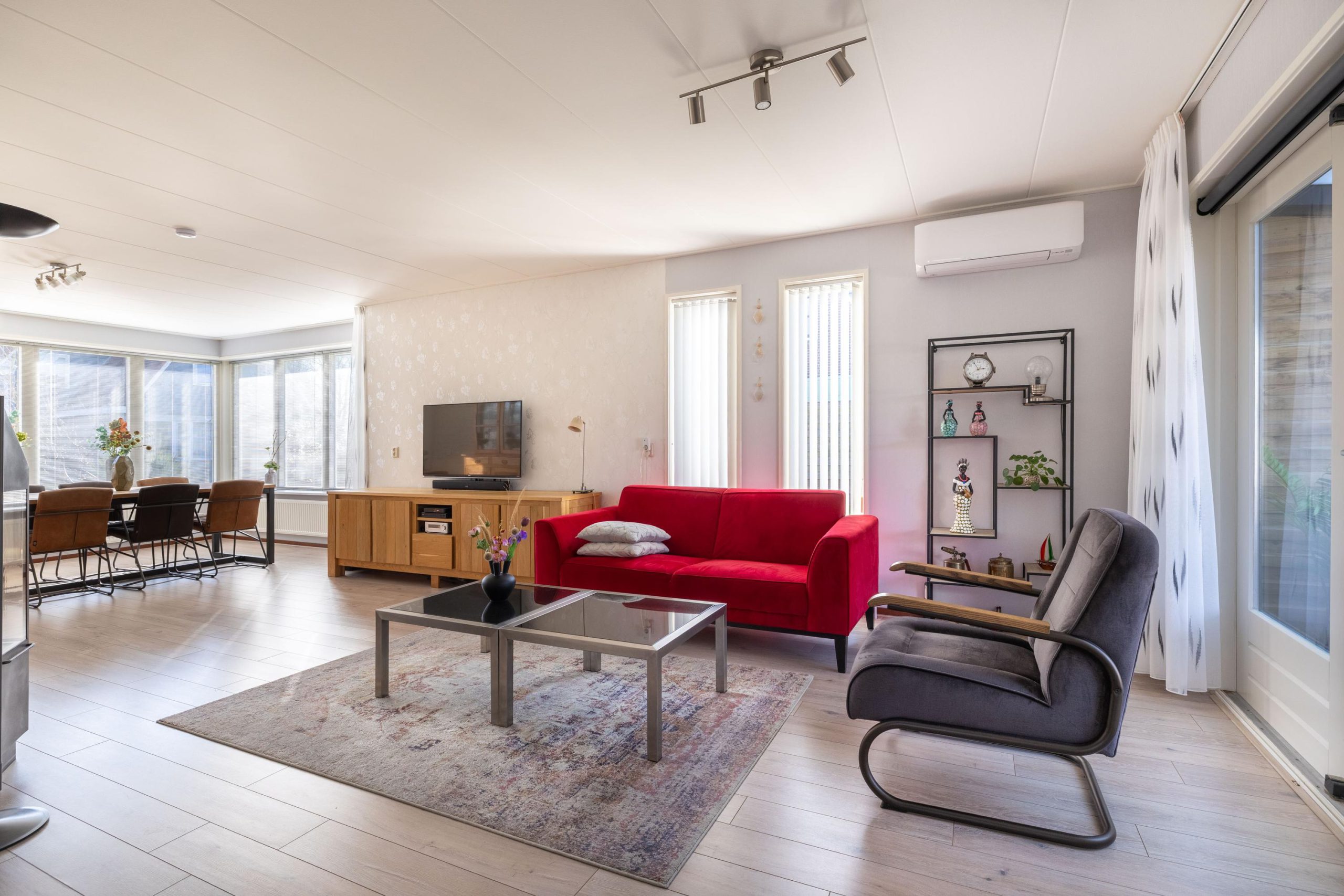De leefruimte is open ingedeeld en baadt in het natuurlijke licht. De openslaande deuren aan de achterzijde verbinden binnen moeiteloos met buiten. De airco in de woonkamer zorgt voor verkoeling op warme dagen en de moderne gaskachel blijft achter en brengt extra sfeer en warmte in de wintermaanden.