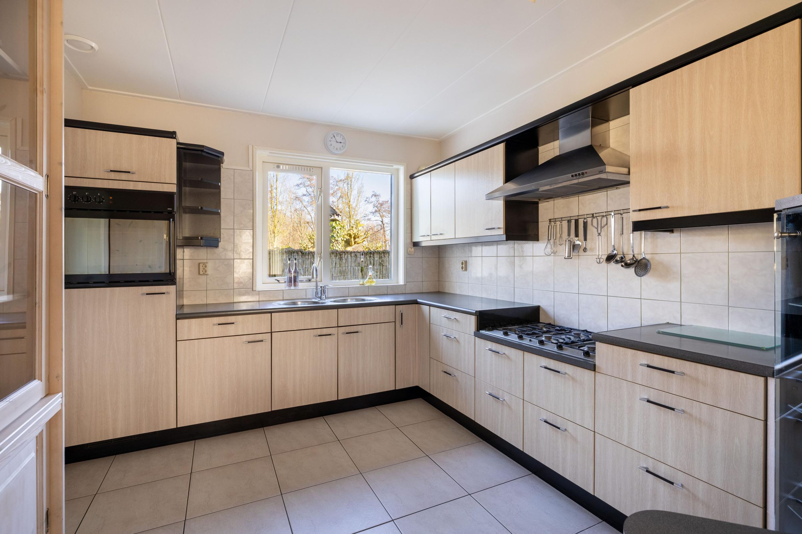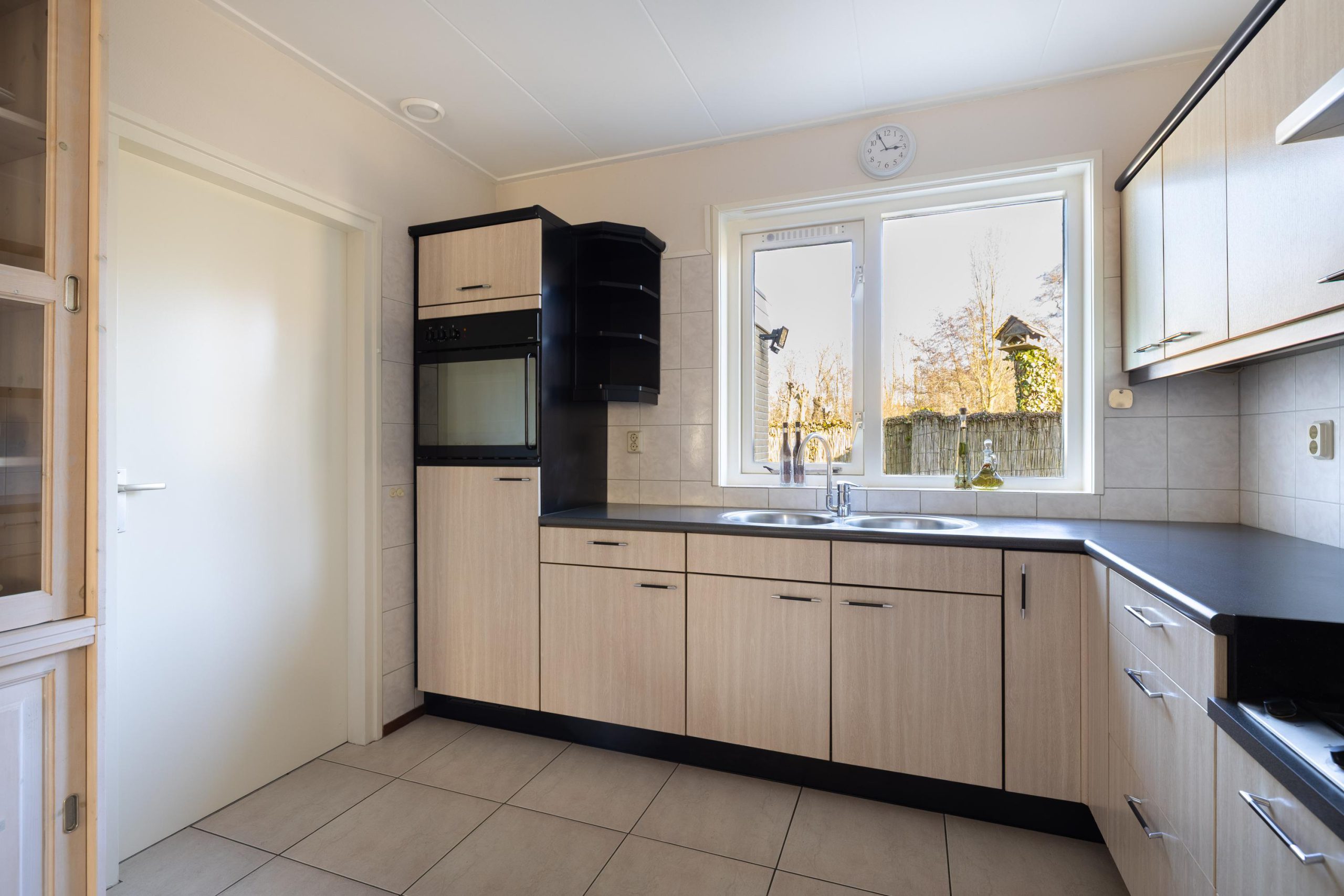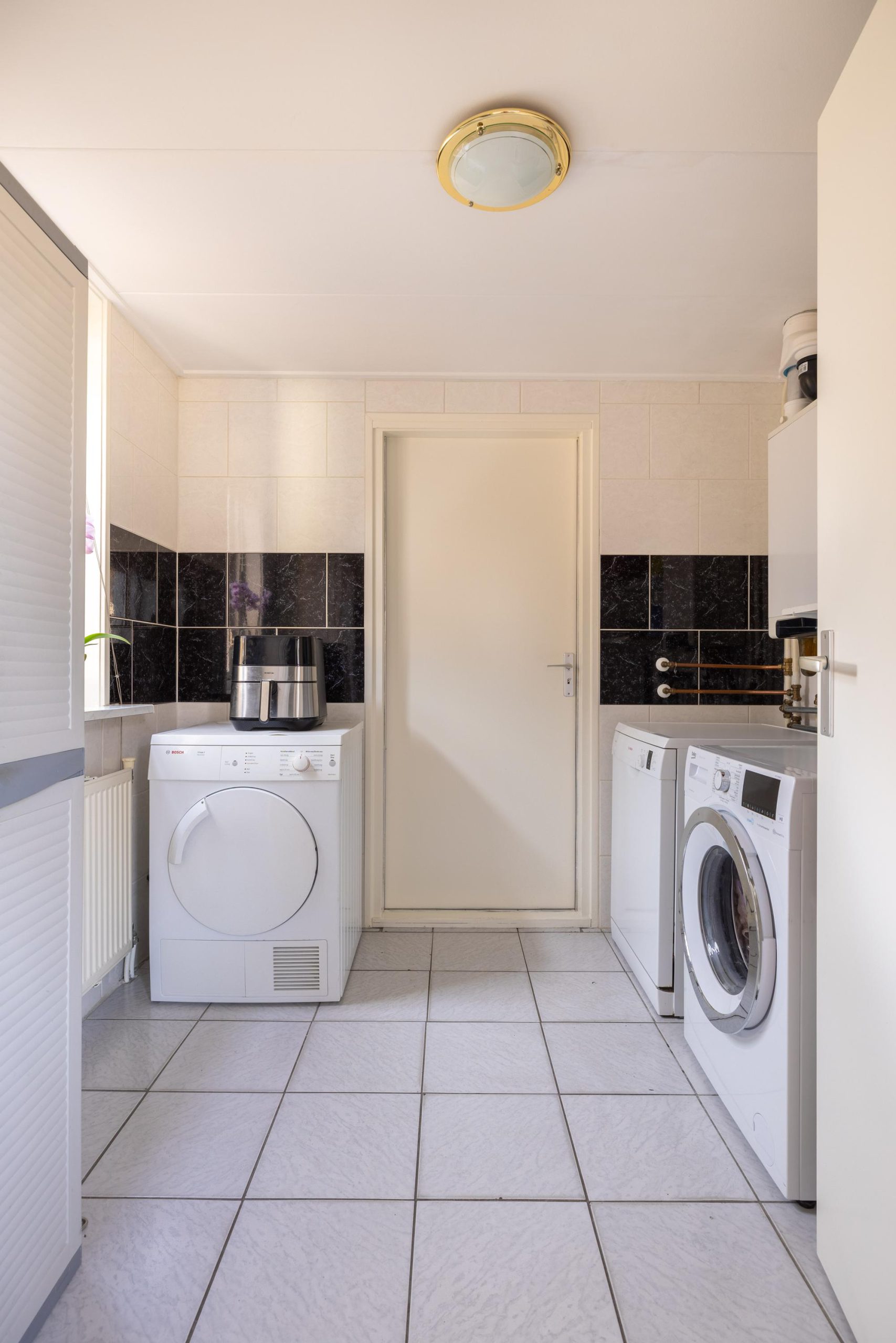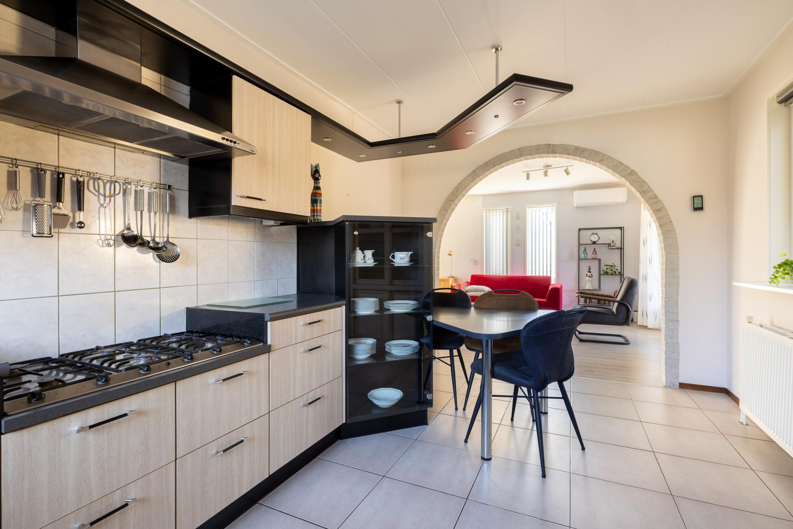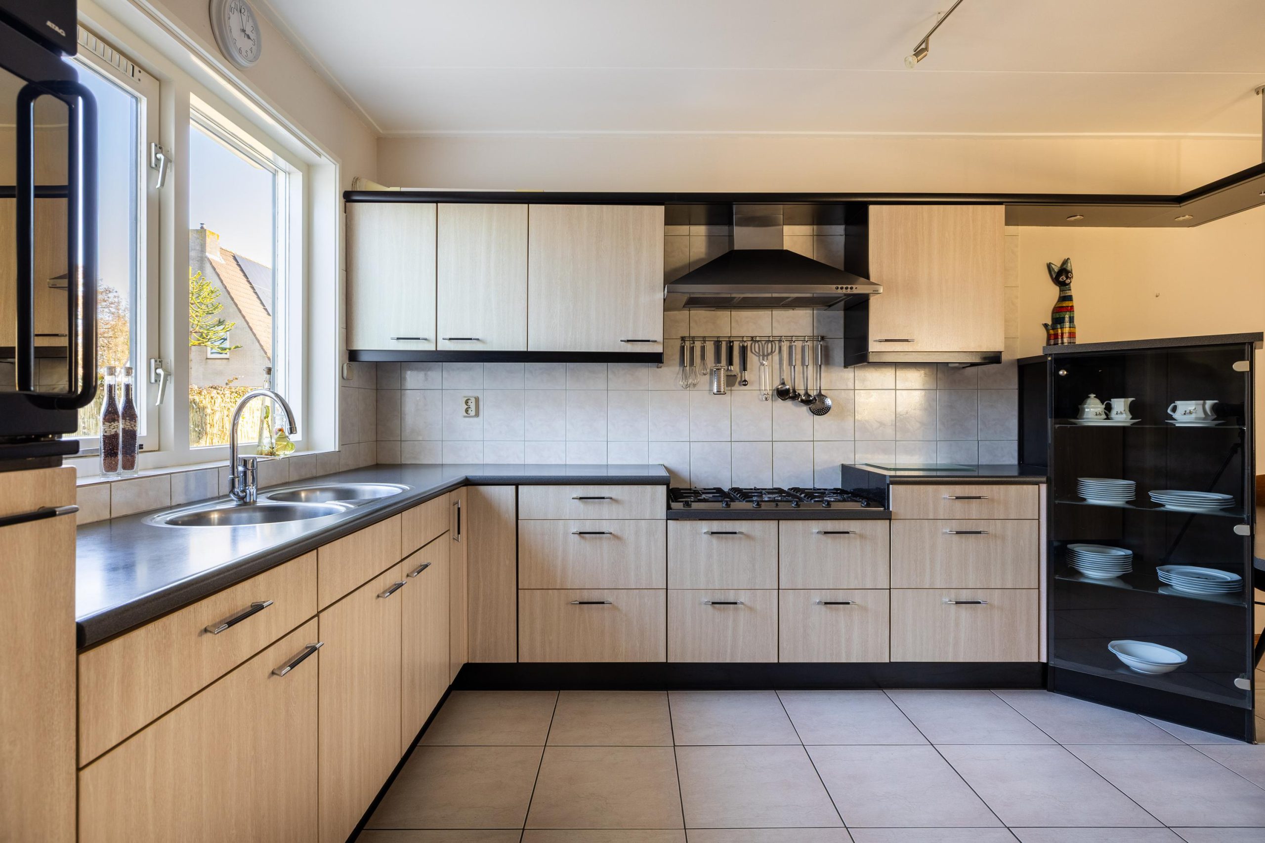 De open keuken bereik je via een karaktervolle boog die de ruimte nét dat beetje extra geeft. Hier vind je een 6 pits gasfornuis, een oven en een koelkast. Er is volop kastruimte, waardoor alles een eigen plek heeft. Aansluitend ligt de praktische bijkeuken met witgoedaansluiting en toegang tot de garage. Deze garage is in 2023 voorzien van een elektrische deur, wat het dagelijks gebruik extra comfortabel maakt.