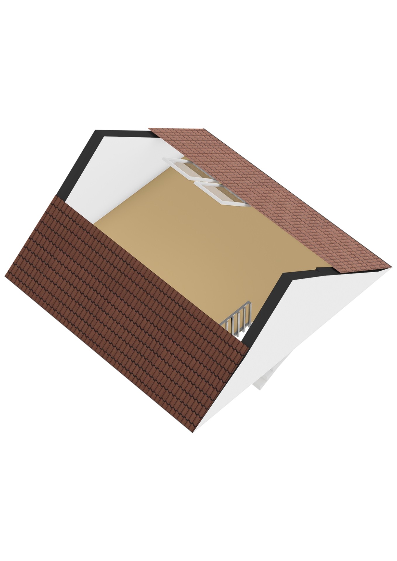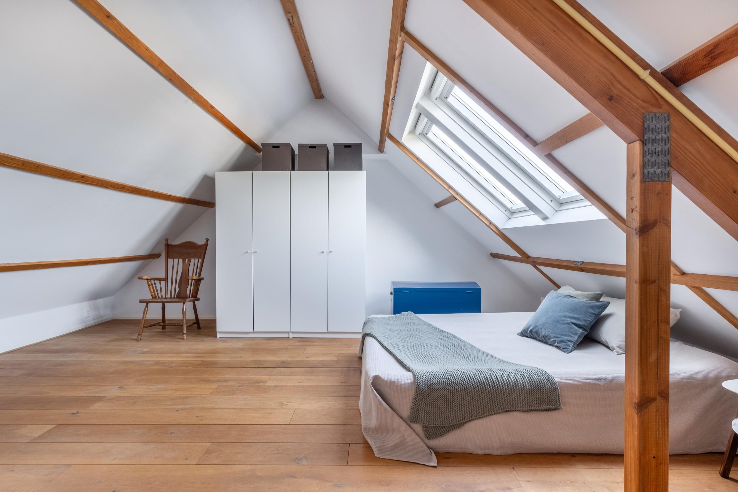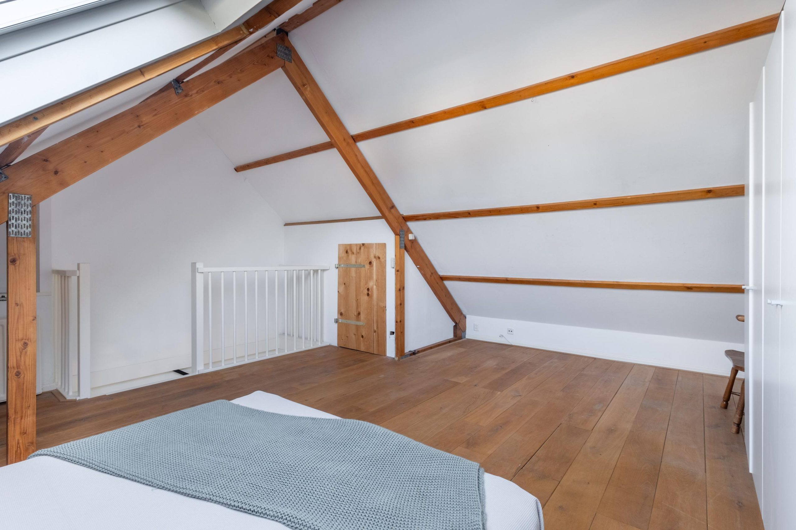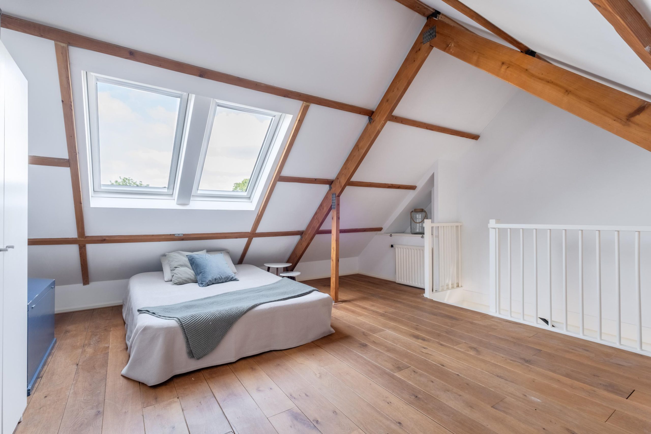 De vaste trap brengt je naar de tweede verdieping, waar een royale vierde slaapkamer is gecreëerd. Dankzij de kunststof dakramen en de zichtbare houten balken heeft deze verdieping een warme, knusse sfeer. Achter de knieschotten is extra bergruimte.