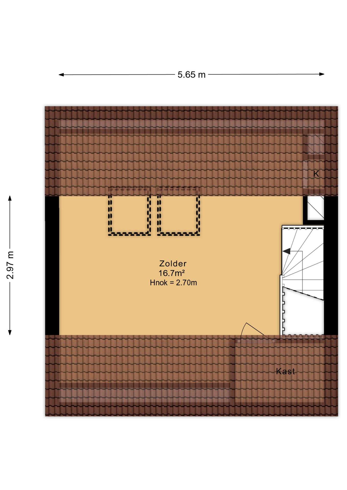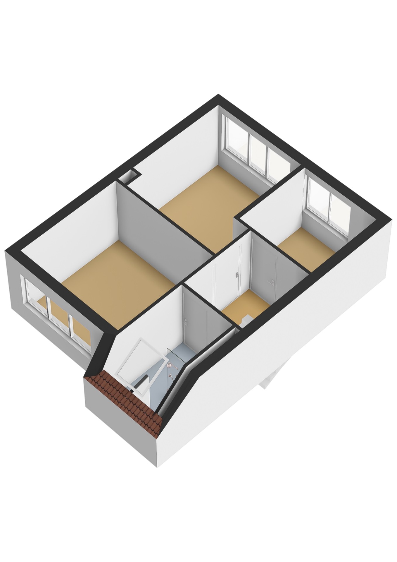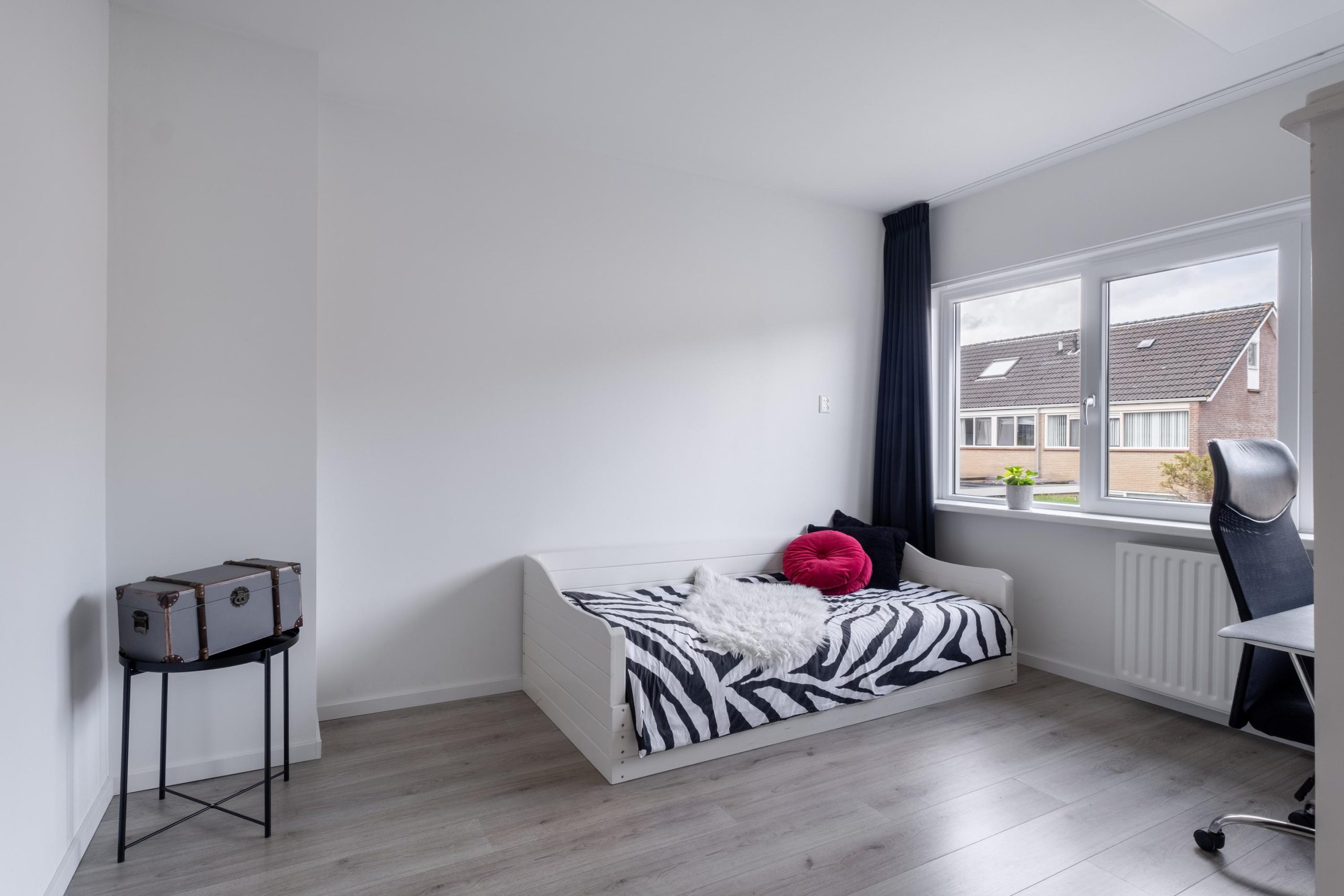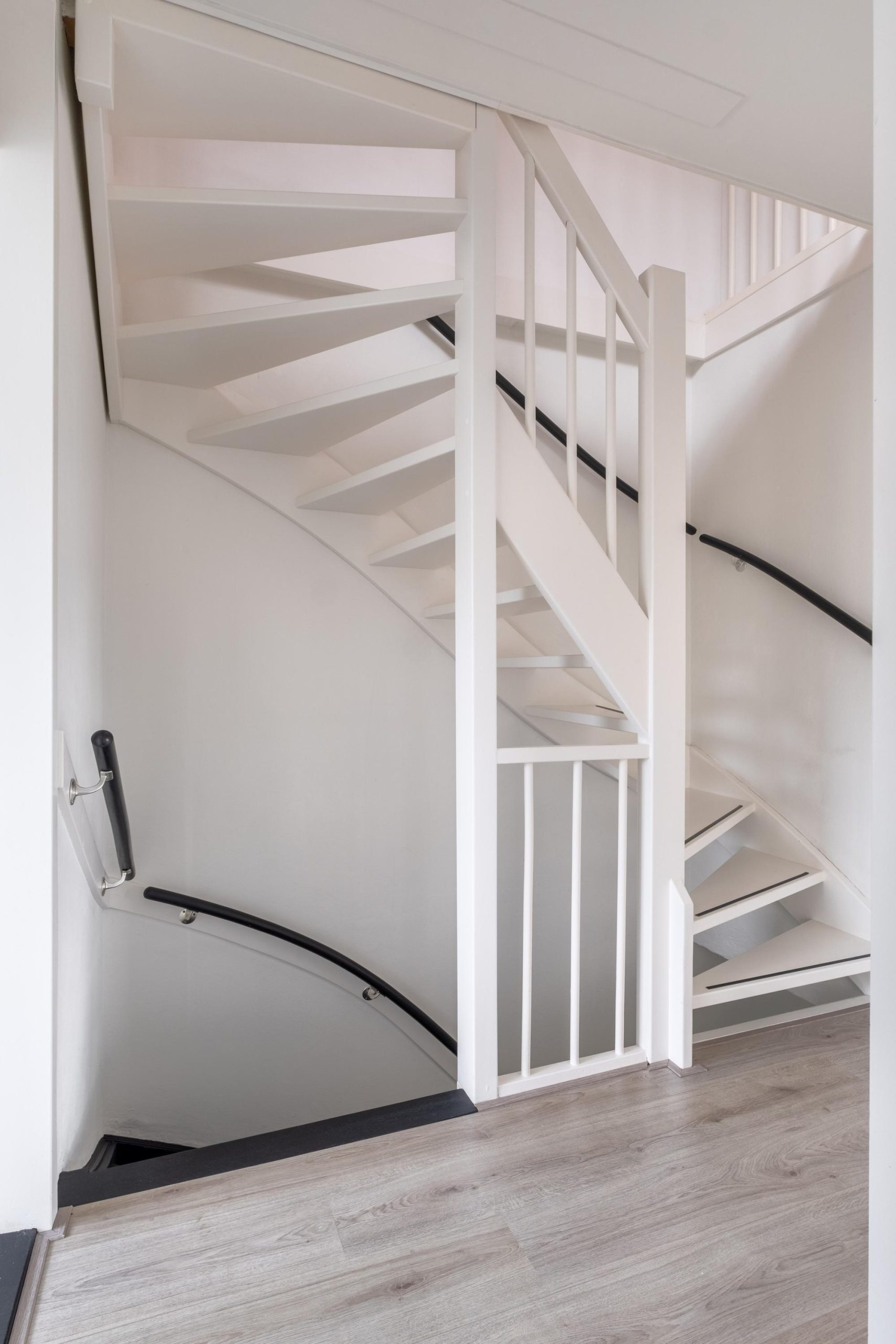 De vaste trap brengt je naar de tweede verdieping, waar een royale vierde slaapkamer is gecreëerd. Dankzij de kunststof dakramen en de zichtbare houten balken heeft deze verdieping een warme, knusse sfeer. Achter de knieschotten is extra bergruimte.