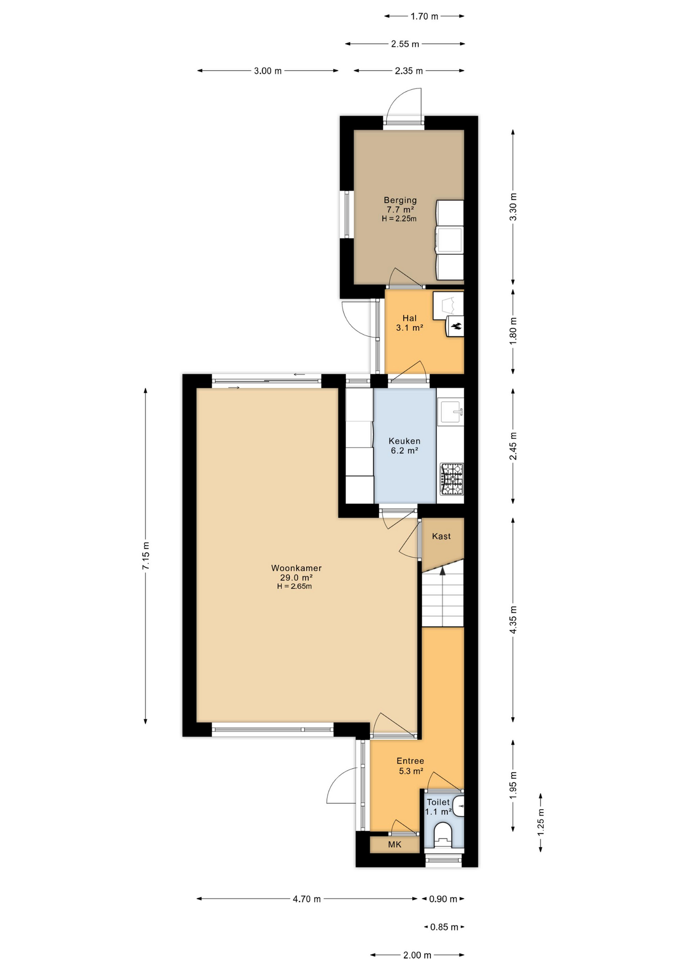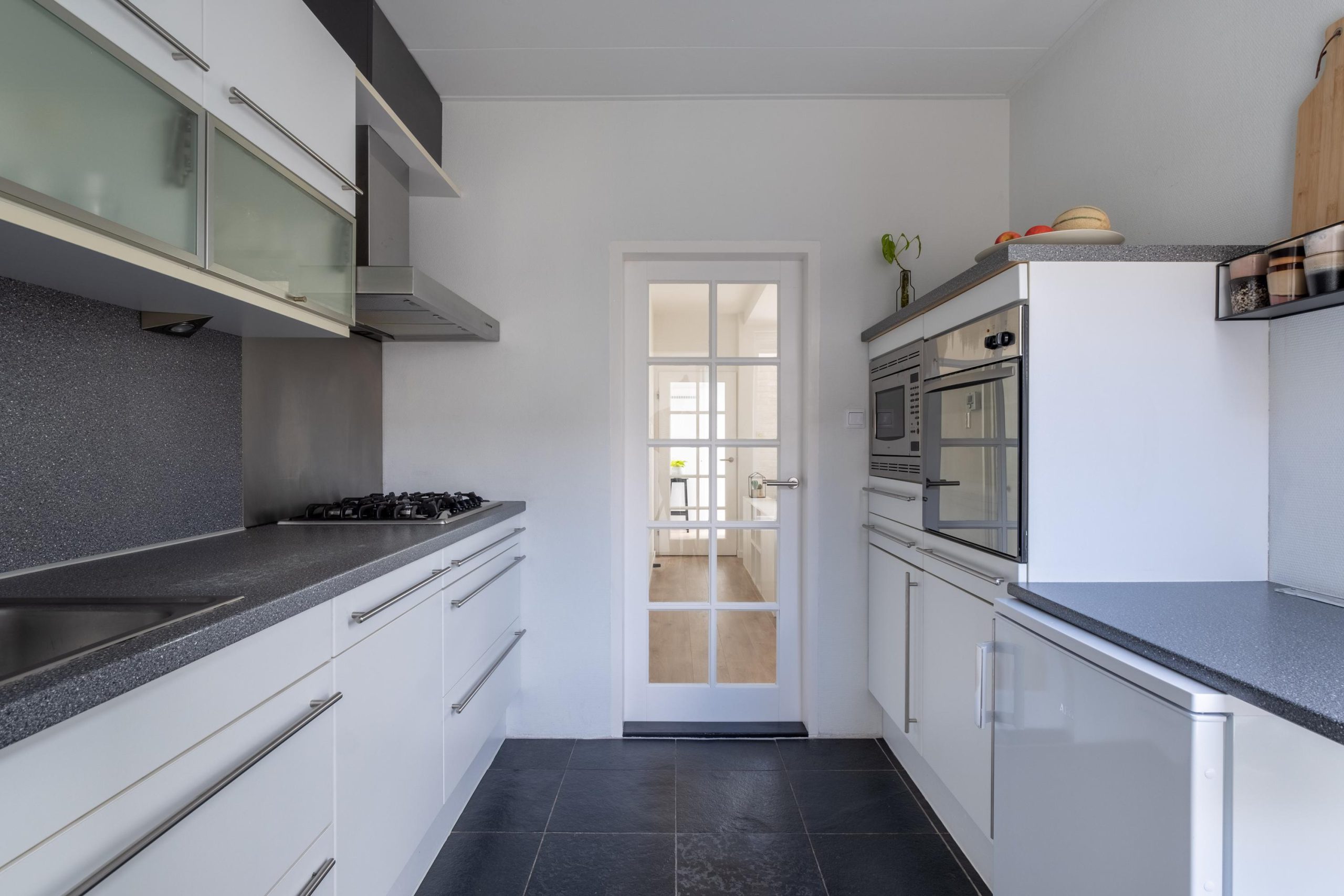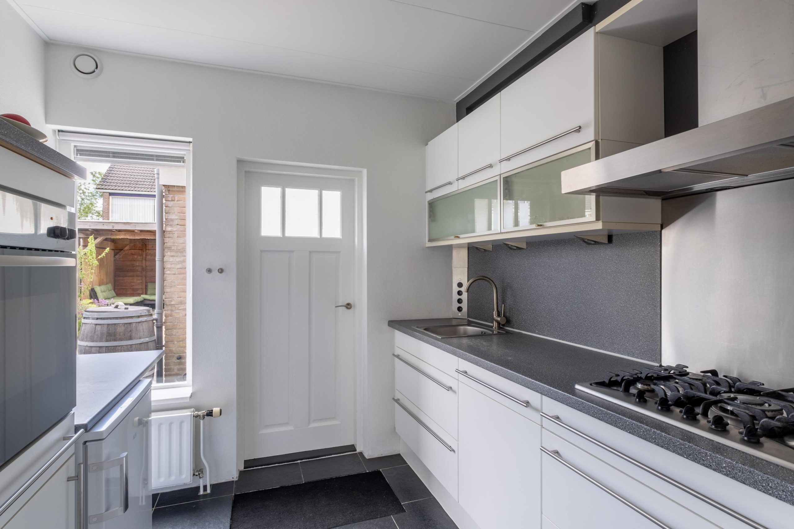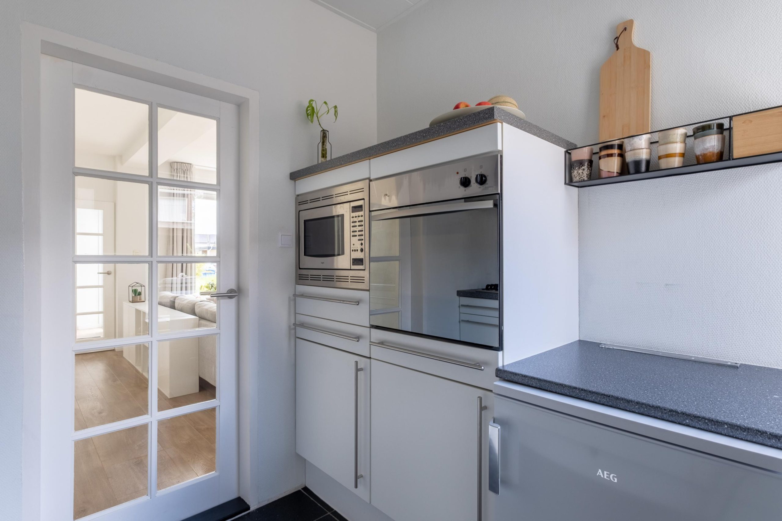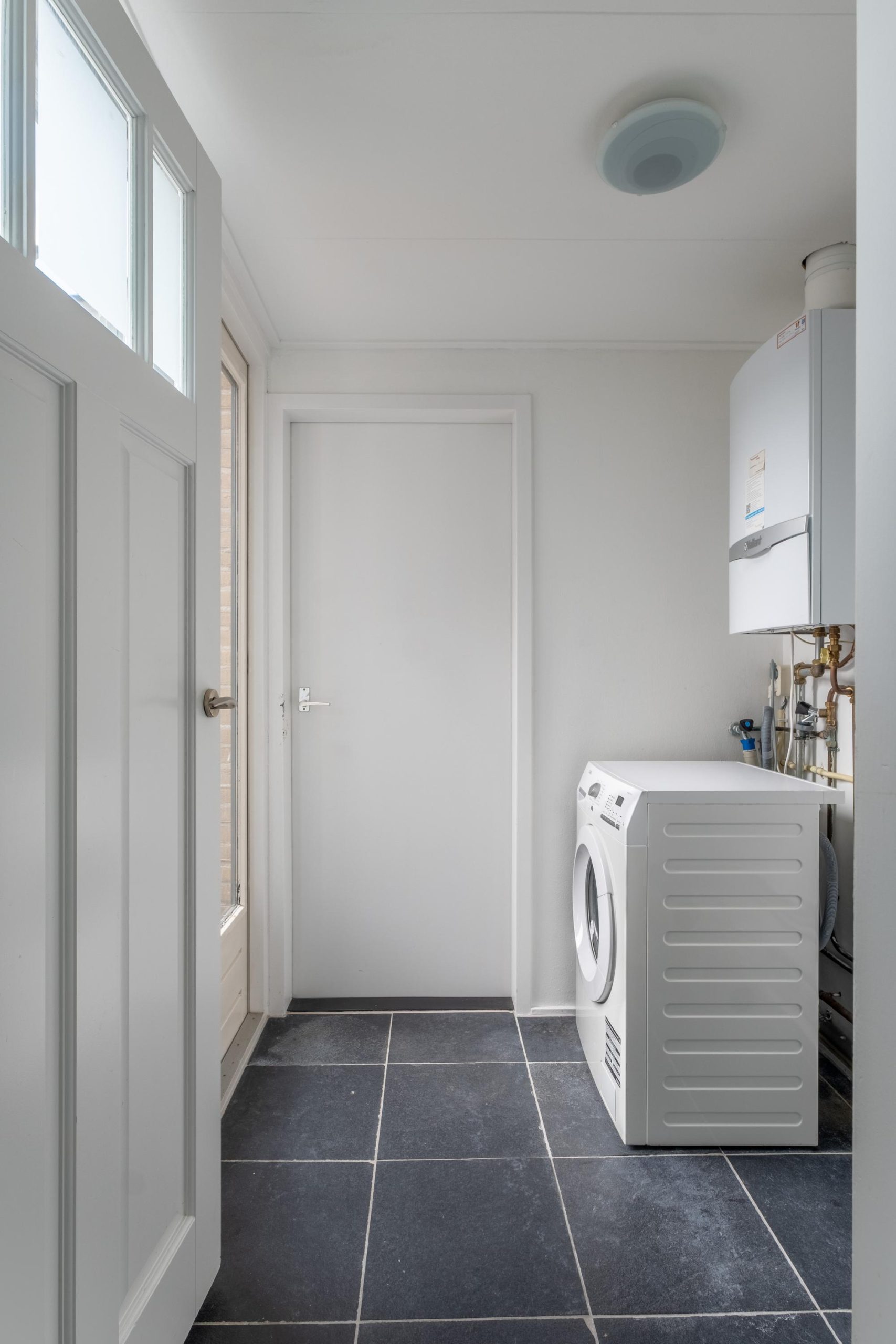 We lopen door naar de dichte keuken: praktisch ingedeeld en van alle gemakken voorzien met een 5-pits gasfornuis, oven, magnetron en vaatwasser. Achter de keuken ligt de bijkeuken met plek voor de wasmachine, droger en cv-ketel. Via de bijkeuken kom je in de handige berging — ideaal voor fietsen of tuingereedschap, en ook bereikbaar vanuit de tuin.