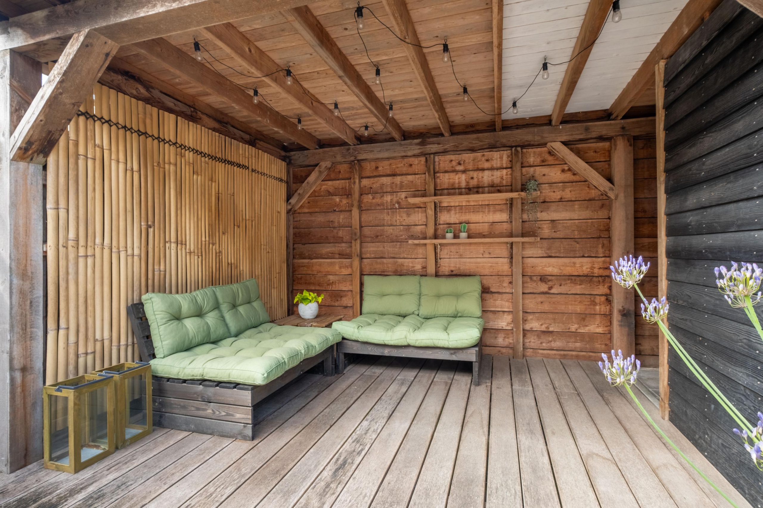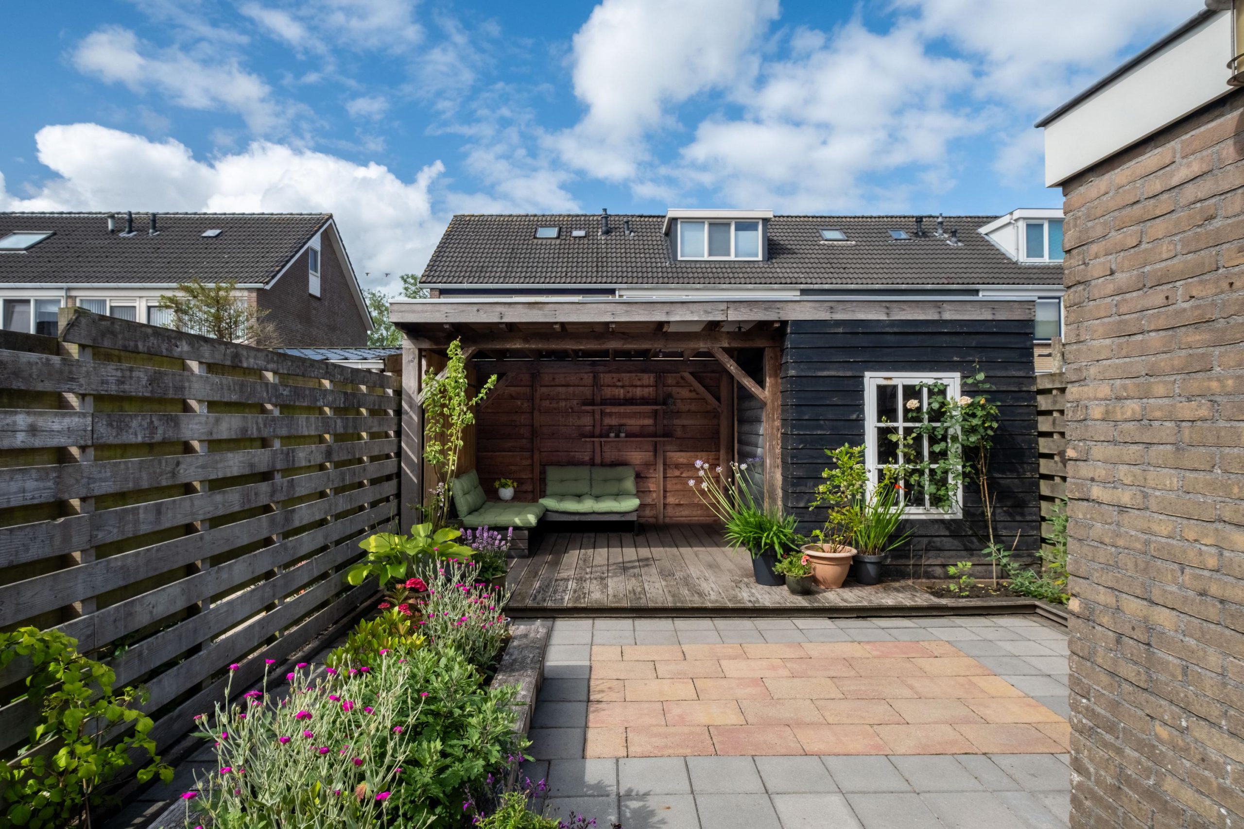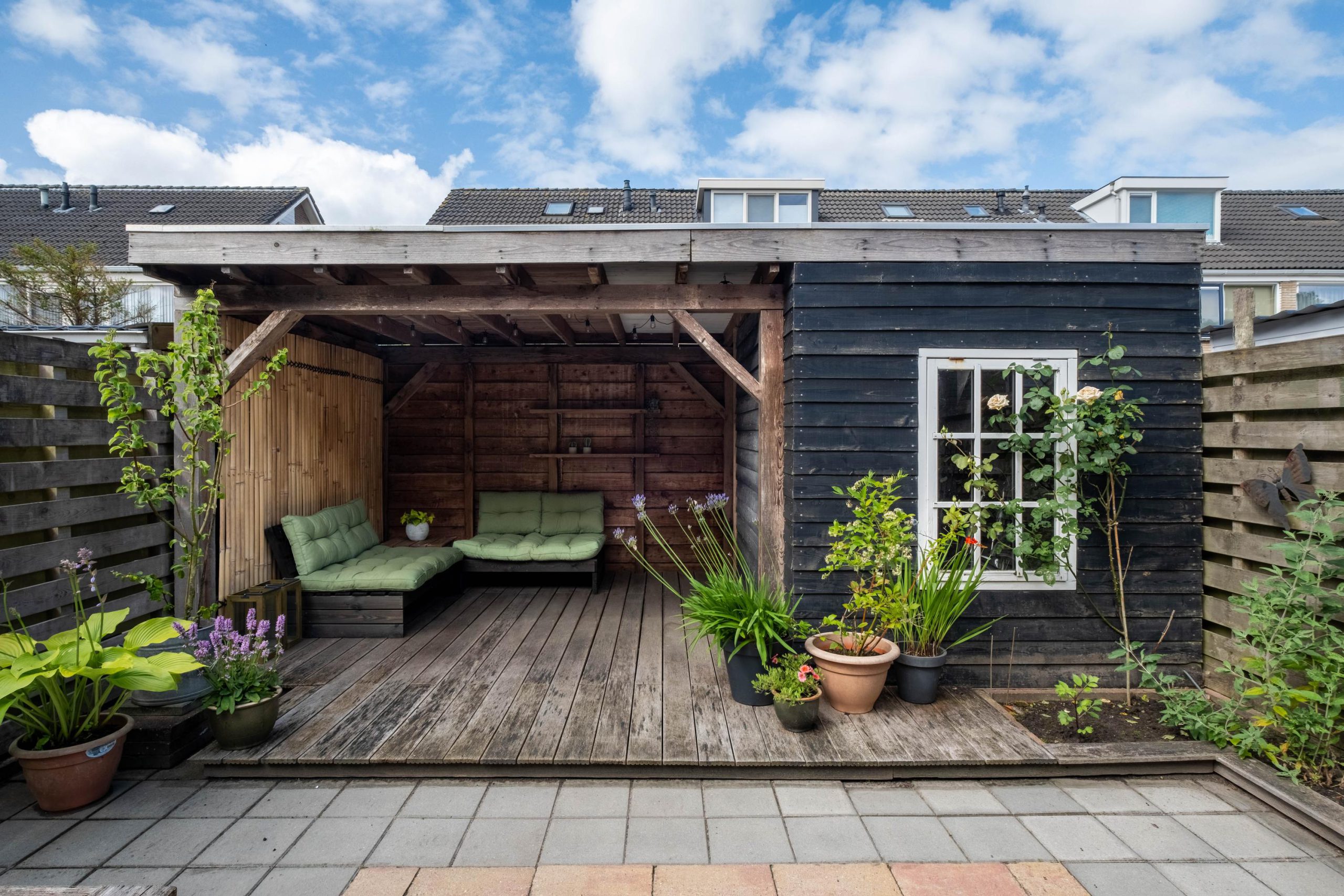 De achtertuin is een zonnige verrassing. Een plek waar je lekker kunt genieten, met een zonnescherm voor de warme dagen en een gezellige overkapping waar je ’s avonds nog lang kunt zitten. Via de achterom wandel je zo naar voren.