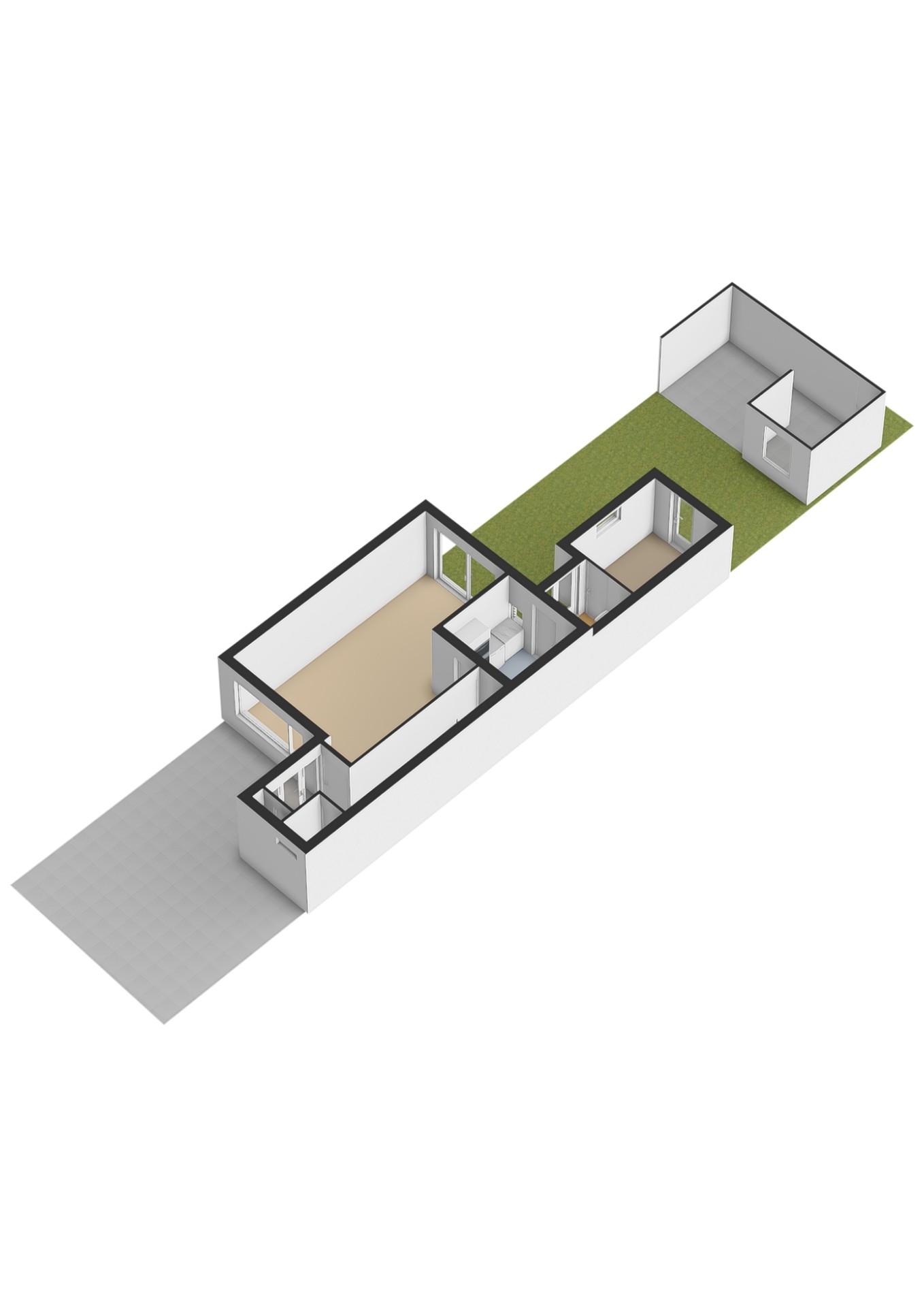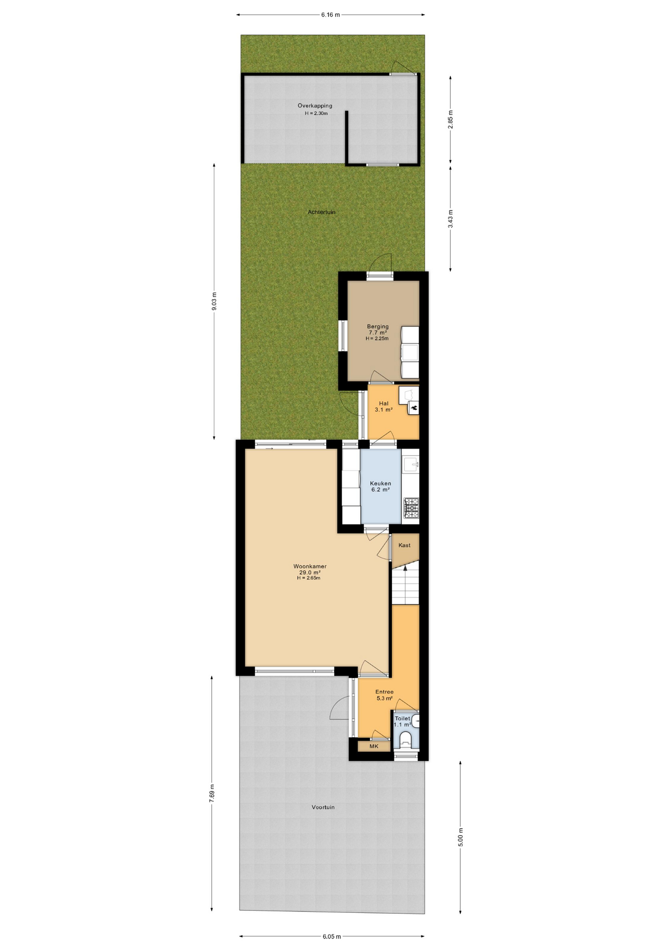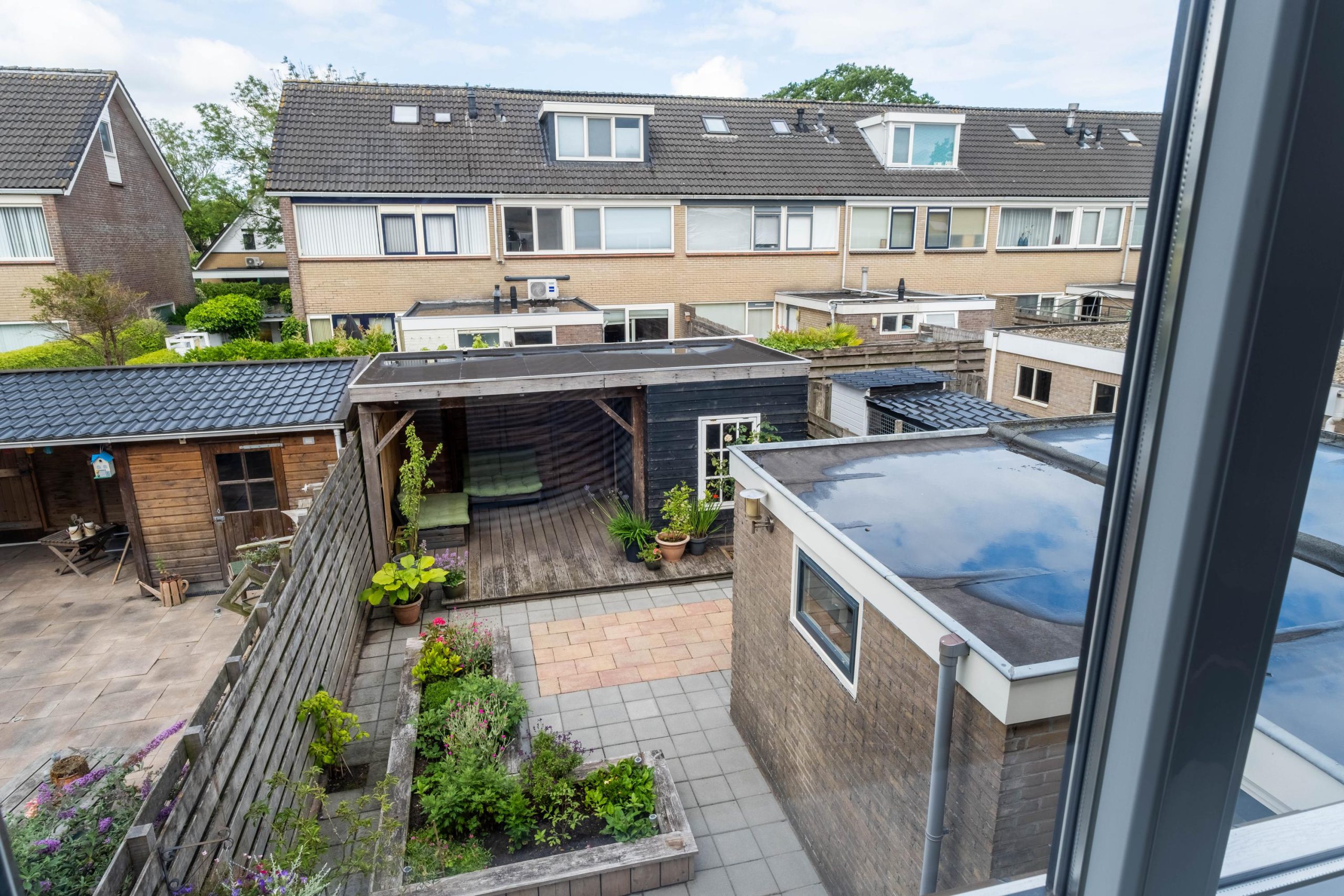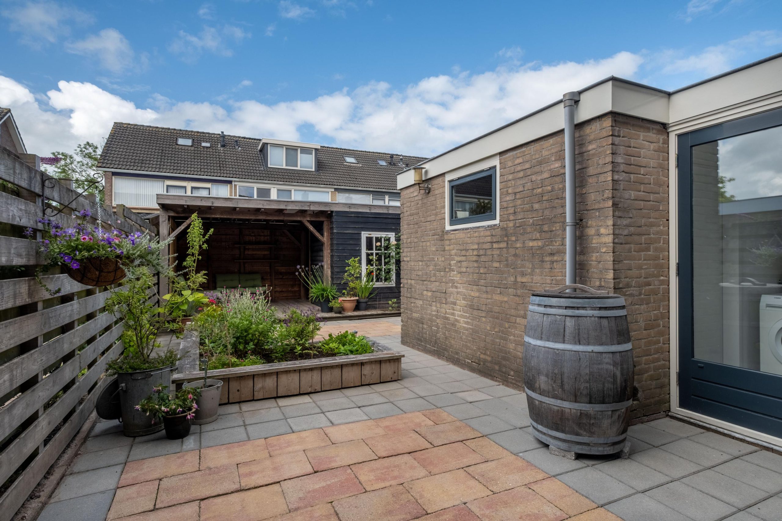 De achtertuin is een zonnige verrassing. Een plek waar je lekker kunt genieten, met een zonnescherm voor de warme dagen en een gezellige overkapping waar je ’s avonds nog lang kunt zitten. Via de achterom wandel je zo naar voren.