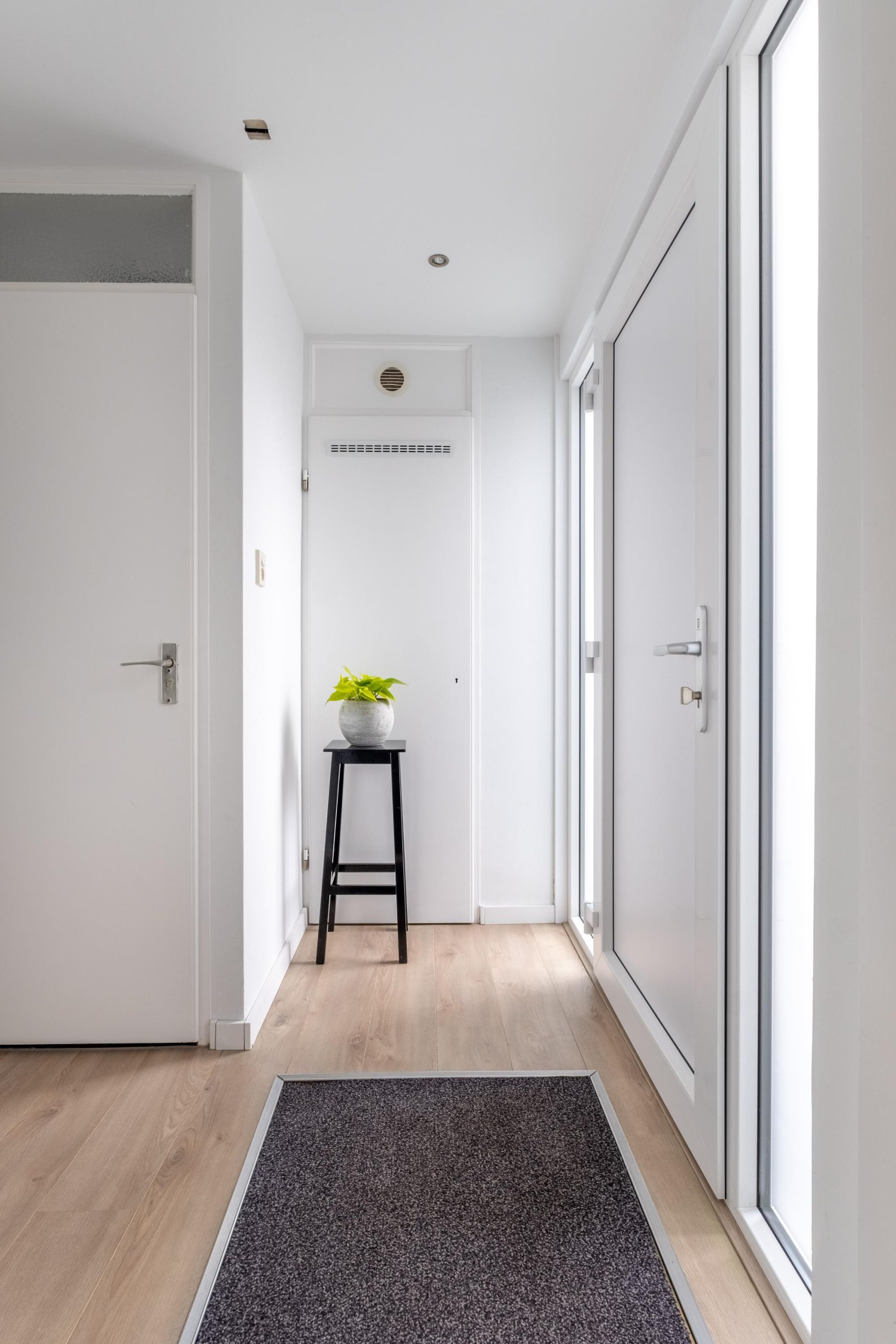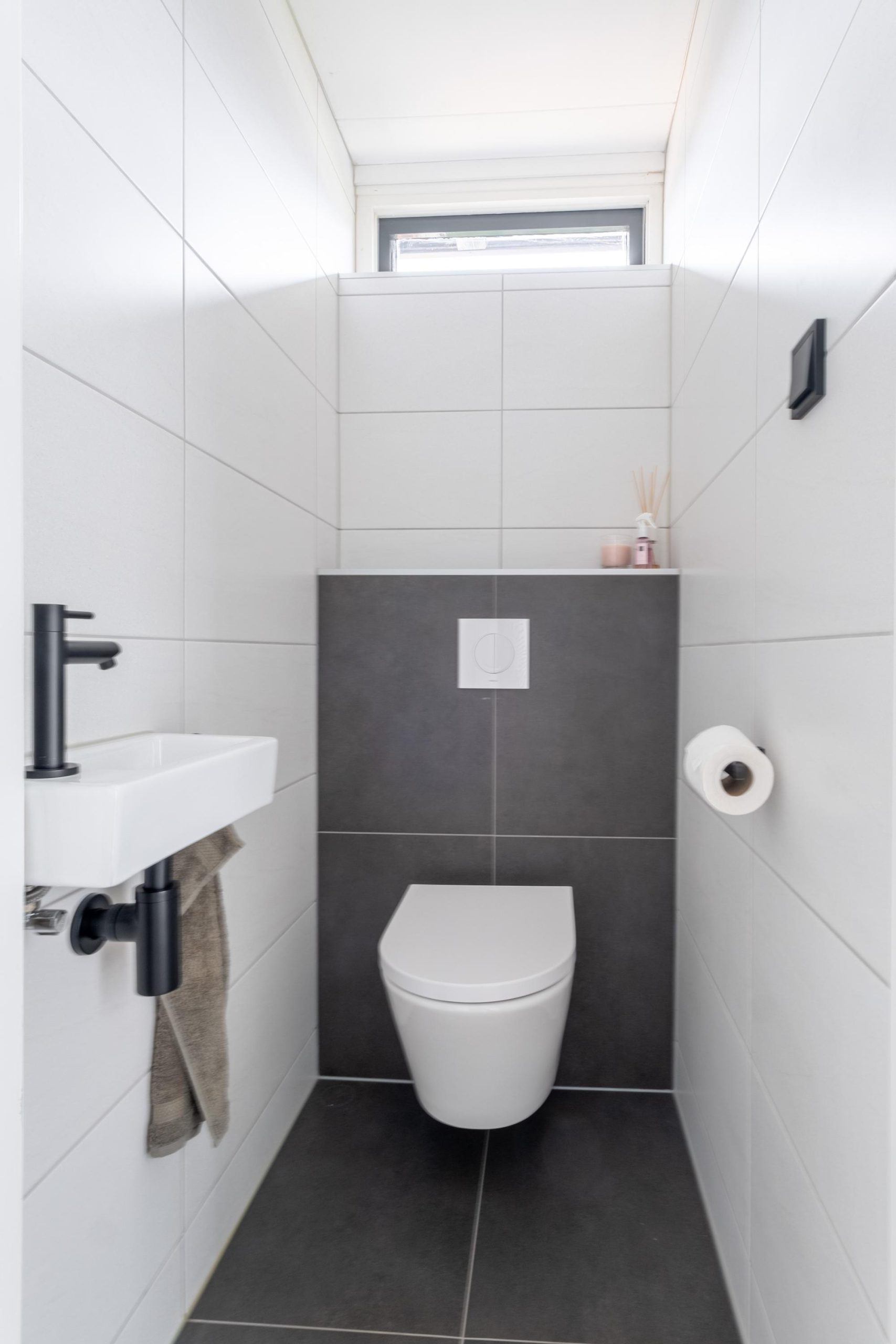 We stappen binnen in de hal: netjes, licht en voorzien van een modern toilet dat in juni 2024 nog is vernieuwd. De meterkast met de omvormer van de zonnepanelen vind je hier ook. Vanuit de hal lopen we door naar de woonkamer.