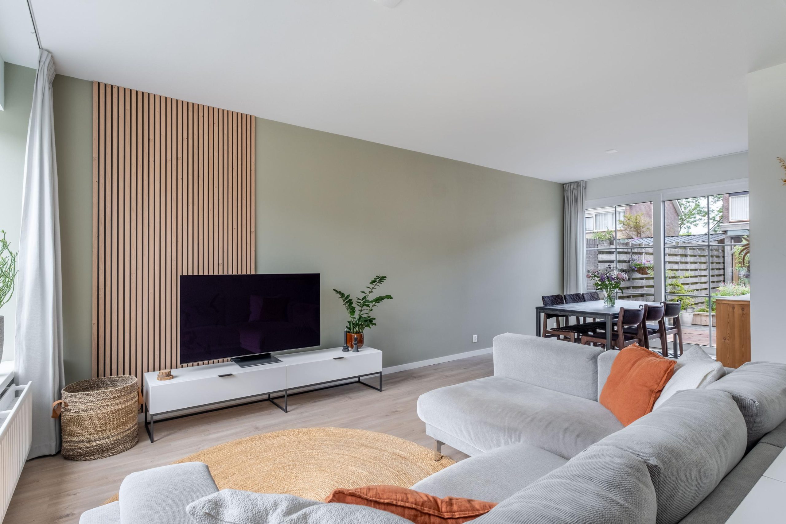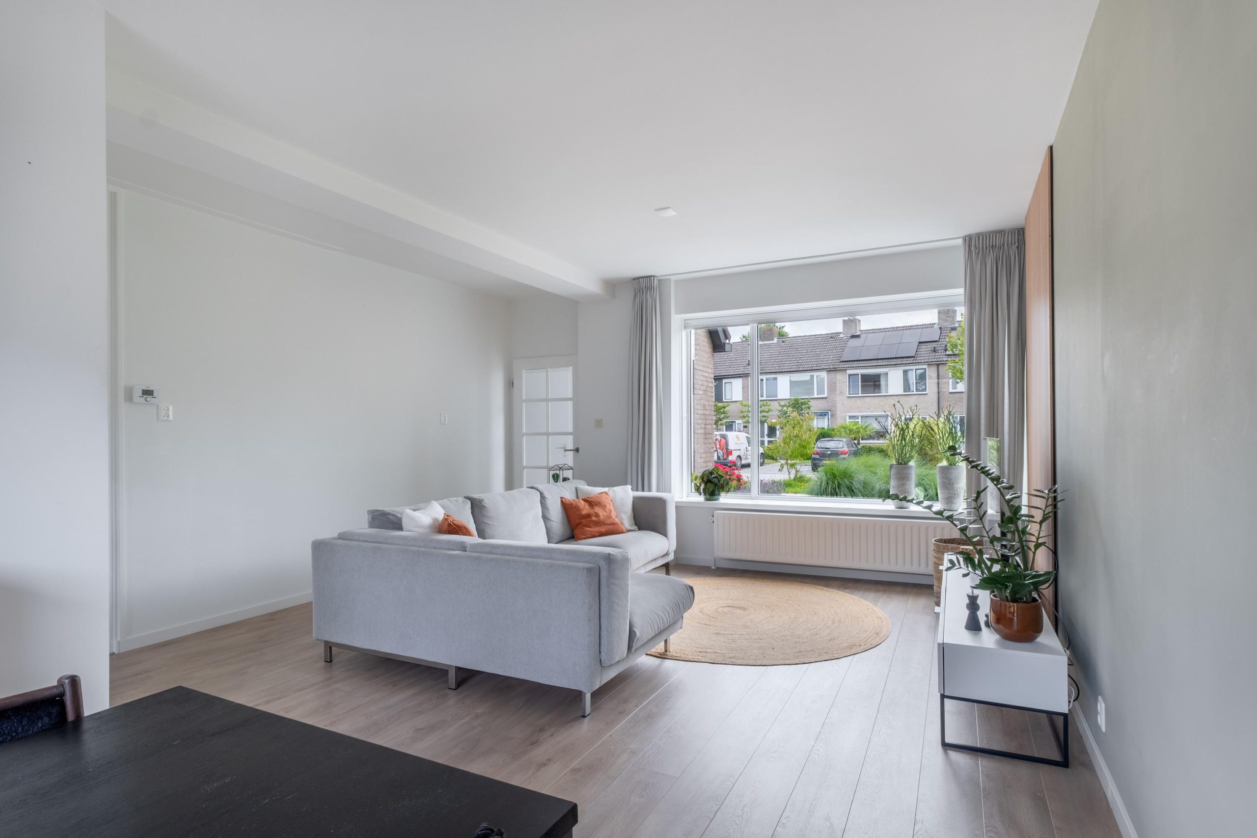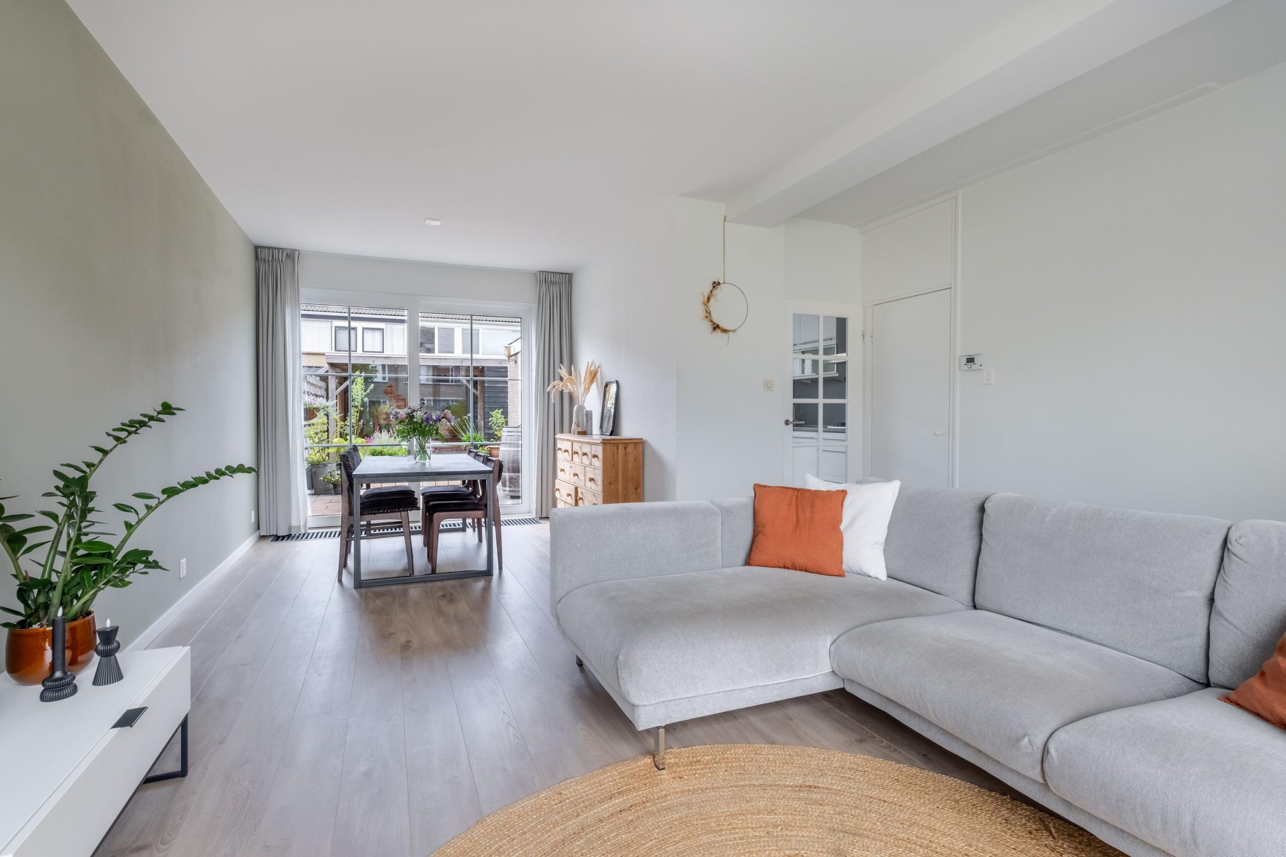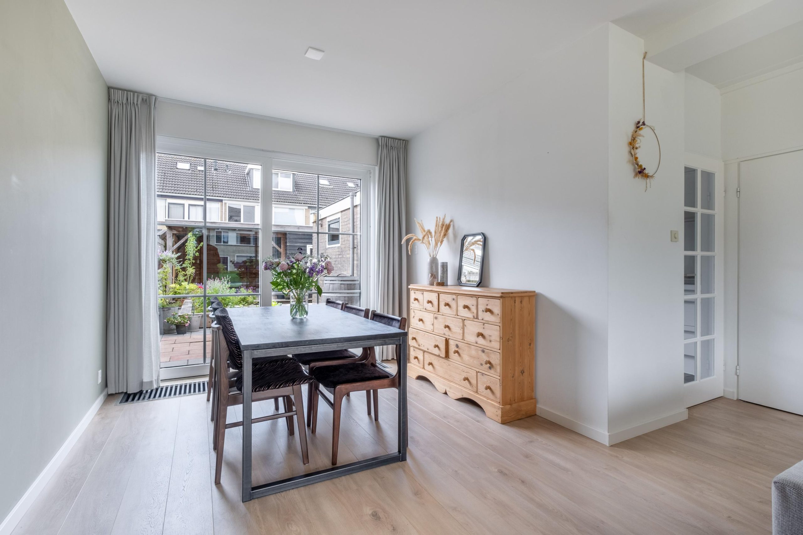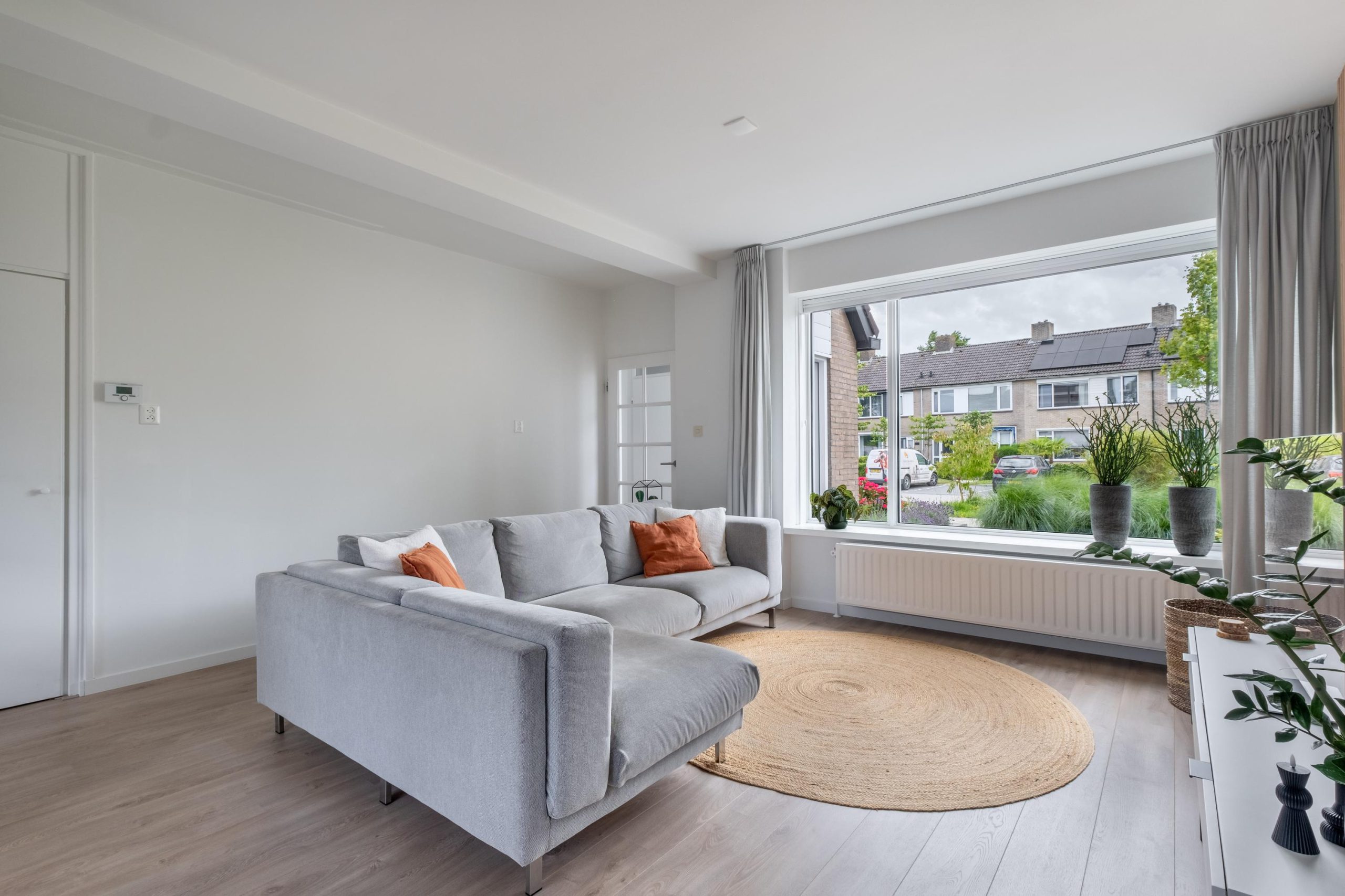 Wat een fijne ruimte! Dankzij de grote ramen aan de voorzijde komt er volop daglicht binnen. Aan de achterkant trekken de kunststof schuifpui en het uitzicht op de tuin meteen de aandacht. De woonkamer voelt ruim en gezellig aan — perfect voor een grote eettafel of knusse zithoek. In de trapkast kun je al je spullen netjes kwijt.
