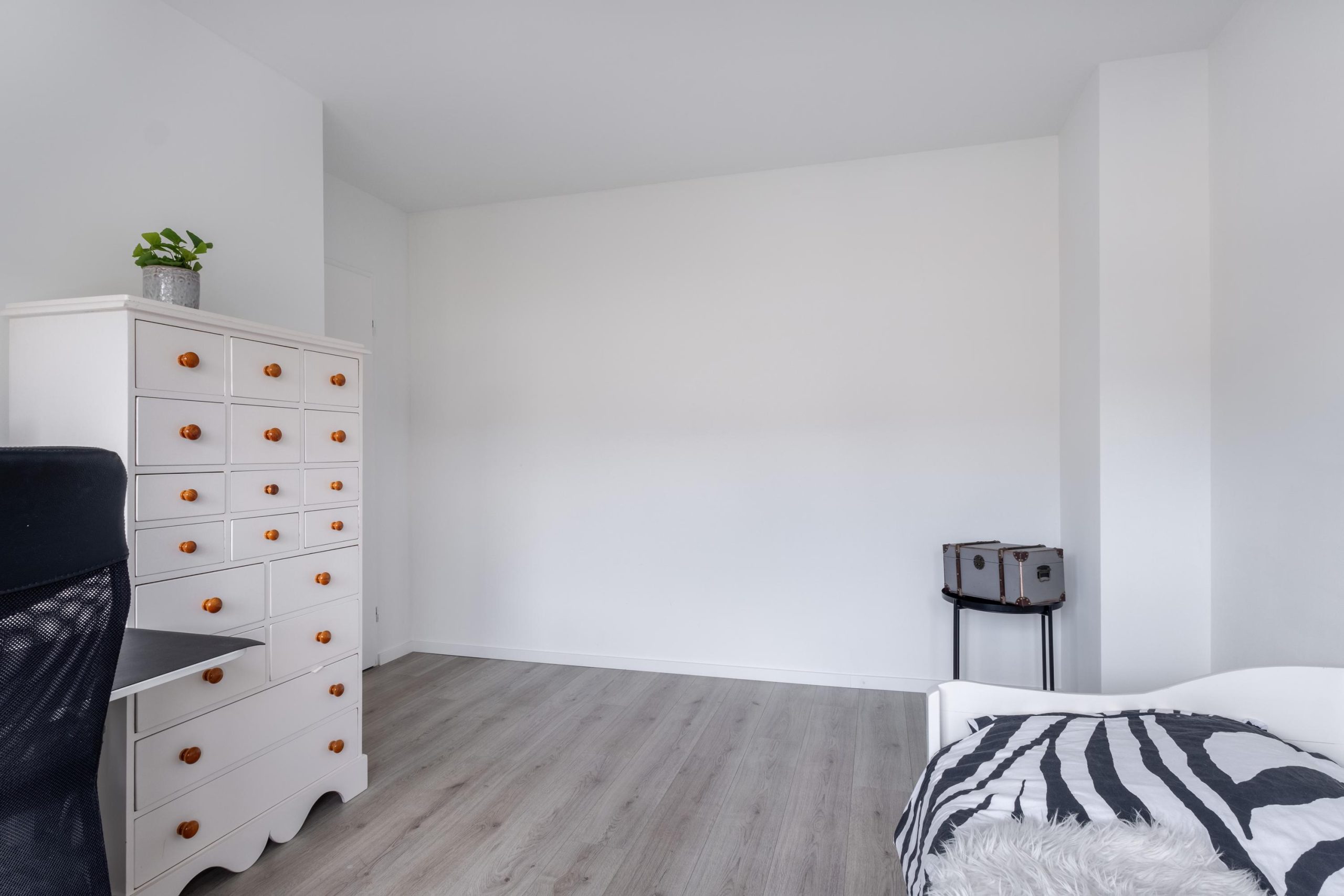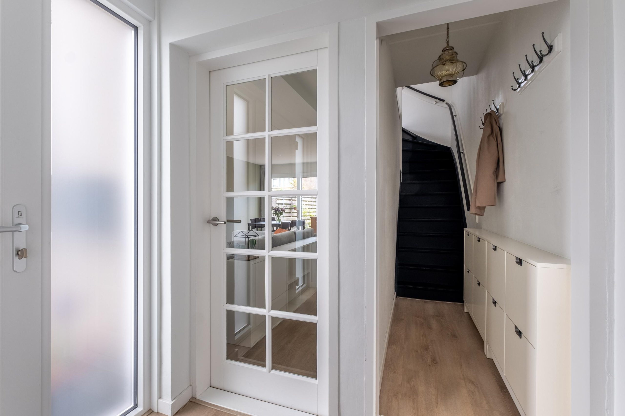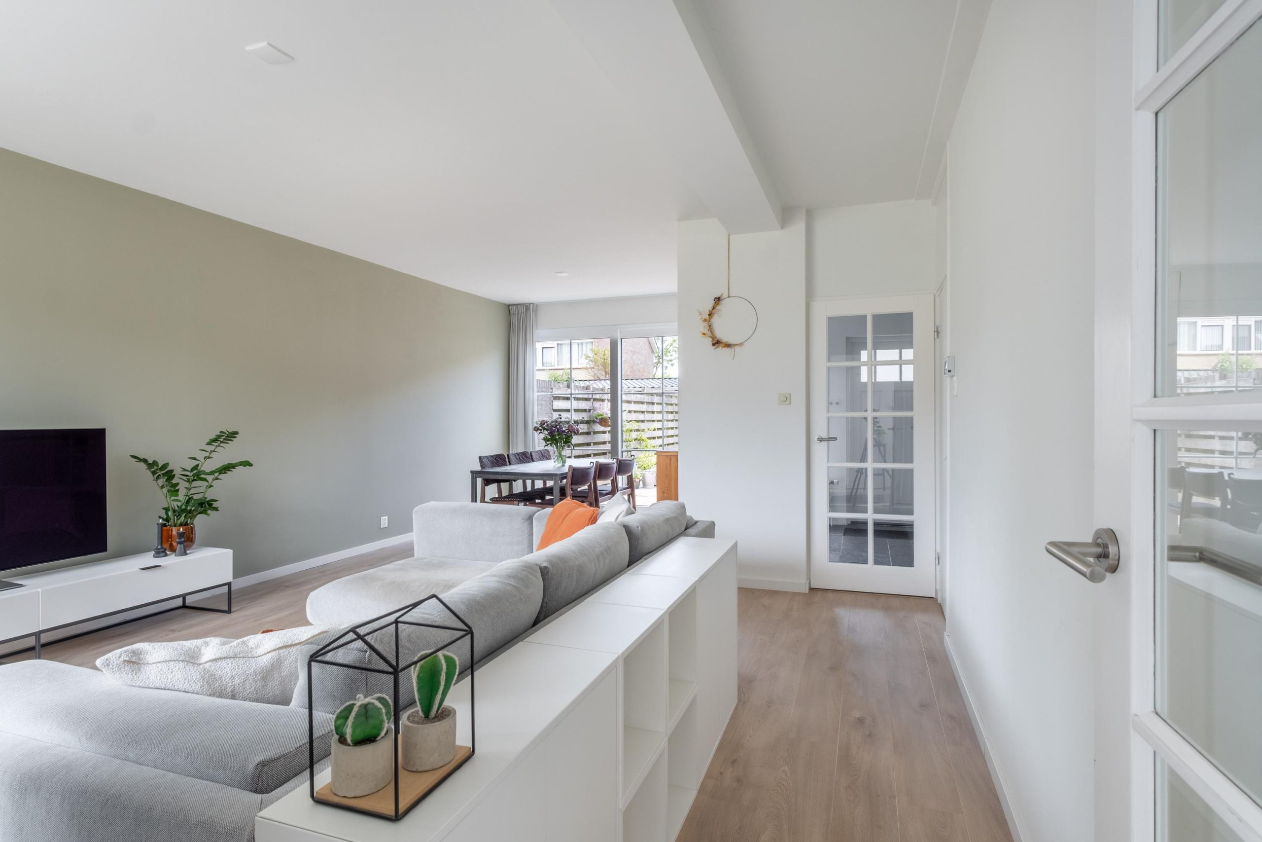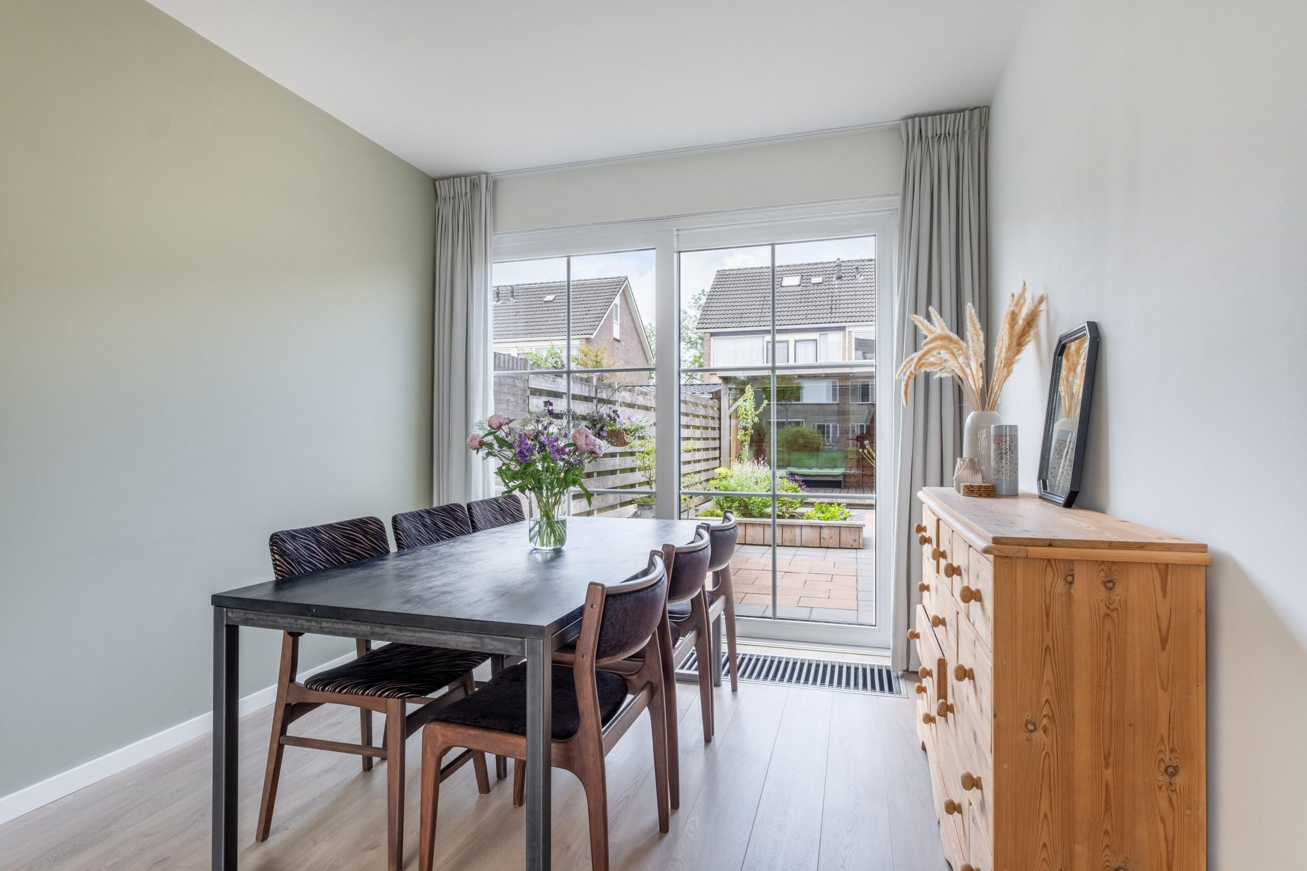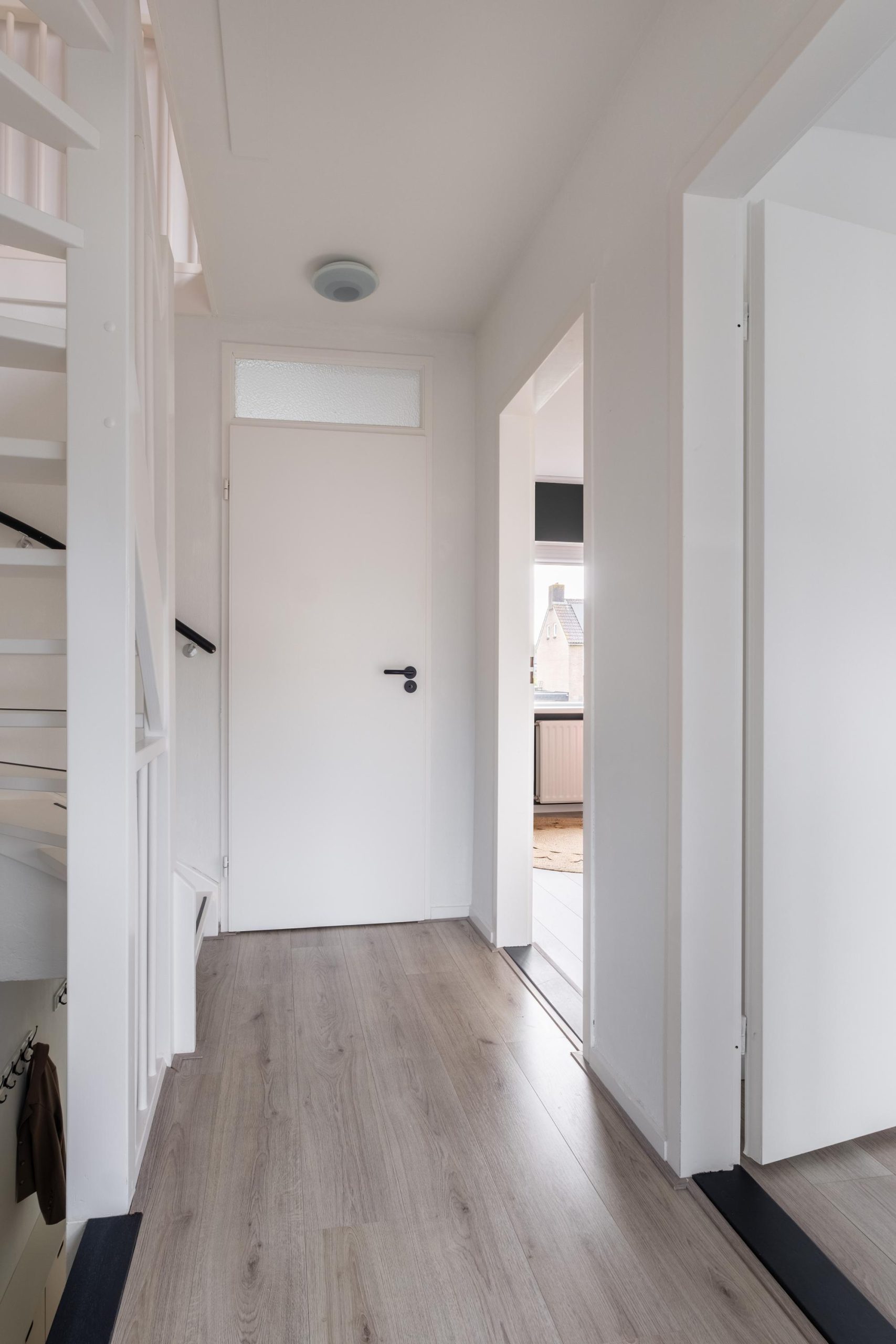 Wat een fijne ruimte! Dankzij de grote ramen aan de voorzijde komt er volop daglicht binnen. Aan de achterkant trekken de kunststof schuifpui en het uitzicht op de tuin meteen de aandacht. De woonkamer voelt ruim en gezellig aan — perfect voor een grote eettafel of knusse zithoek. In de trapkast kun je al je spullen netjes kwijt.