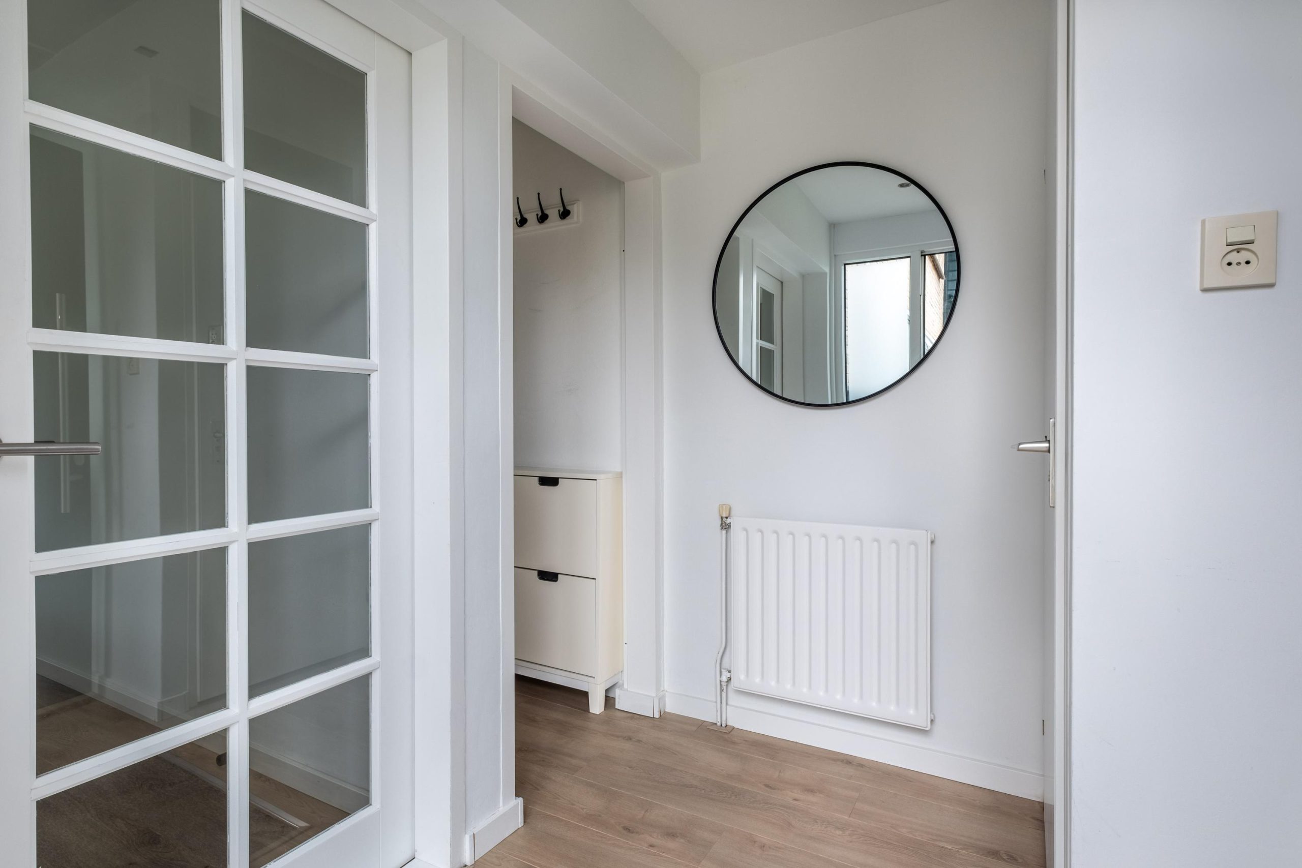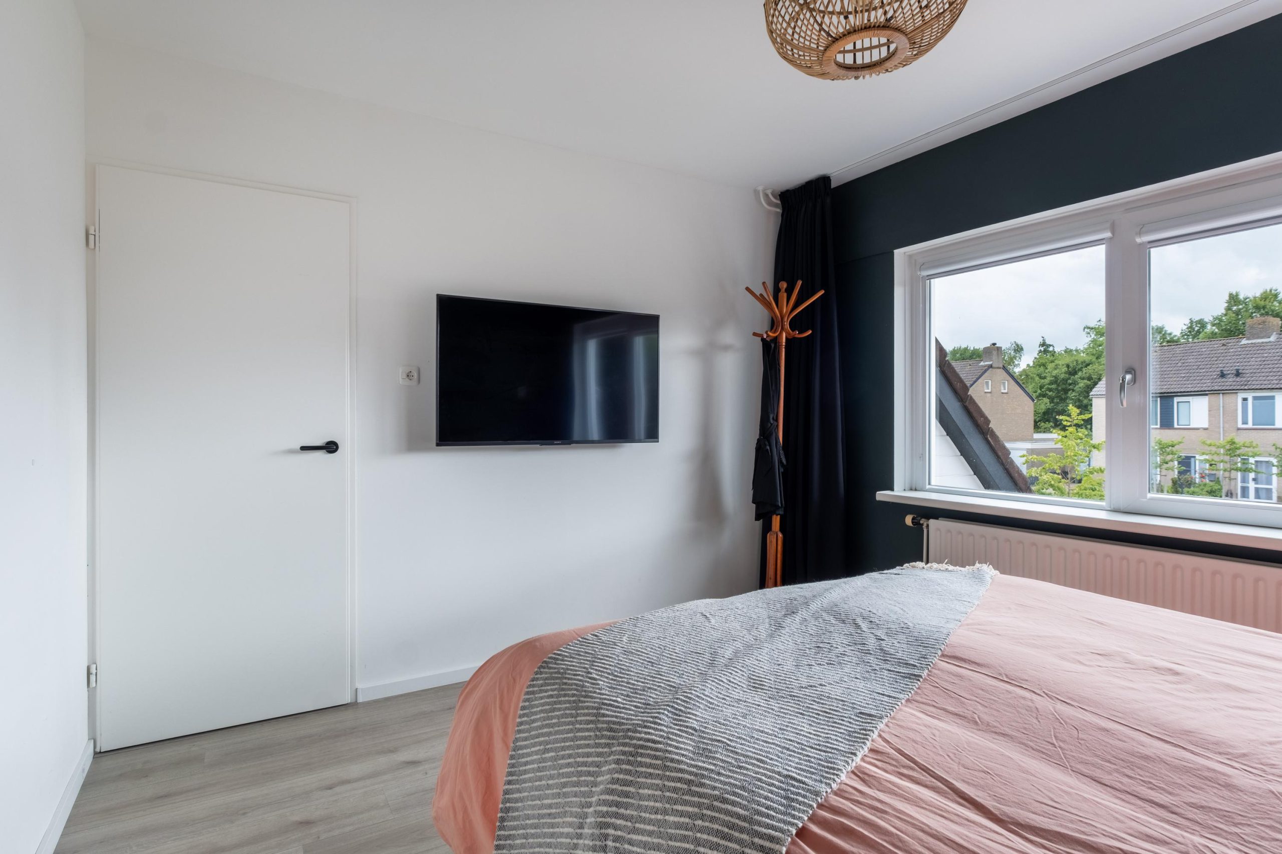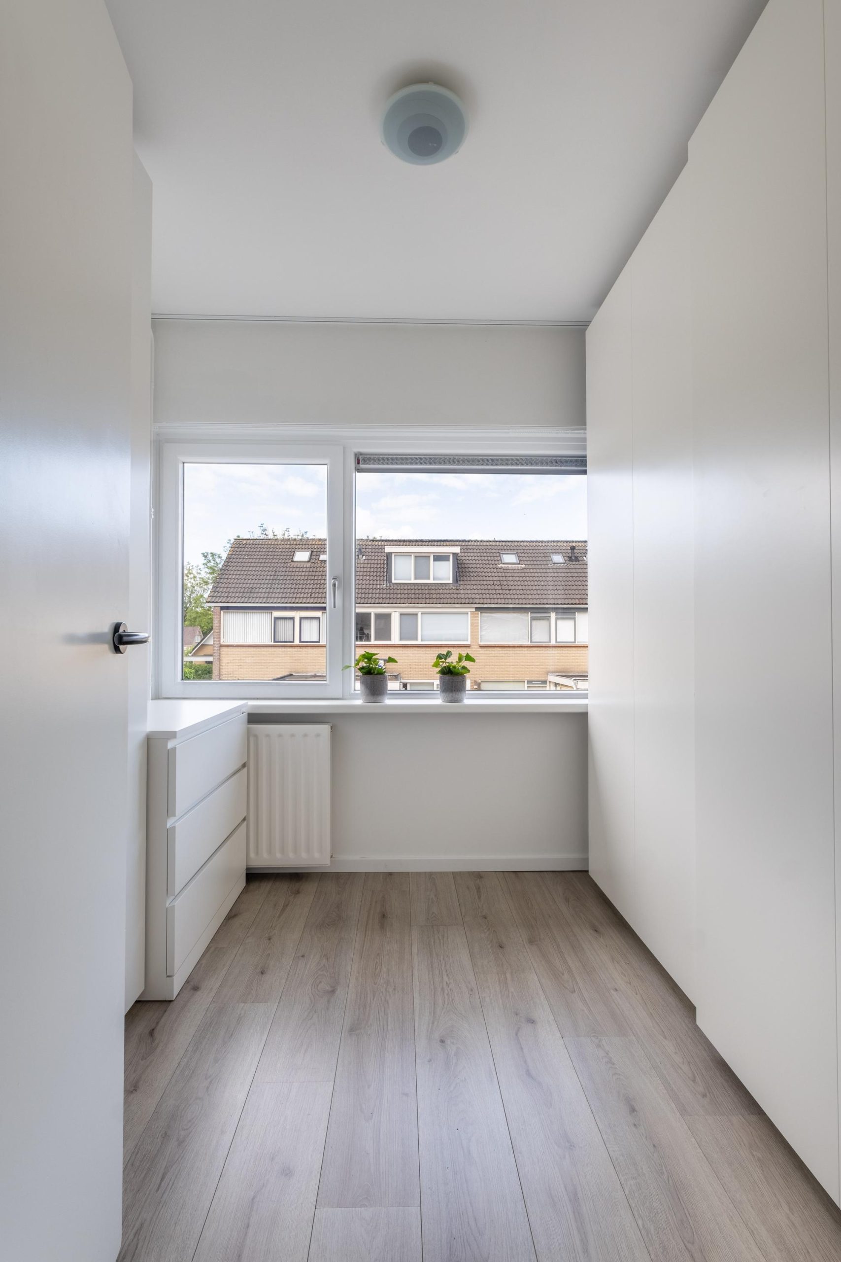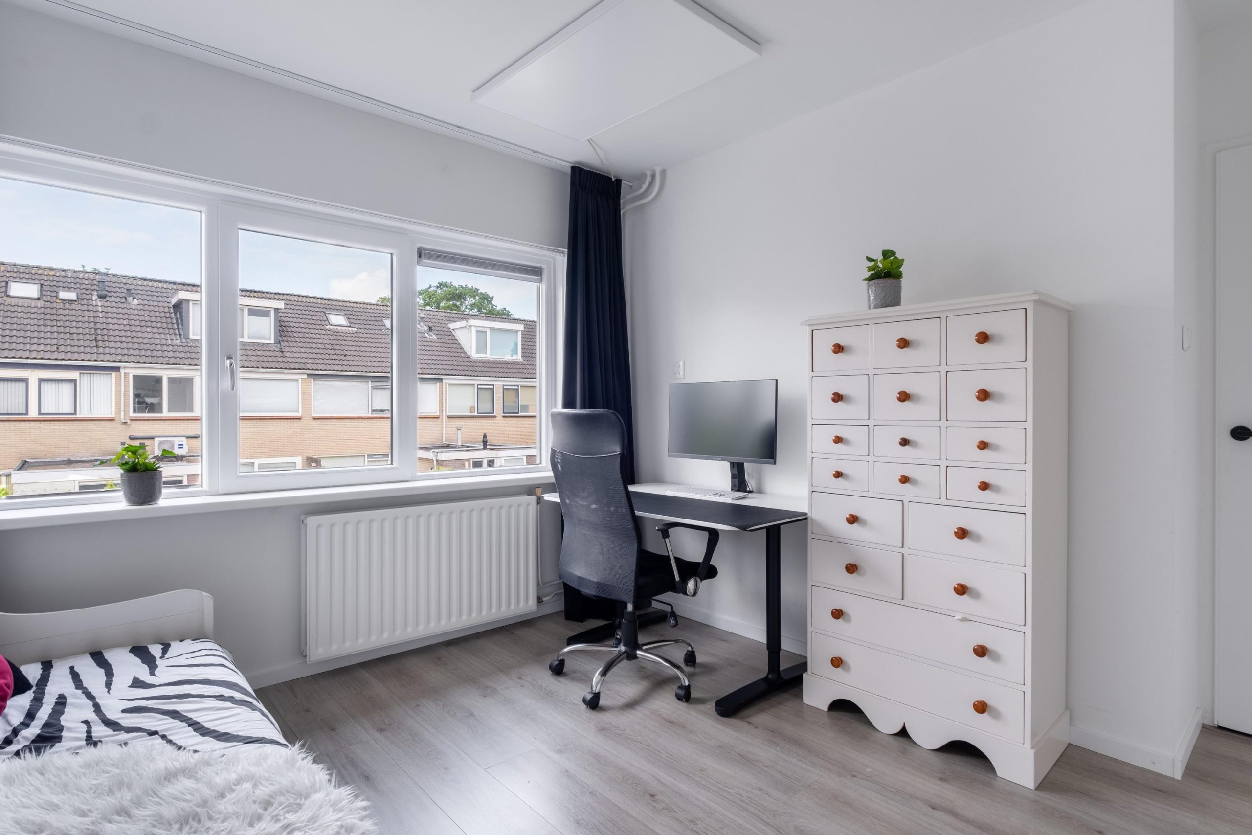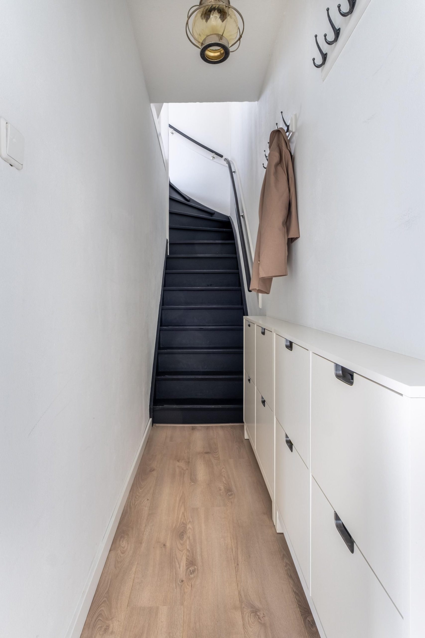 Wat een fijne ruimte! Dankzij de grote ramen aan de voorzijde komt er volop daglicht binnen. Aan de achterkant trekken de kunststof schuifpui en het uitzicht op de tuin meteen de aandacht. De woonkamer voelt ruim en gezellig aan — perfect voor een grote eettafel of knusse zithoek. In de trapkast kun je al je spullen netjes kwijt.
