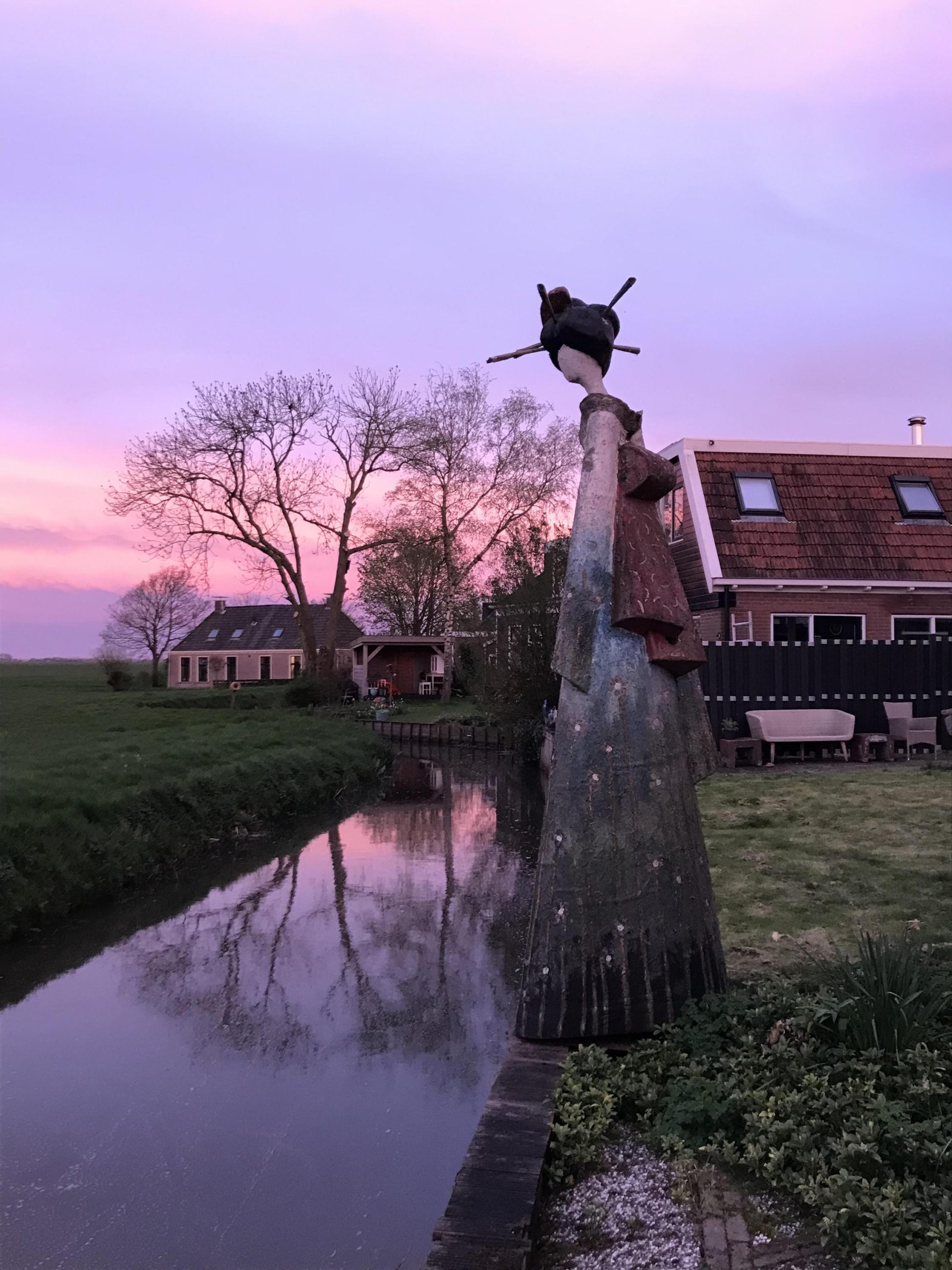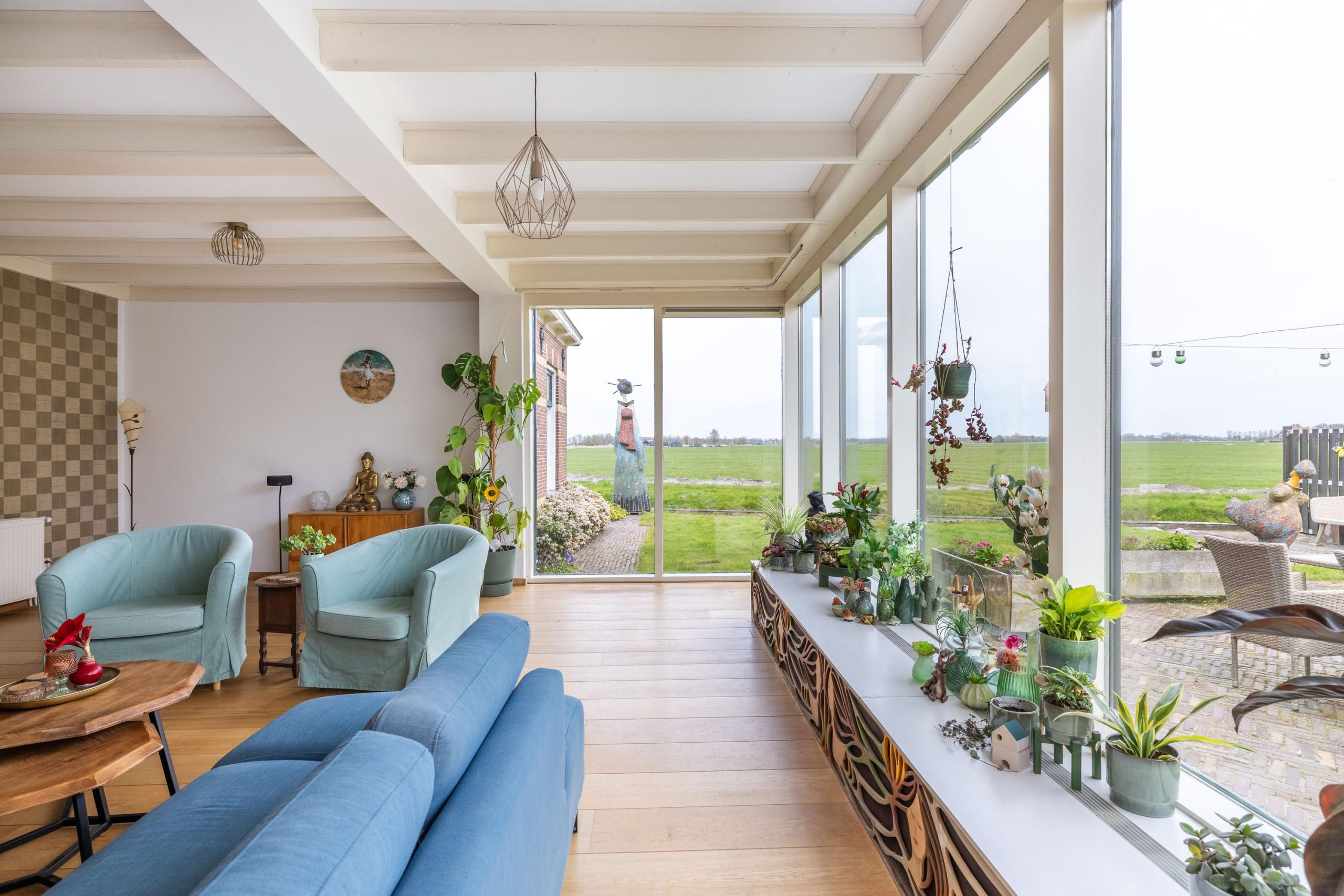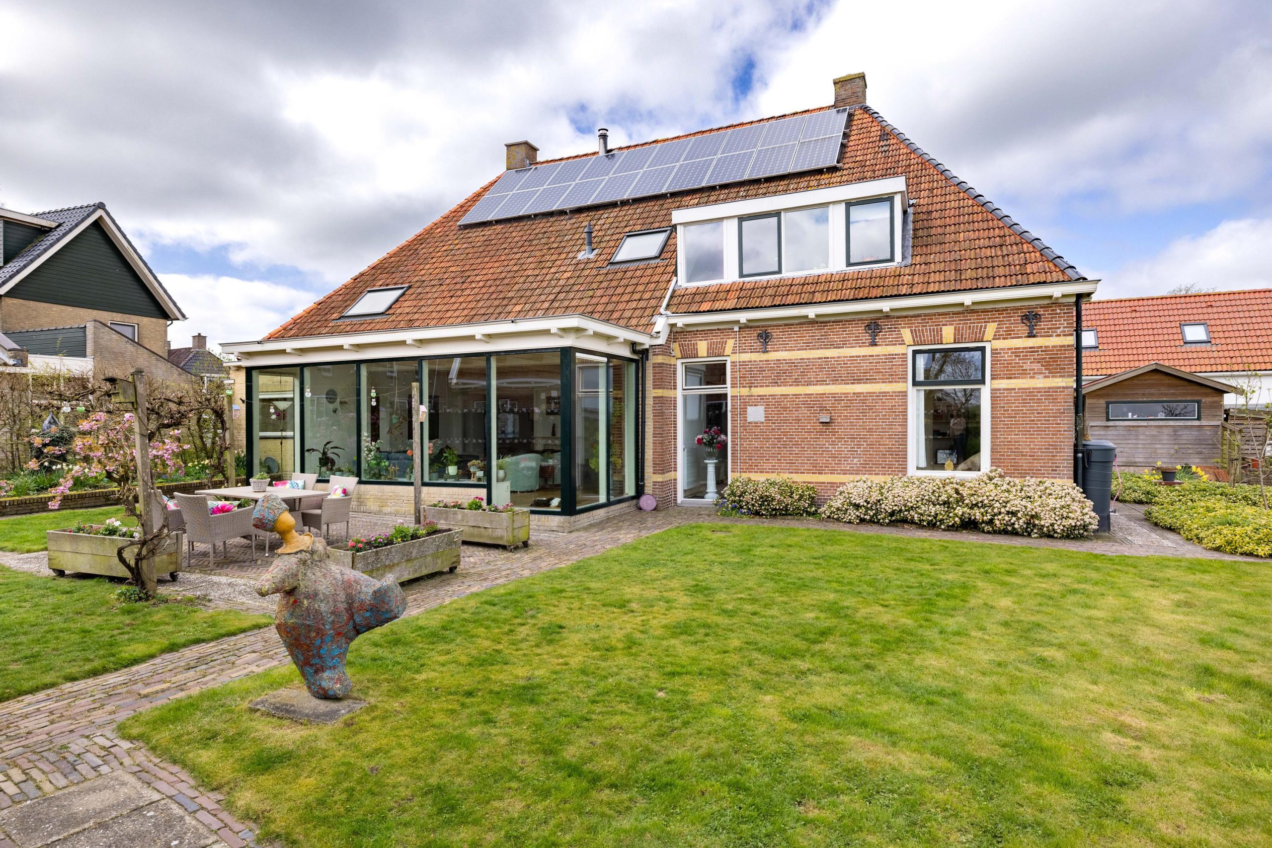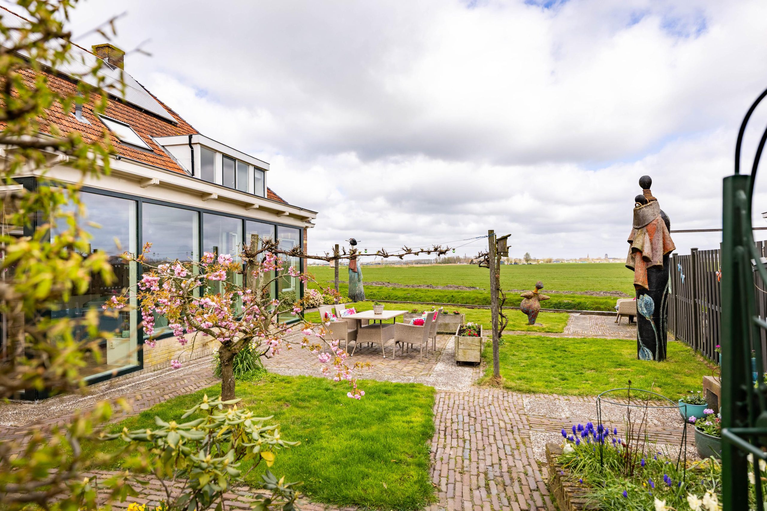 In de tuin zorgen drie bijzondere kunstwerken voor een speels en persoonlijk karakter, terwijl binnen unieke schilderingen op de kastdeuren het geheel een extra artistieke uitstraling geven.
