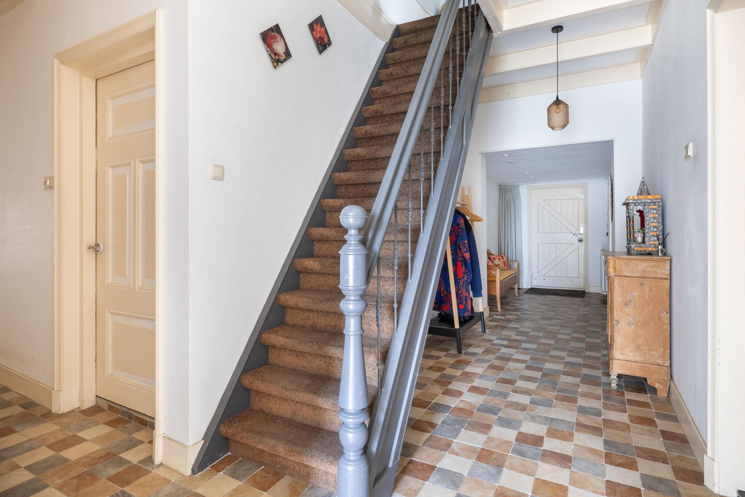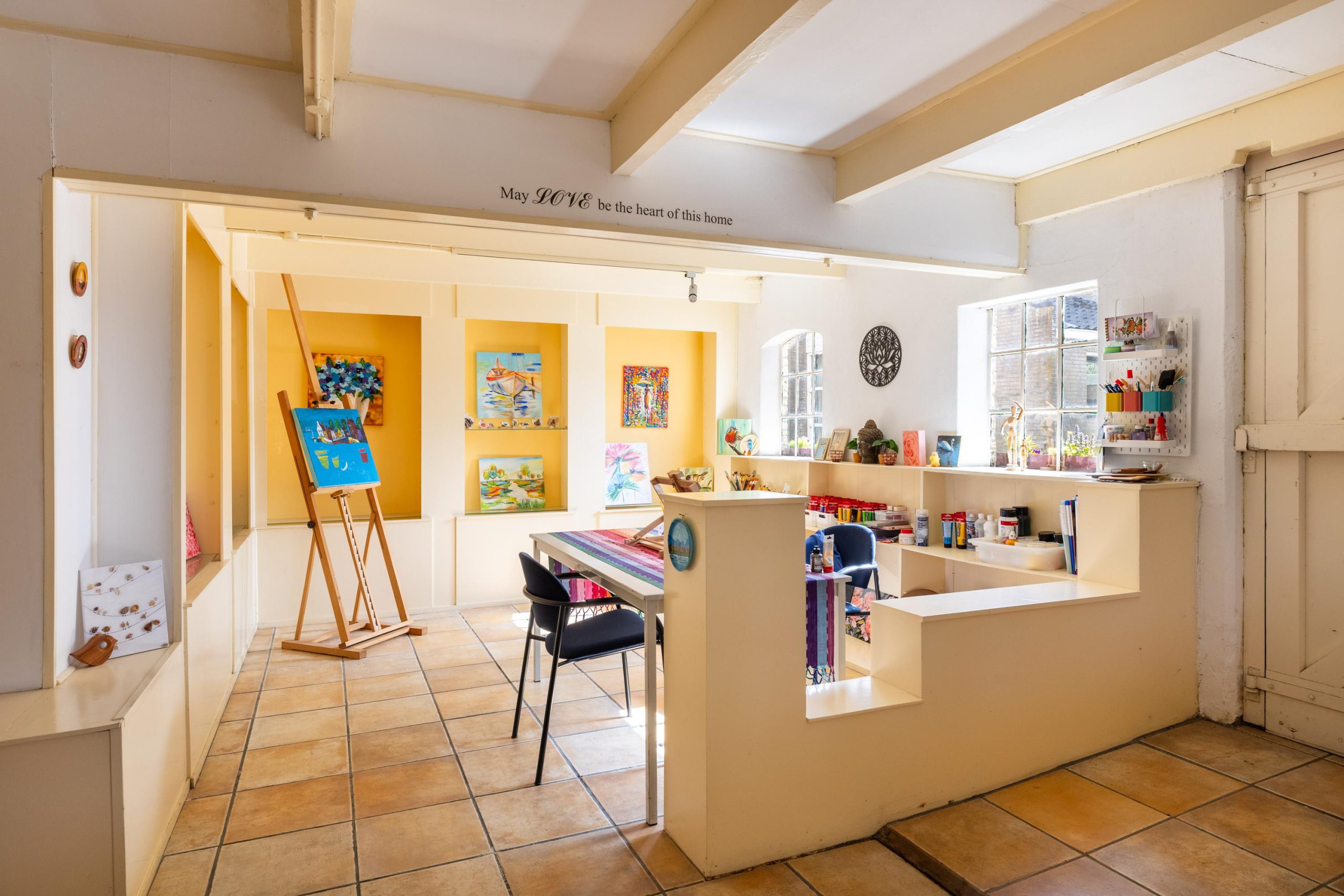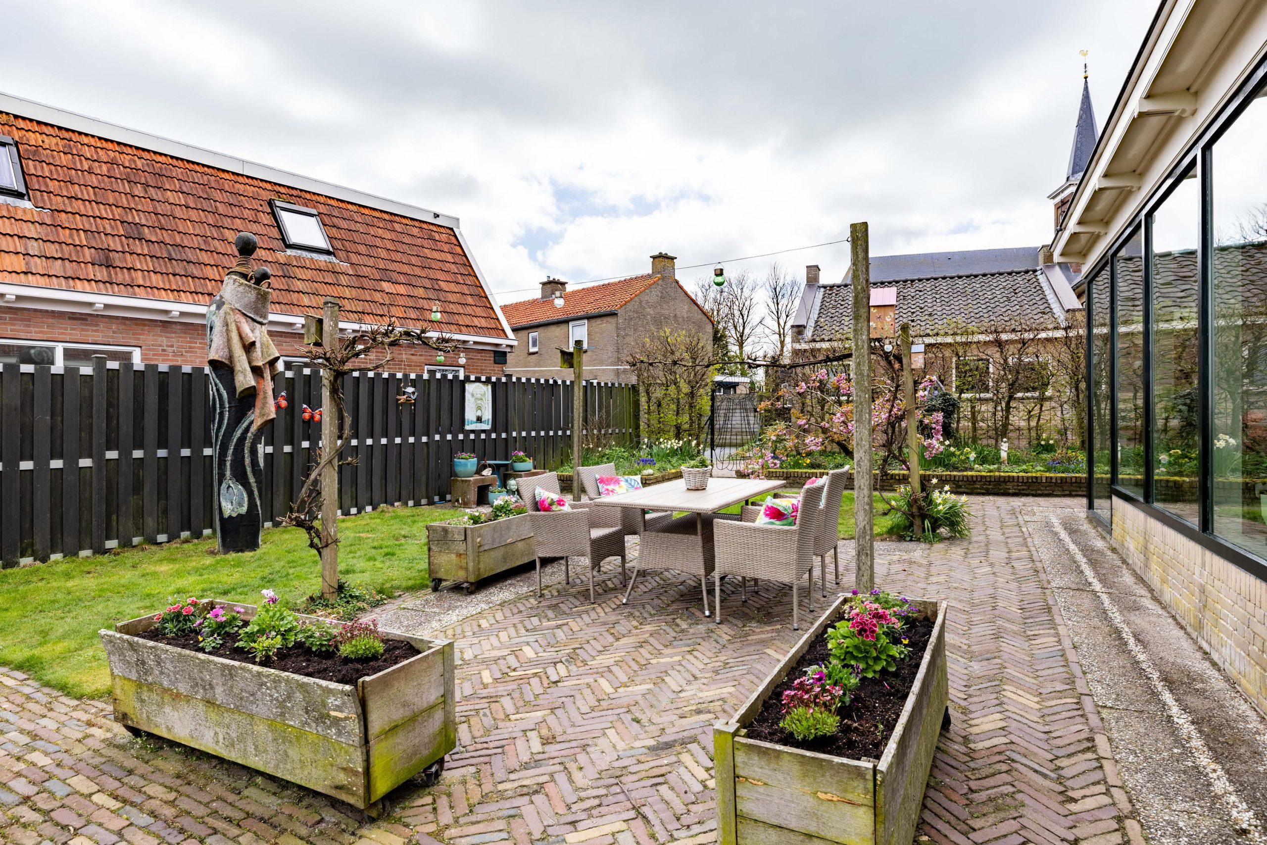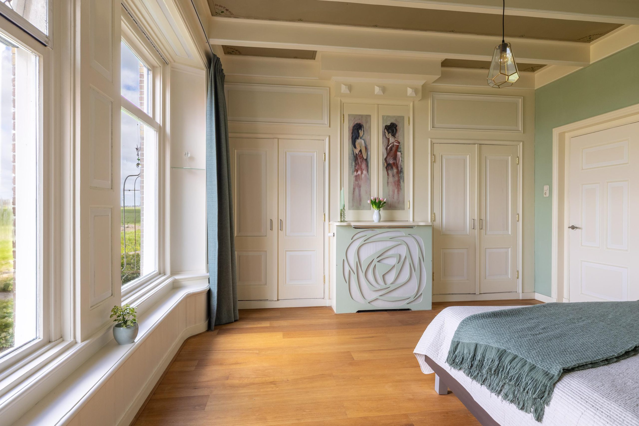 In de tuin zorgen drie bijzondere kunstwerken voor een speels en persoonlijk karakter, terwijl binnen unieke schilderingen op de kastdeuren het geheel een extra artistieke uitstraling geven.