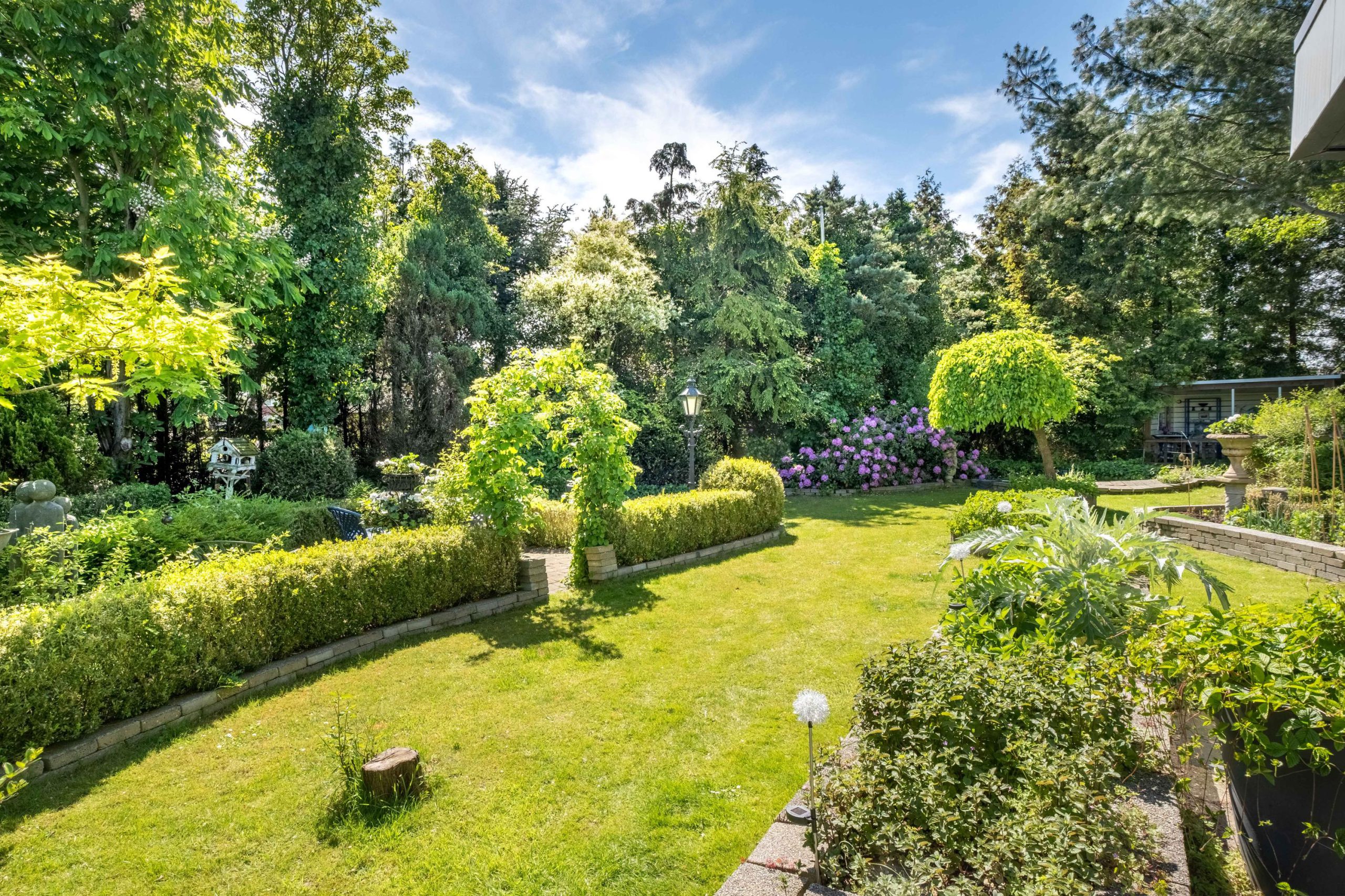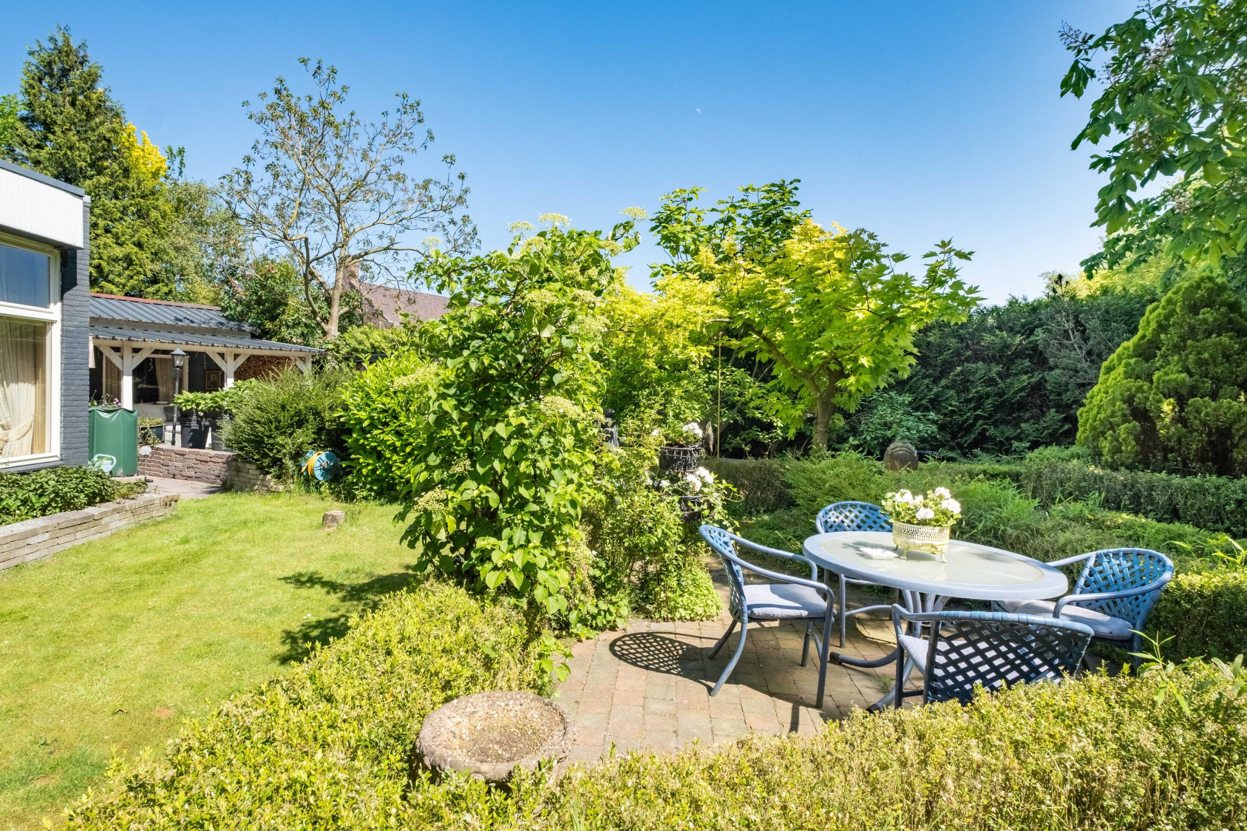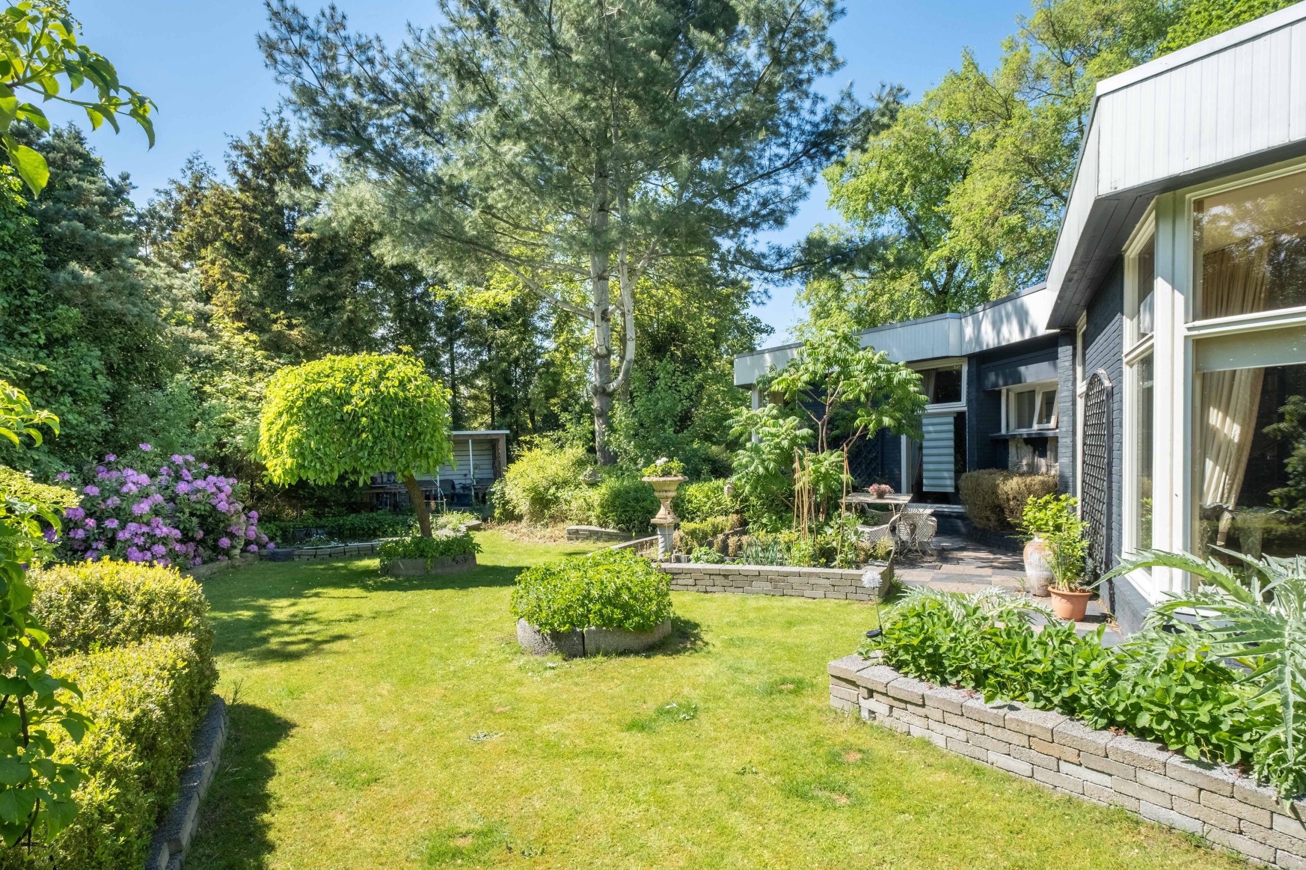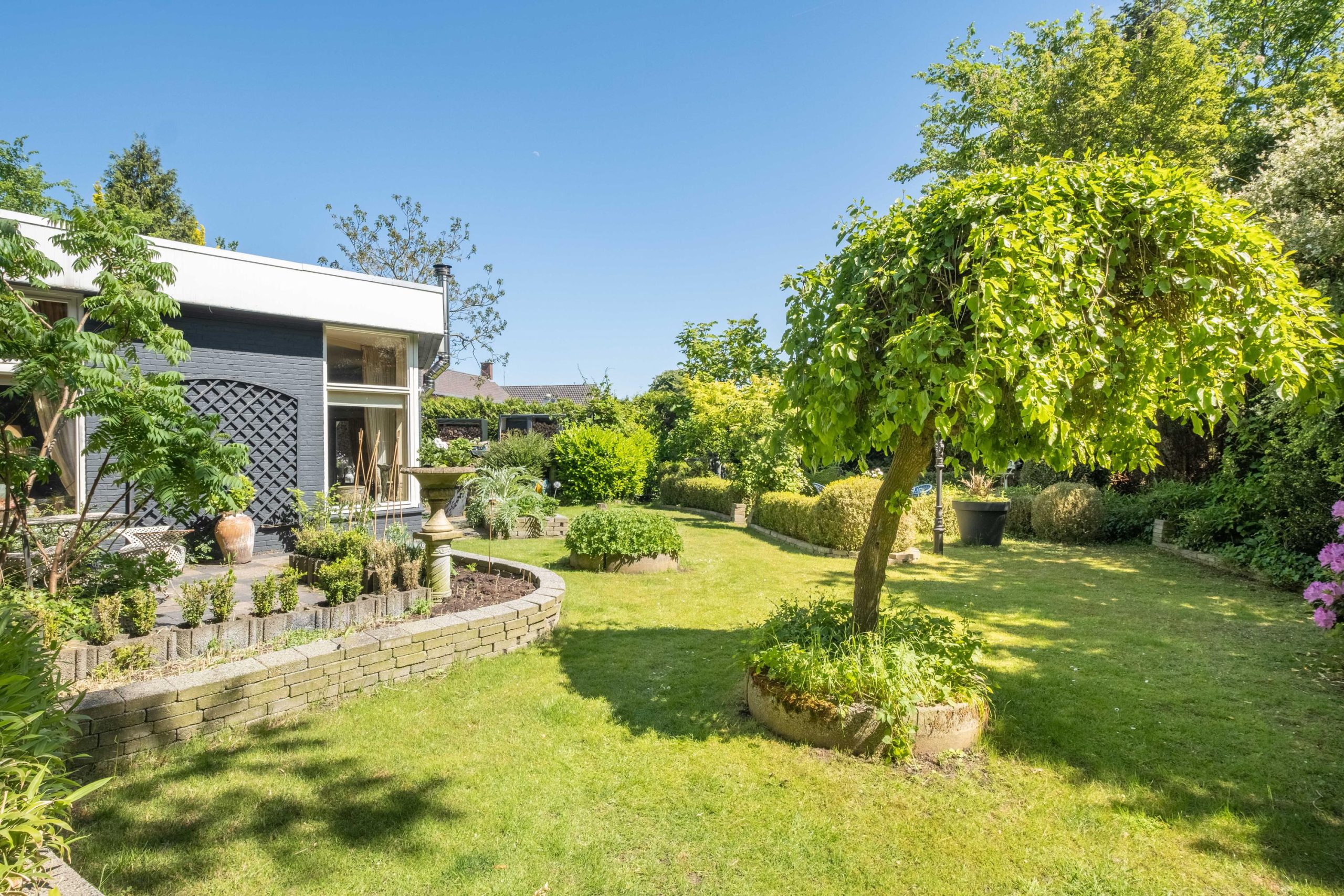 Het perceel van 1.420 m² biedt veel buitenruimte en privacy. De tuin ligt op het zuiden, met meerdere terrassen en een ruime grasweide – een fantastische speelplek voor kinderen. Er is bovendien voldoende ruimte om een zwembad aan te leggen of extra bijgebouwen te plaatsen. De tuin is groen, verzorgd en biedt altijd een plekje in de zon of schaduw.