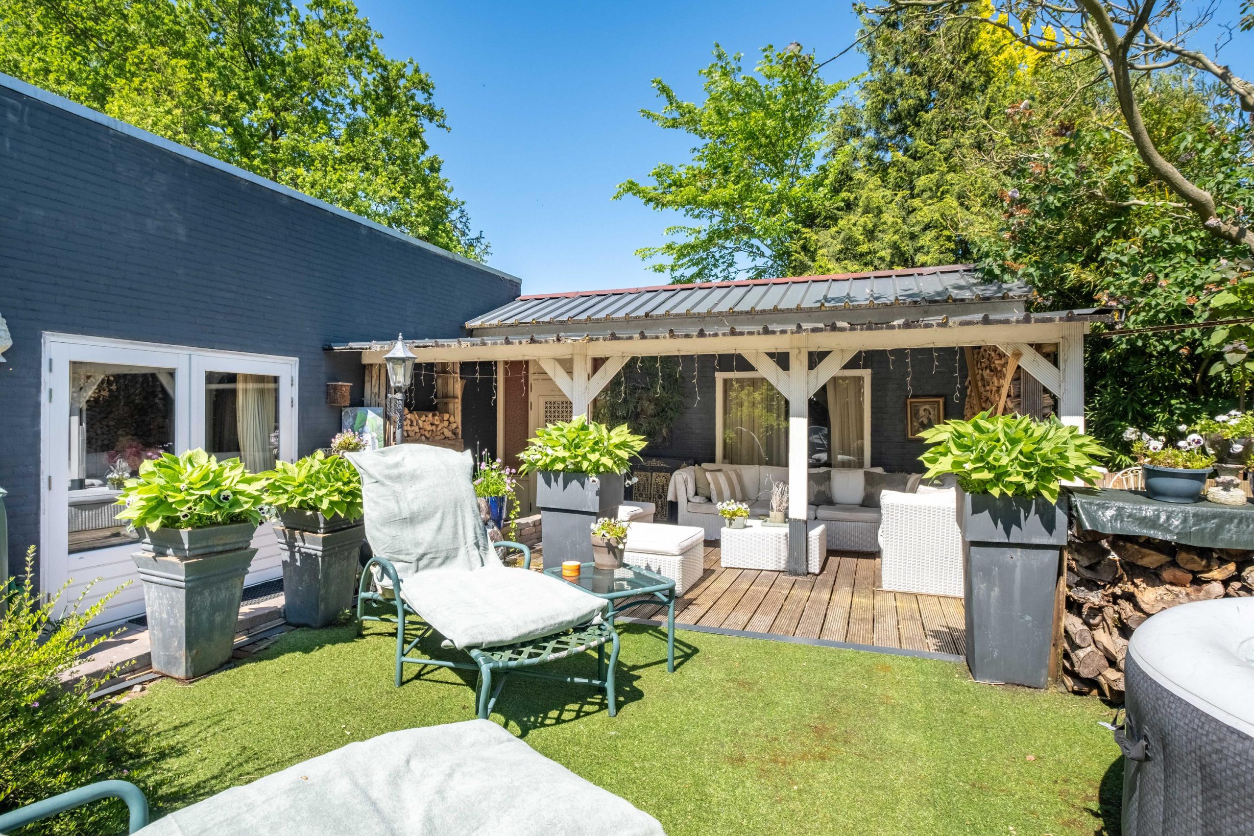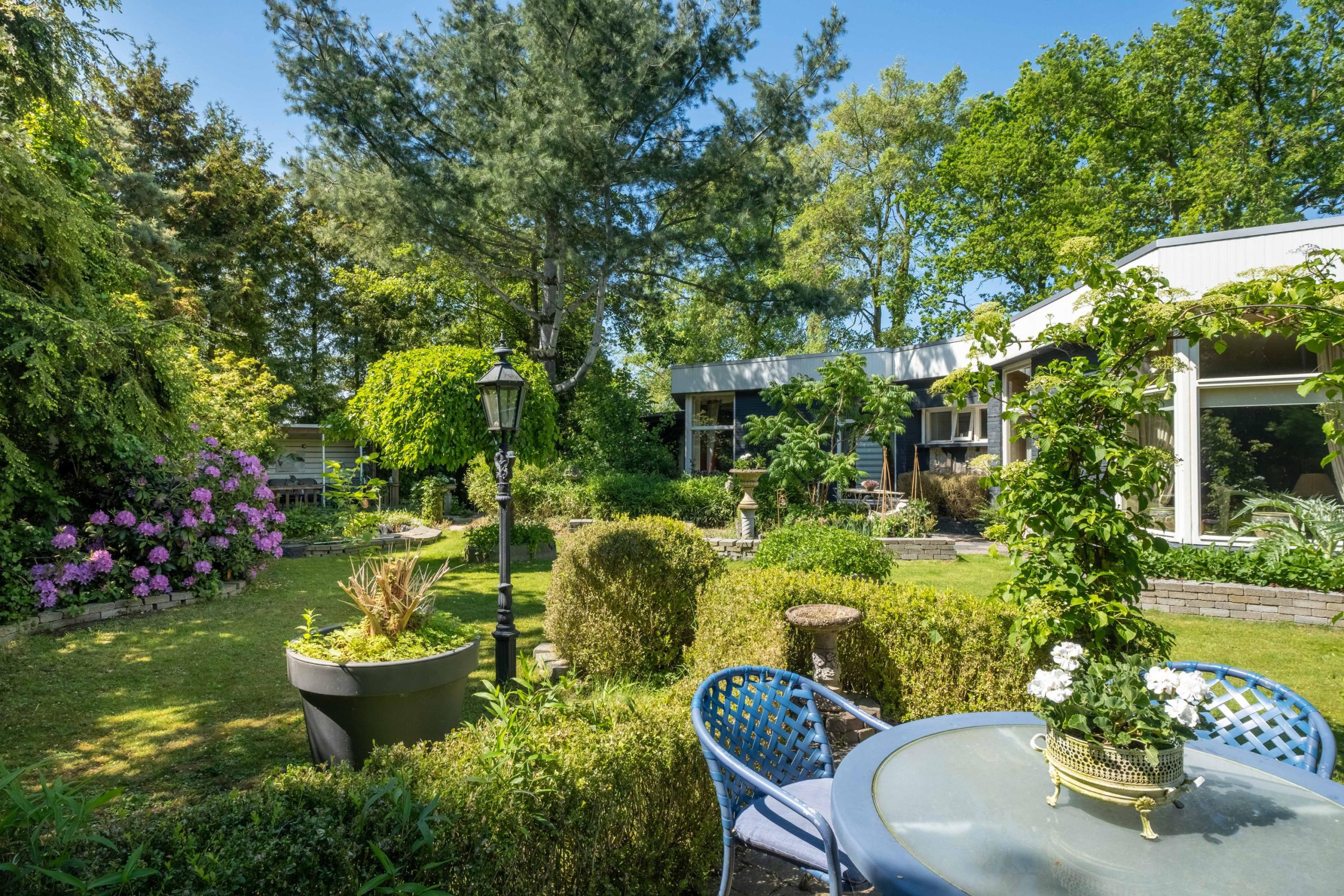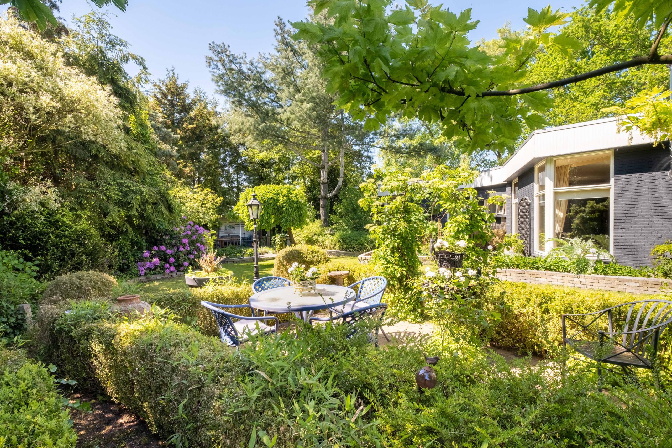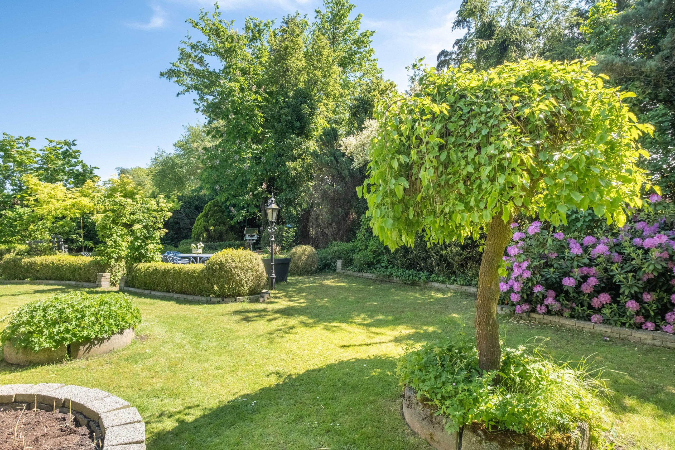Het perceel van 1.420 m² biedt veel buitenruimte en privacy. De tuin ligt op het zuiden, met meerdere terrassen en een ruime grasweide – een fantastische speelplek voor kinderen. Er is bovendien voldoende ruimte om een zwembad aan te leggen of extra bijgebouwen te plaatsen. De tuin is groen, verzorgd en biedt altijd een plekje in de zon of schaduw.