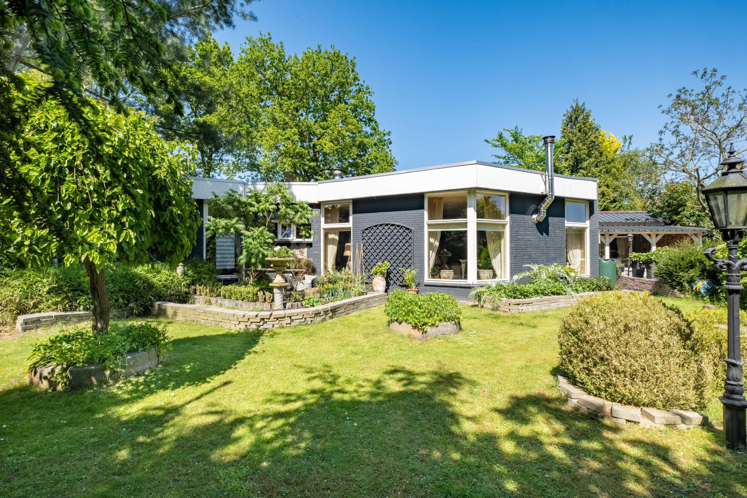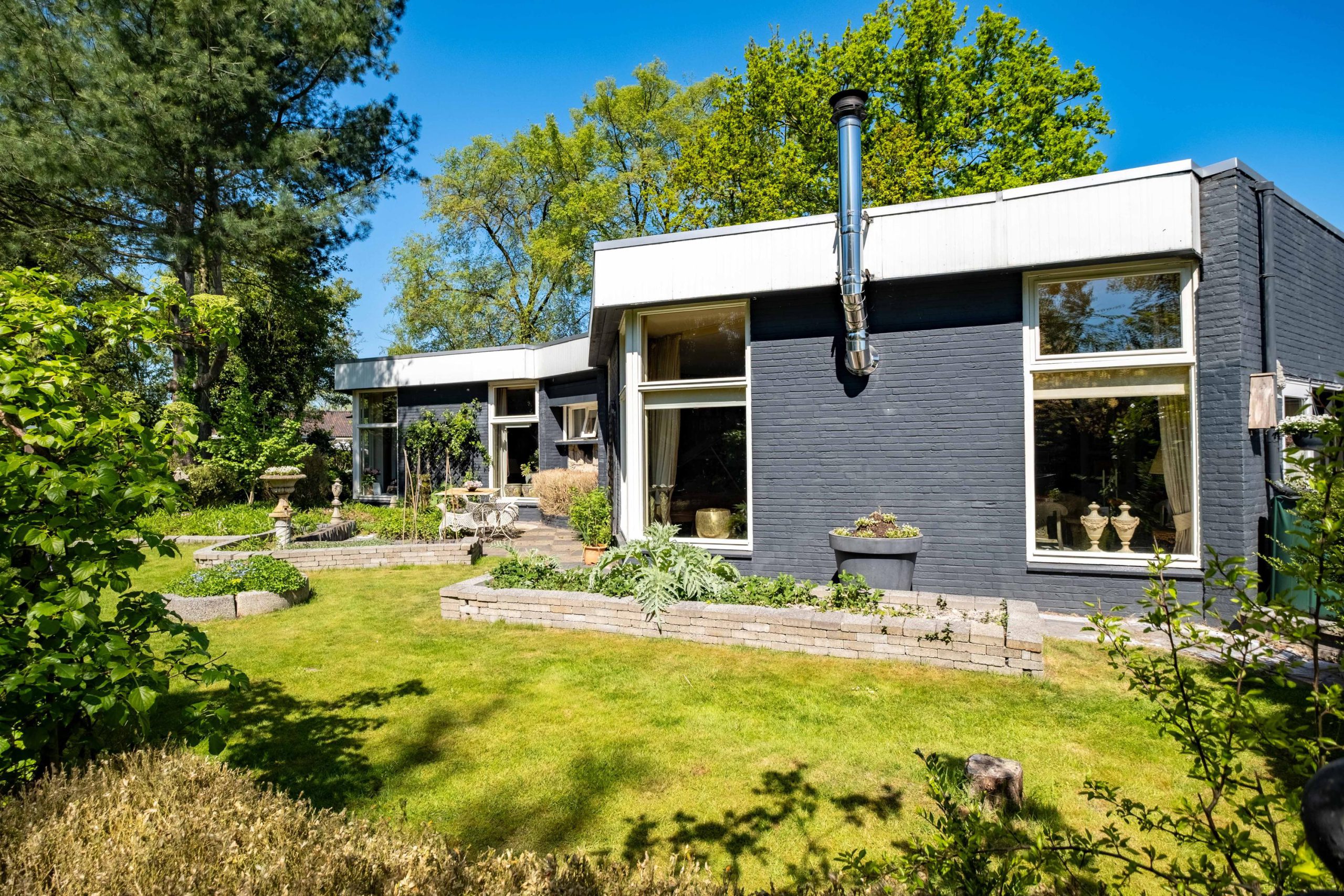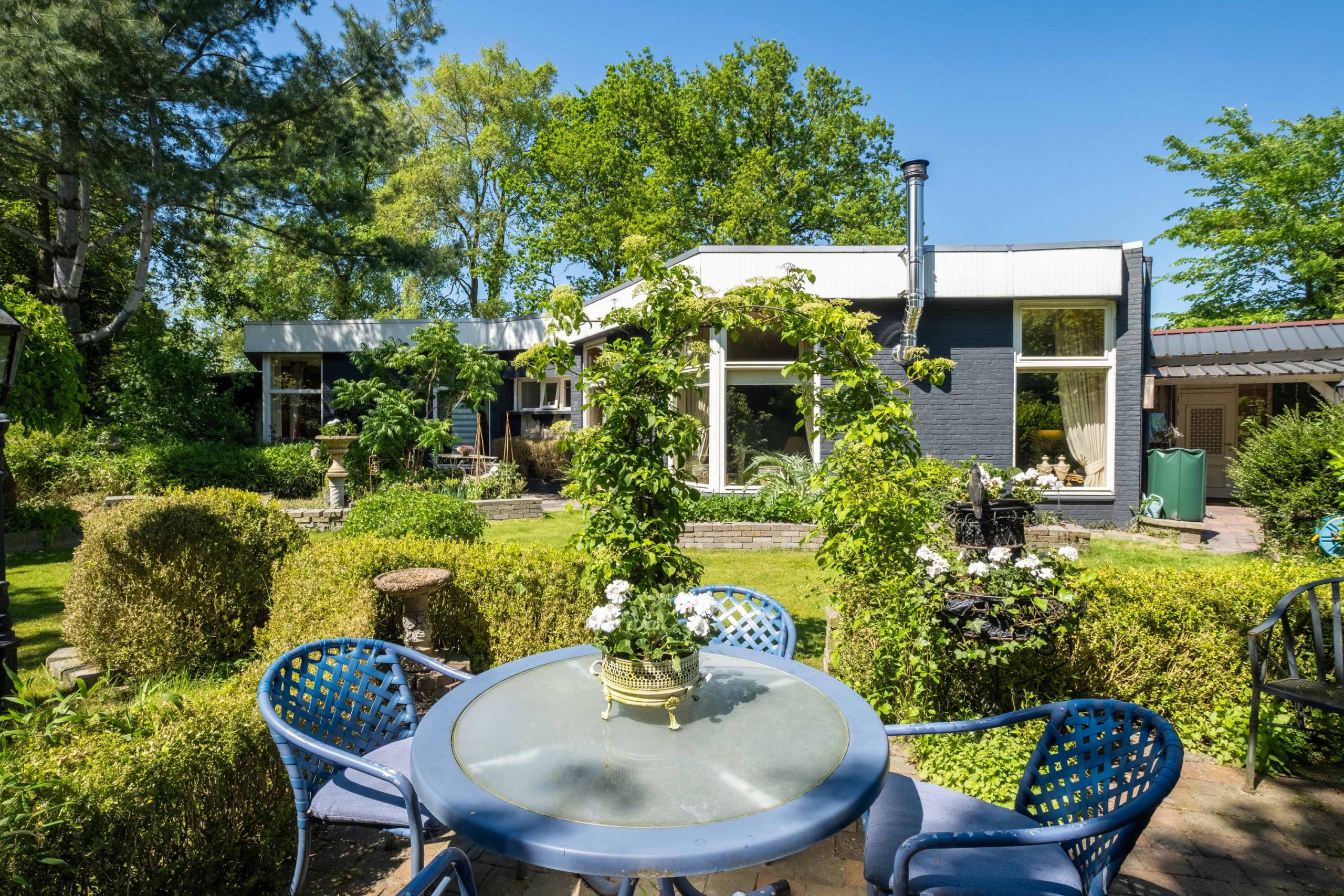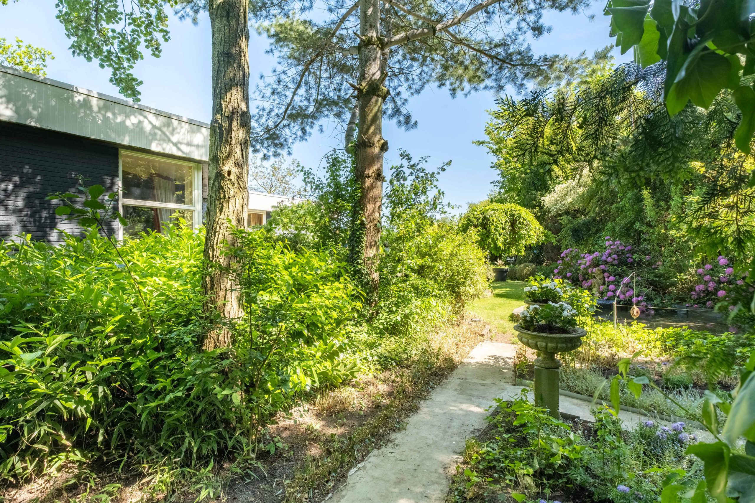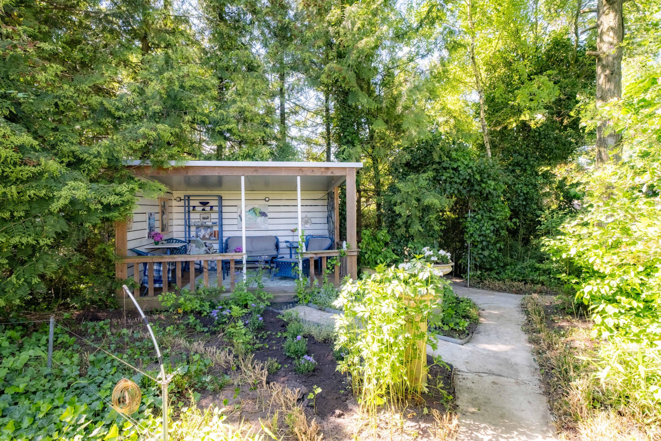 Het perceel van 1.420 m² biedt veel buitenruimte en privacy. De tuin ligt op het zuiden, met meerdere terrassen en een ruime grasweide – een fantastische speelplek voor kinderen. Er is bovendien voldoende ruimte om een zwembad aan te leggen of extra bijgebouwen te plaatsen. De tuin is groen, verzorgd en biedt altijd een plekje in de zon of schaduw.