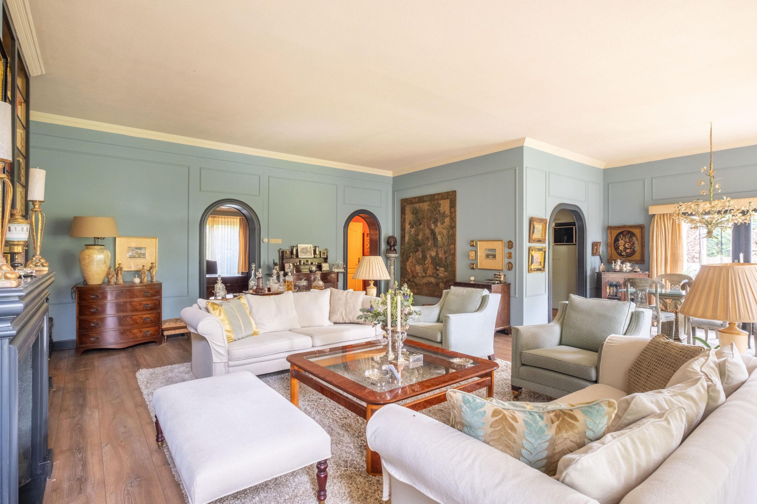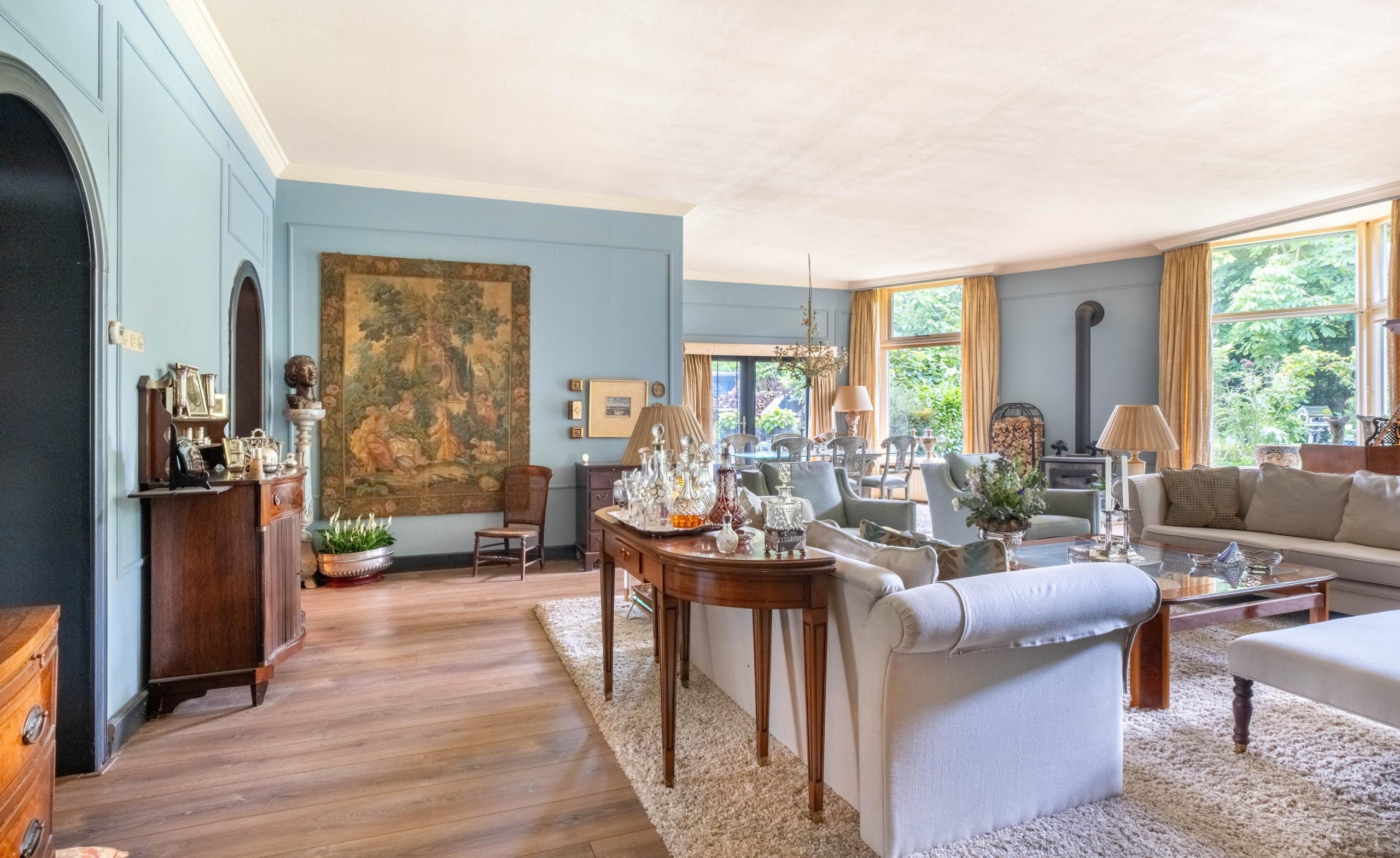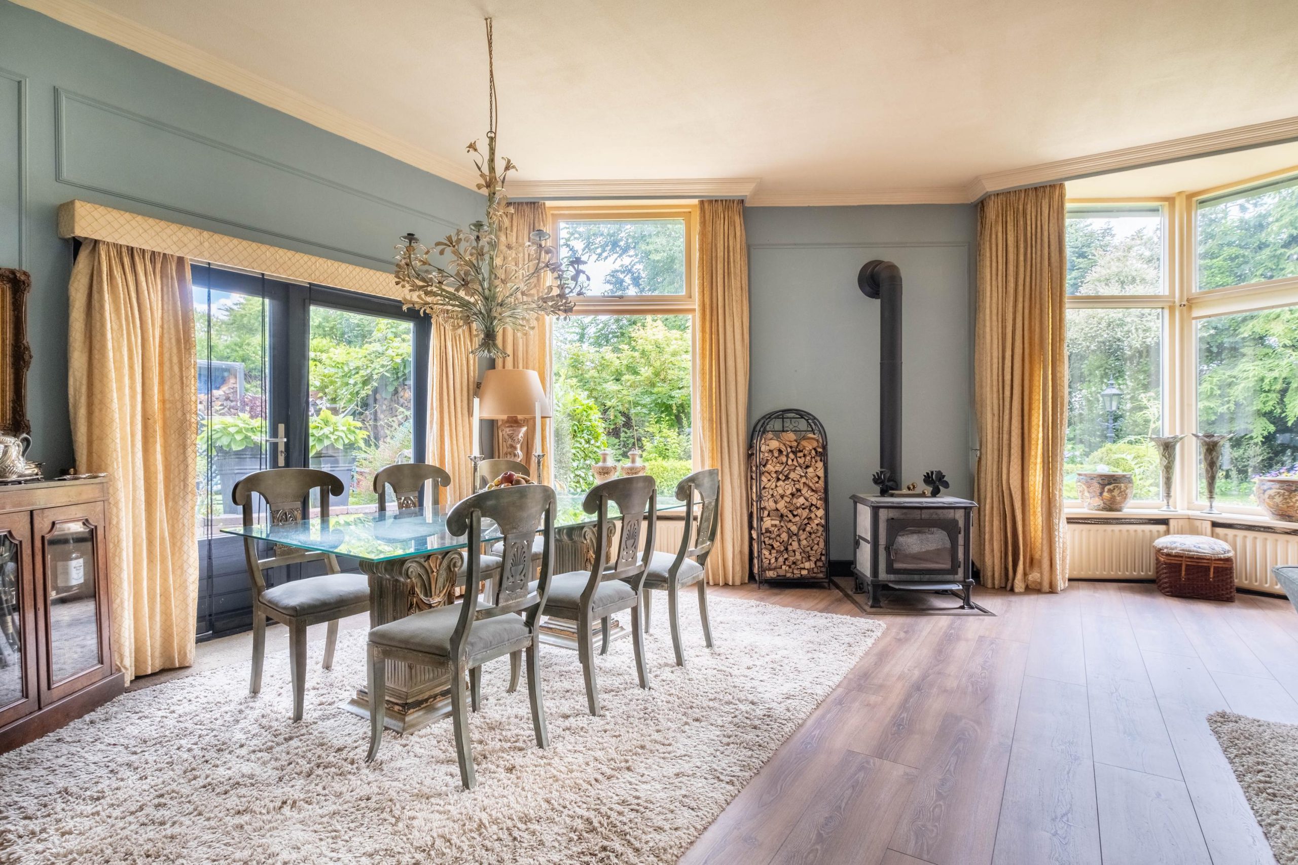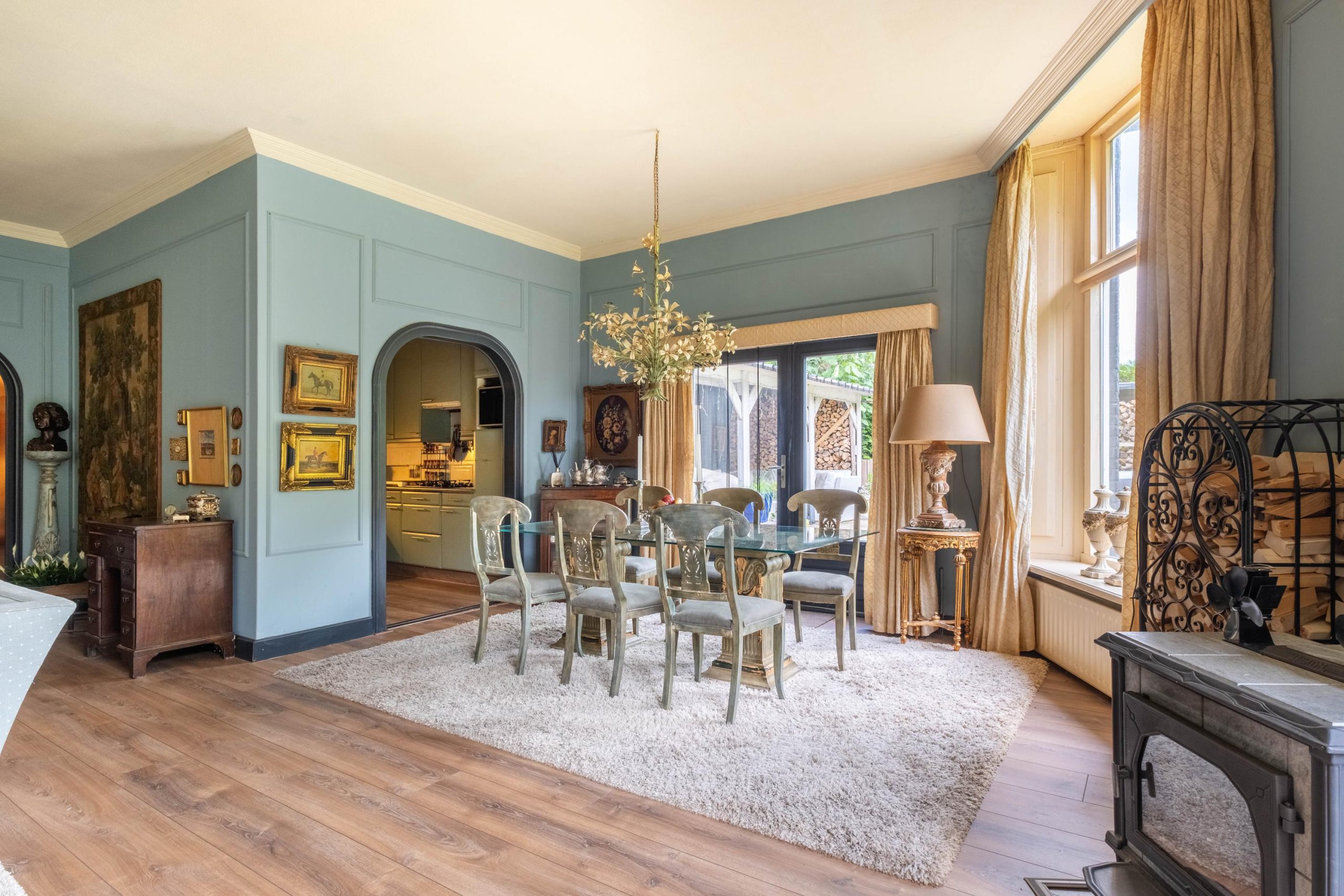 Binnen tref je een royale, goed onderhouden woning met meerdere leefruimtes. Grote raampartijen zorgen voor een lichte en open sfeer. De woonkamer biedt volop ruimte voor een royale zithoek en eettafel, met zicht op de tuin. De keuken is gezellig en voorzien van de nodige apparatuur – een fijne plek om te koken en samen te eten, zonder overdadige luxe.