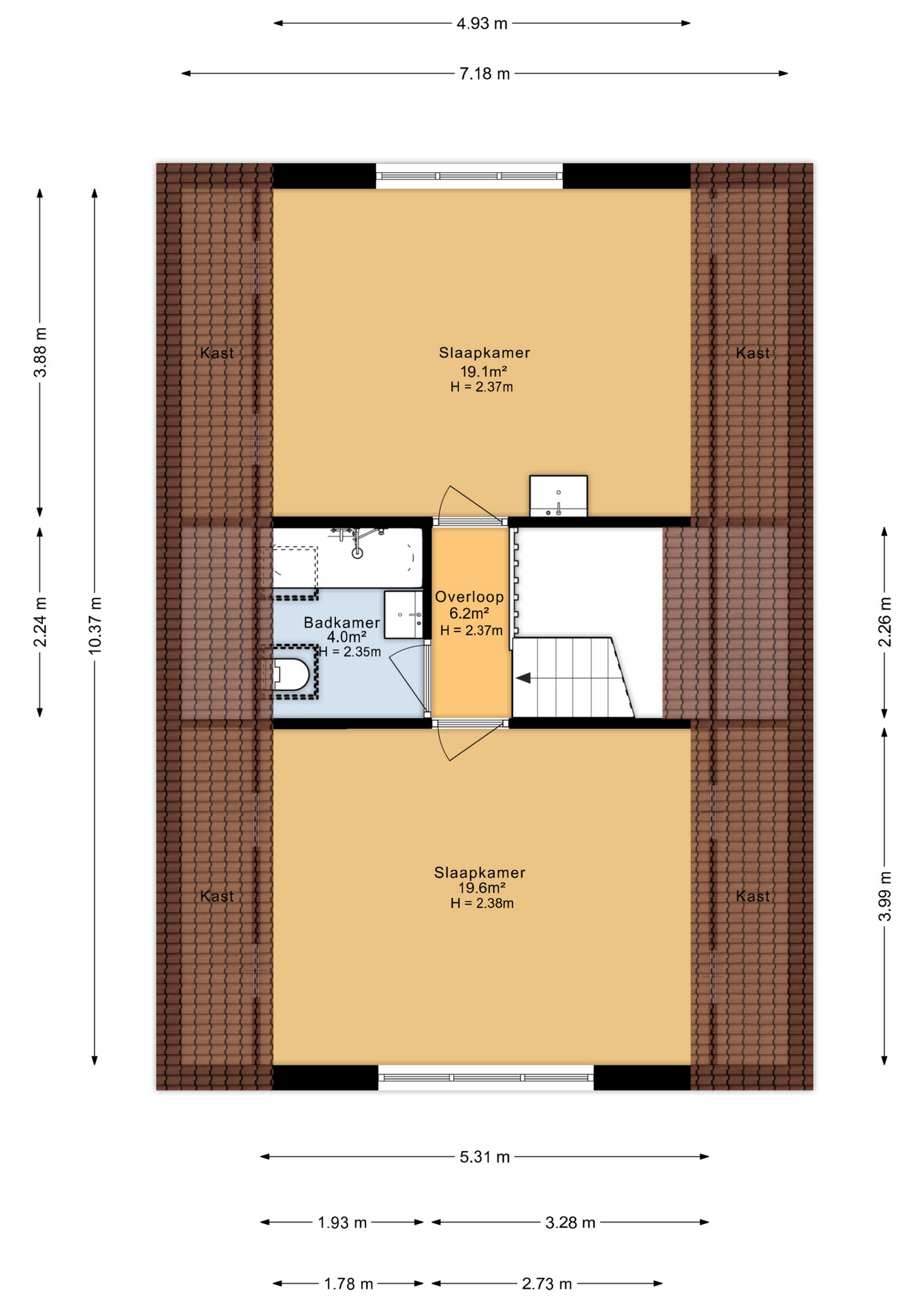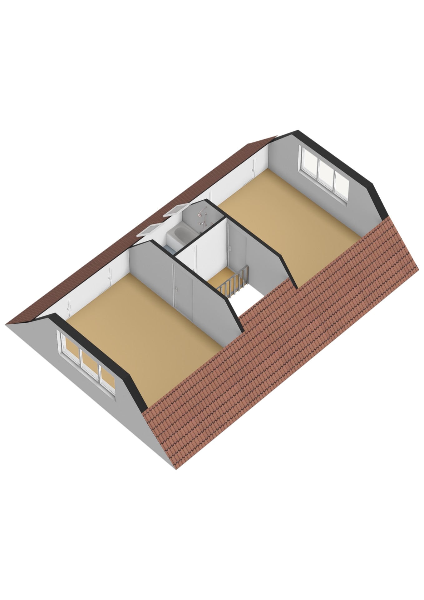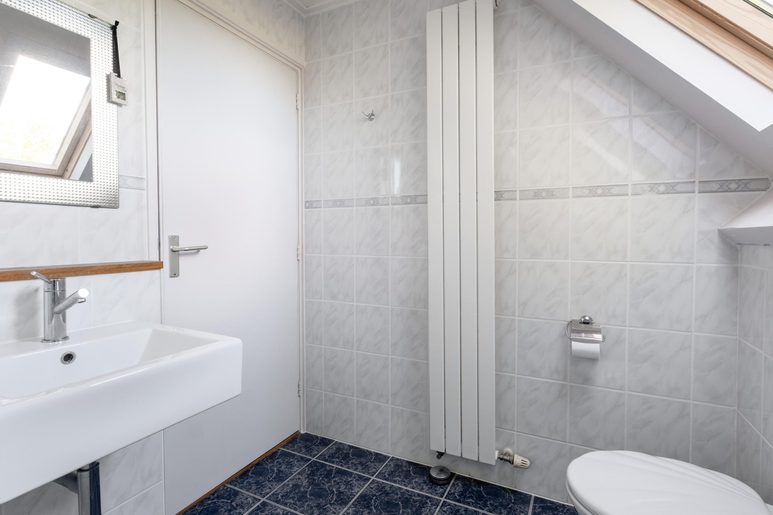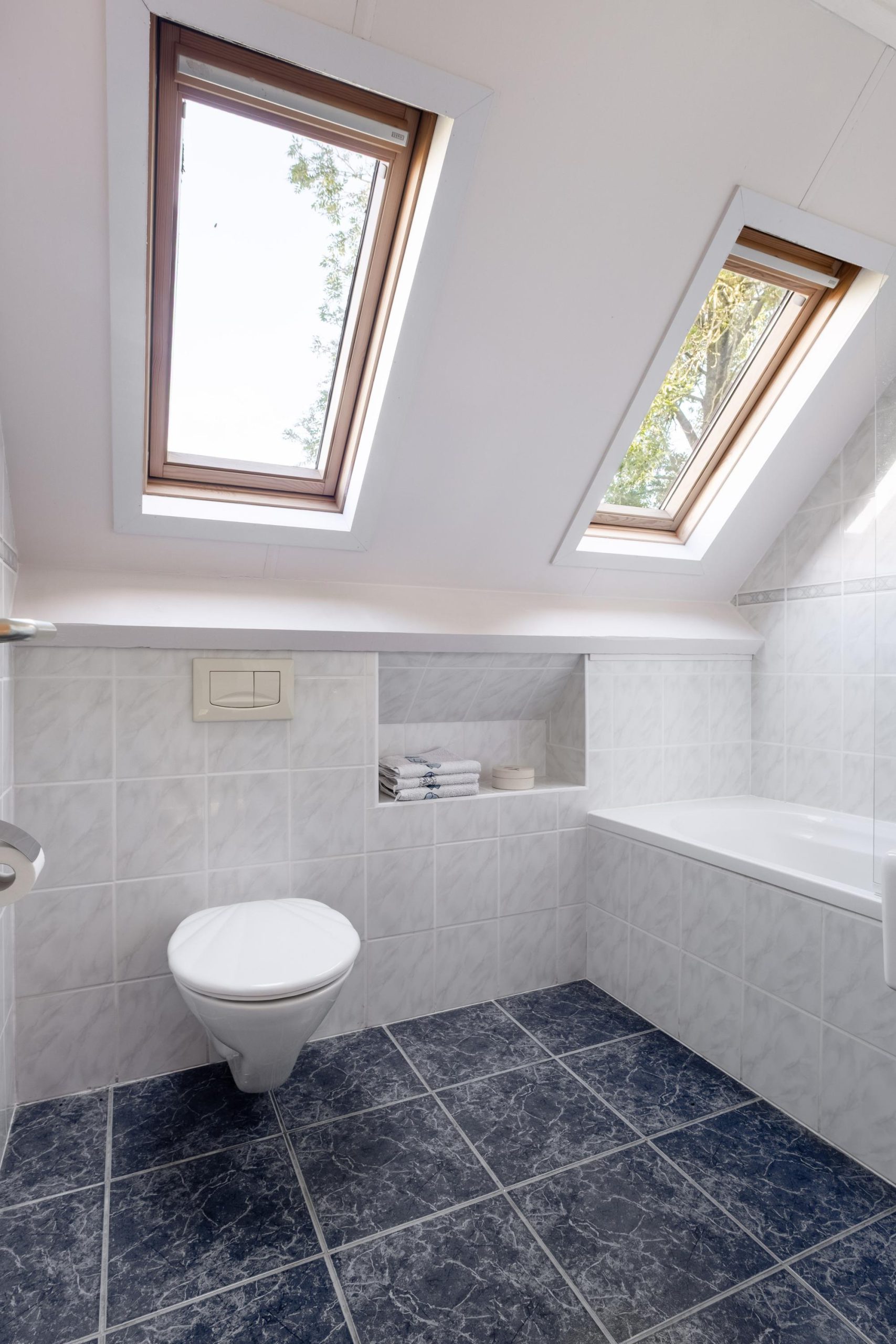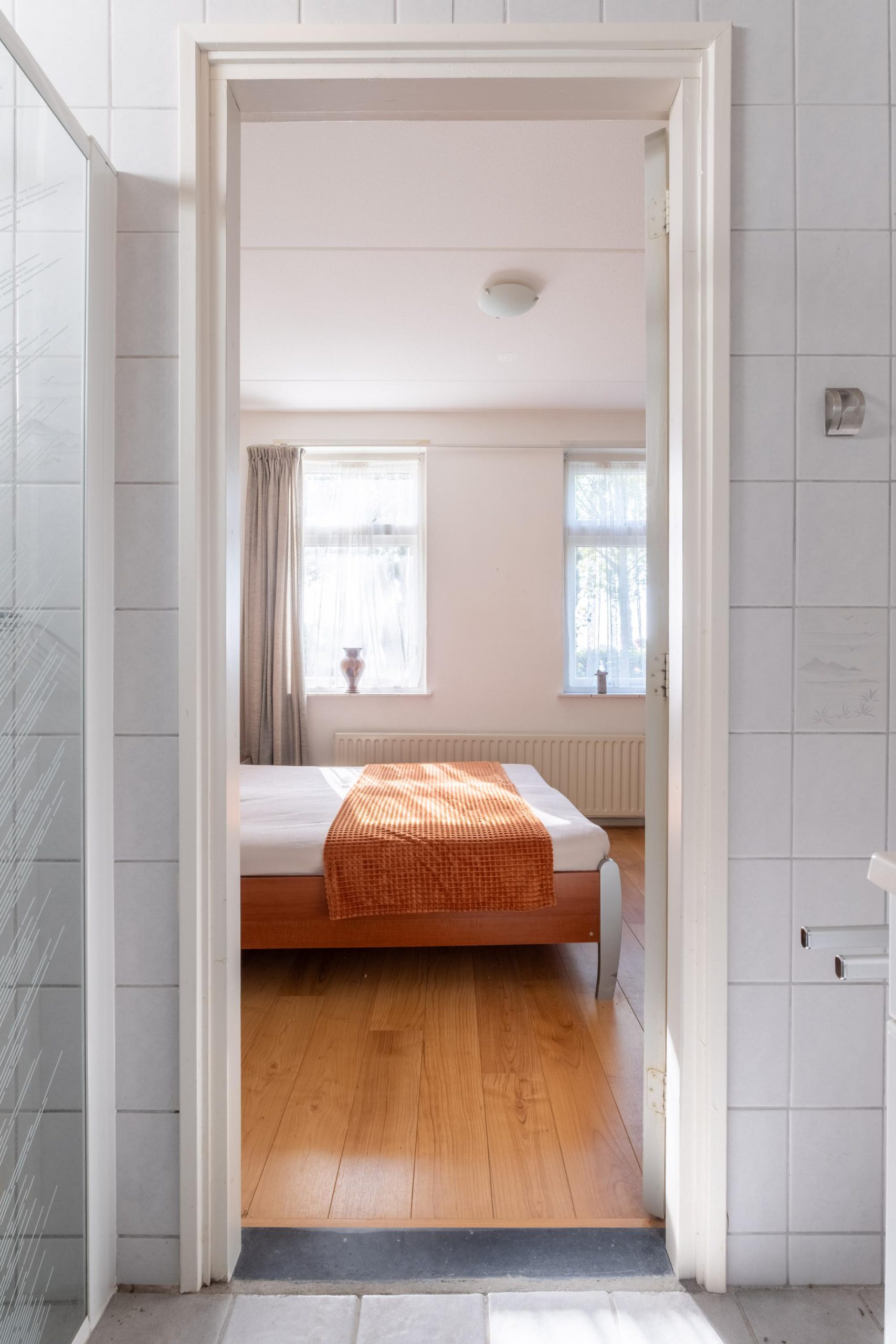 Boven word je verrast door de ruimte. Hier liggen twee grote slaapkamers, beide bijna 20 m² groot. Ze lenen zich uitstekend om te splitsen, bijvoorbeeld tot vier slaapkamers, zeker met een dakkapel. De verdieping heeft bovendien een tweede badkamer, compleet met ligbad/douche, wastafel, toilet en een dakraam voor prettig daglicht.