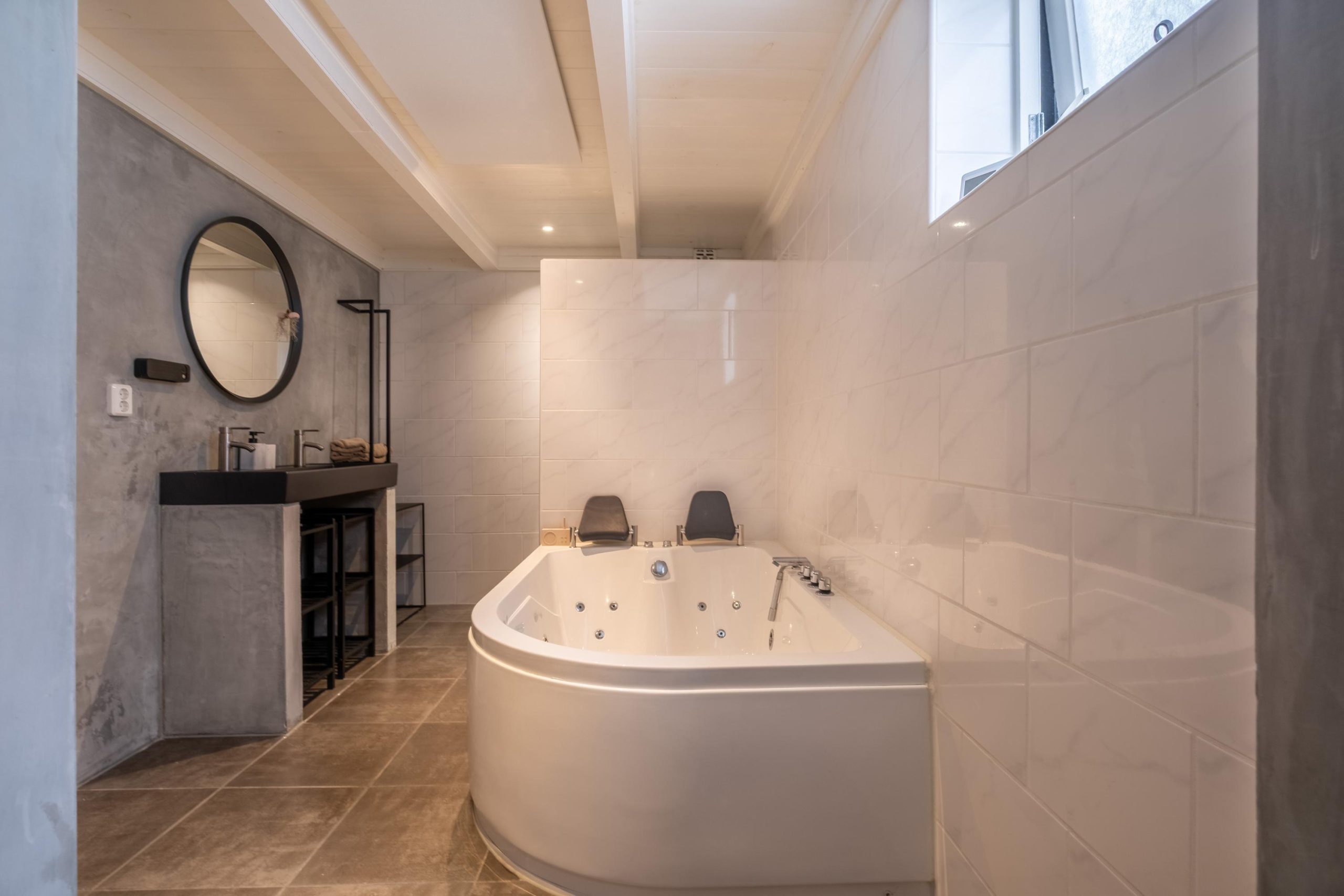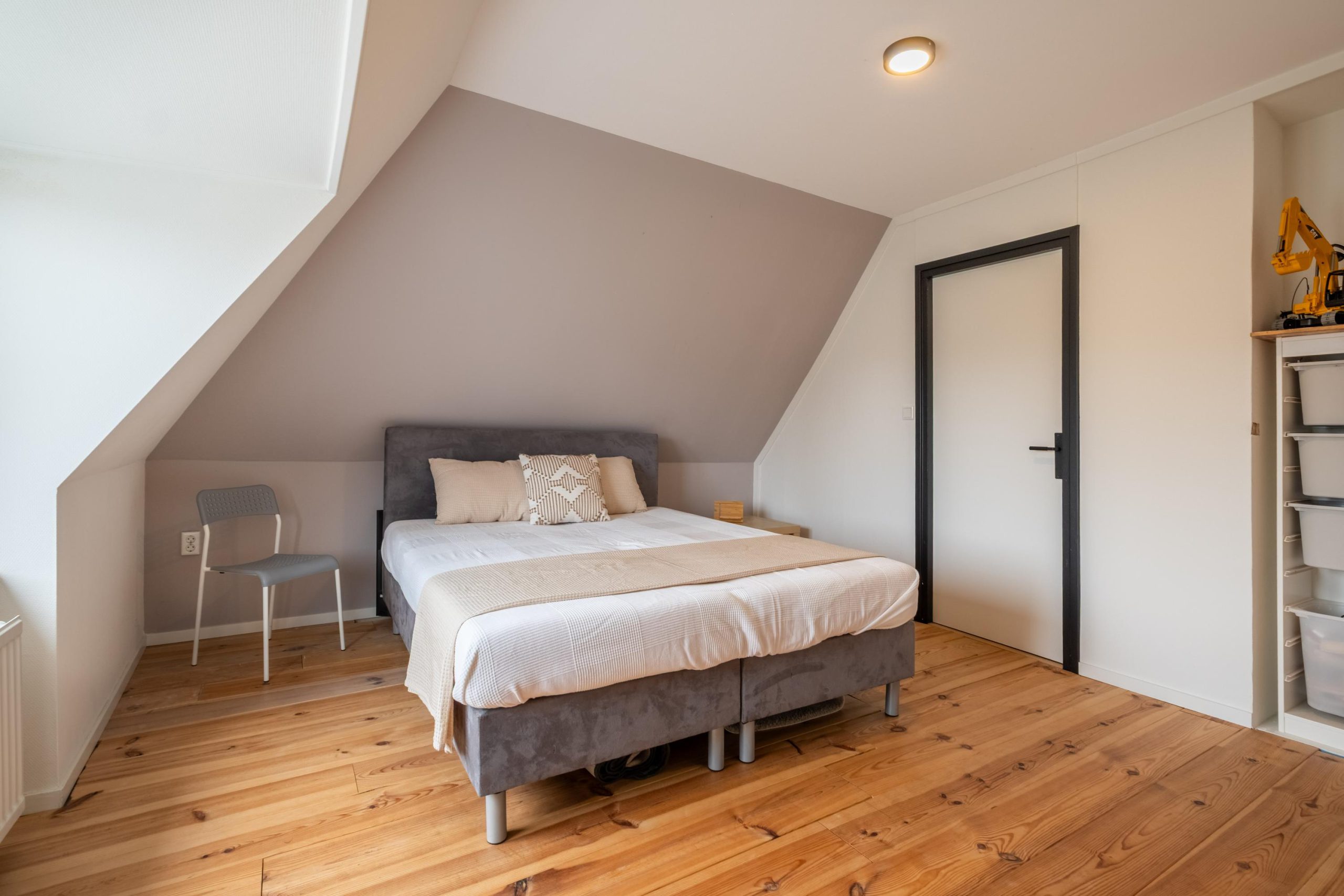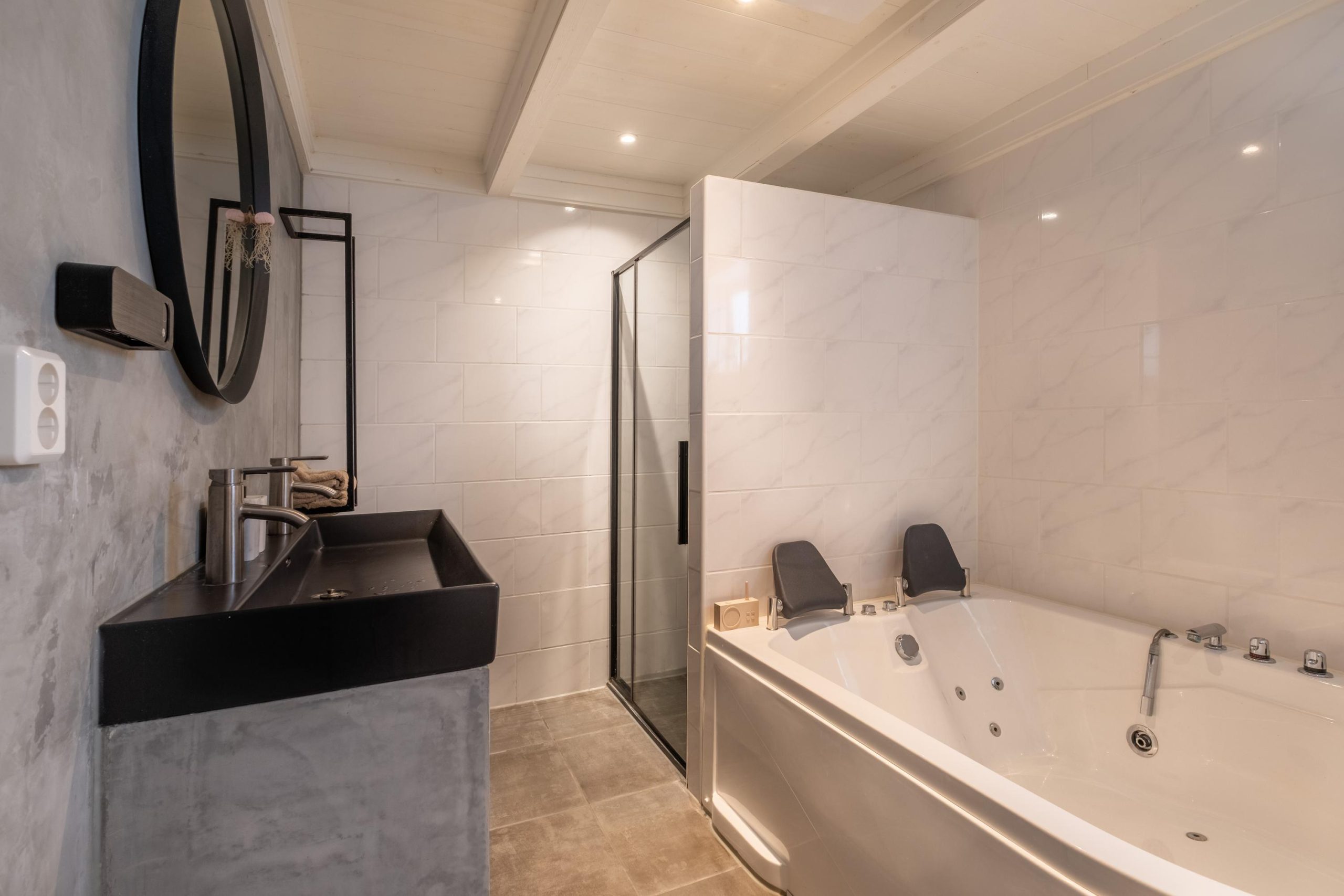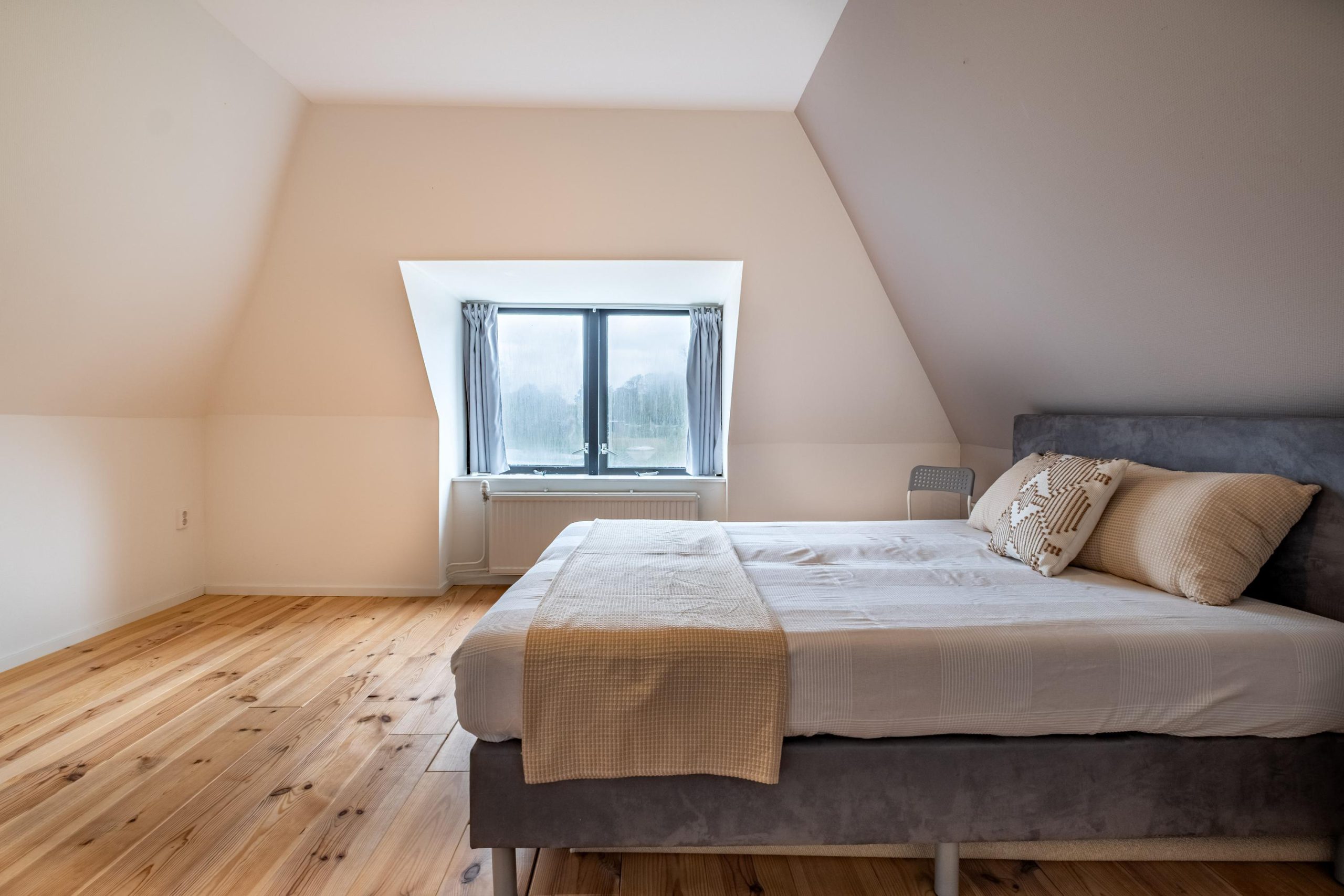 Achter de keuken bevinden zich twee verrassingen: een royale slaapkamer van bijna 14 m² met uitzicht op de tuin en een prachtige, moderne badkamer (2020) van ruim 9 m² met whirlpoolbad, dubbele wastafel, regendouche én toilet. Alles afgewerkt met sfeervolle houten balkenplafonds. Dankzij deze indeling is gelijkvloers wonen hier perfect mogelijk — comfortabel, stijlvol en toekomstbestendig.