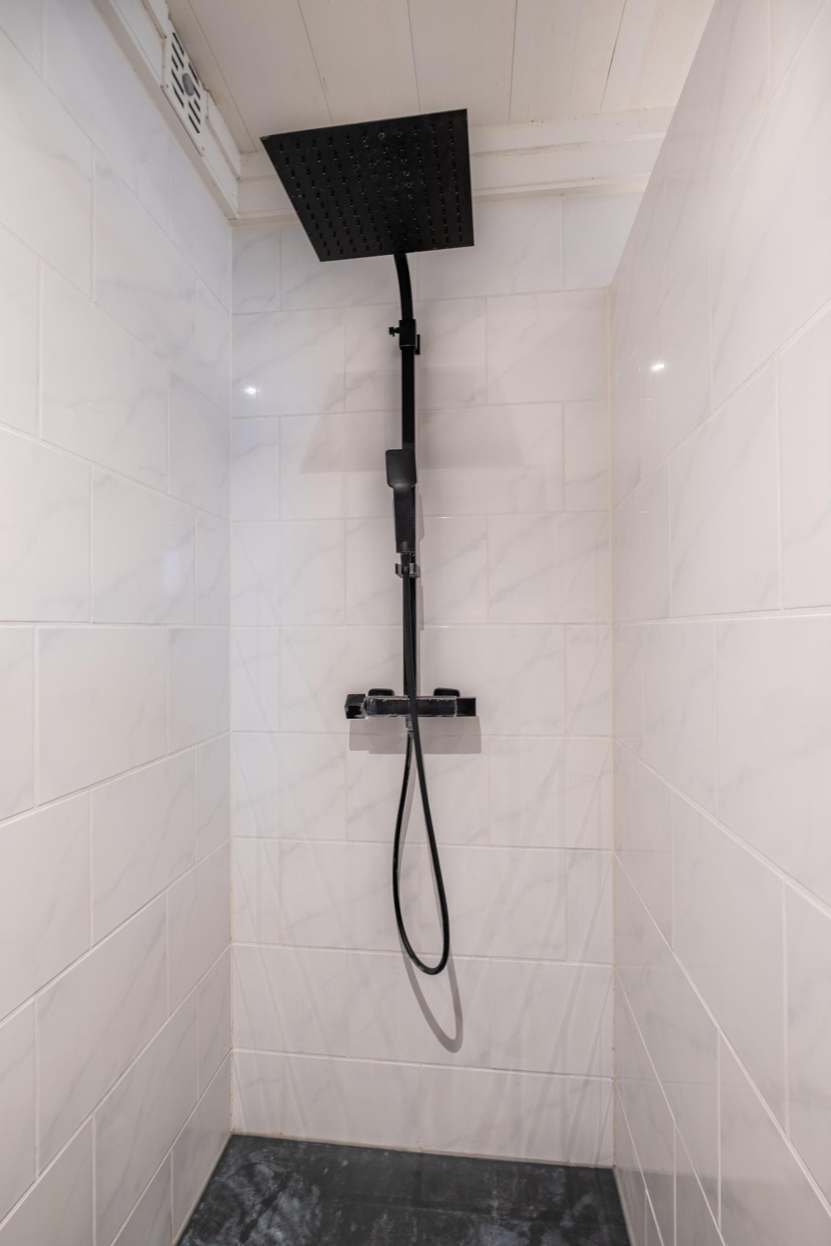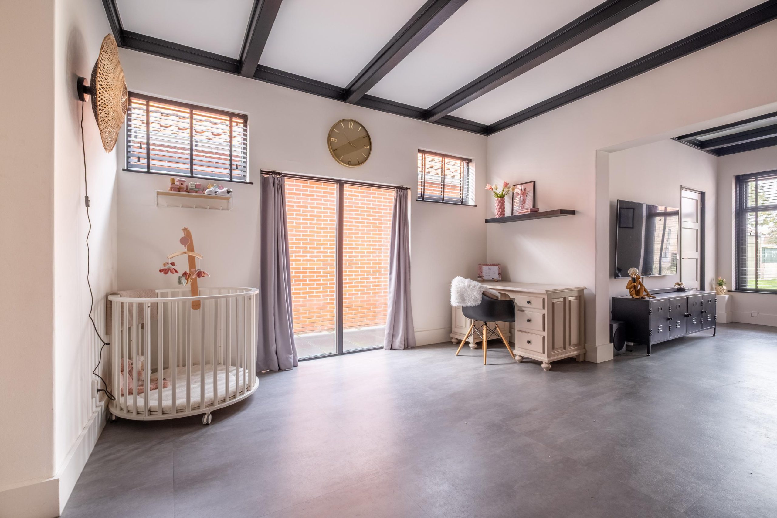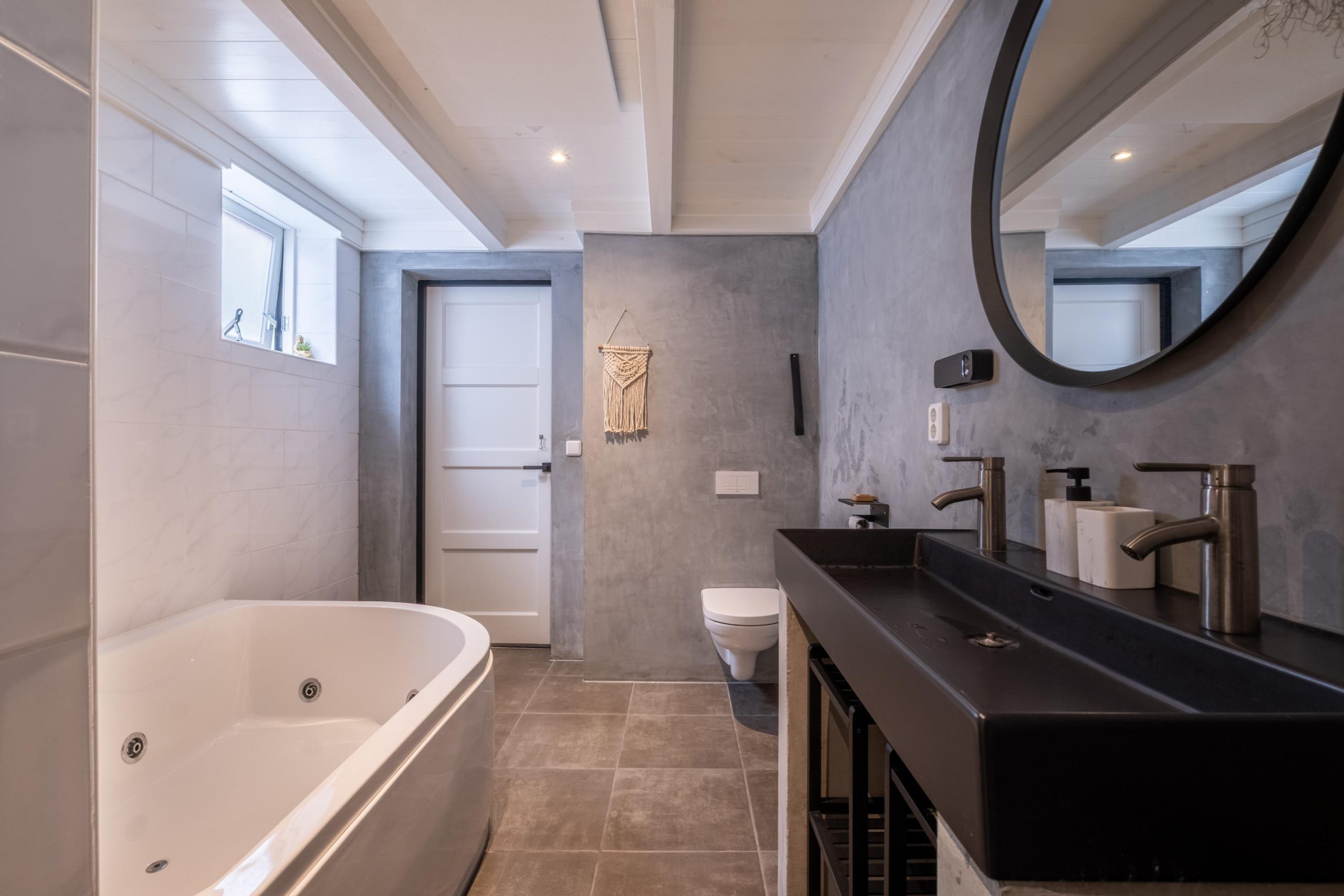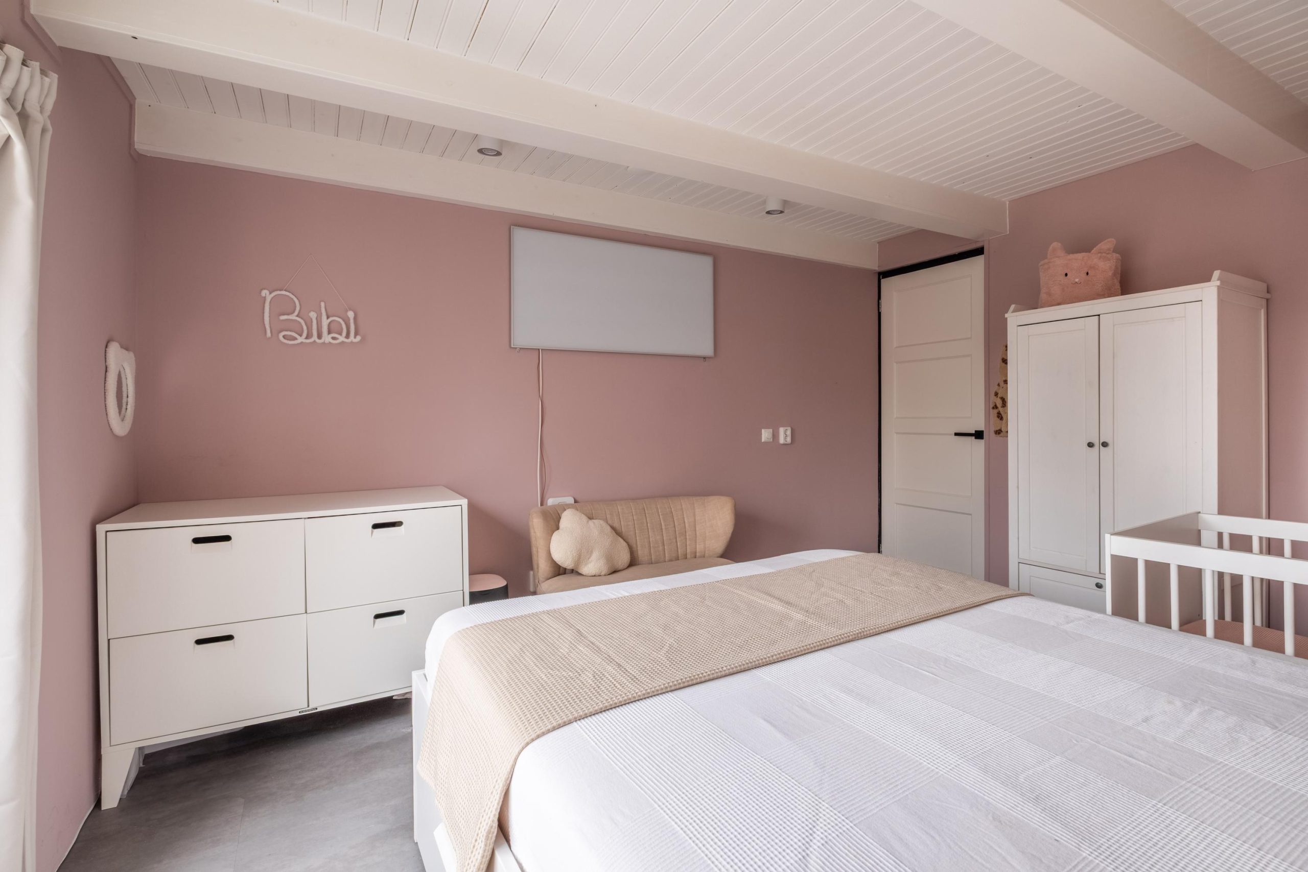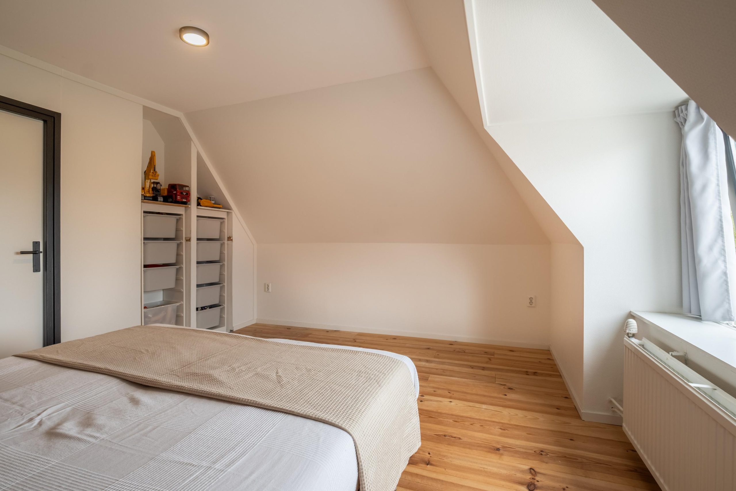 Achter de keuken bevinden zich twee verrassingen: een royale slaapkamer van bijna 14 m² met uitzicht op de tuin en een prachtige, moderne badkamer (2020) van ruim 9 m² met whirlpoolbad, dubbele wastafel, regendouche én toilet. Alles afgewerkt met sfeervolle houten balkenplafonds. Dankzij deze indeling is gelijkvloers wonen hier perfect mogelijk — comfortabel, stijlvol en toekomstbestendig.