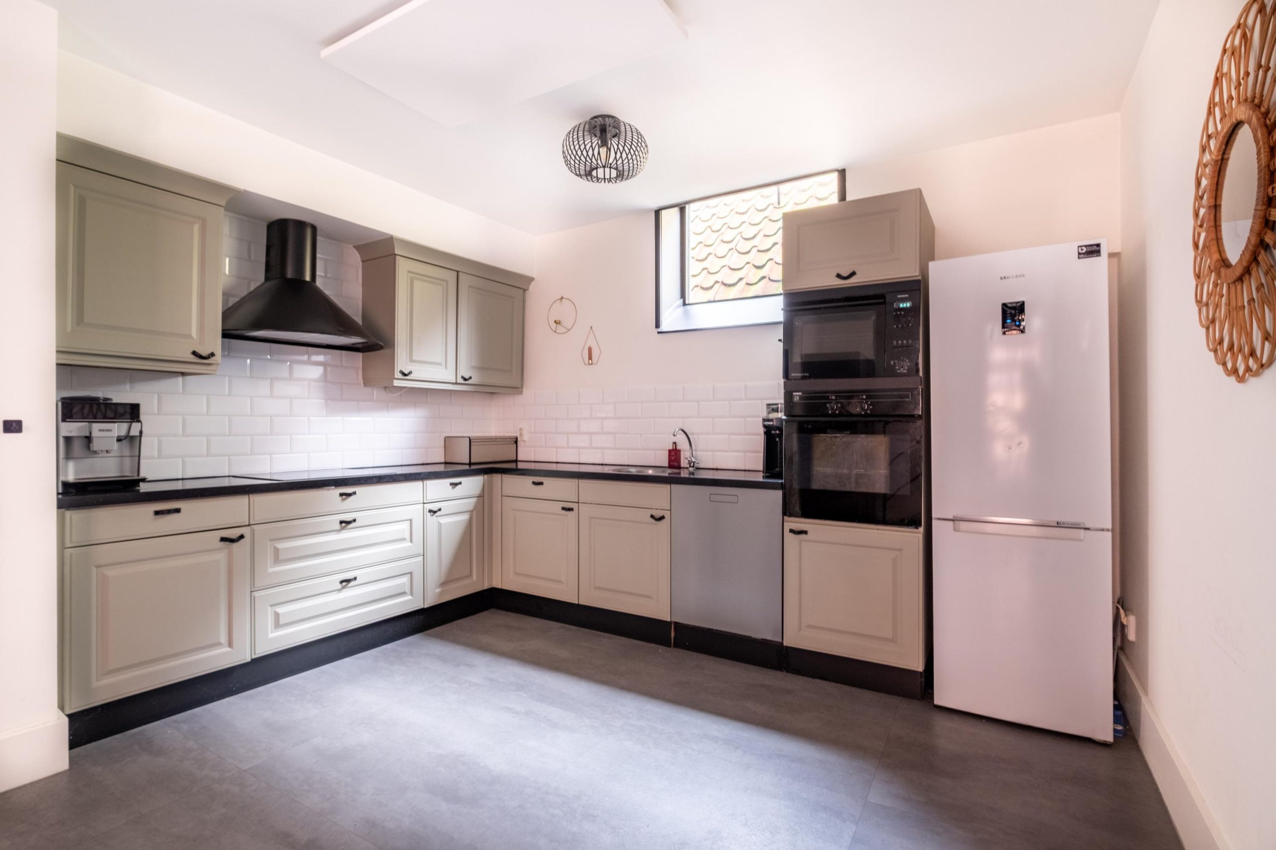 De leefruimte is opgedeeld in drie open zones die naadloos in elkaar overlopen: een gezellige zithoek aan de voorzijde, een lichte eethoek met raam tot aan de grond in de zijgevel, en de nette keuken met nieuwe vaatwasser (2025). De stijlvolle zwarte open trap vormt hier een echte blikvanger. Dankzij de PVC-vloer met vloerverwarming (2021) voelt alles warm en comfortabel aan, terwijl de balkenplafonds karakter geven aan de ruimtes.
