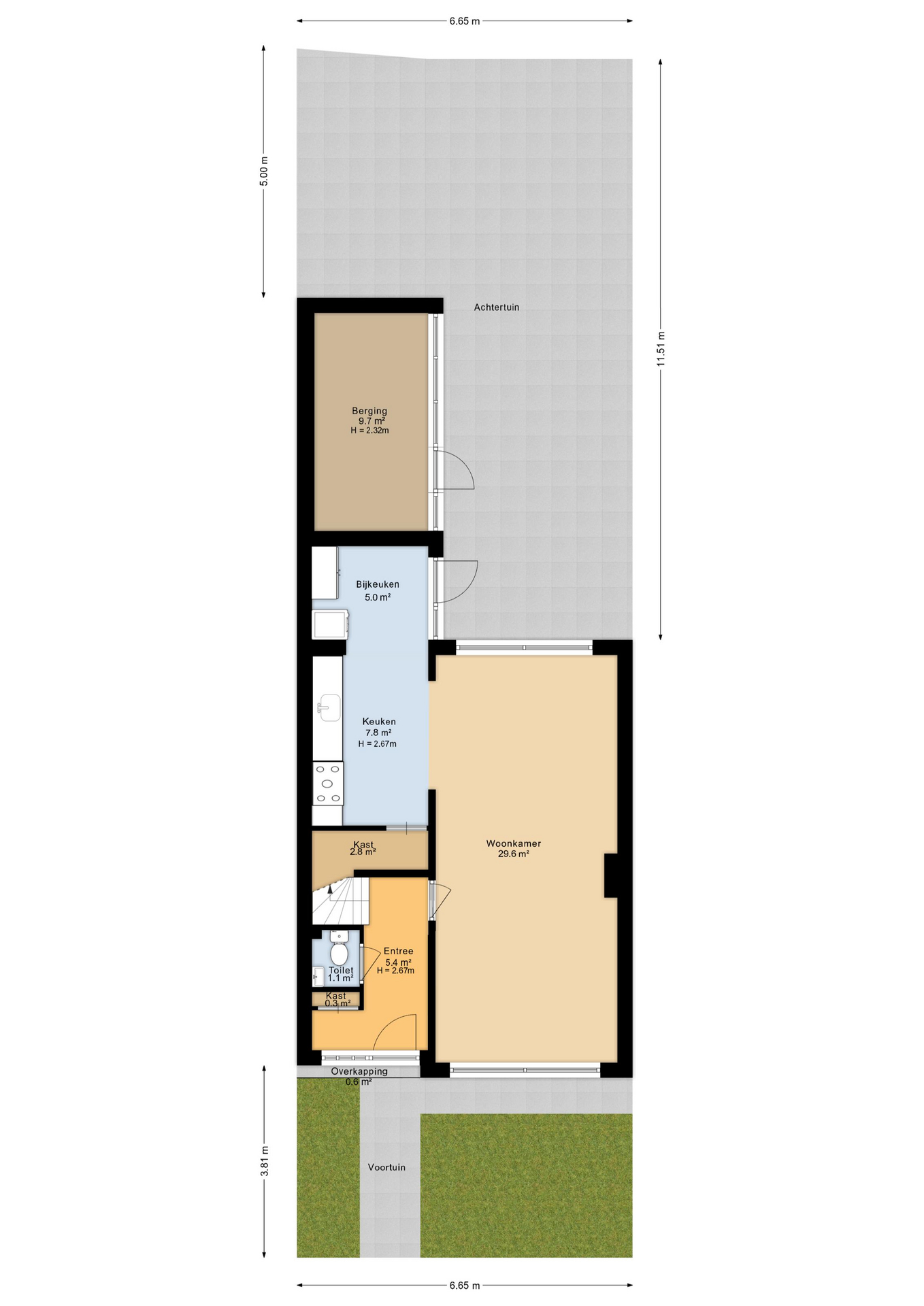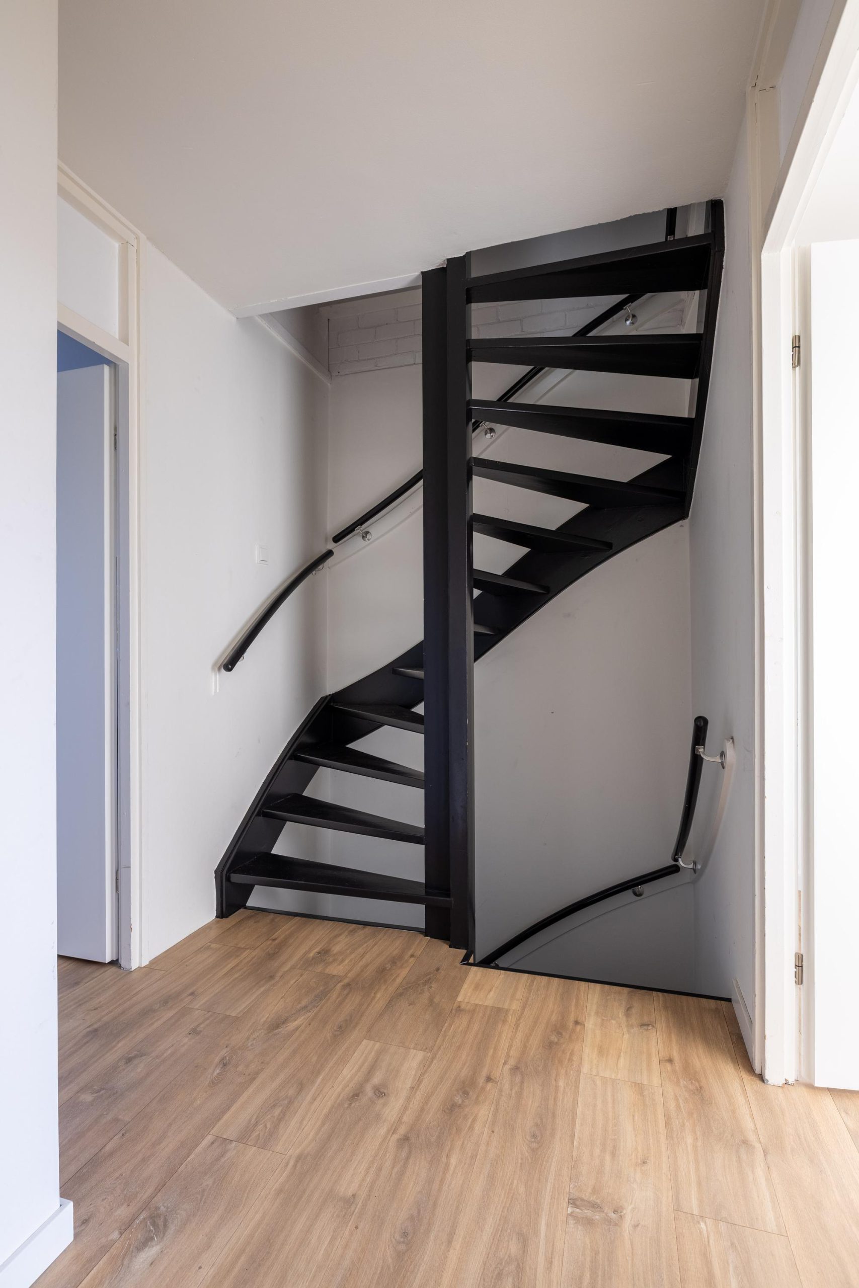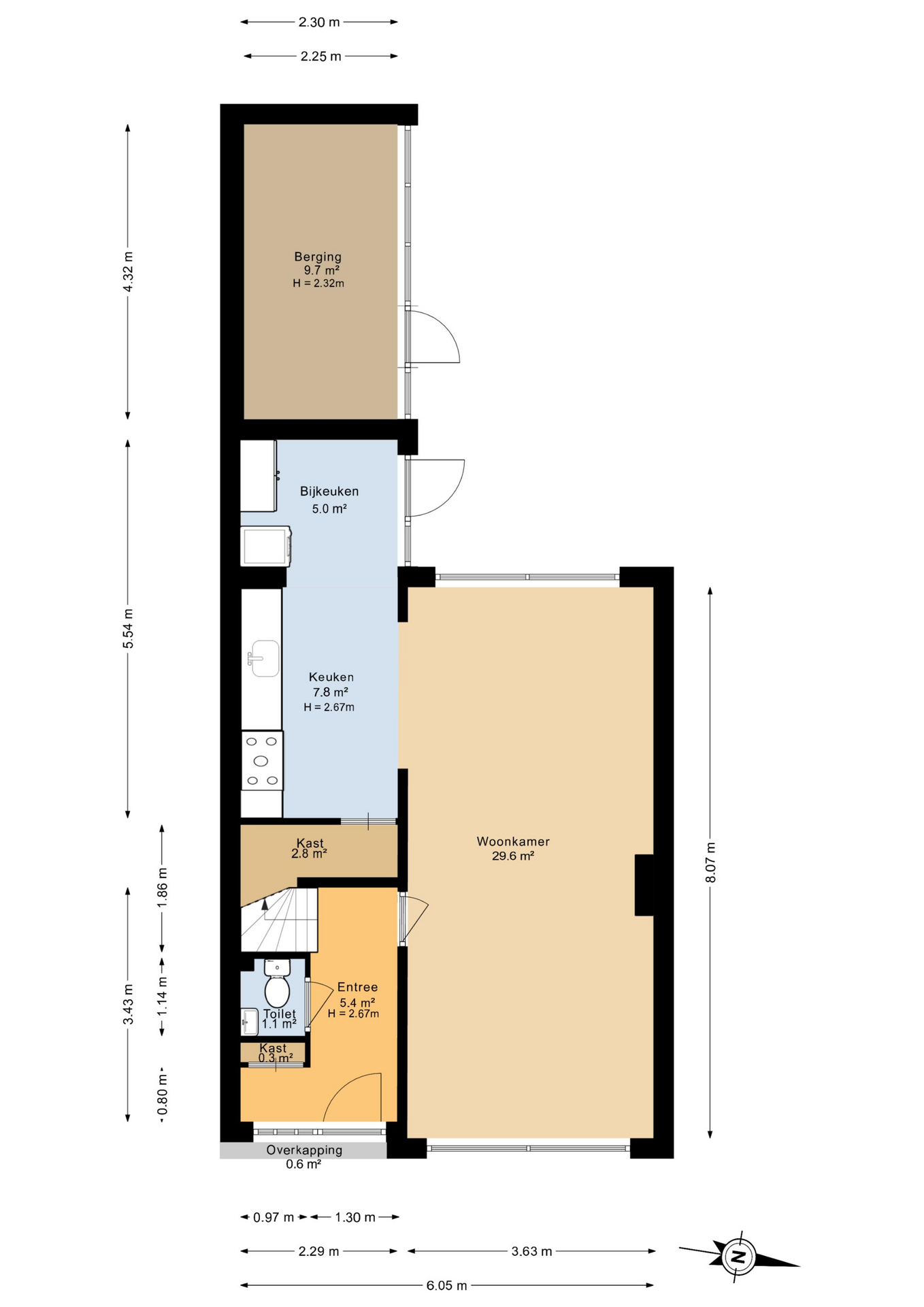 Je komt binnen via de hal, waar je de meterkast en het toilet vindt. Licht, overzichtelijk en direct door naar de woonkamer: een logische en prettige routing.