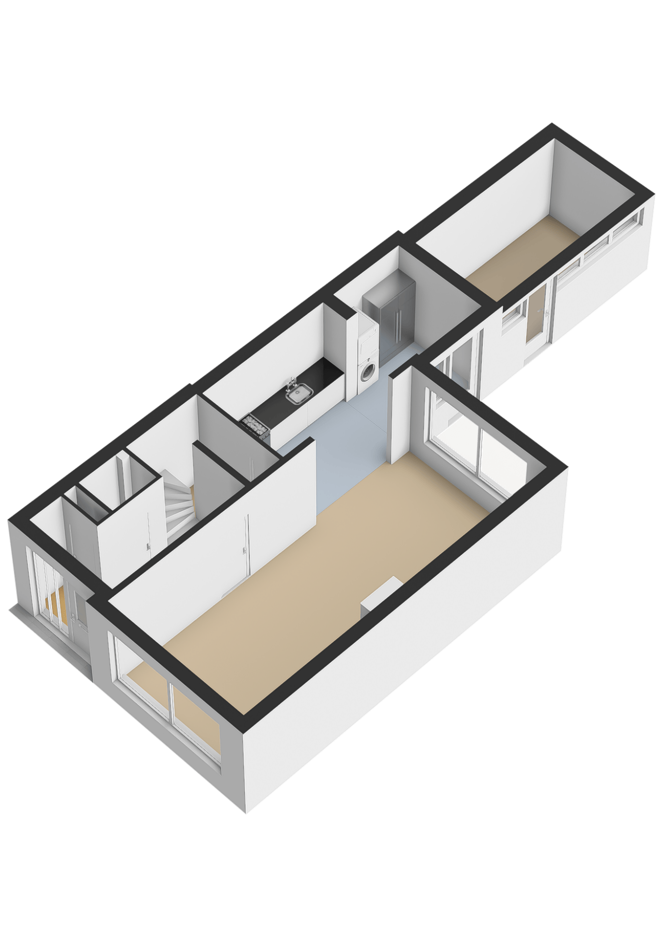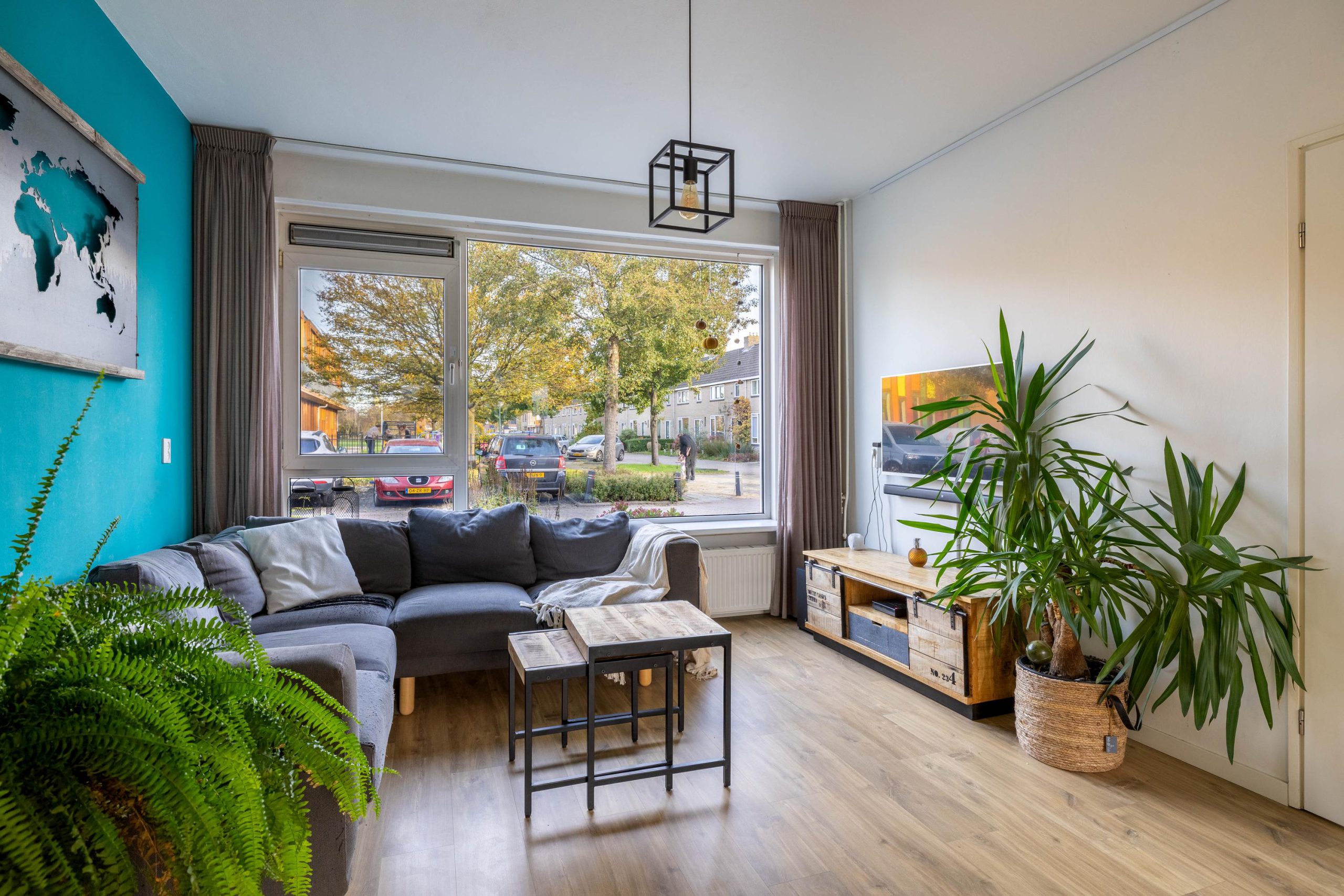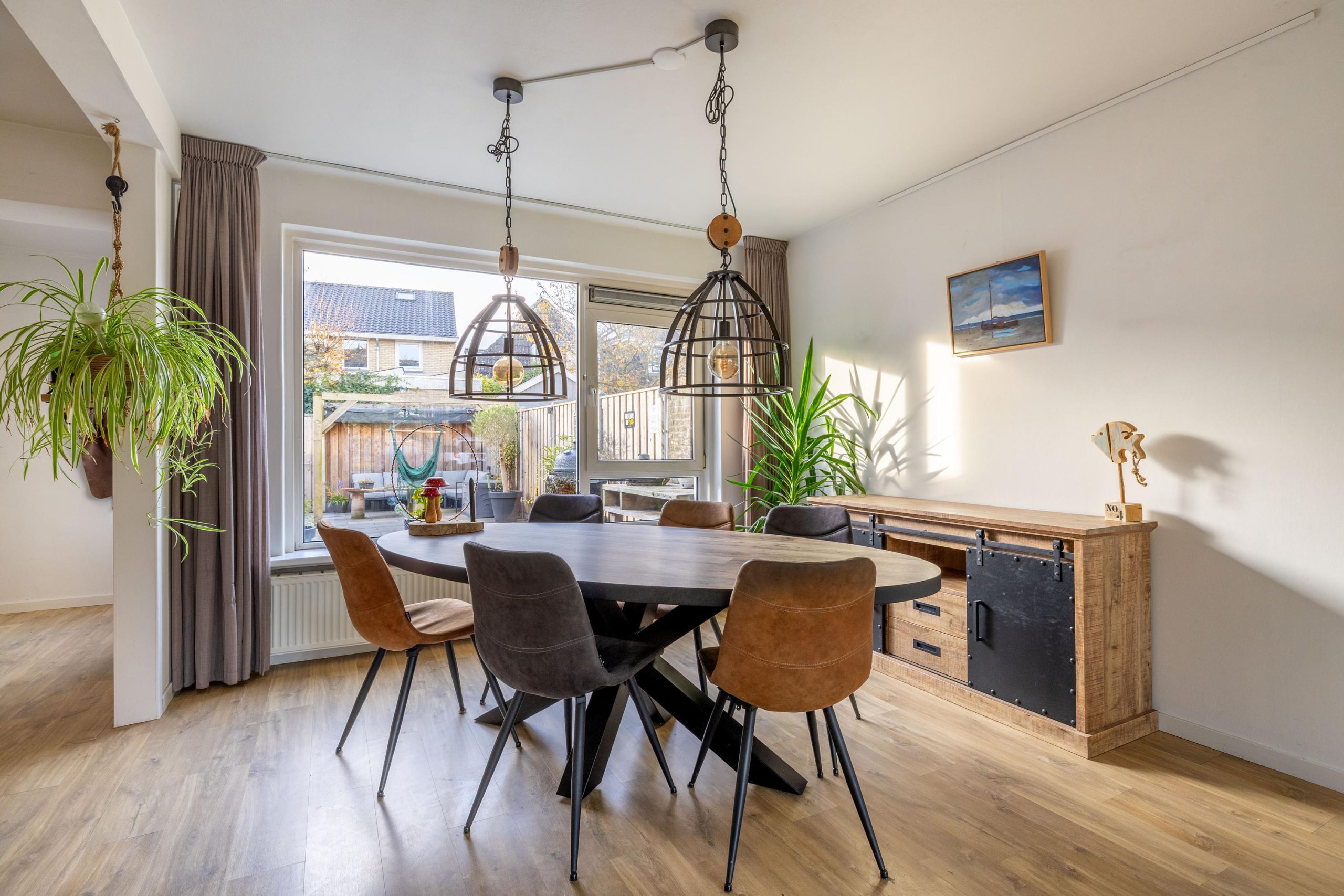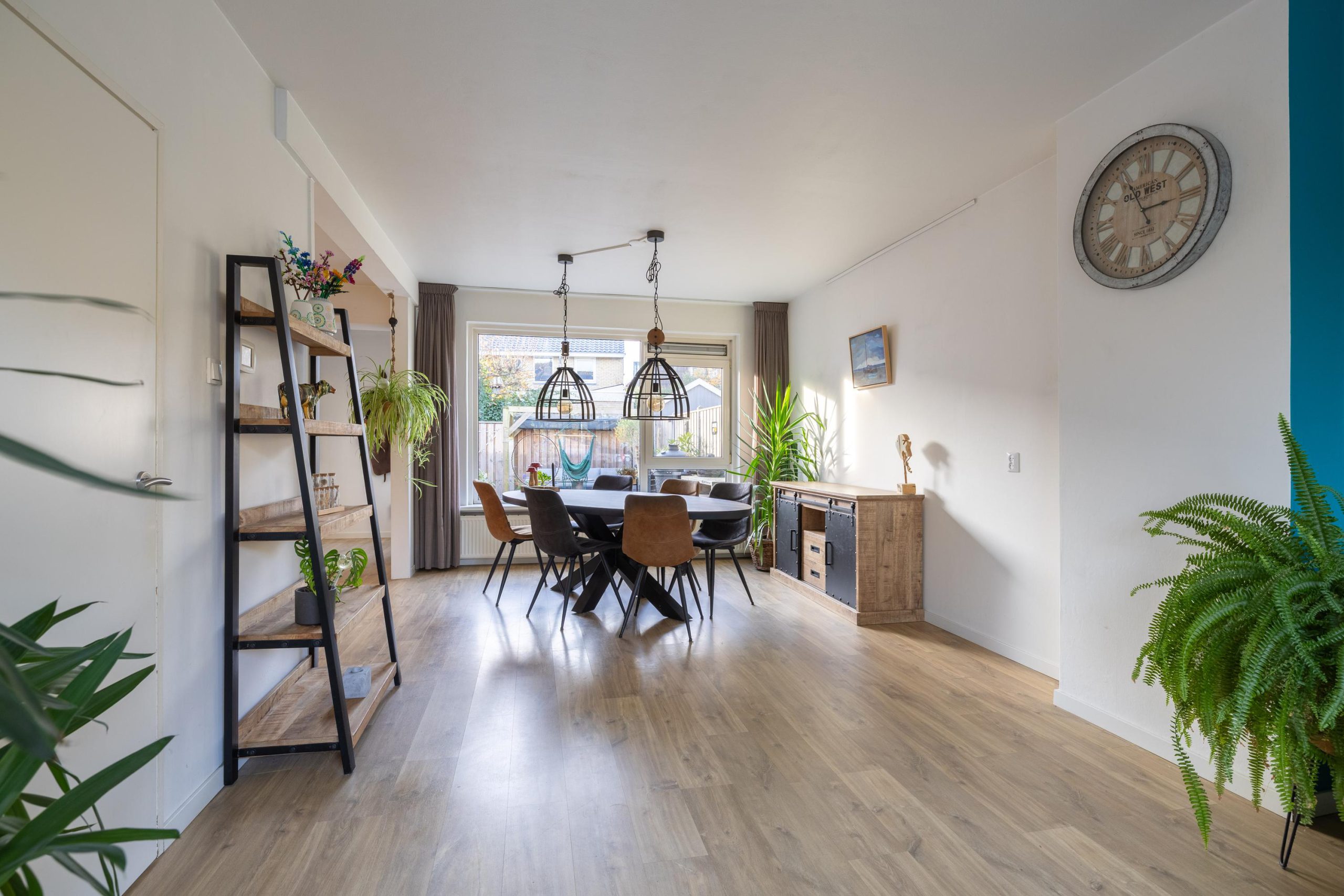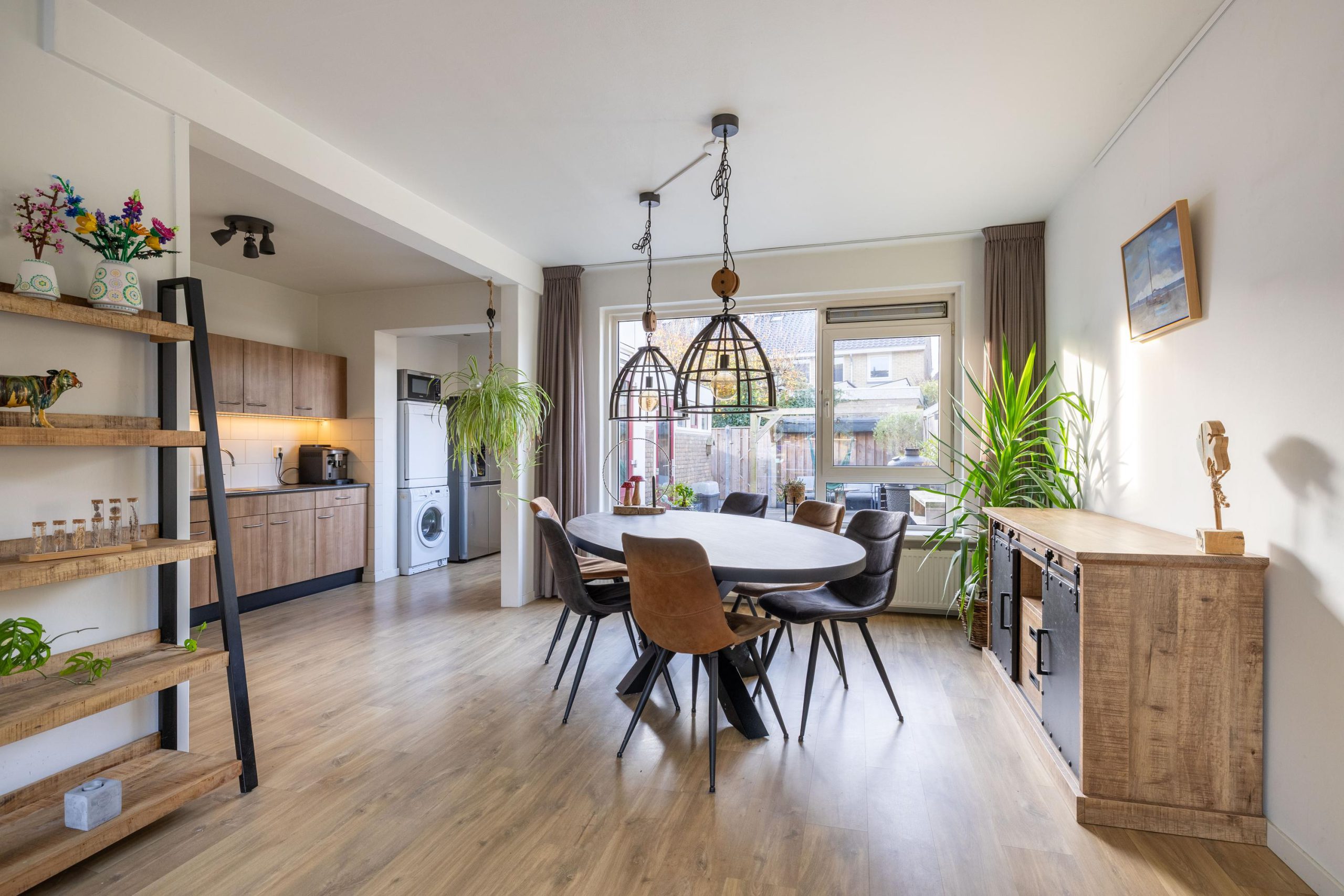 De woonkamer voelt warm en uitnodigend, met een gezellige zithoek aan de voorzijde en volop ruimte voor een grote eettafel richting de achtertuin. De sfeer is licht, fris en praktisch; een fijne basis die voor elke woonstijl geschikt is.