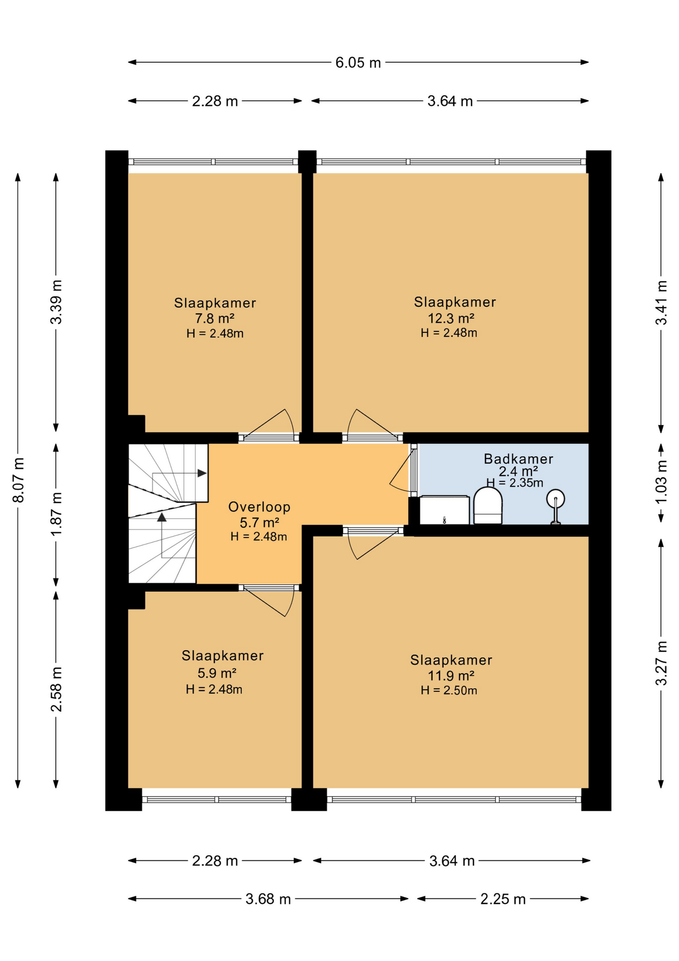 De eerste verdieping biedt vier slaapkamers, elk met een eigen karakter en volop mogelijkheden: de eerste slaapkamers aan de achterzijde is een ruime kamer, die perfect werkt als master. De tweede slaapkamer is ideaal als kinderkamer, werkkamer of logeerplek. Het raam aan de straatzijde zorgt voor een fijne lichtinval. De derde en vierde slaapkamer zijn van compacter formaat, maar verassend functioneel. Ook een fijne optie voor een babykamer, kledingkamer en/of stille thuiswerkplek. De badkamer is praktisch ingedeeld met een douche, wastafel en toilet: alles bij de hand en efficiënt vormgegeven.