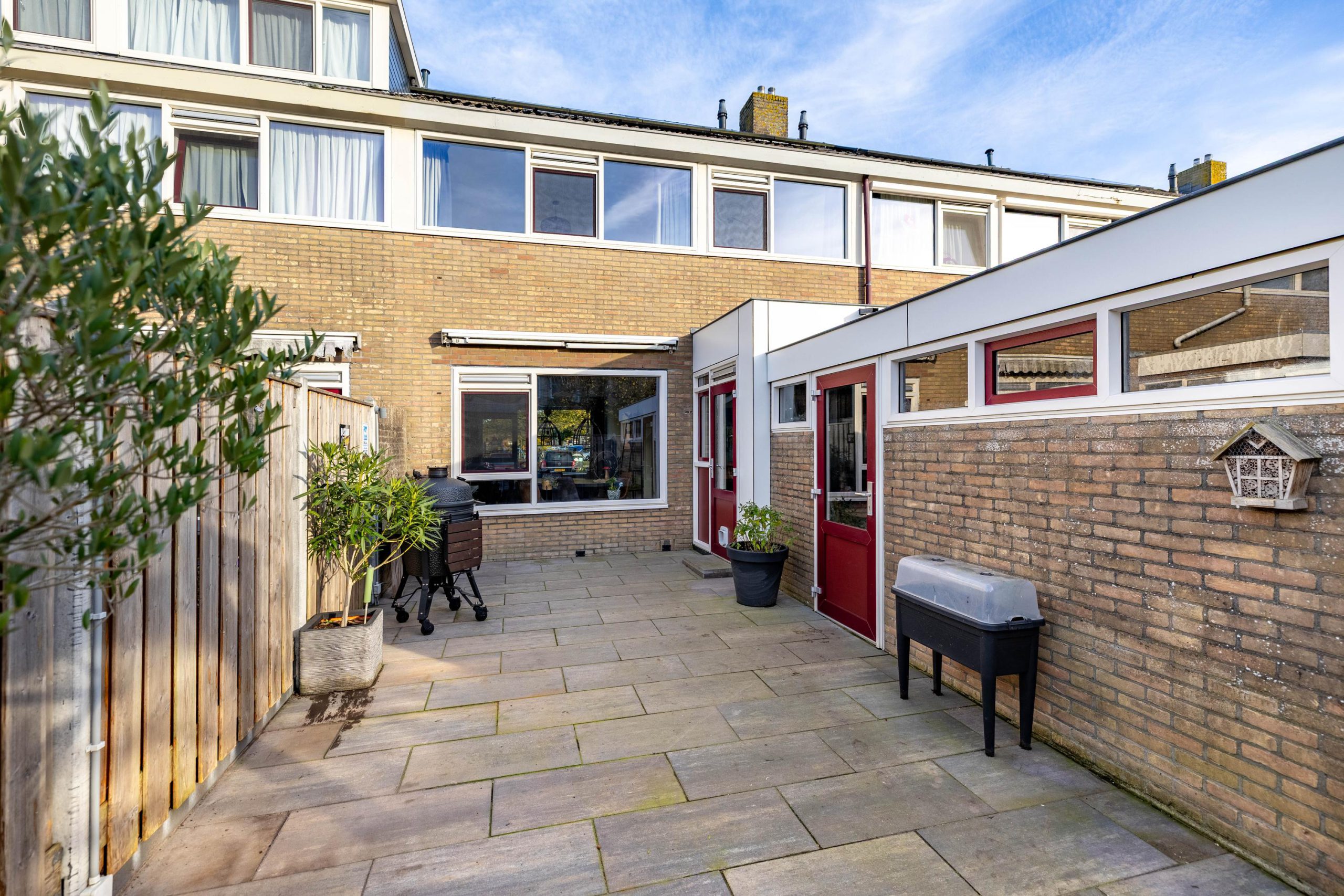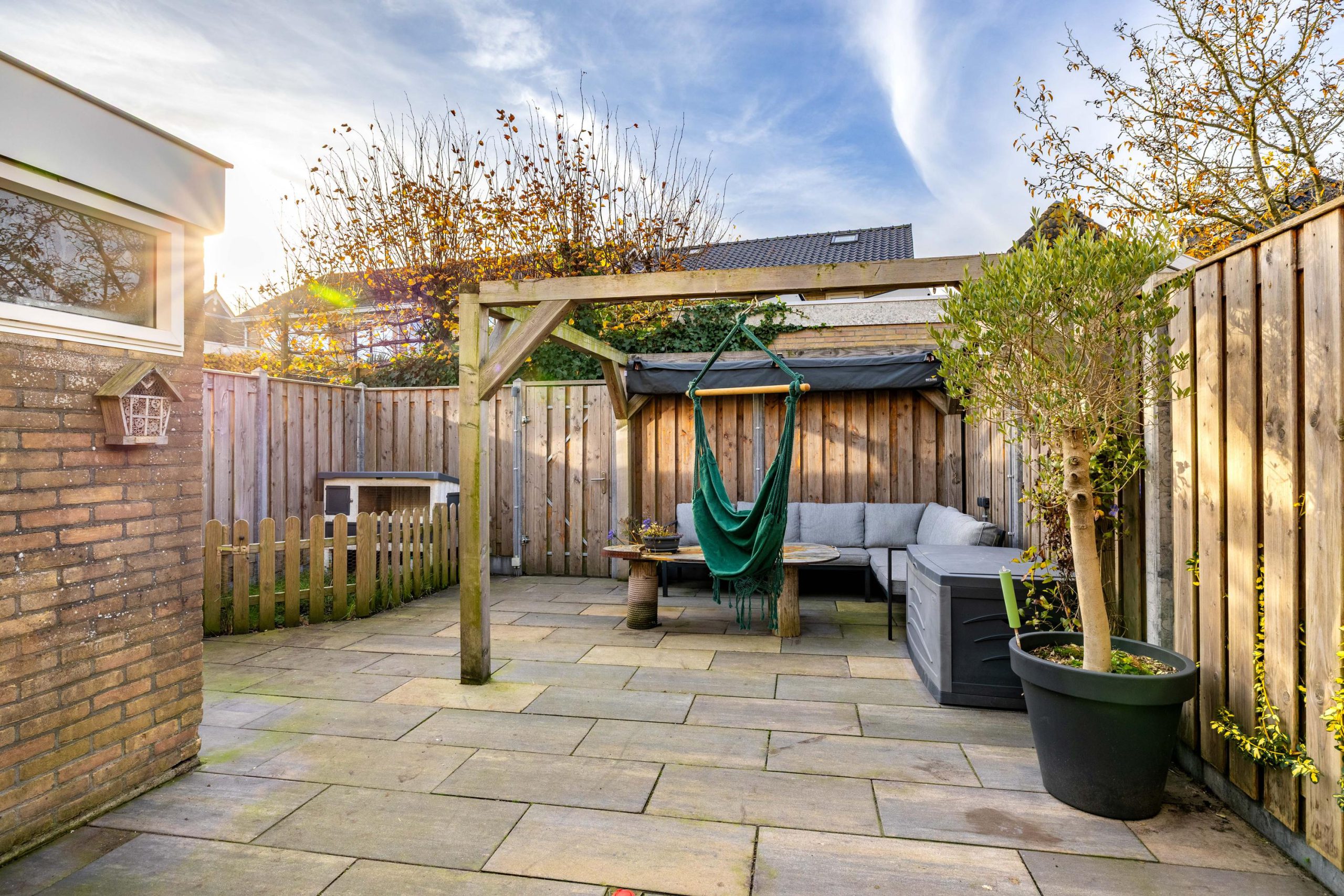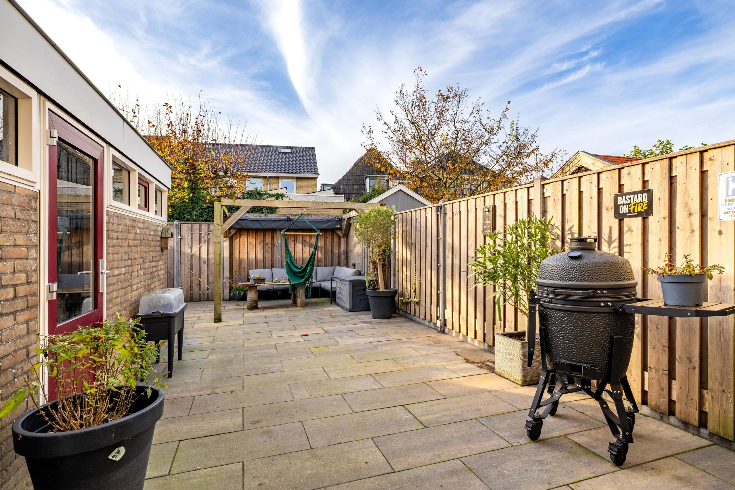 De tuin is strak en onderhoudsarm aangelegd met grote tegels en een mooie nieuwe schutting. Dankzij de ligging op het westen zit je hier perfect voor middag- en avond zon. De achterom via de steeg maakt de tuin bovendien extra praktisch: ideaal voor fietsen of wanneer je snel iets naar buiten wilt brengen.