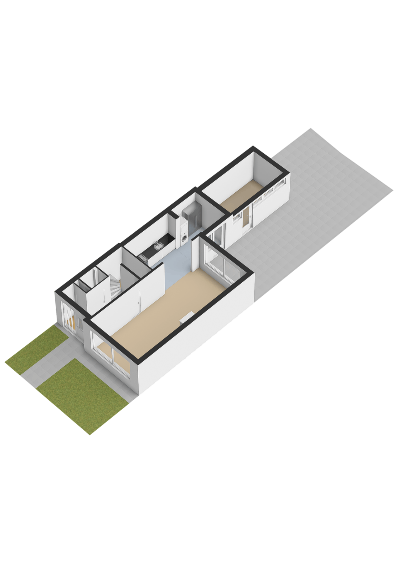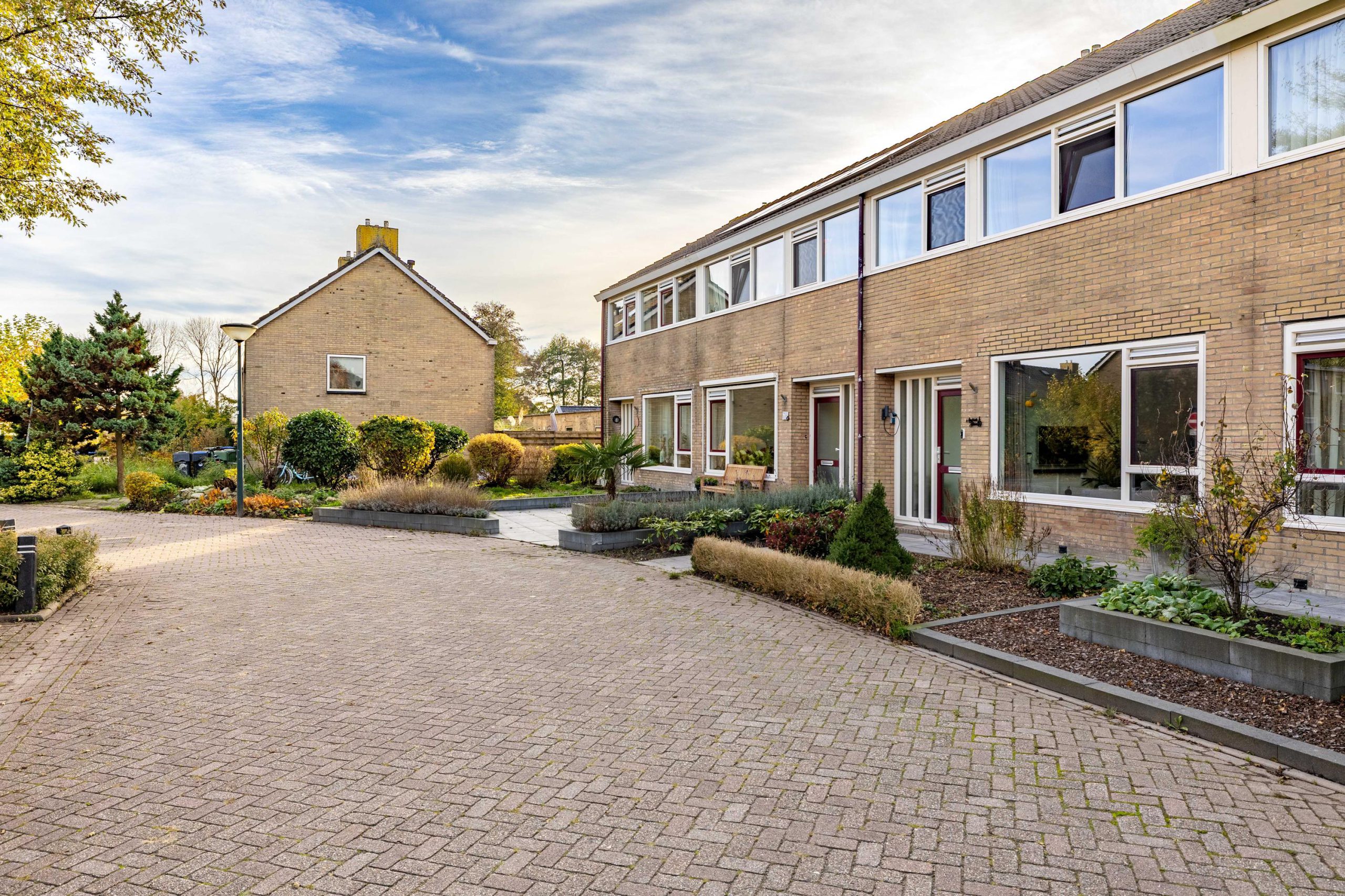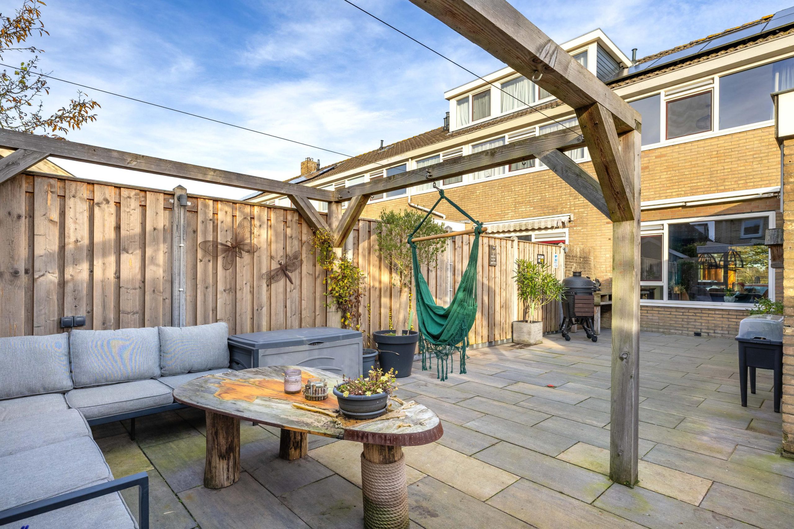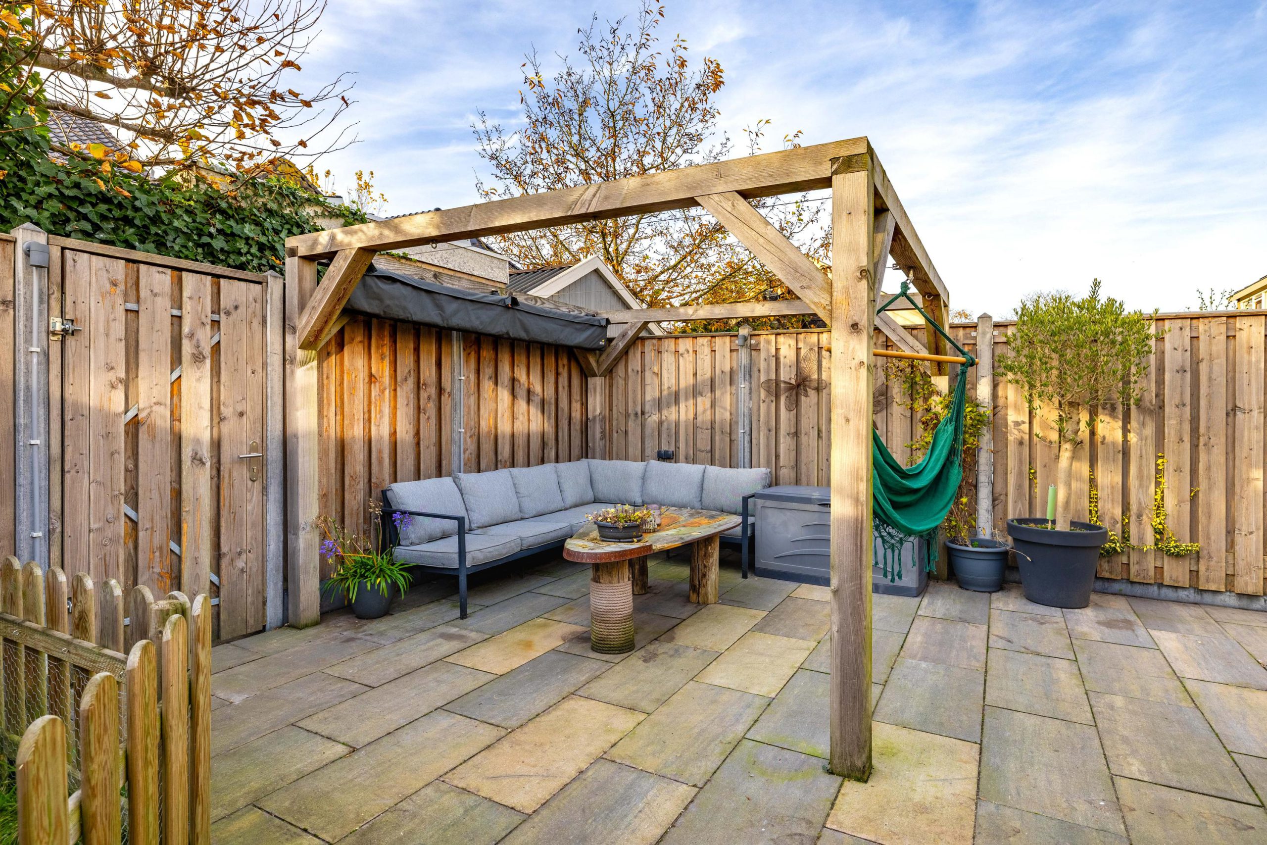 De tuin is strak en onderhoudsarm aangelegd met grote tegels en een mooie nieuwe schutting. Dankzij de ligging op het westen zit je hier perfect voor middag- en avond zon. De achterom via de steeg maakt de tuin bovendien extra praktisch: ideaal voor fietsen of wanneer je snel iets naar buiten wilt brengen.